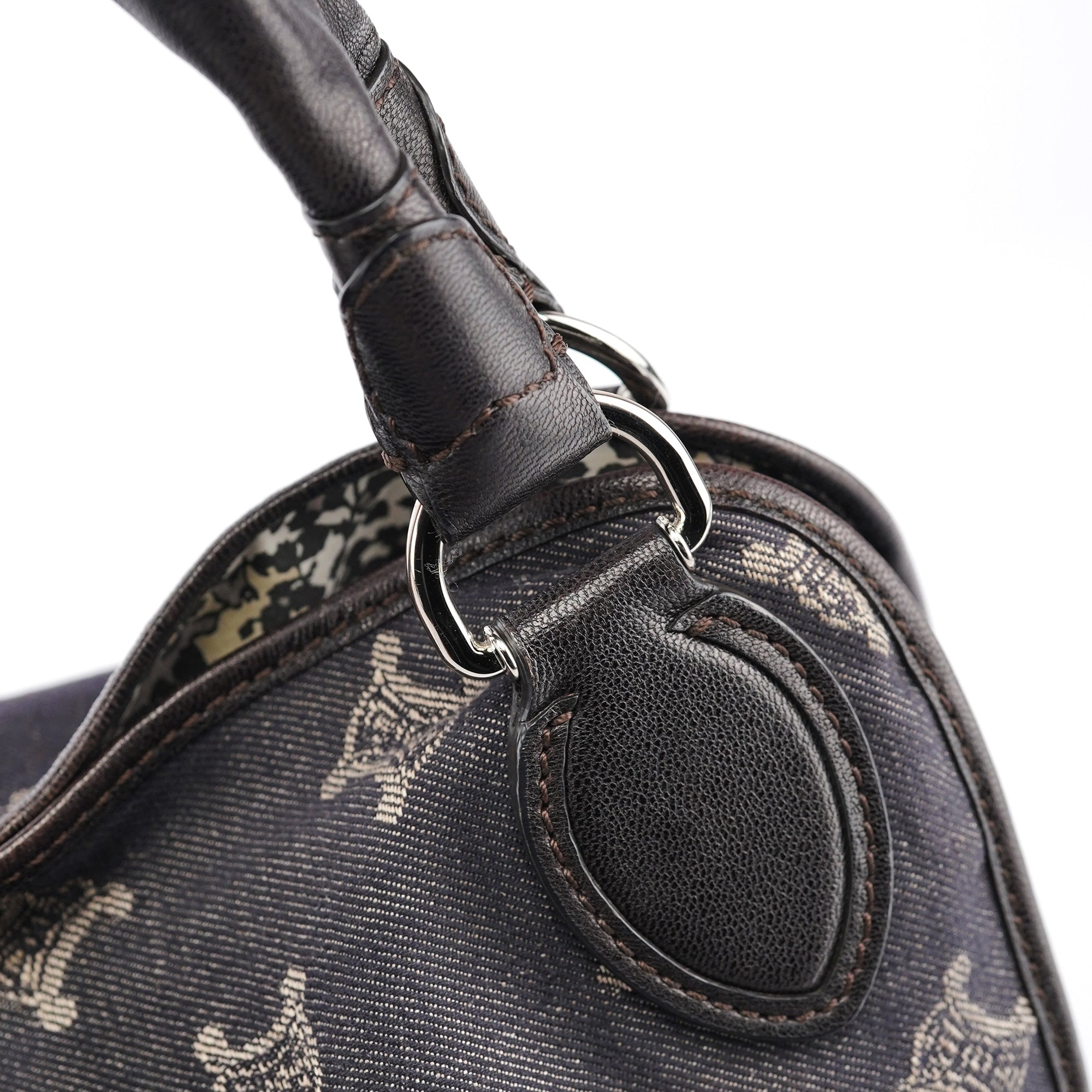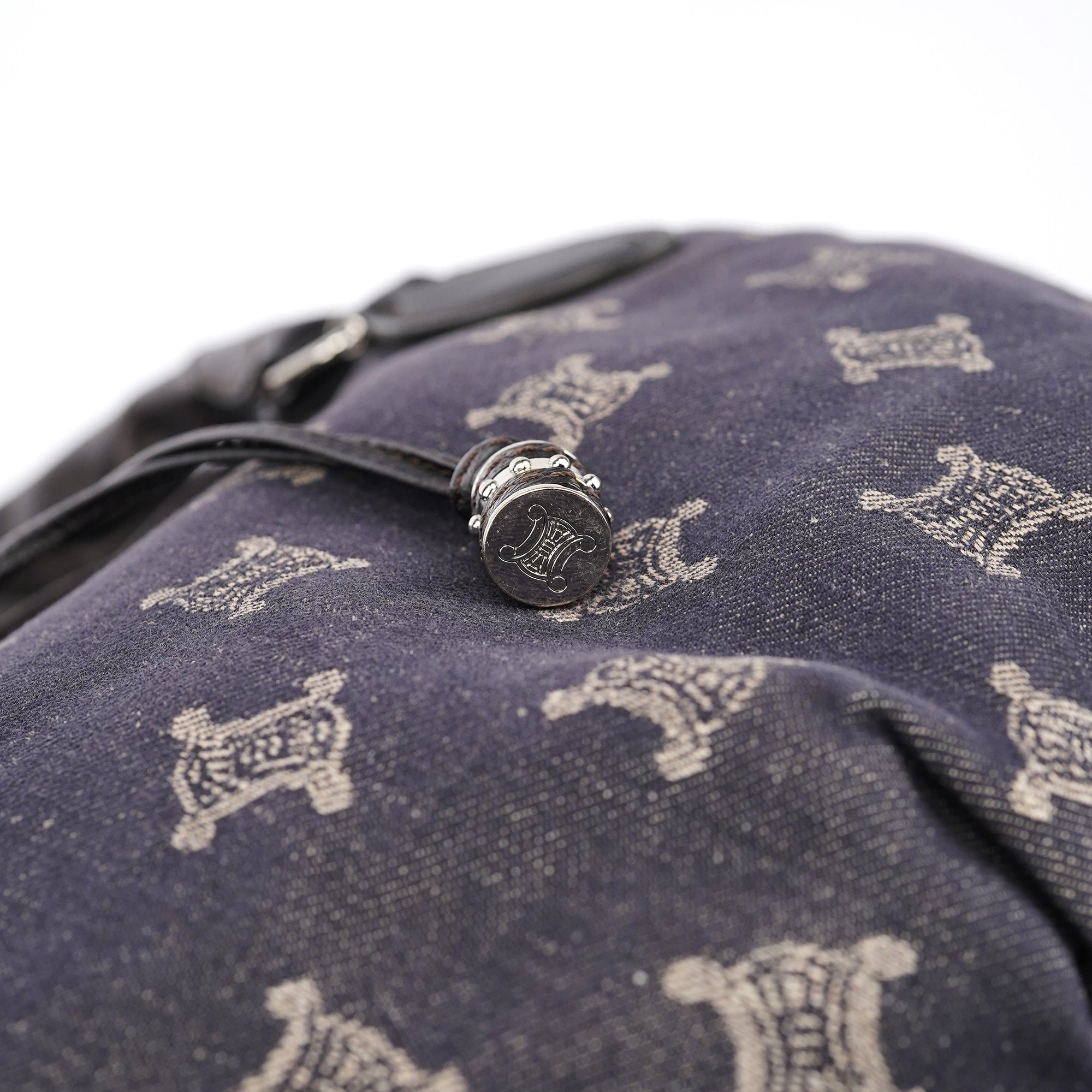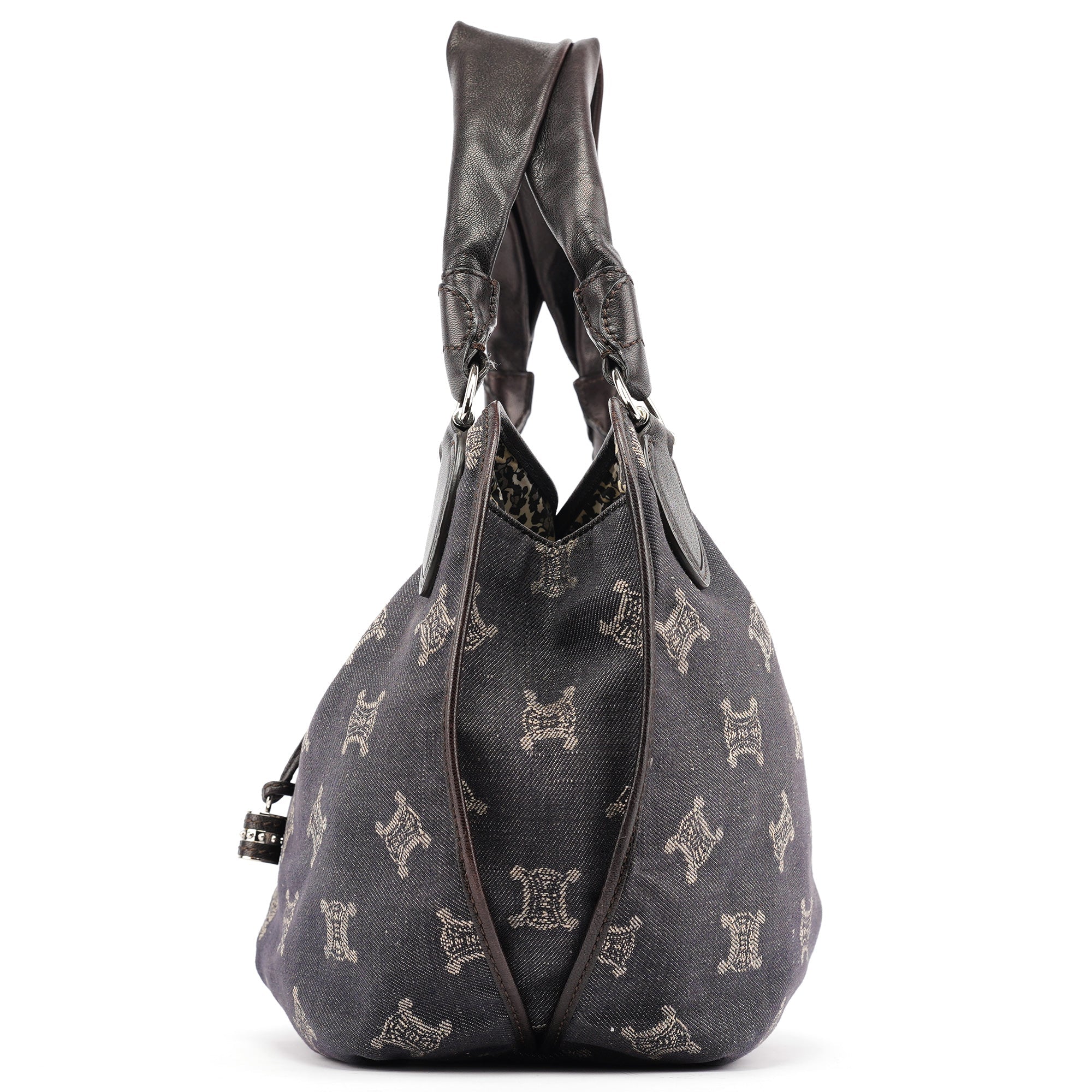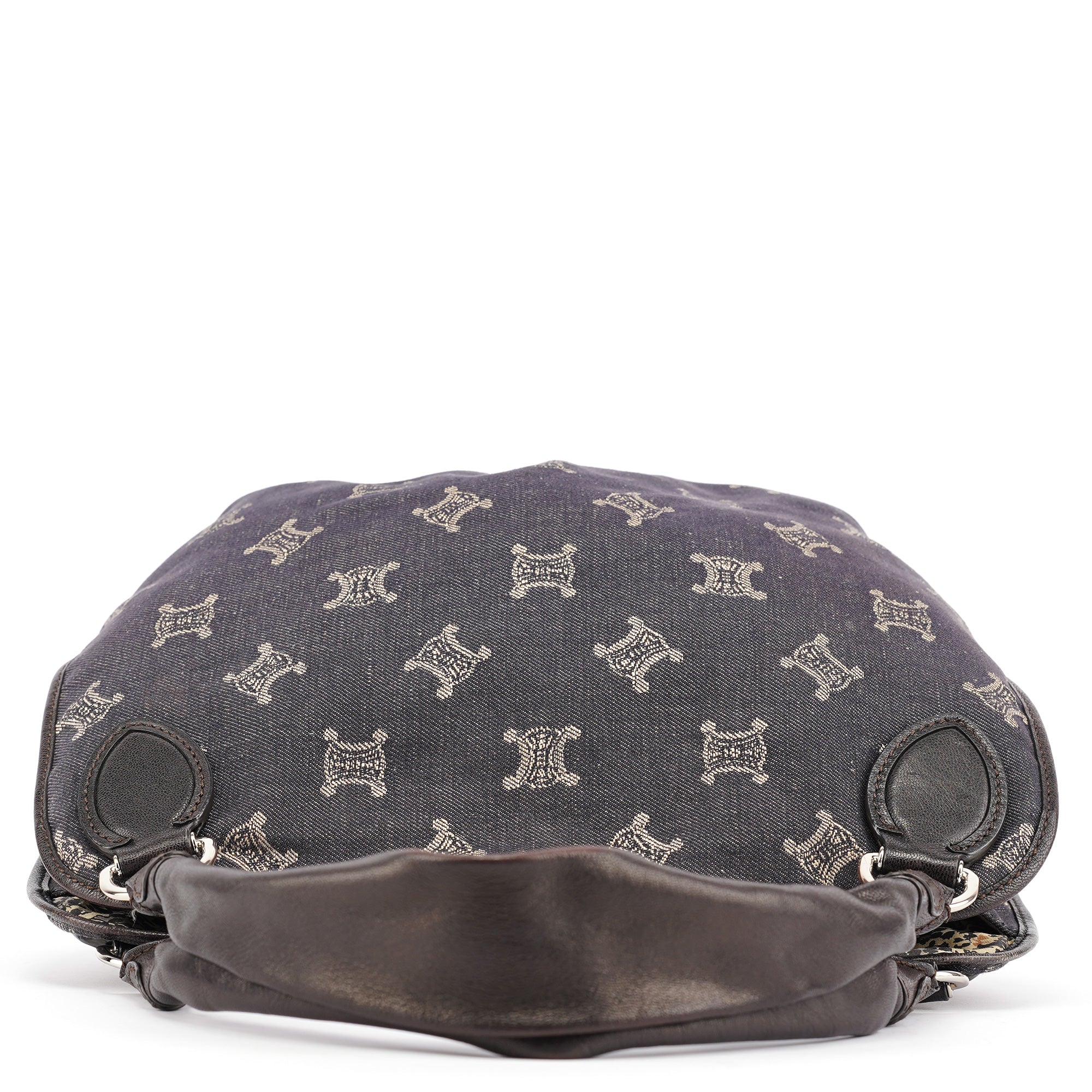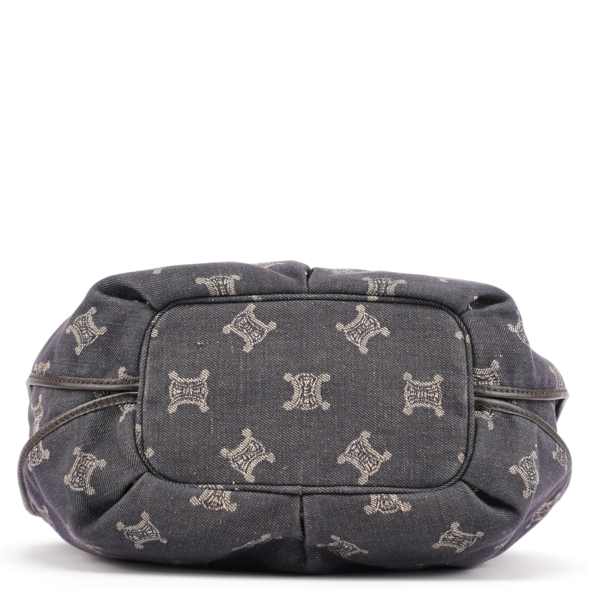 Designed in the early 2000s, this vintage Céline Bittersweet features the brand's signature Macadam monogram pattern reimagined in navy denim with beige logo print. The slouchy hobo silhouette showcases gathered leather detailing, braided handles with silver-tone hardware, and the distinctive relaxed shape that defined the Bittersweet line. This denim iteration represents Céline's playful approach to luxury accessories during the pre-Phoebe Philo era.