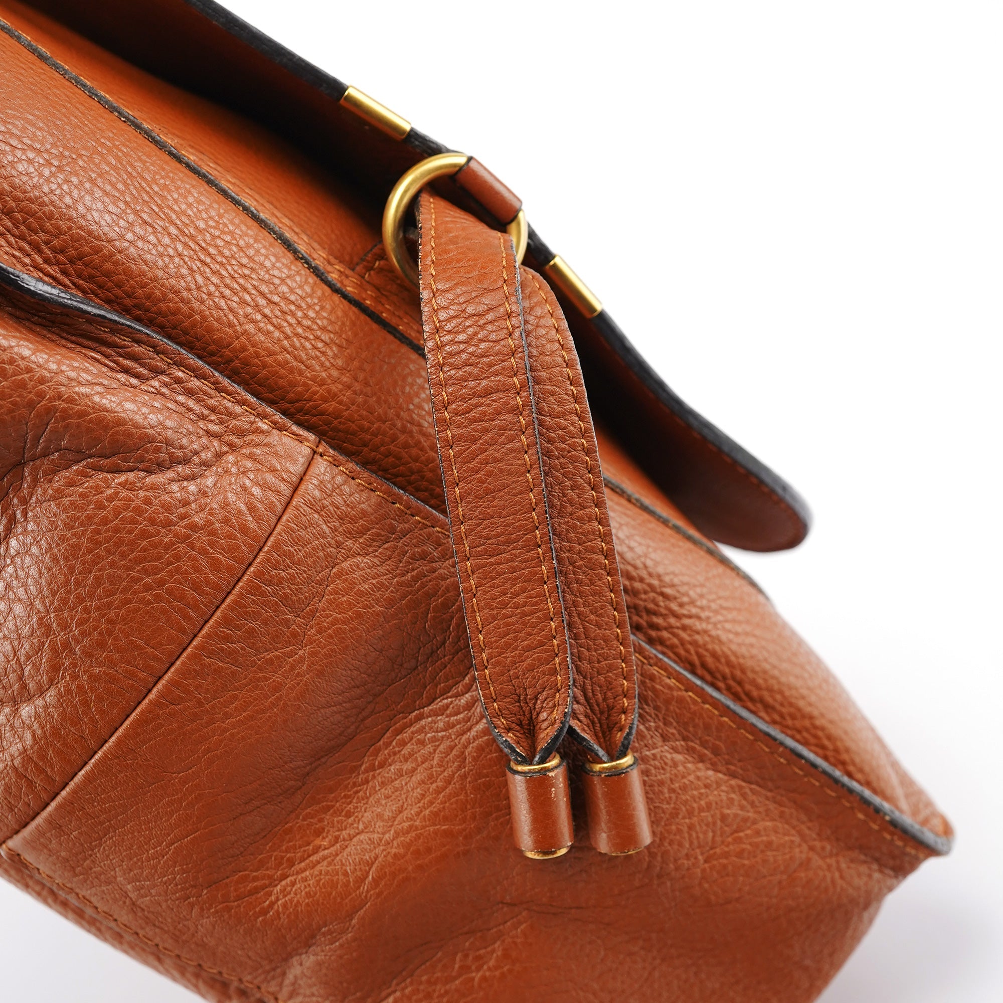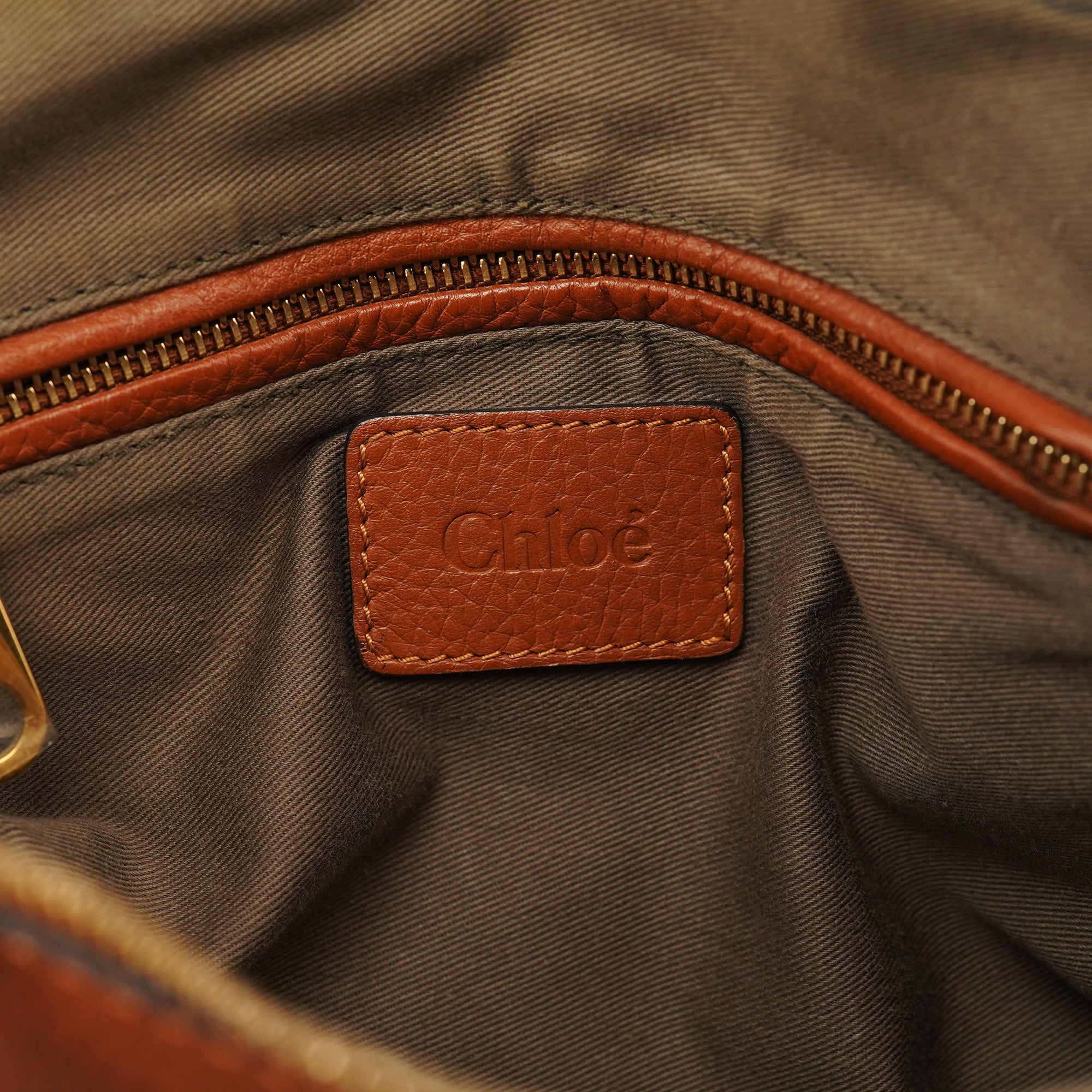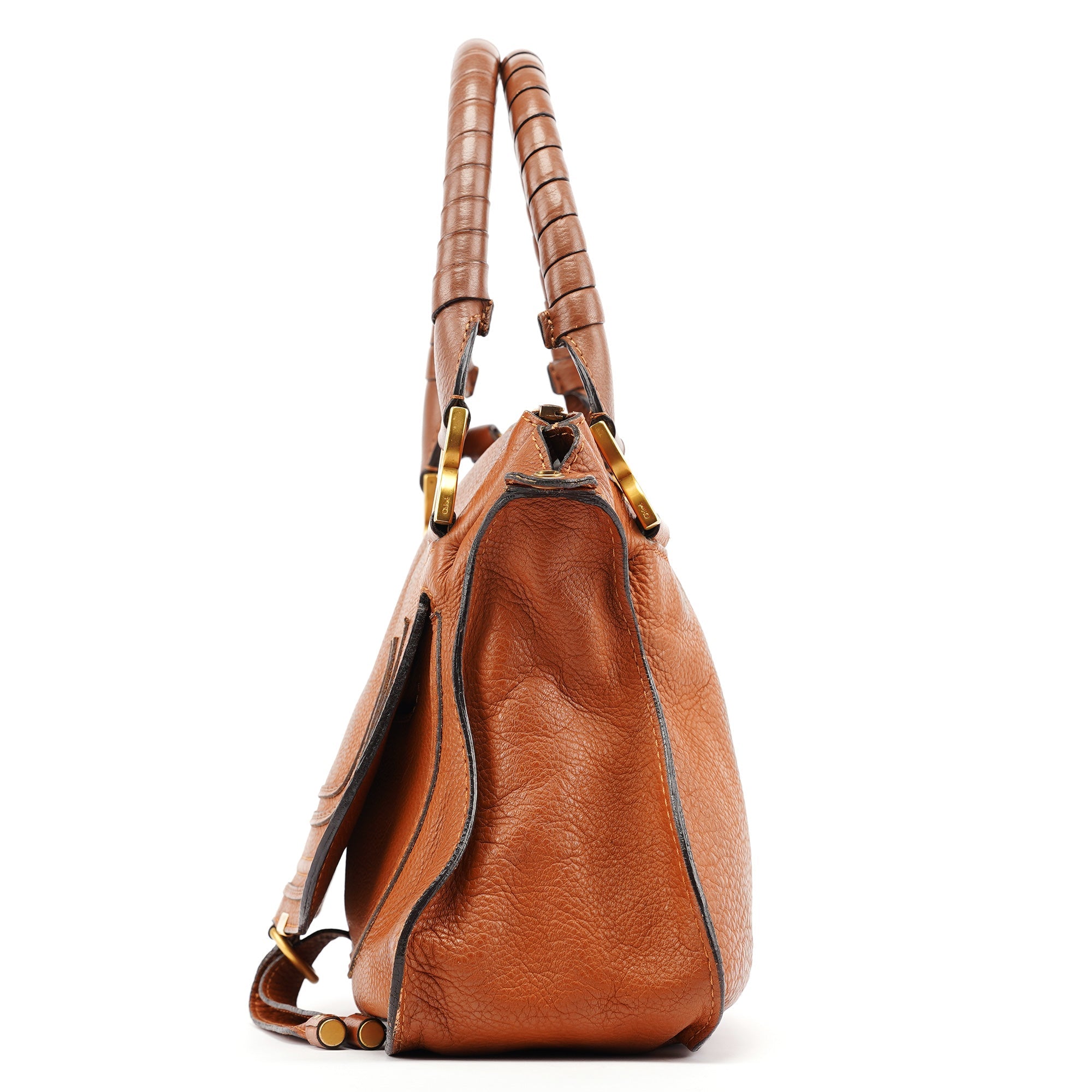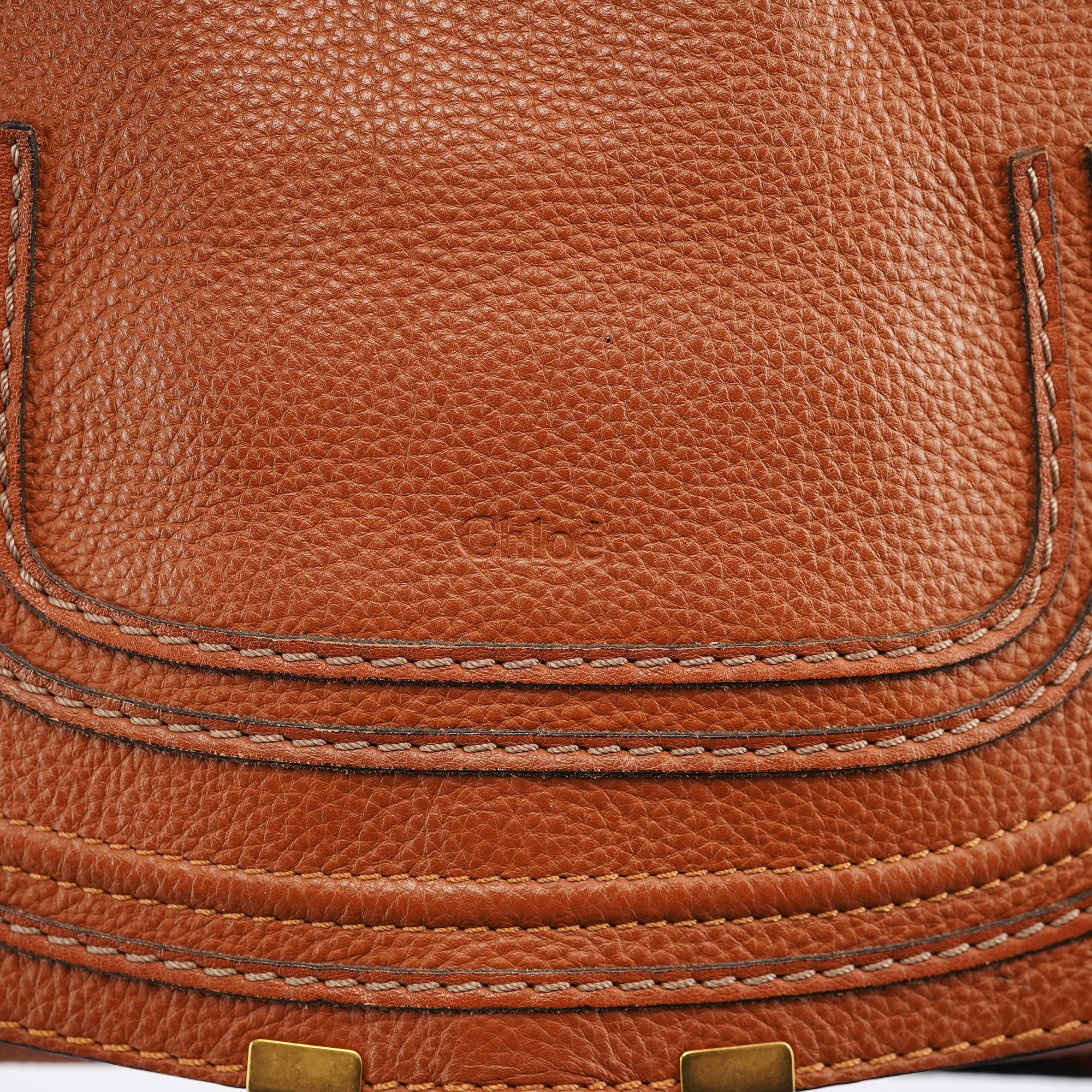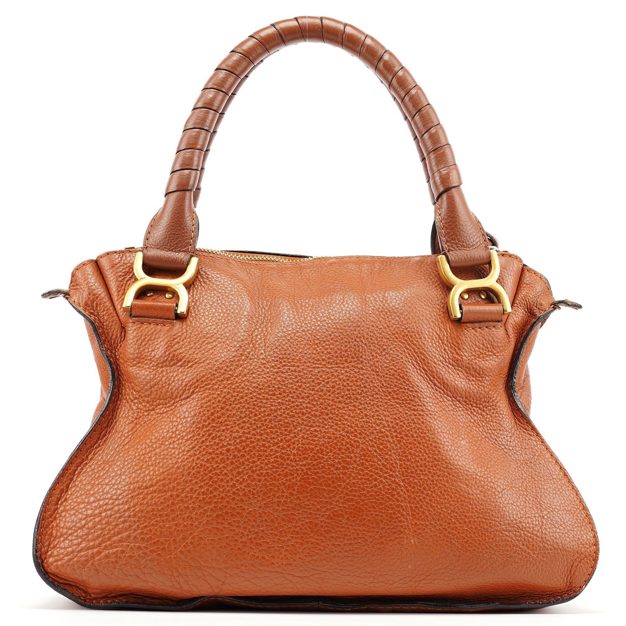 Designed in 2010 by Hannah MacGibbon, this vintage Chloé Marcie shoulder bag showcases the model's iconic equestrian-inspired aesthetic in rich tan pebbled leather. The bag features the signature curved front pocket with decorative stitching, brass-tone hardware including the distinctive ring detail, top zip closure, and woven leather handles. The interior is lined in canvas with multiple pockets for organization, and includes a detachable leather shoulder strap for versatile carrying options.