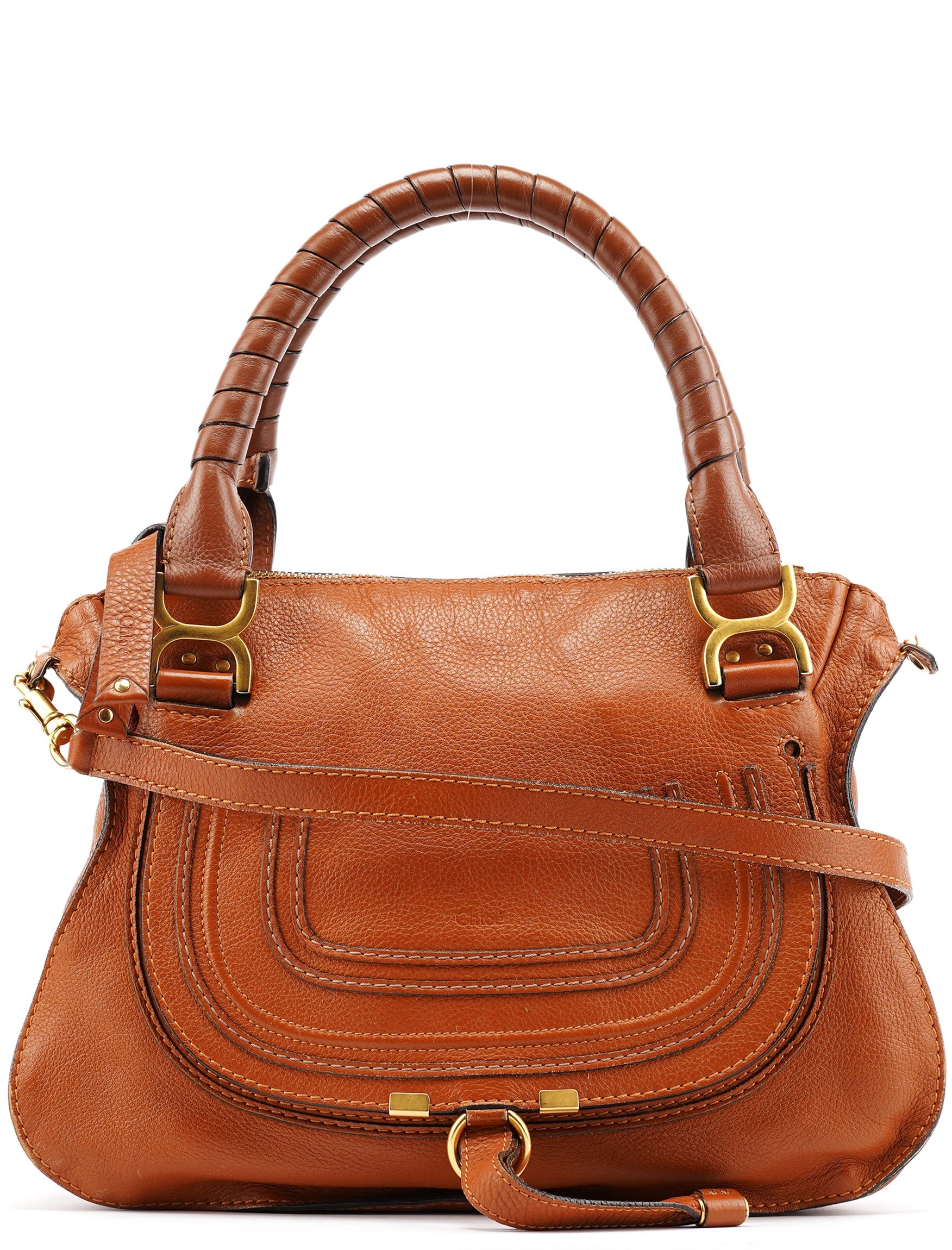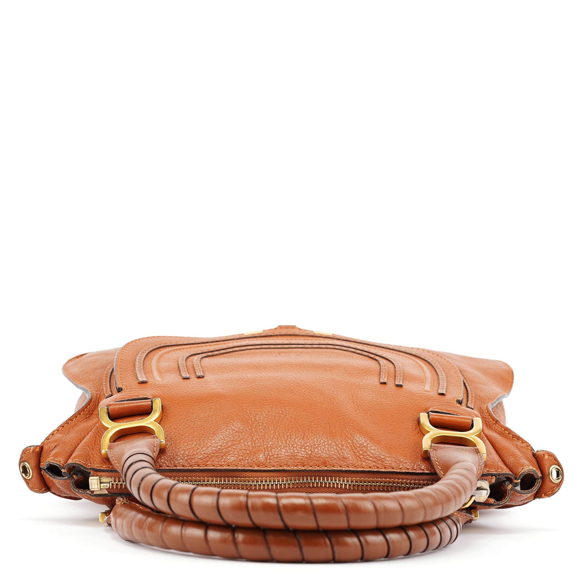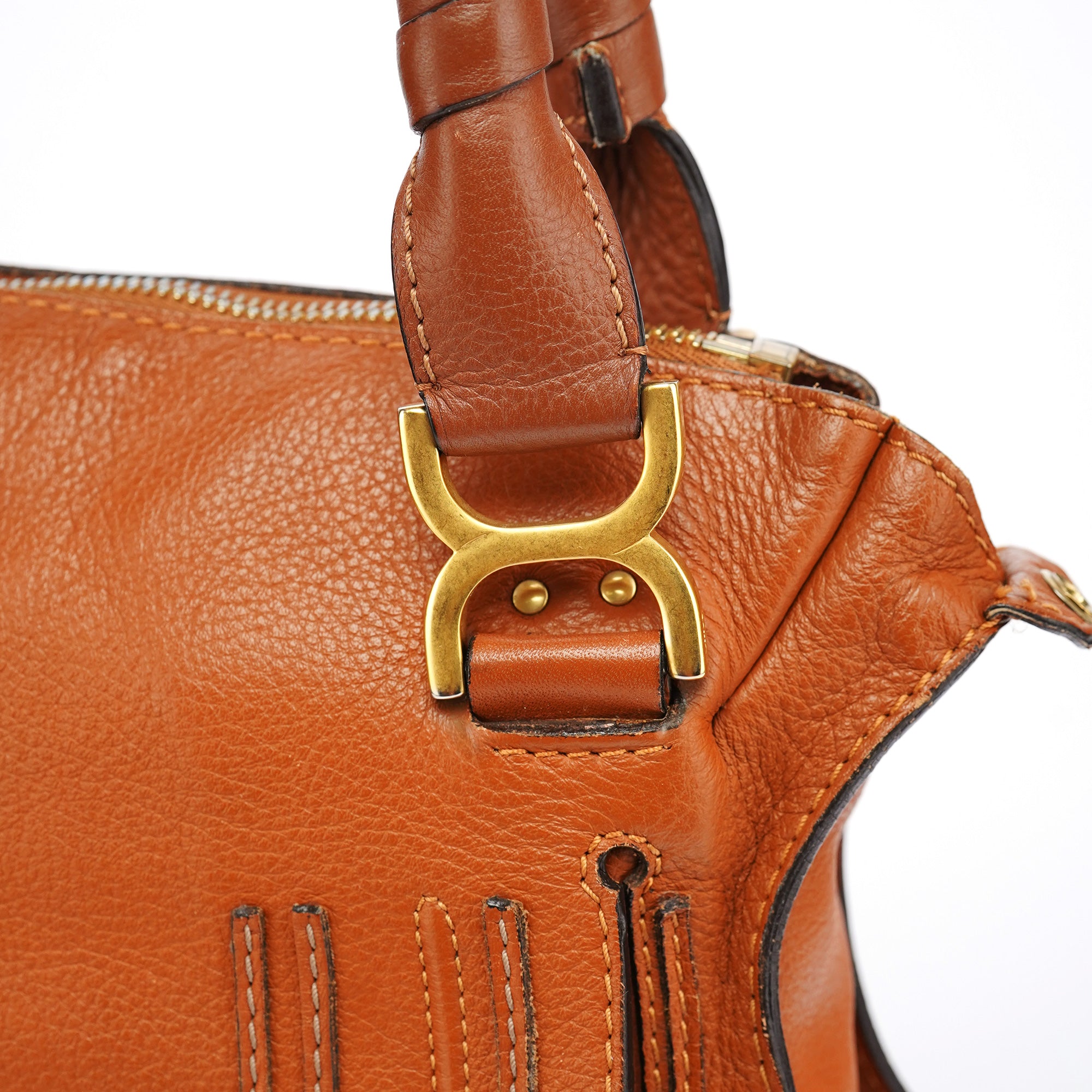 Designed in 2010 by Hannah MacGibbon, this vintage Chloé Marcie double carry bag features rich tan pebbled leather with the model's signature equestrian-inspired aesthetic. The bag showcases wrapped leather handles, the iconic curved saddle pocket with decorative stitching, brass-tone hardware, and versatile carrying options as both a handbag and crossbody. The interior is lined in grey canvas with pockets for organization.