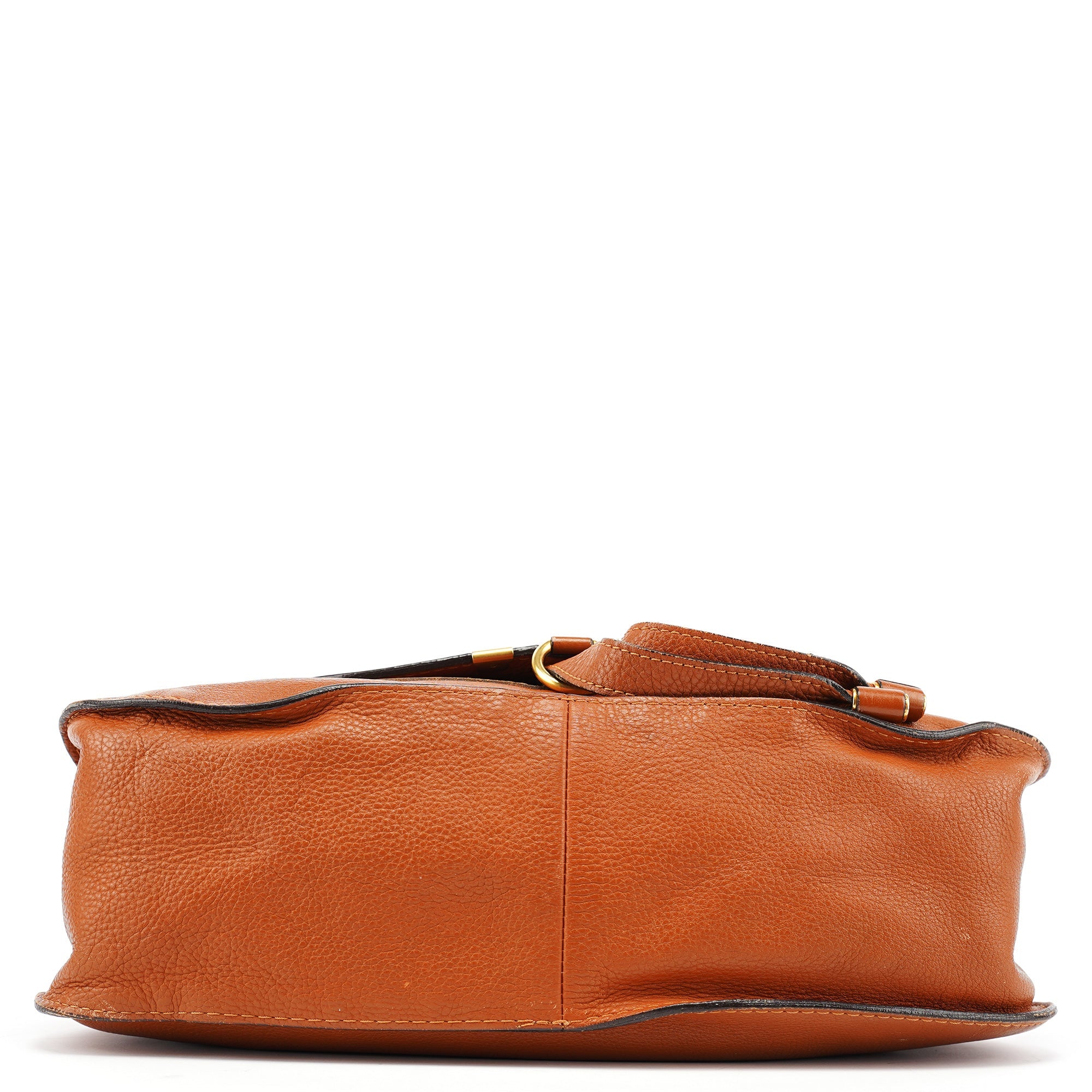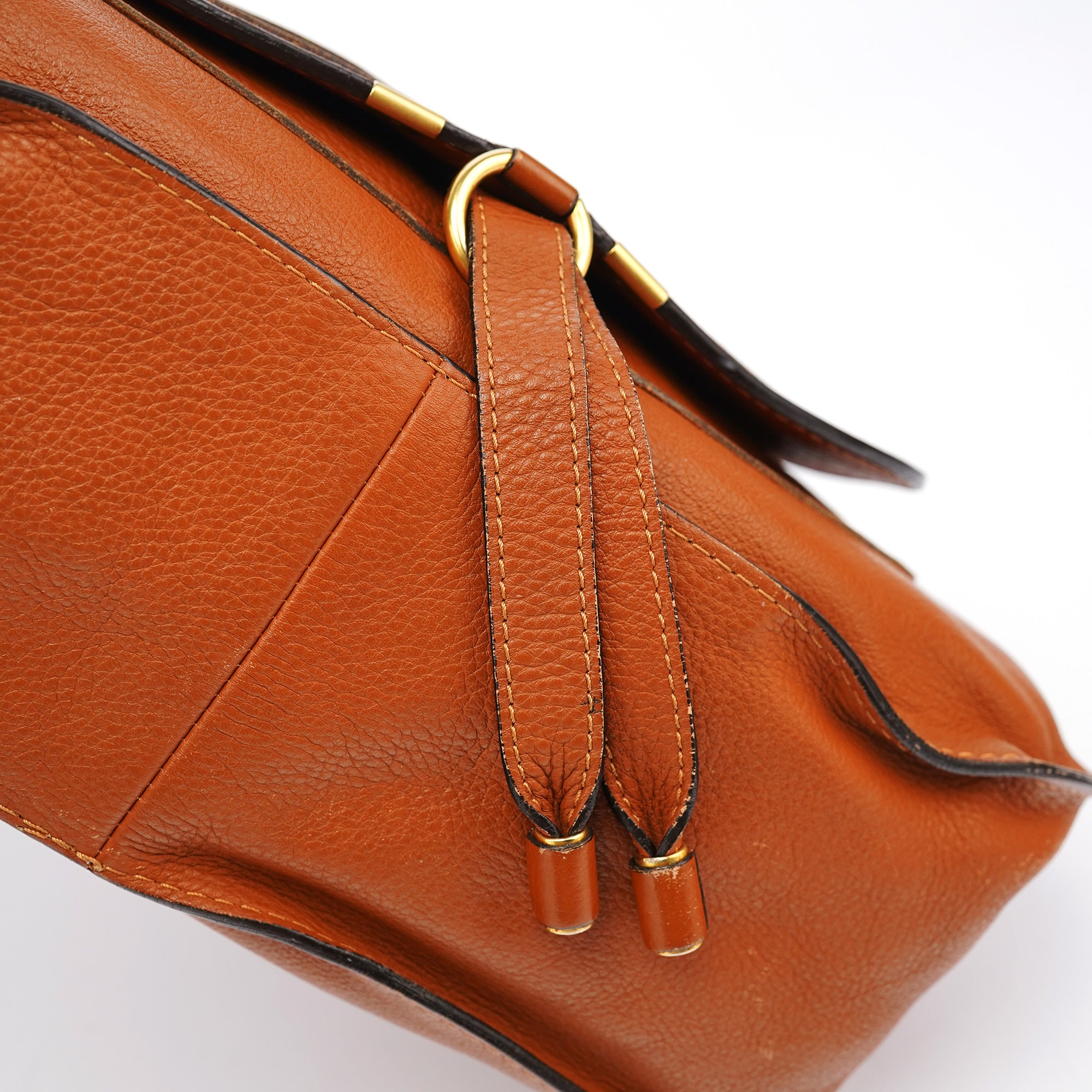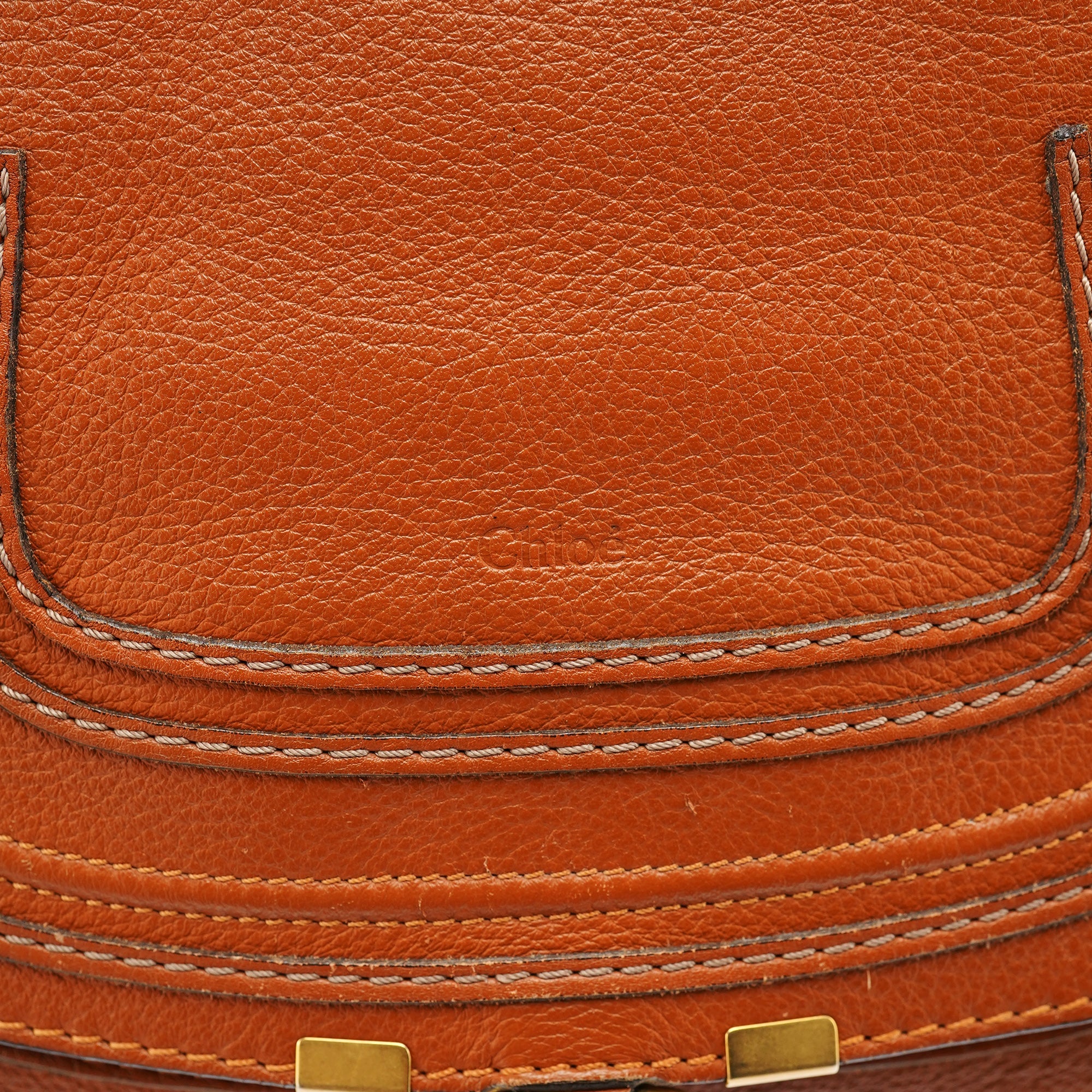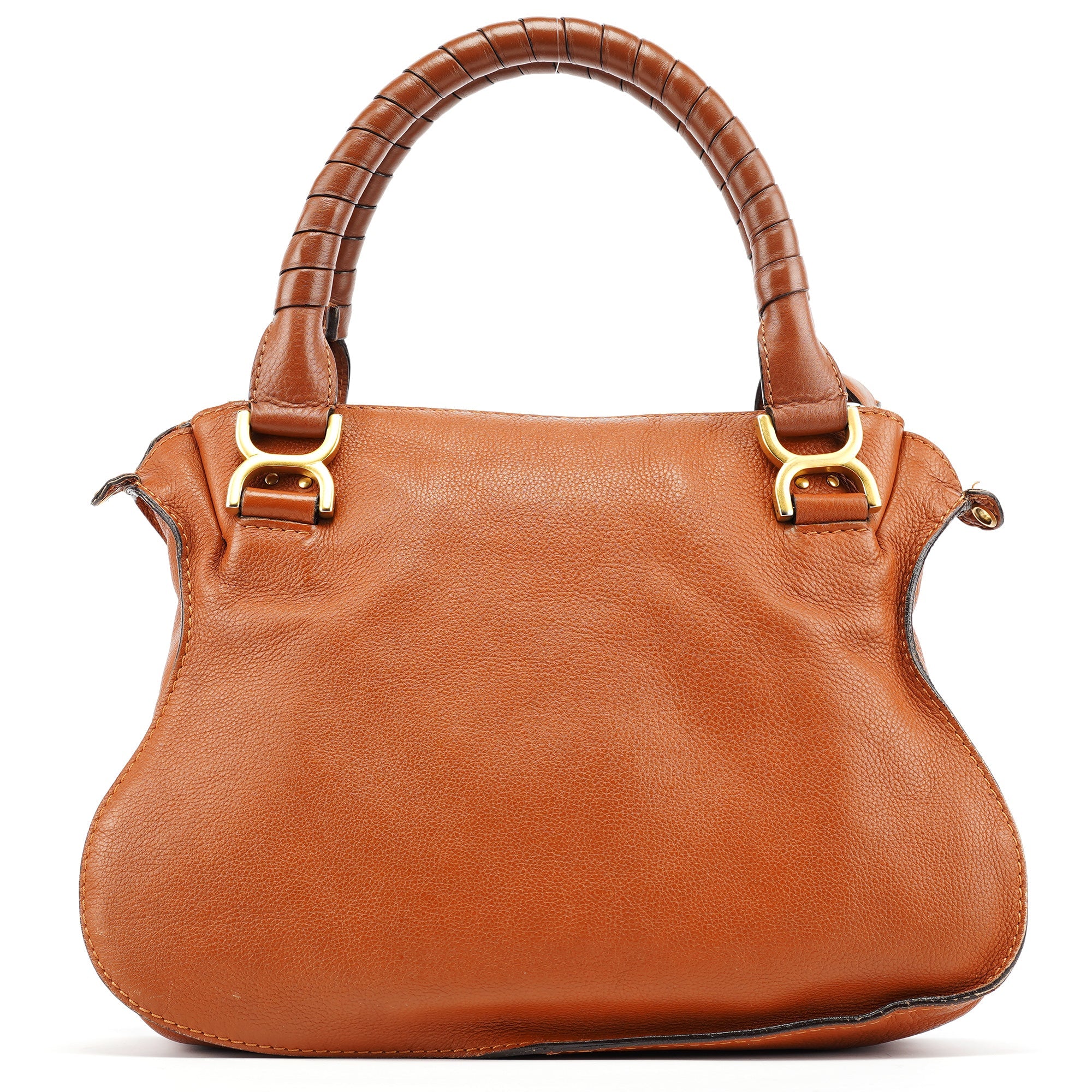 Designed in 2010 by Hannah MacGibbon, this vintage Chloé Marcie double carry bag features rich tan pebbled leather with the model's signature equestrian-inspired aesthetic. The bag showcases wrapped leather handles, the iconic curved saddle pocket with decorative stitching, brass-tone hardware, and versatile carrying options as both a handbag and crossbody. The interior is lined in grey canvas with pockets for organization.