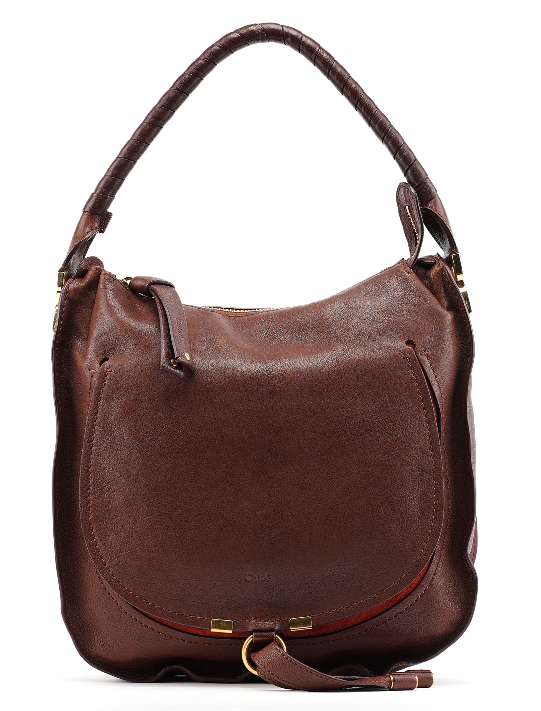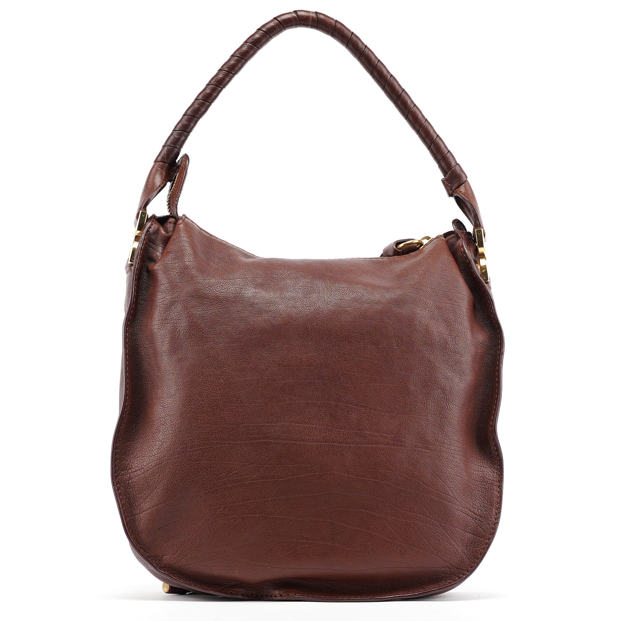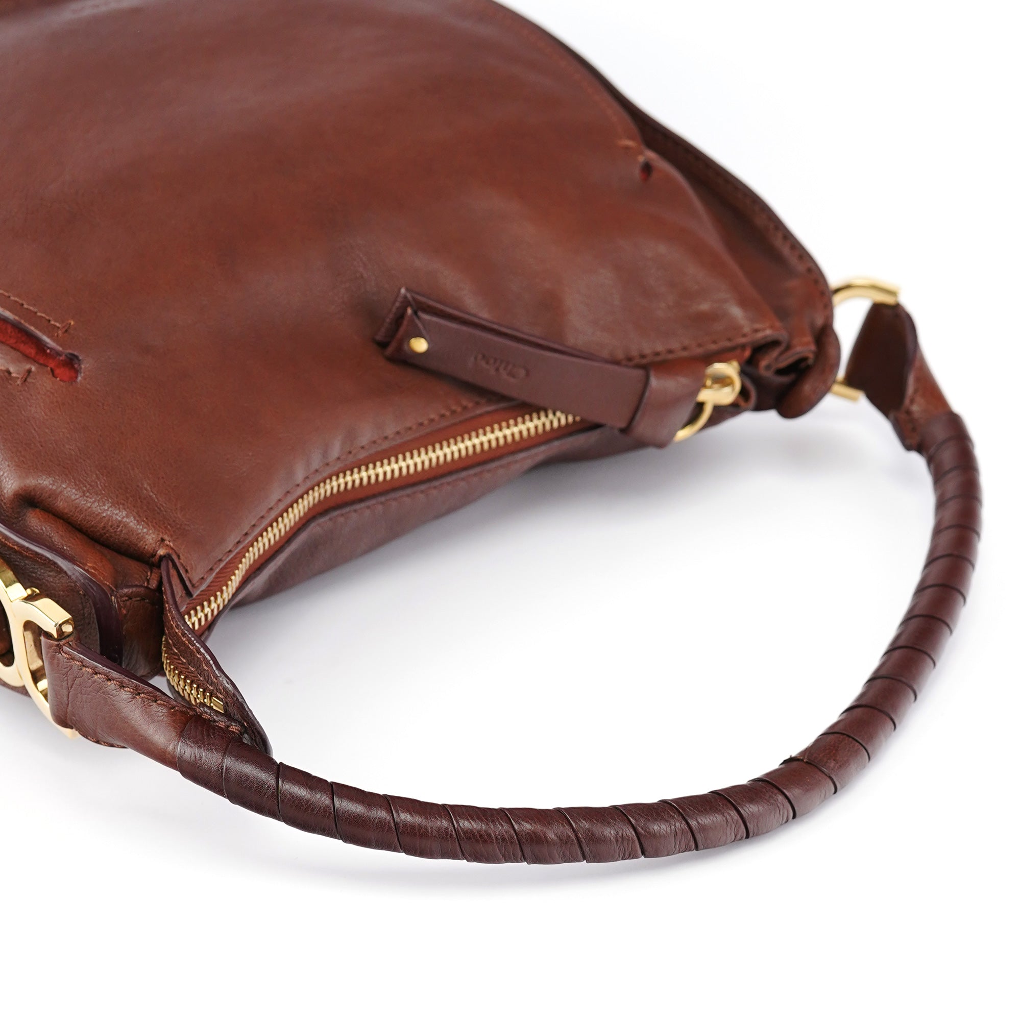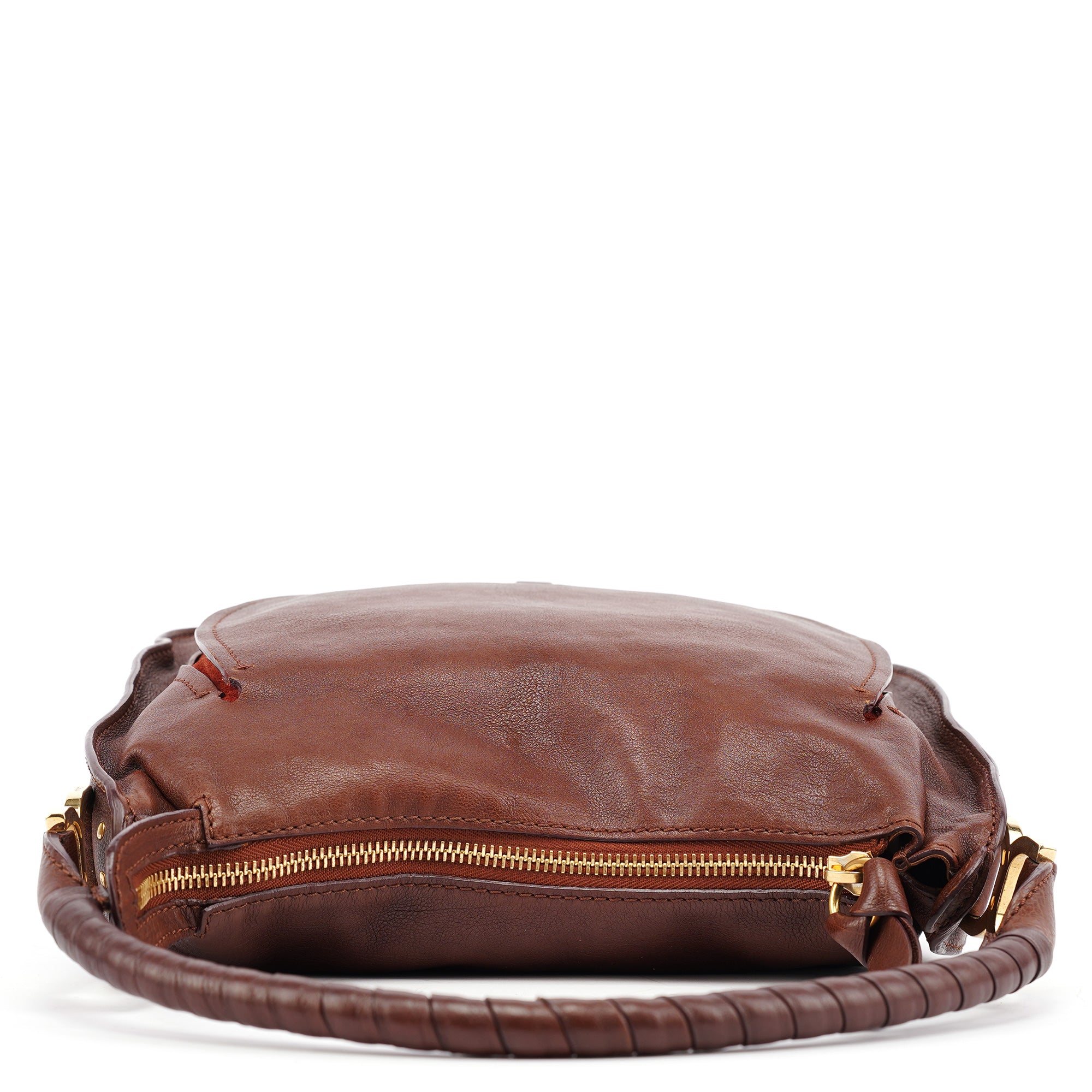 Designed in the 2010s by Clare Waight Keller, this vintage Chloé Marcie shoulder bag features rich brown leather with the model's signature equestrian-inspired saddle-stitch detailing. The slouchy hobo silhouette showcases a braided leather handle, gold-tone hardware, and the distinctive curved front flap with tassel-pull zip closure extending across the front. The spacious interior is lined in beige canvas with an internal zip pocket.