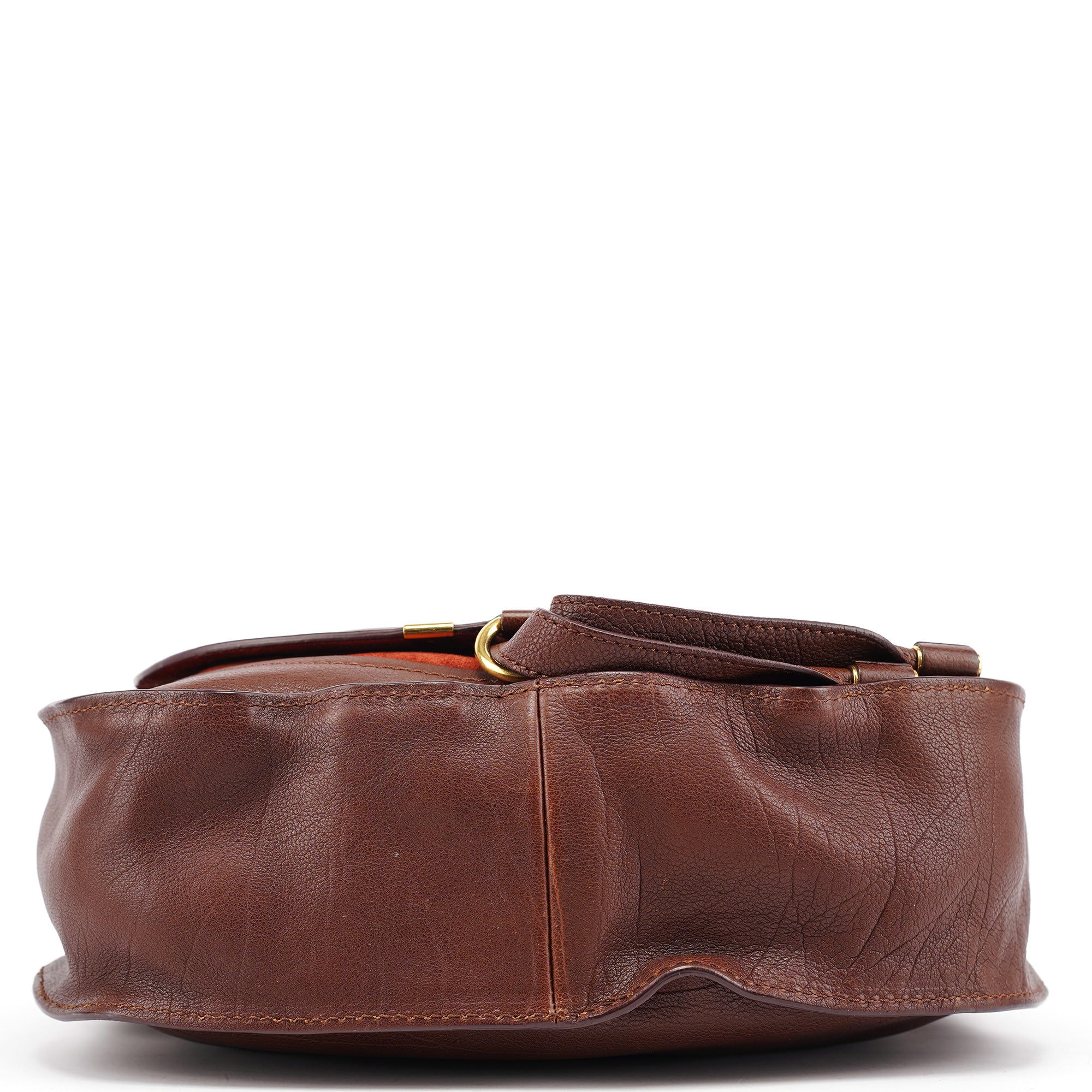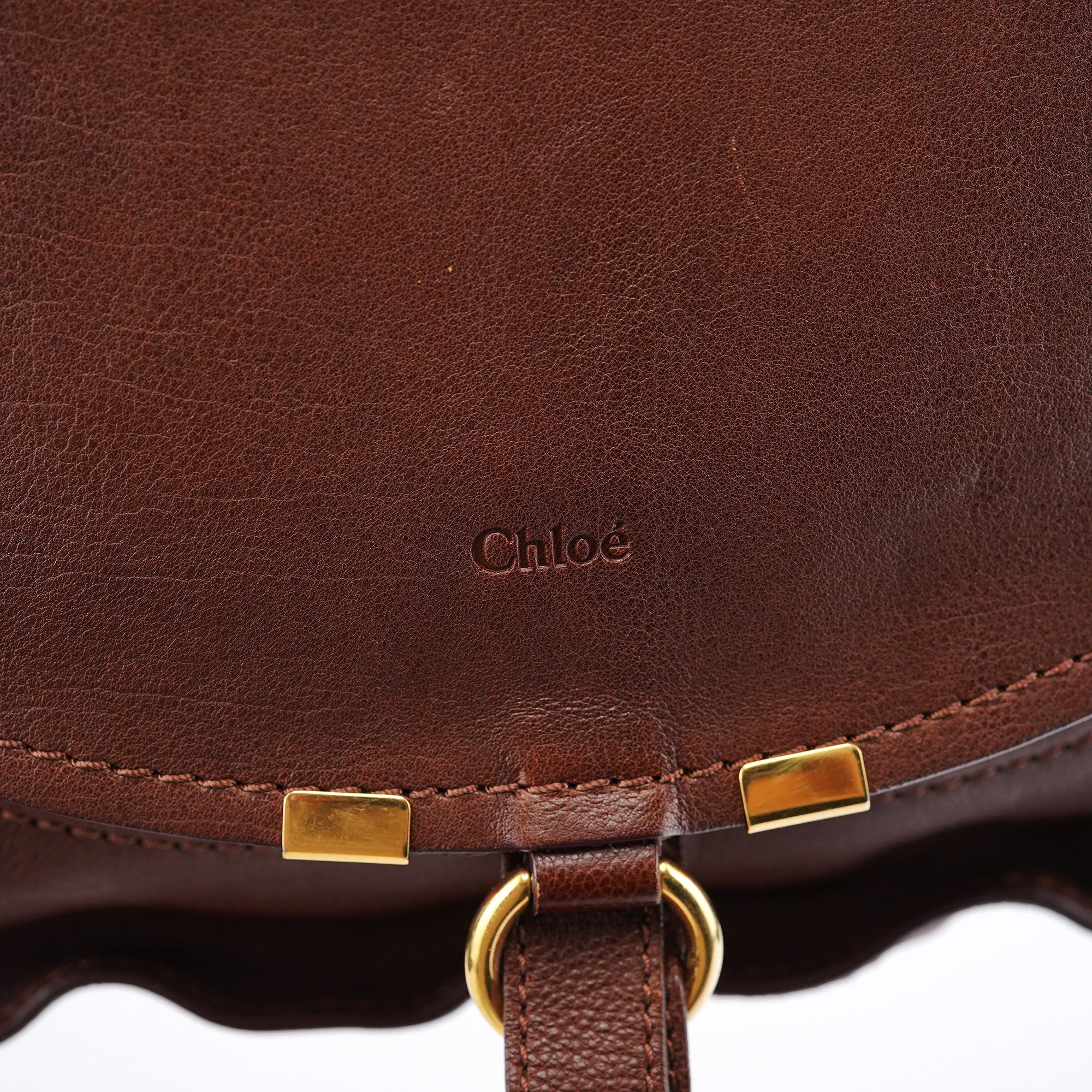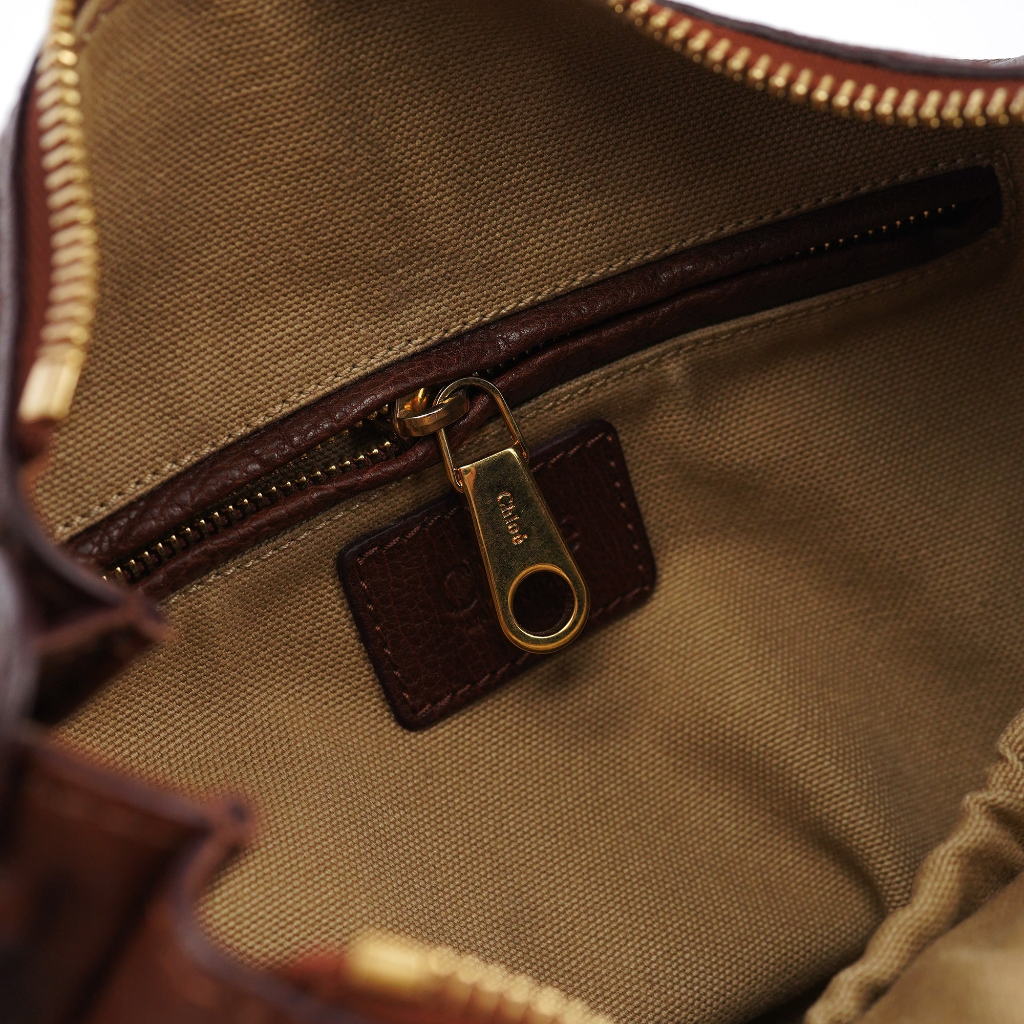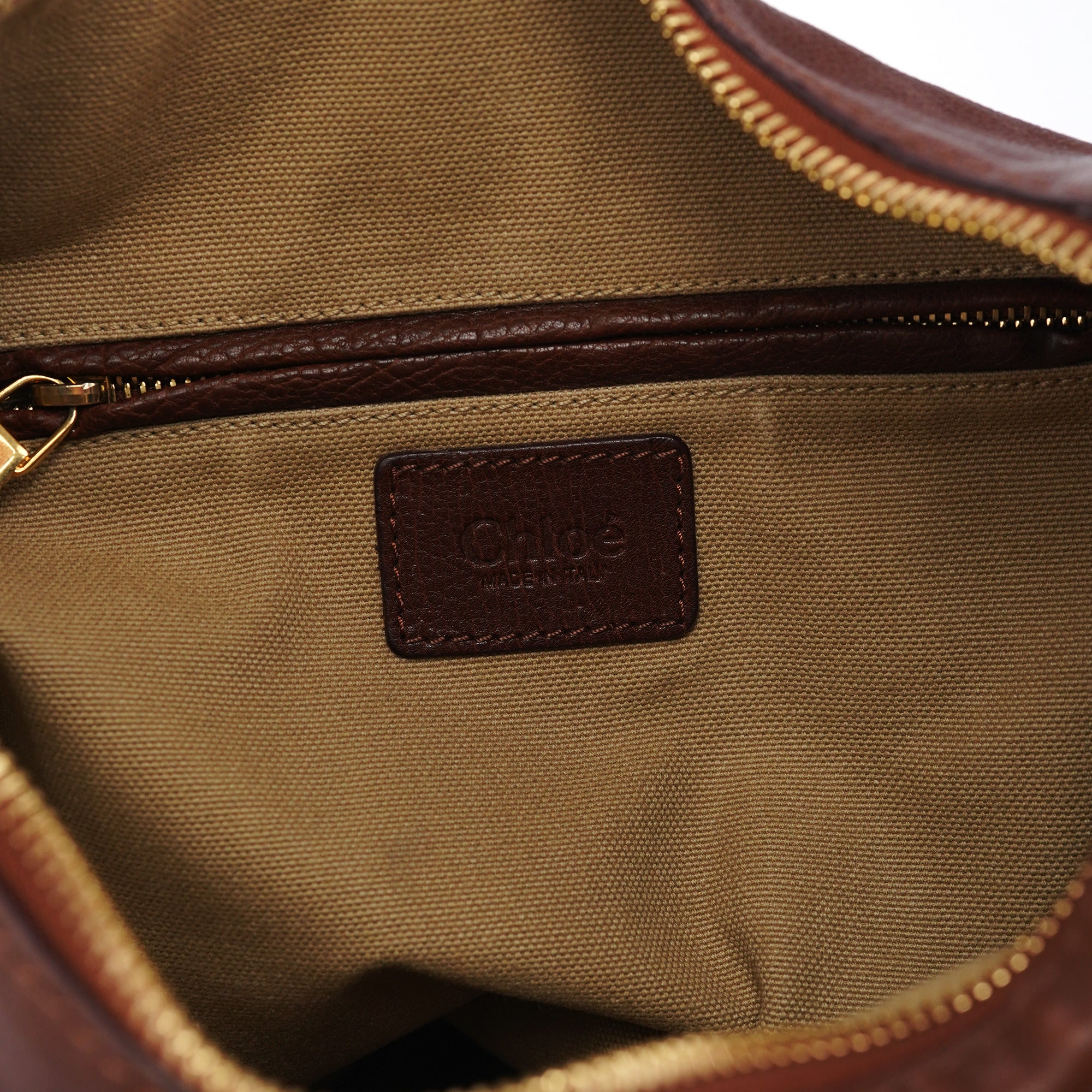 Designed in the 2010s by Clare Waight Keller, this vintage Chloé Marcie shoulder bag features rich brown leather with the model's signature equestrian-inspired saddle-stitch detailing. The slouchy hobo silhouette showcases a braided leather handle, gold-tone hardware, and the distinctive curved front flap with tassel-pull zip closure extending across the front. The spacious interior is lined in beige canvas with an internal zip pocket.