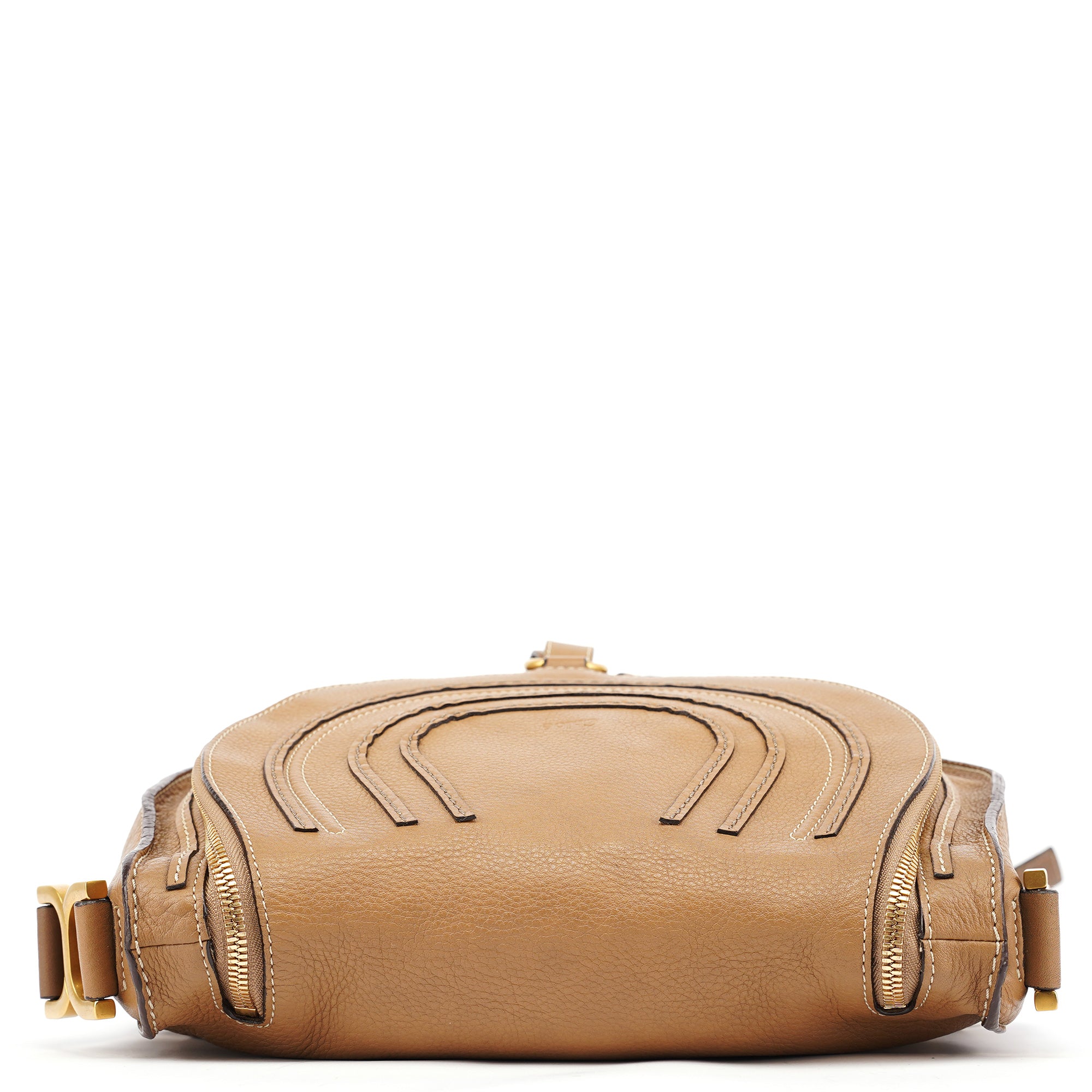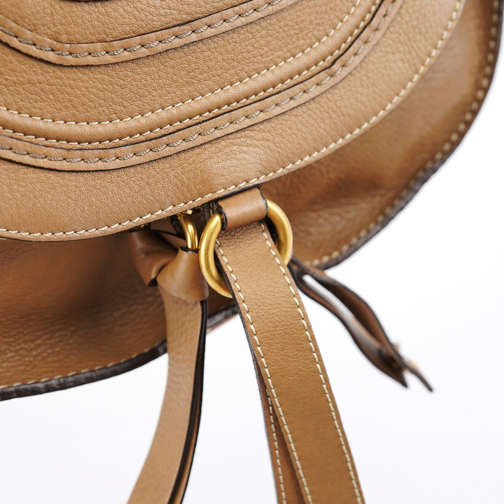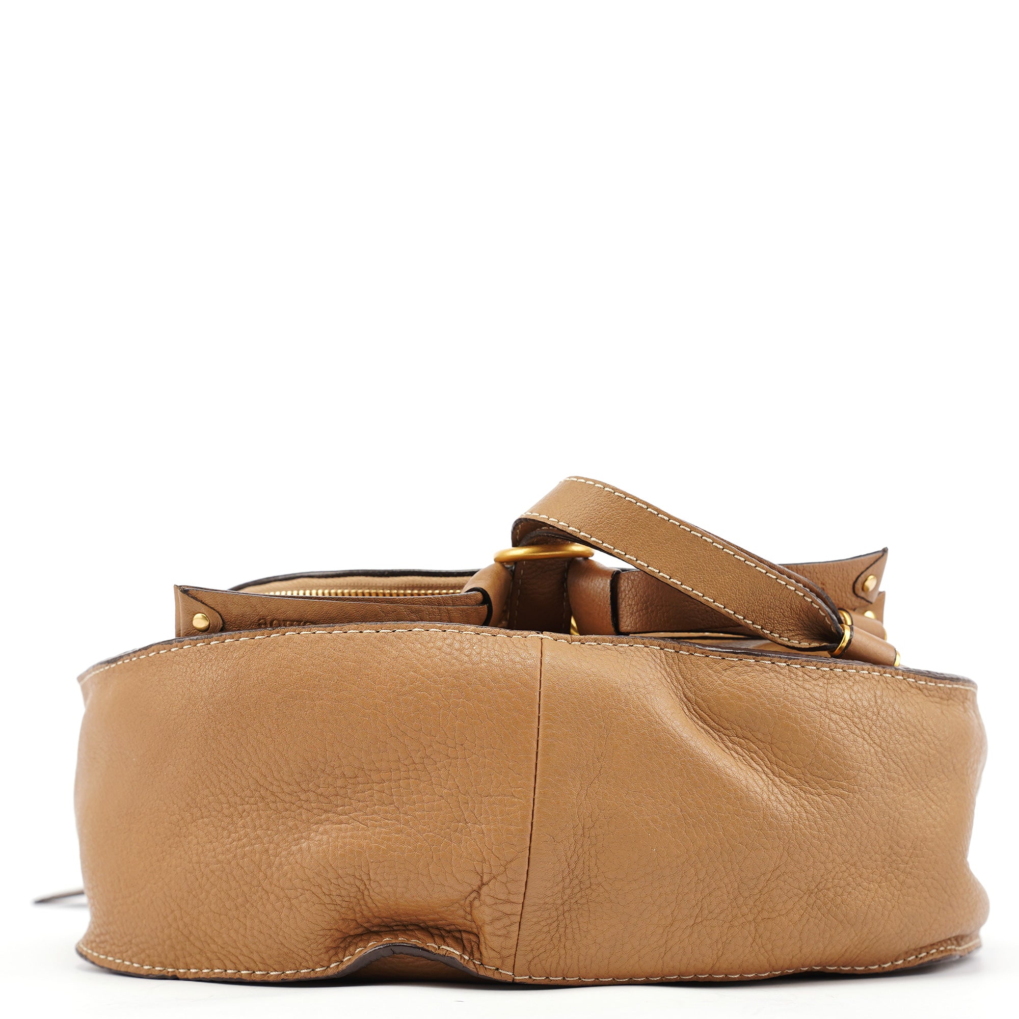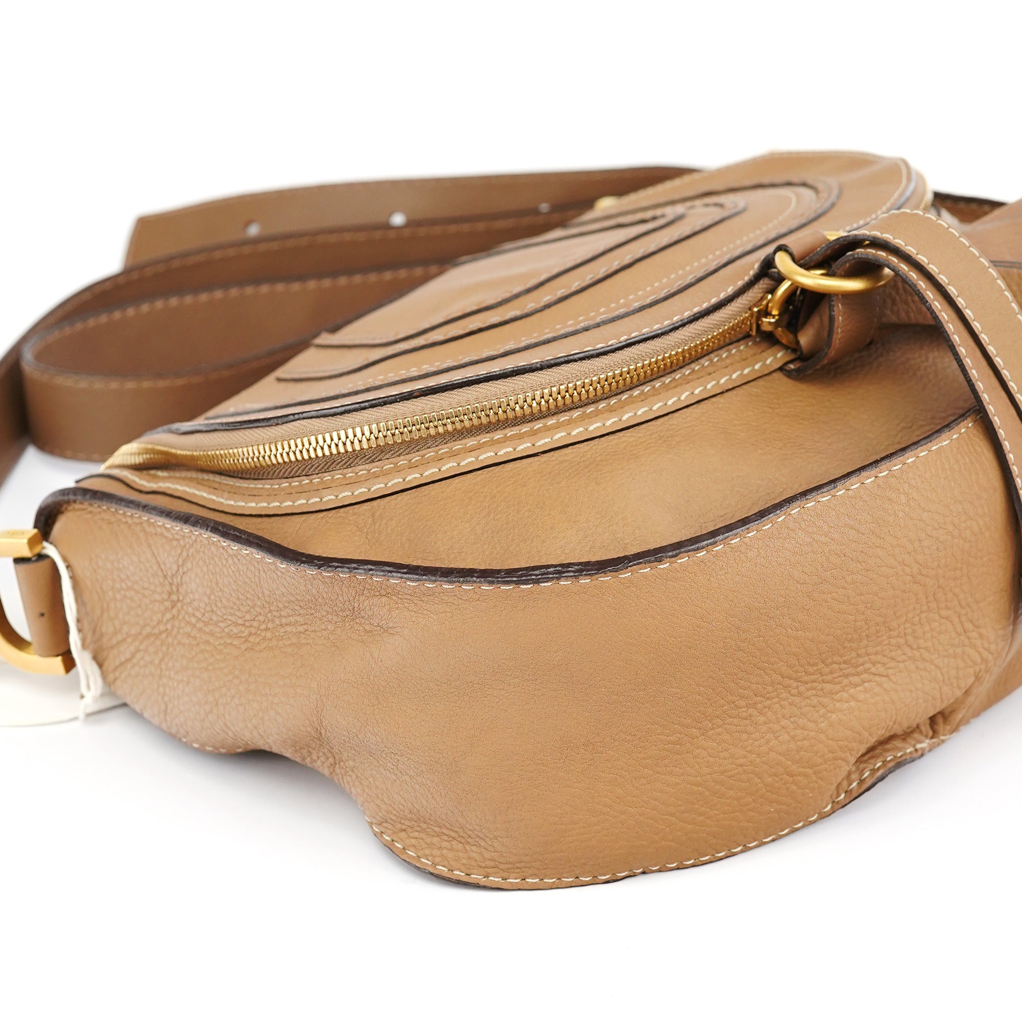 Designed in the 2010s by Hannah McGibbon, this vintage Chloé Marcie crossbody bag represents the brand's continued excellence in bohemian-inspired leather goods. Crafted in supple beige leather with the model's signature rounded saddle silhouette, the bag features distinctive decorative stitching that curves across the front flap, gold-tone hardware, and an adjustable crossbody strap. The flap closure opens to a fabric-lined interior.