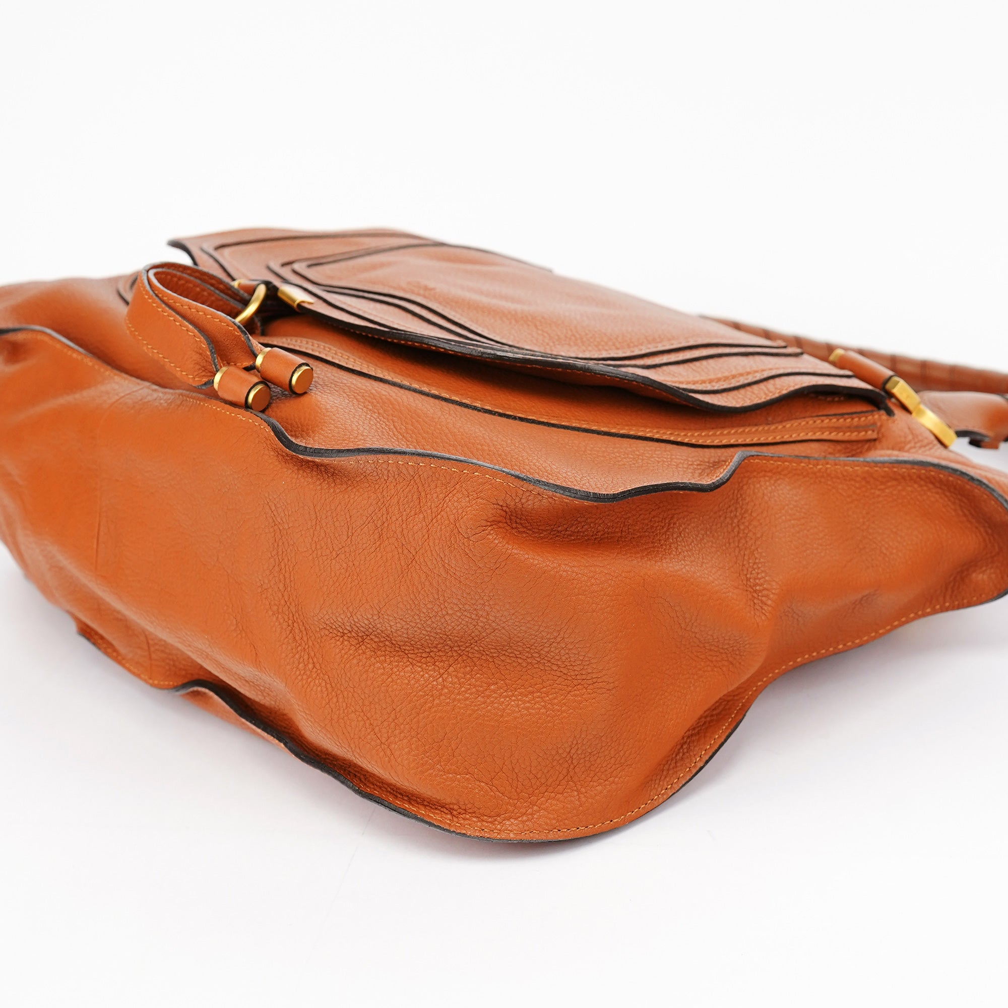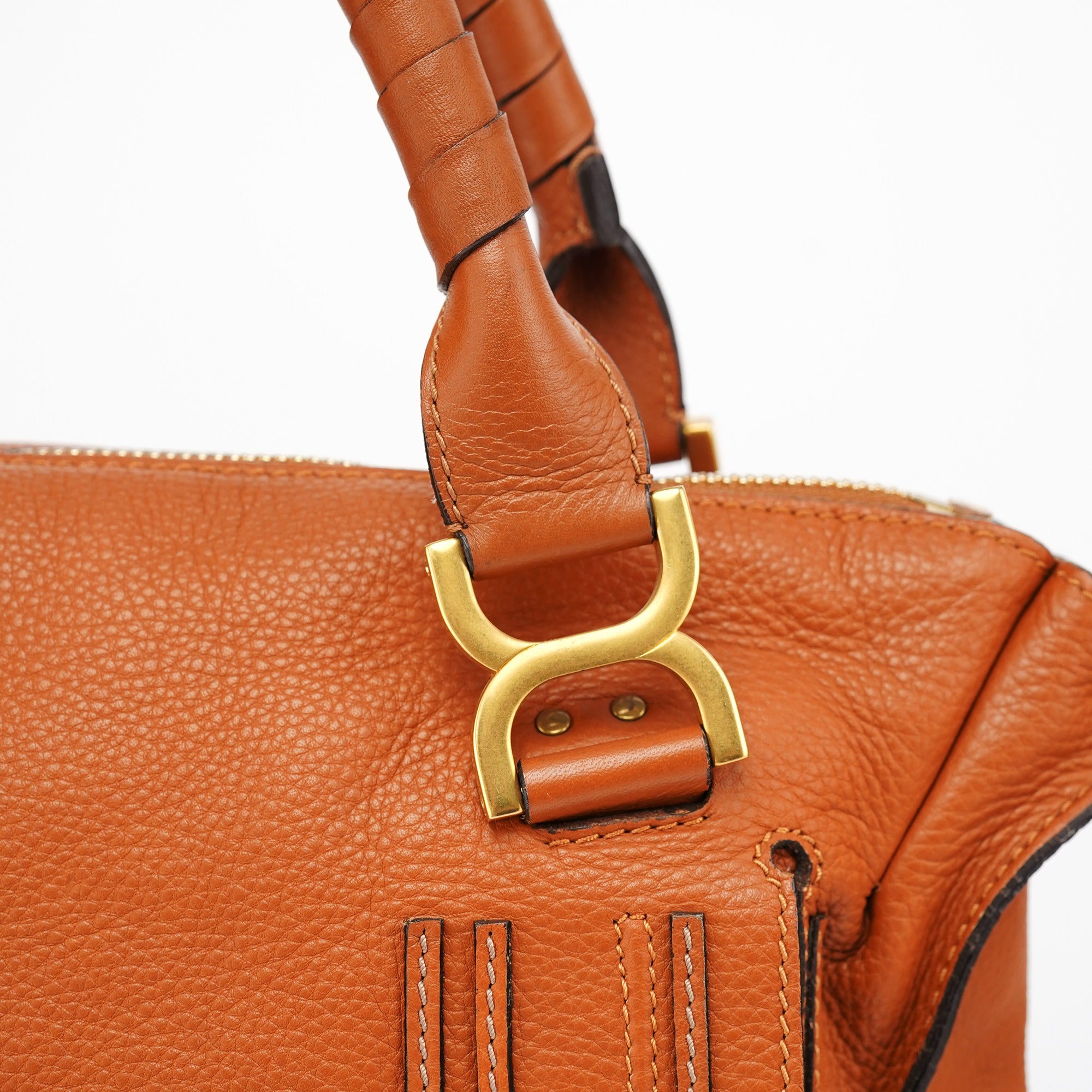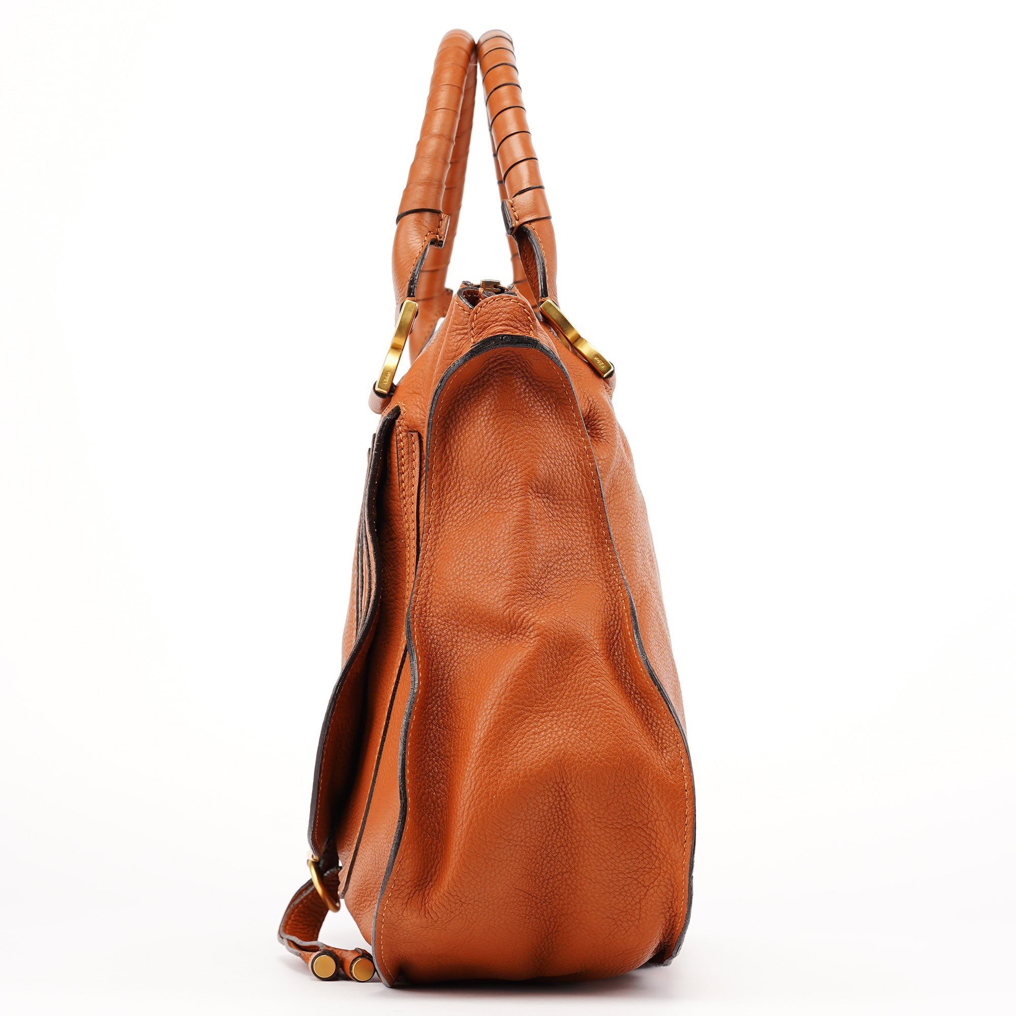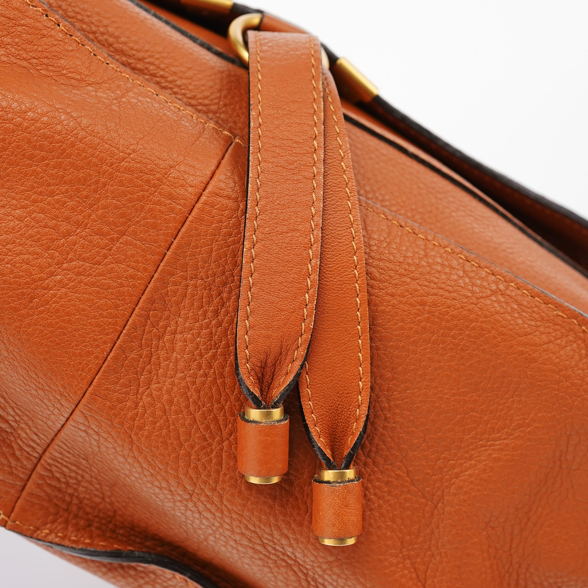 Designed in the early 2010s by Clare Waight Keller, this Chloé Marcie bag is crafted in rich tan pebbled leather with saddle stitching, wrapped top handles, and signature gold-tone hardware. The rounded front flap features layered detailing and a tassel pull, while the interior includes a canvas-lined compartment with a zip pocket and slip pocket for organization. A structured yet slouchy silhouette adds everyday versatility to this iconic design.