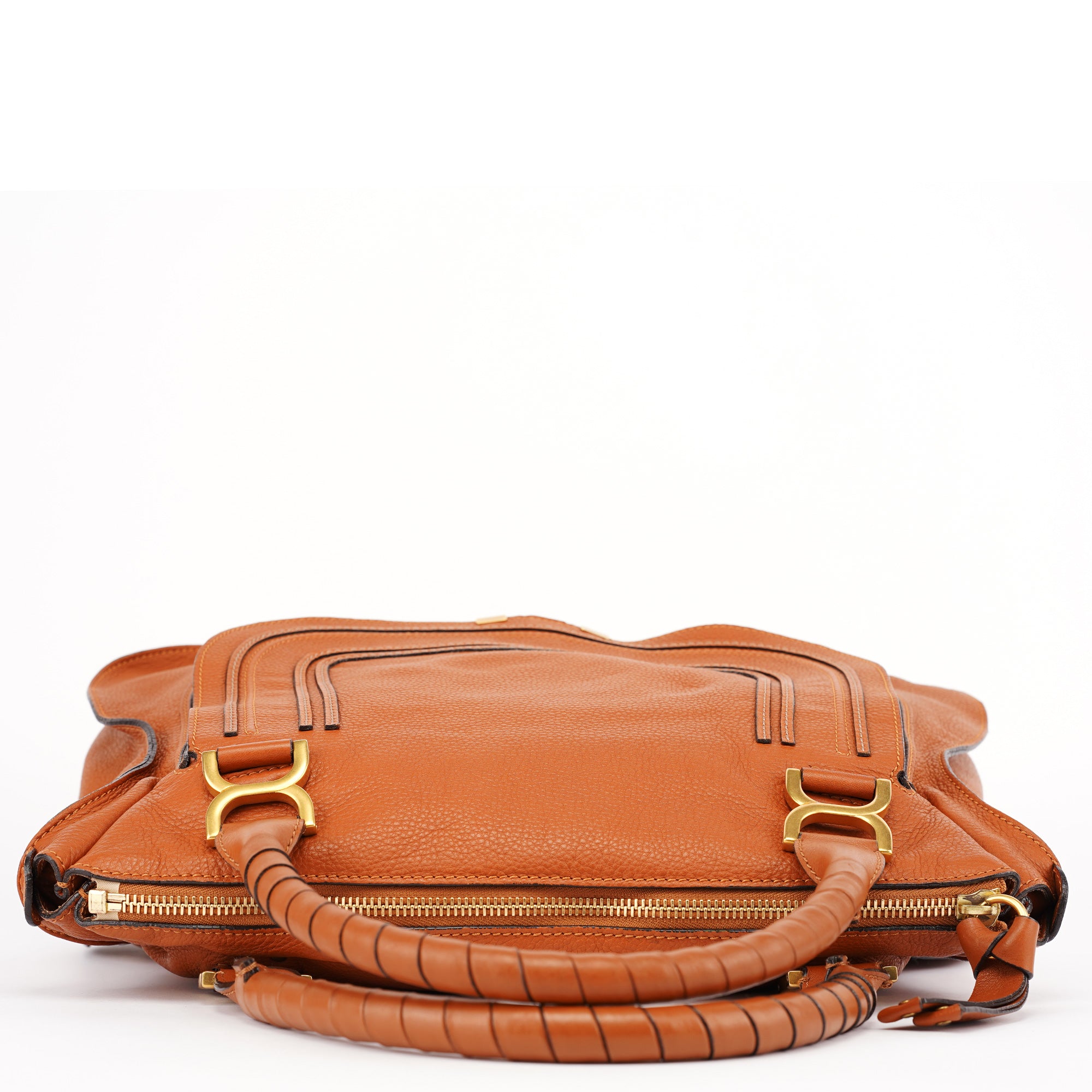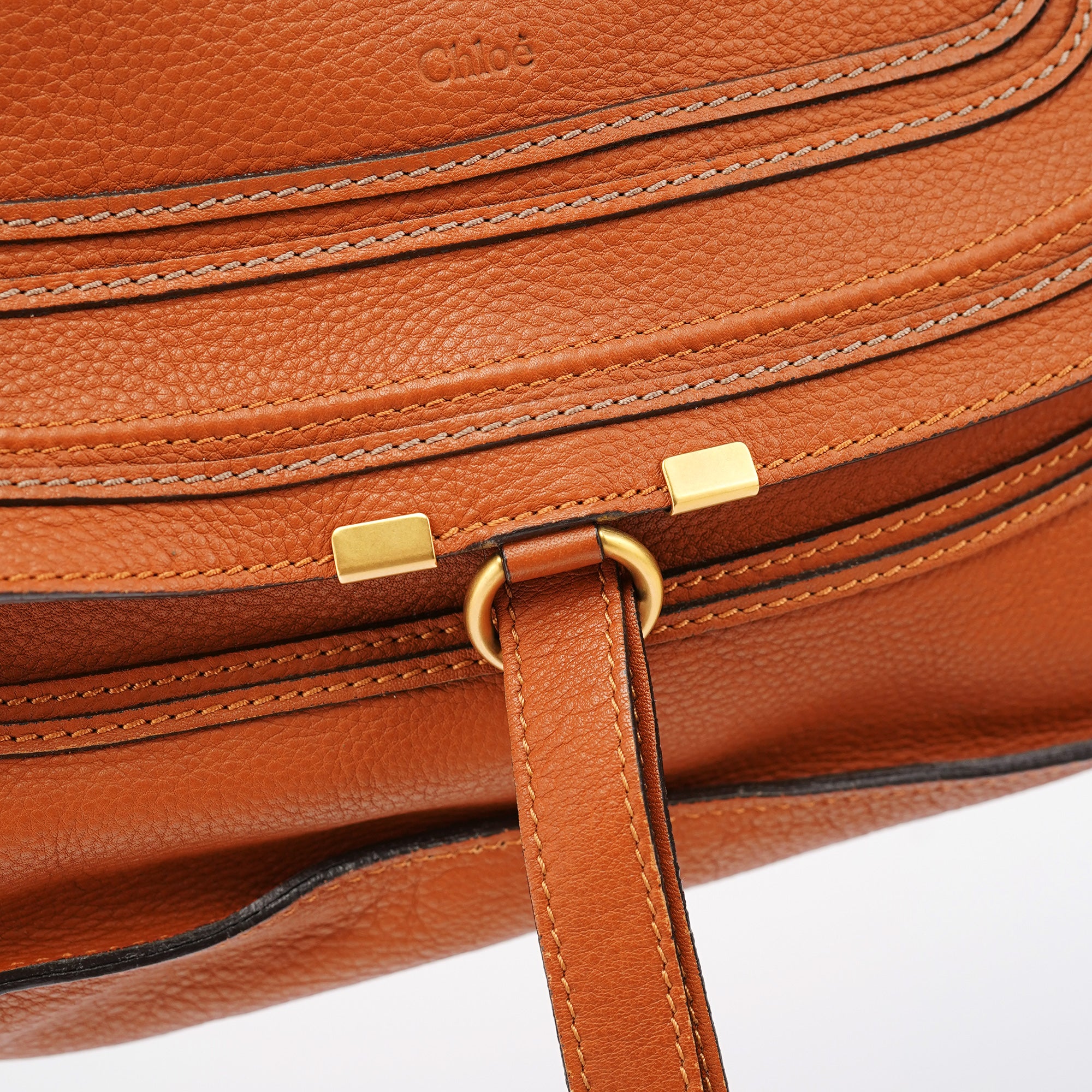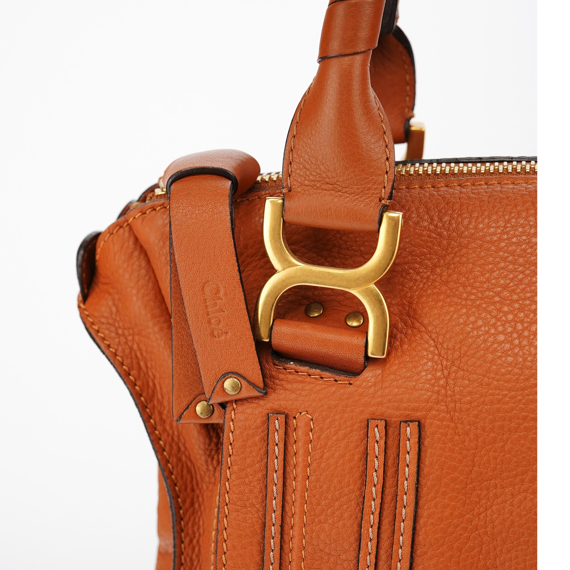 Designed in the early 2010s by Clare Waight Keller, this Chloé Marcie bag is crafted in rich tan pebbled leather with saddle stitching, wrapped top handles, and signature gold-tone hardware. The rounded front flap features layered detailing and a tassel pull, while the interior includes a canvas-lined compartment with a zip pocket and slip pocket for organization. A structured yet slouchy silhouette adds everyday versatility to this iconic design.
