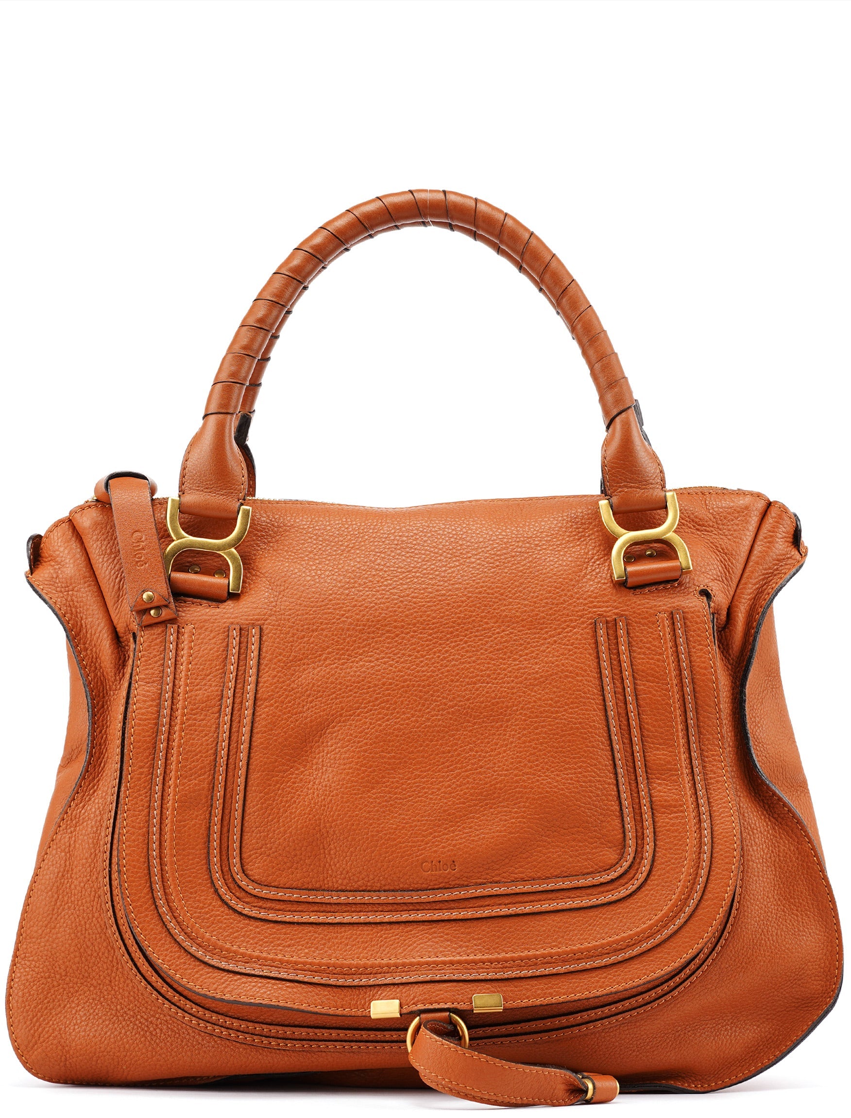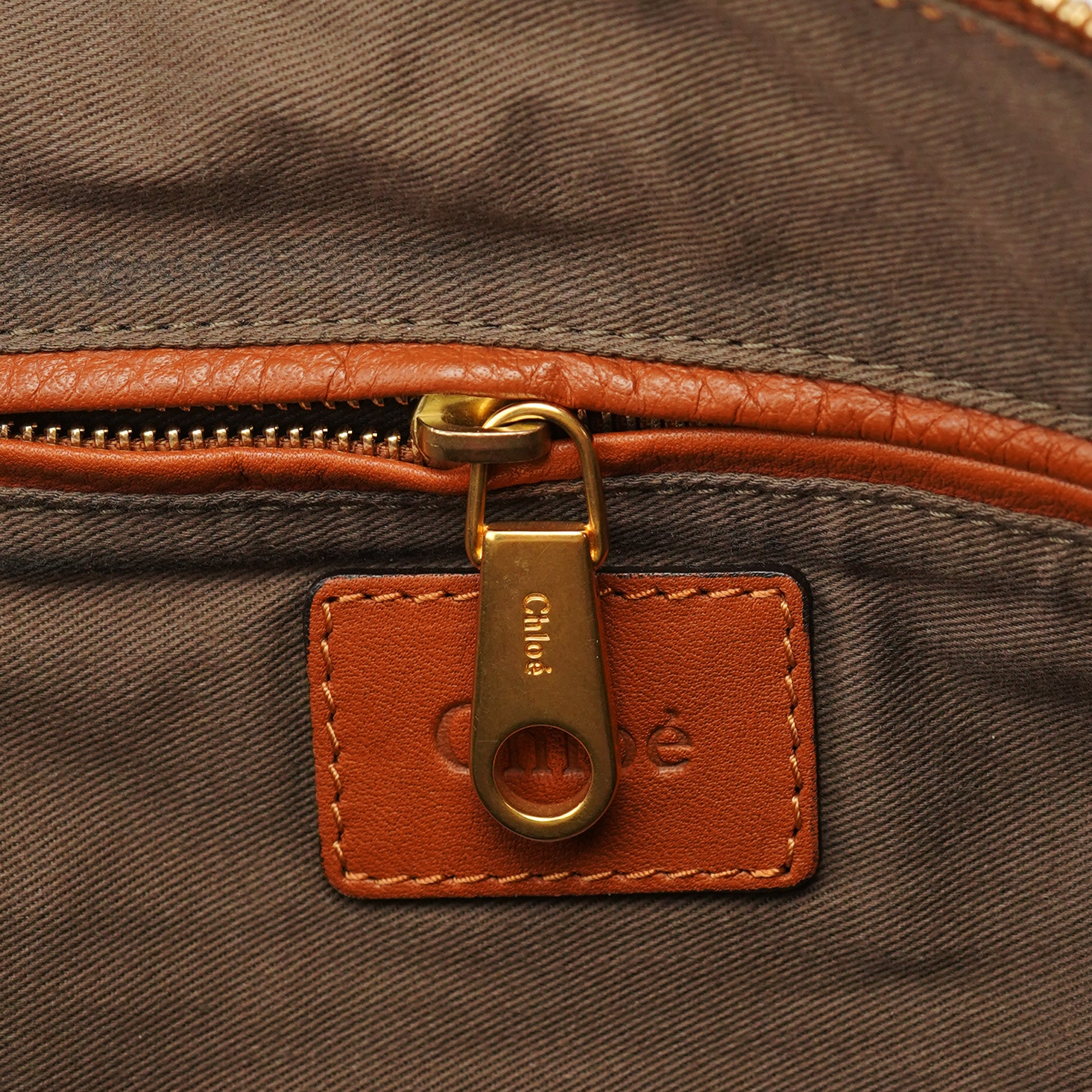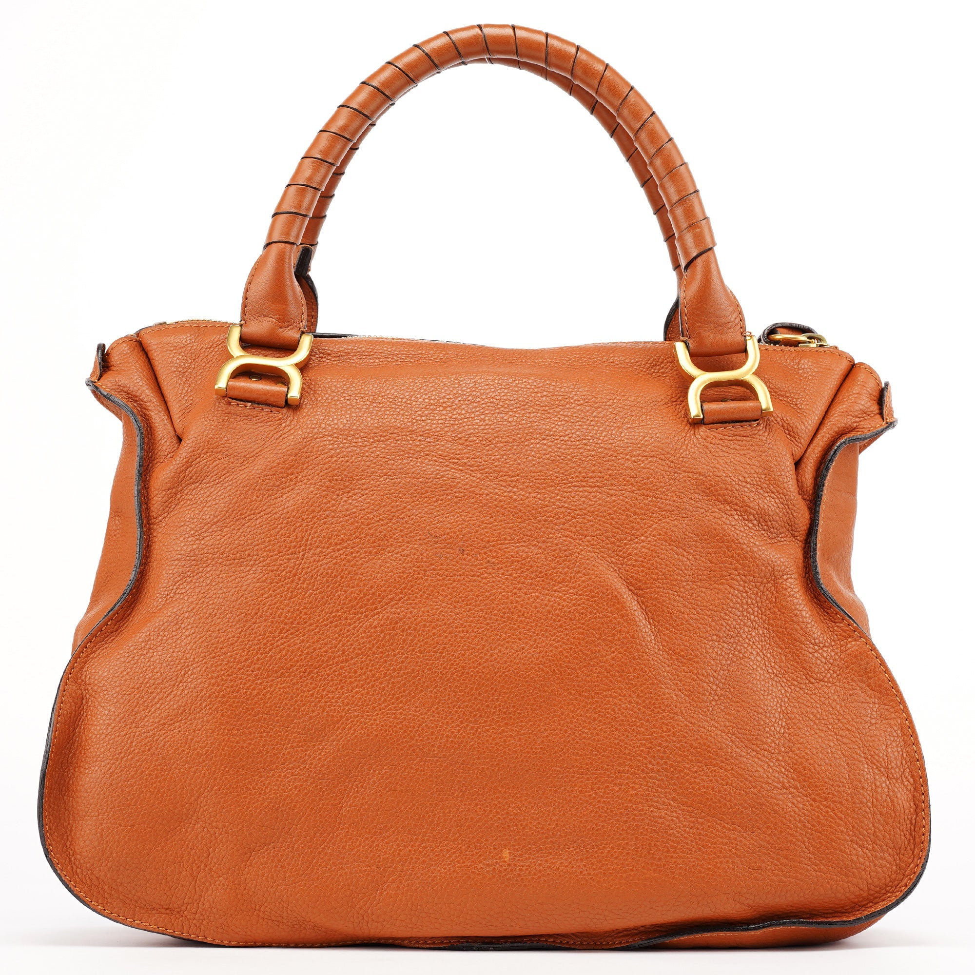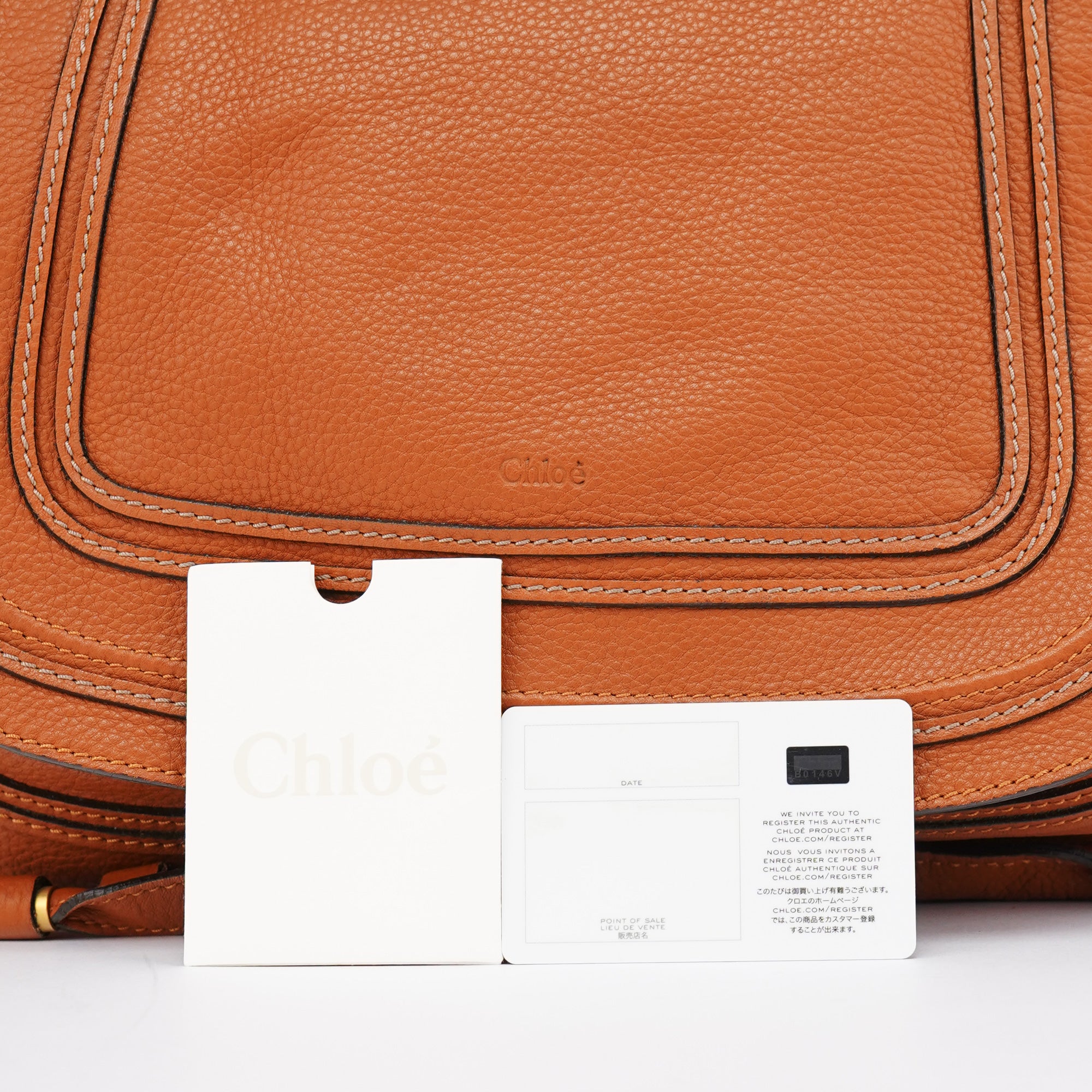 Designed in the early 2010s by Clare Waight Keller, this Chloé Marcie bag is crafted in rich tan pebbled leather with saddle stitching, wrapped top handles, and signature gold-tone hardware. The rounded front flap features layered detailing and a tassel pull, while the interior includes a canvas-lined compartment with a zip pocket and slip pocket for organization. A structured yet slouchy silhouette adds everyday versatility to this iconic design.