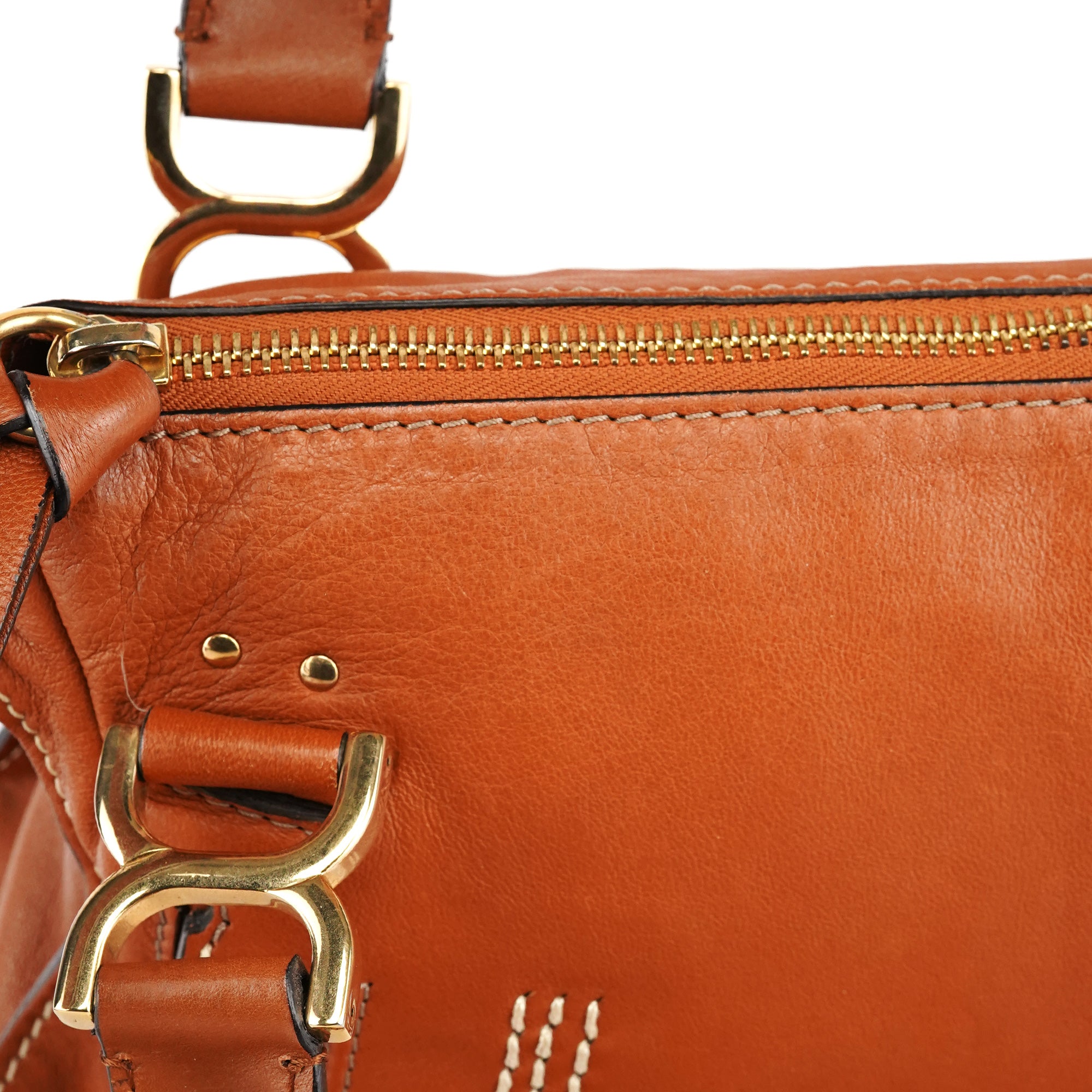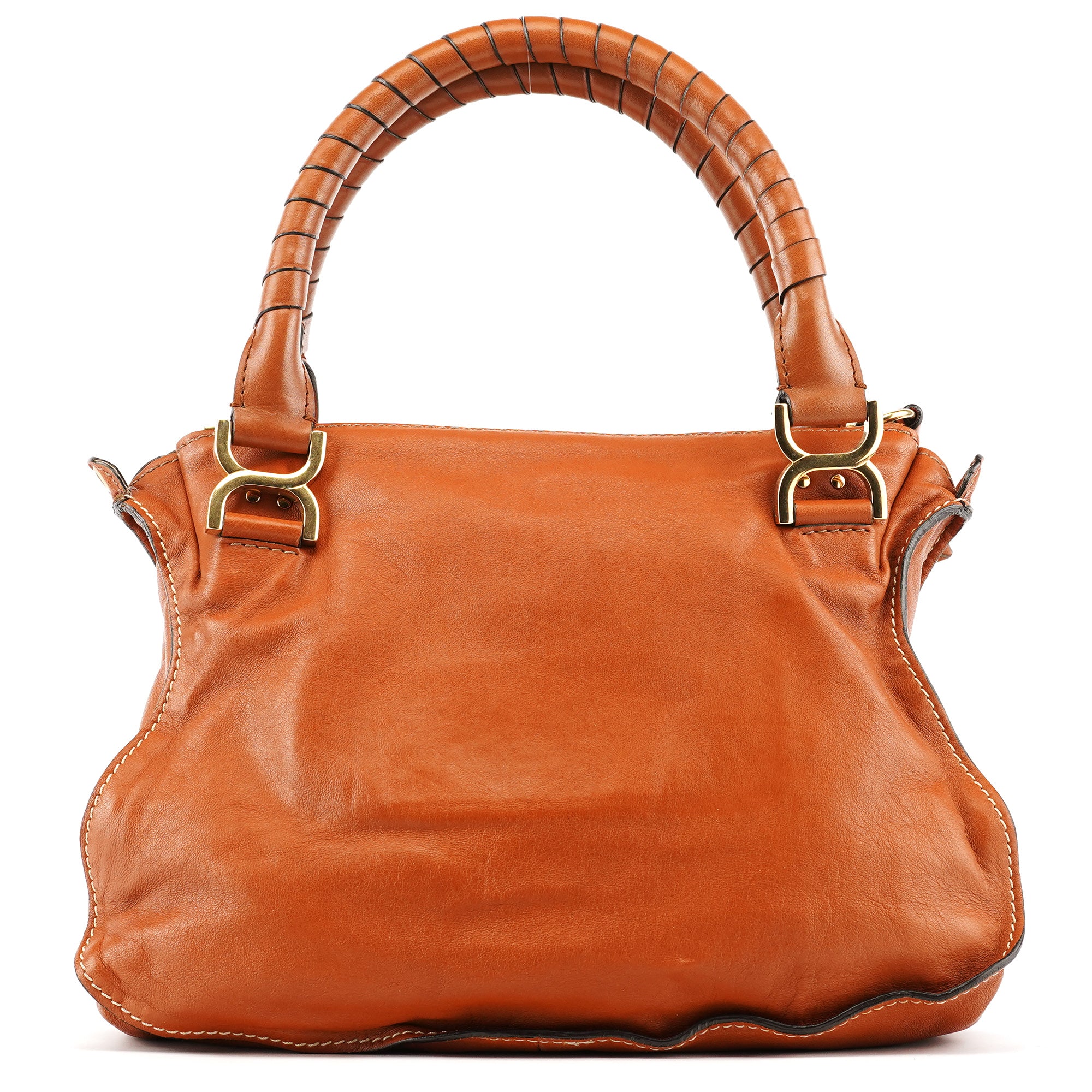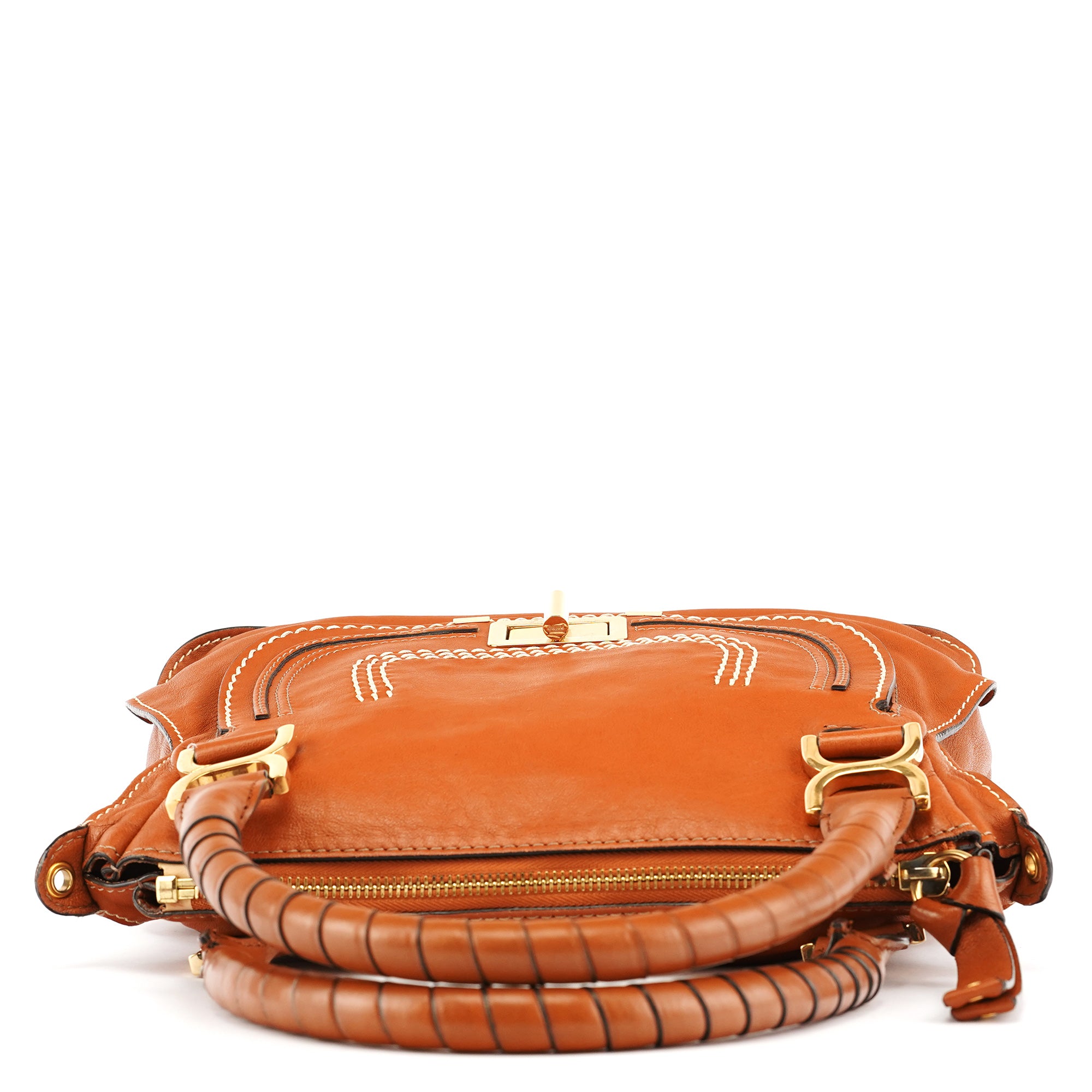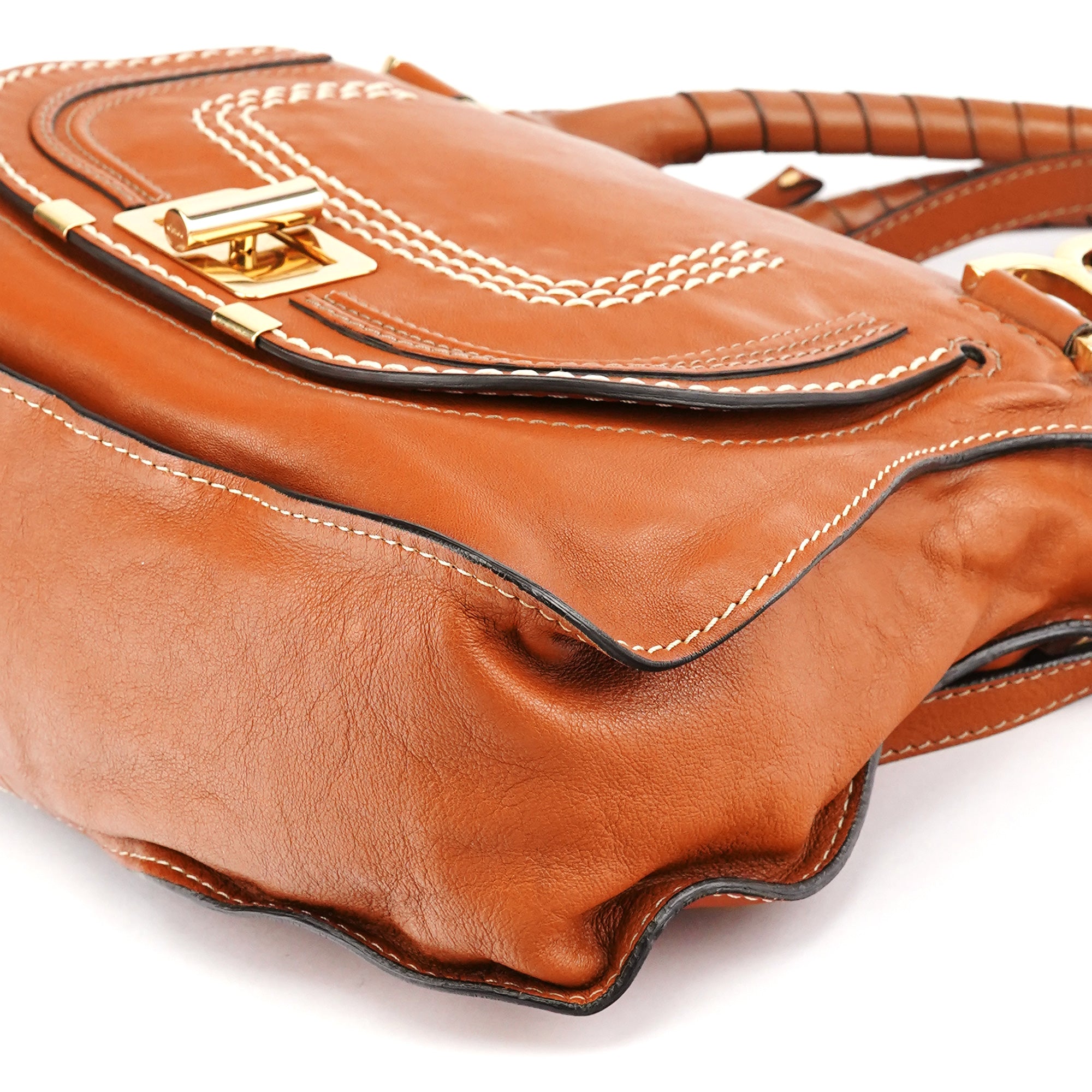Designed in 2010 by Hannah MacGibbon, the Chloé Marcie Turnlock 2-Way bag is crafted from tan leather with contrast stitching and gold-tone hardware. It features a curved front flap with turnlock closure, wrapped handles, and a removable shoulder strap. The beige twill interior includes a zip pocket.