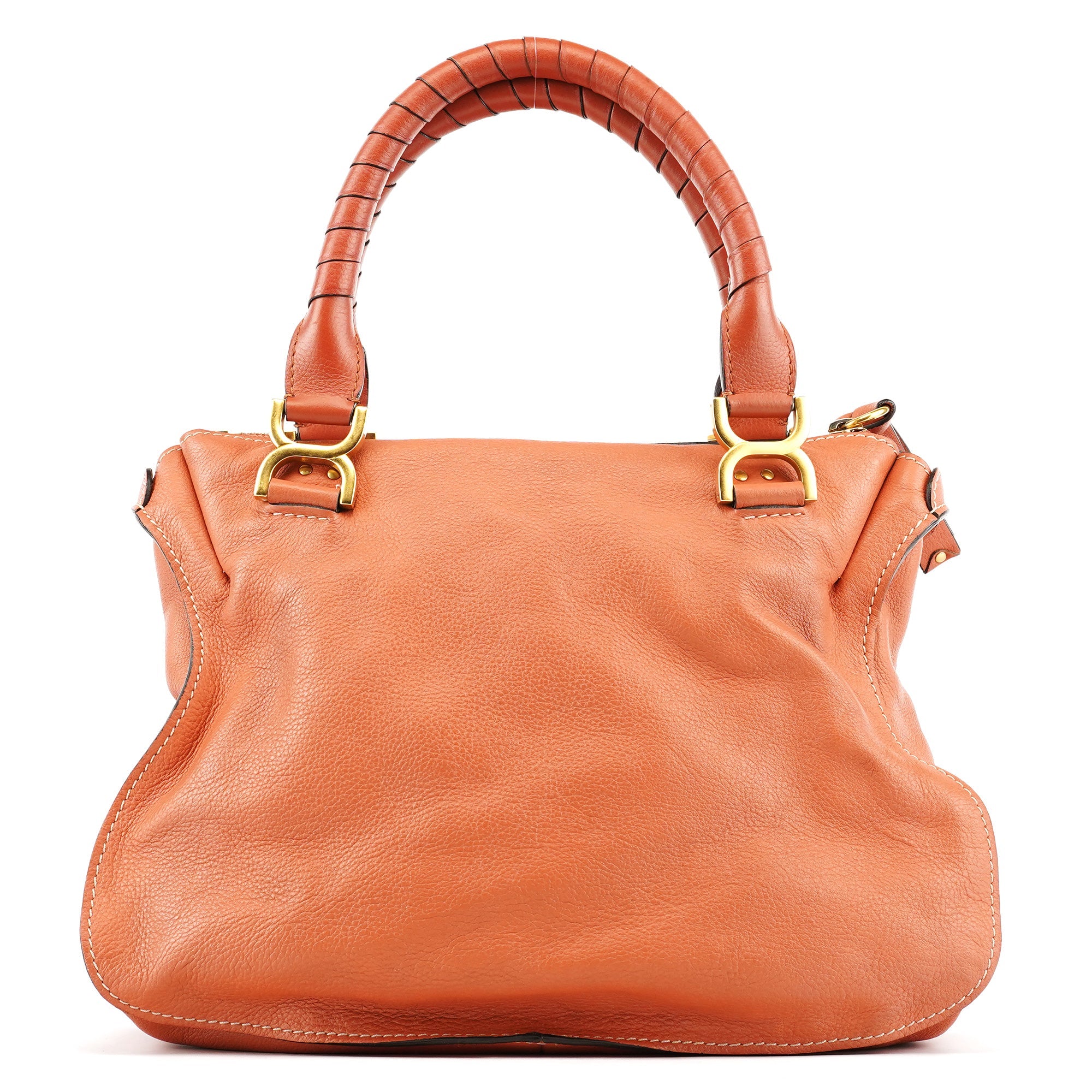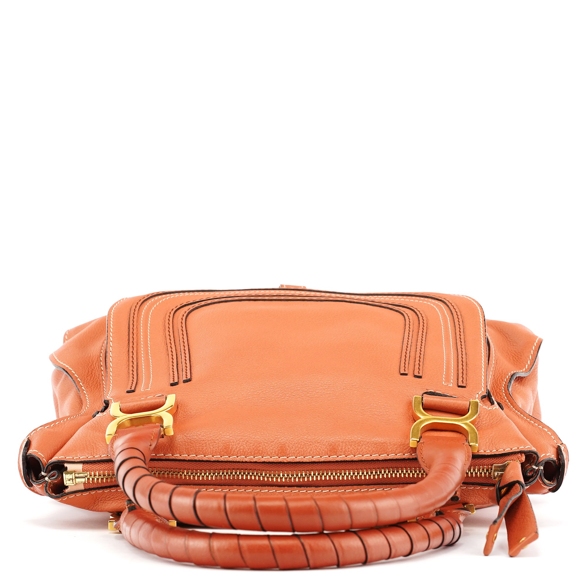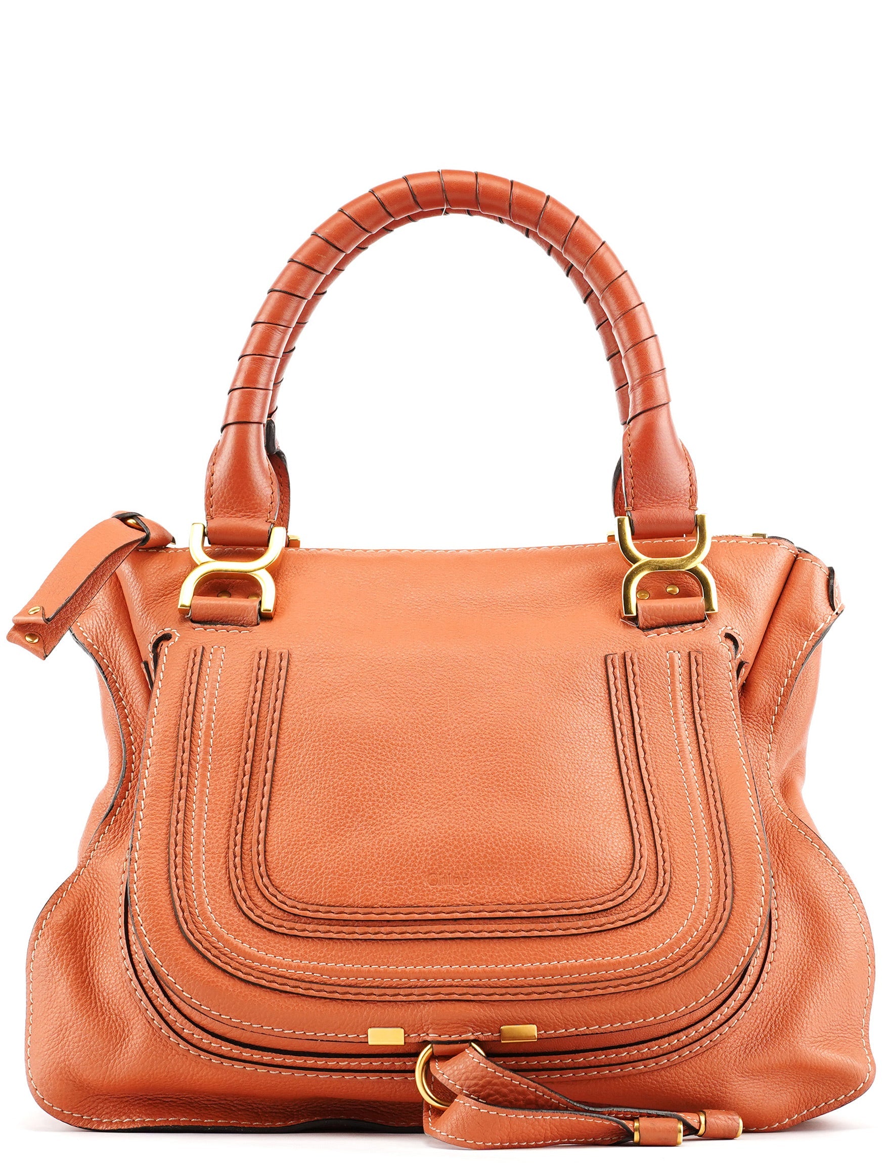 Designed in 2010 by Hannah MacGibbon, the Chloé Marcie bag is crafted from coral-coloured grained leather with wrapped top handles and brass hardware. The front features saddle-inspired stitching and curved panel detailing, while the zip-top opens to a canvas-lined interior with a zip pocket.