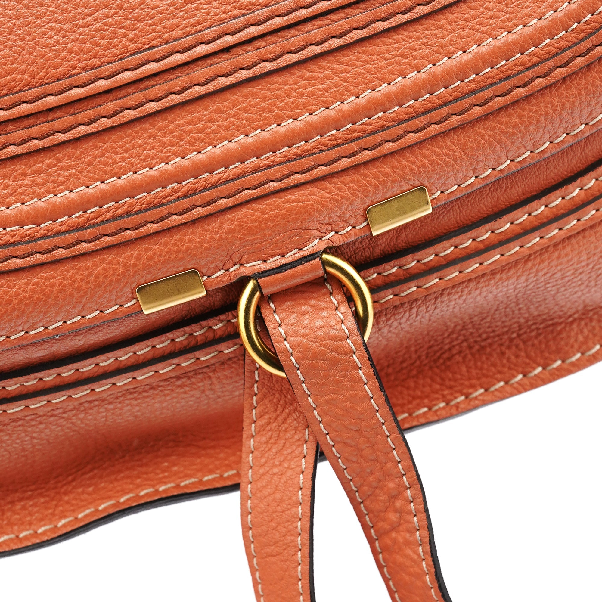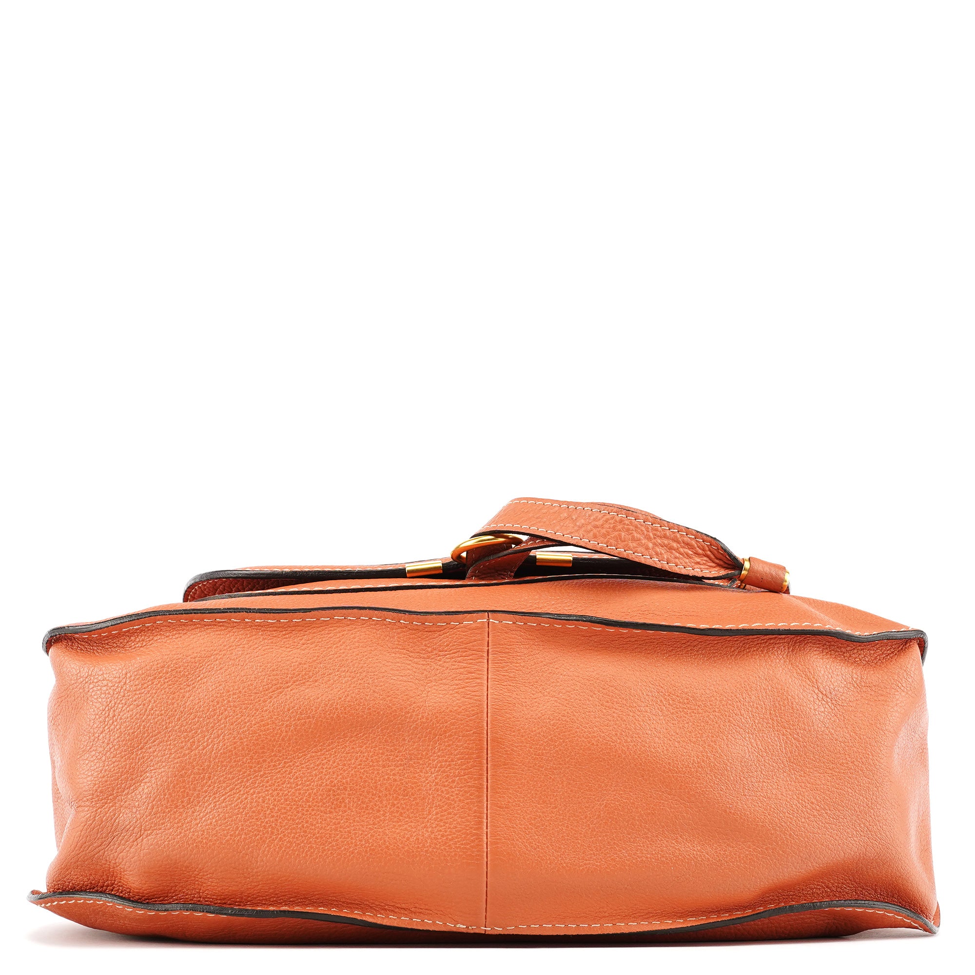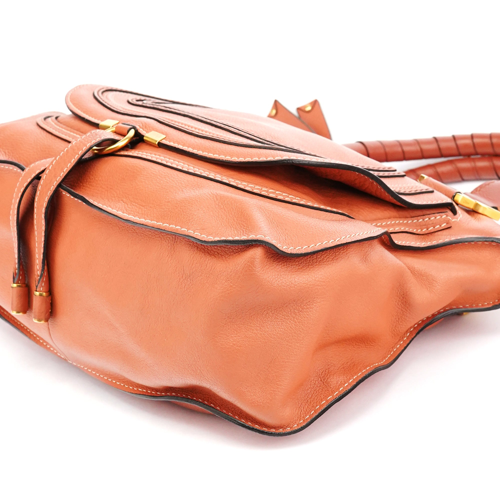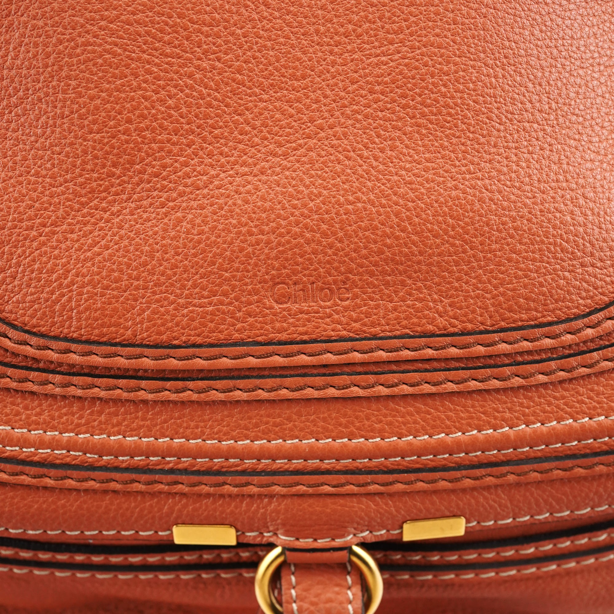 Designed in 2010 by Hannah MacGibbon, the Chloé Marcie bag is crafted from coral-coloured grained leather with wrapped top handles and brass hardware. The front features saddle-inspired stitching and curved panel detailing, while the zip-top opens to a canvas-lined interior with a zip pocket.