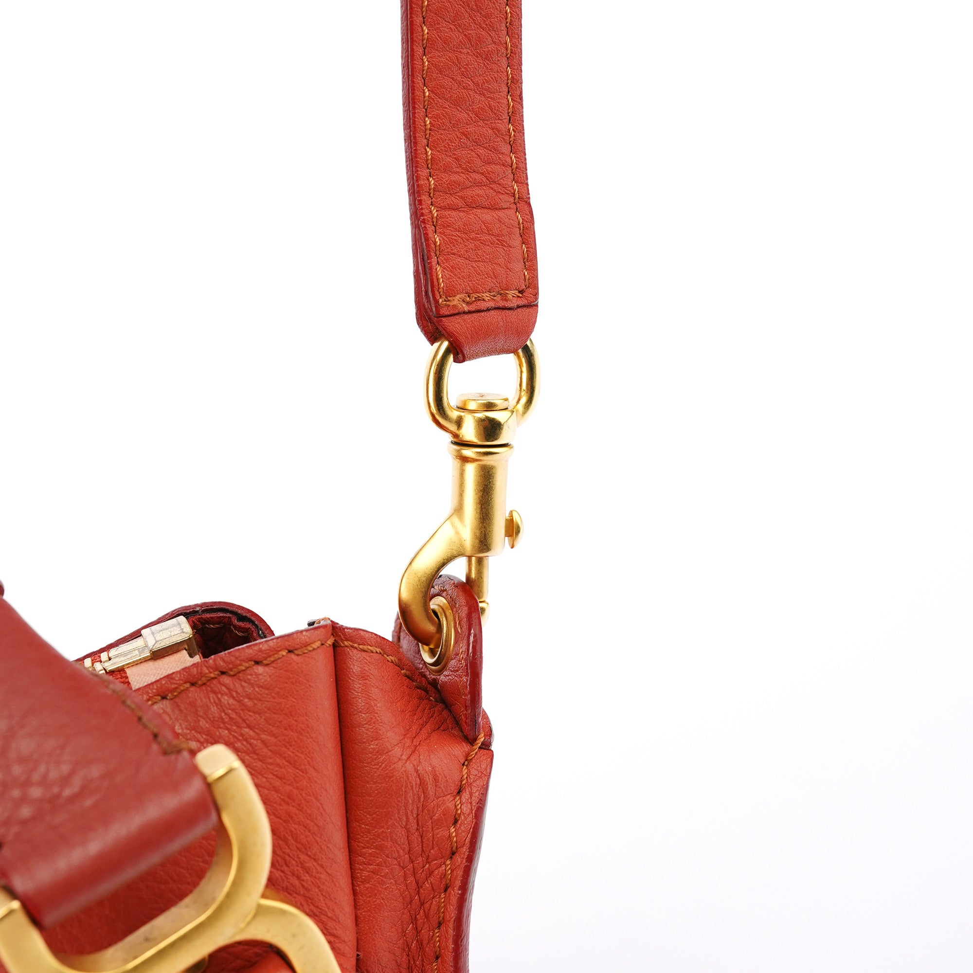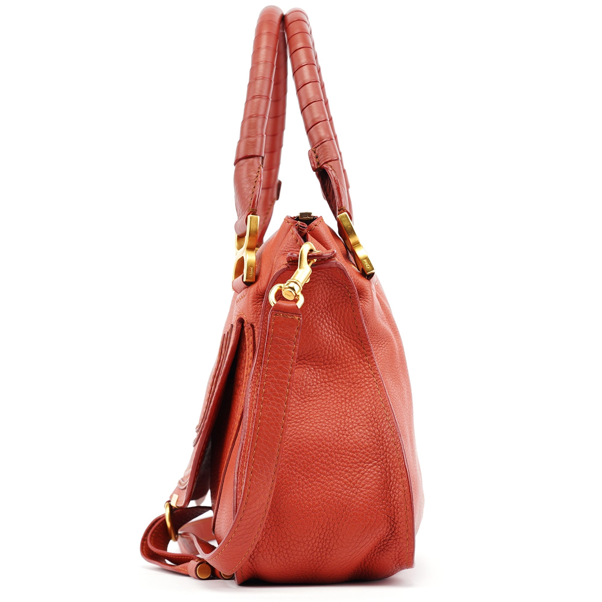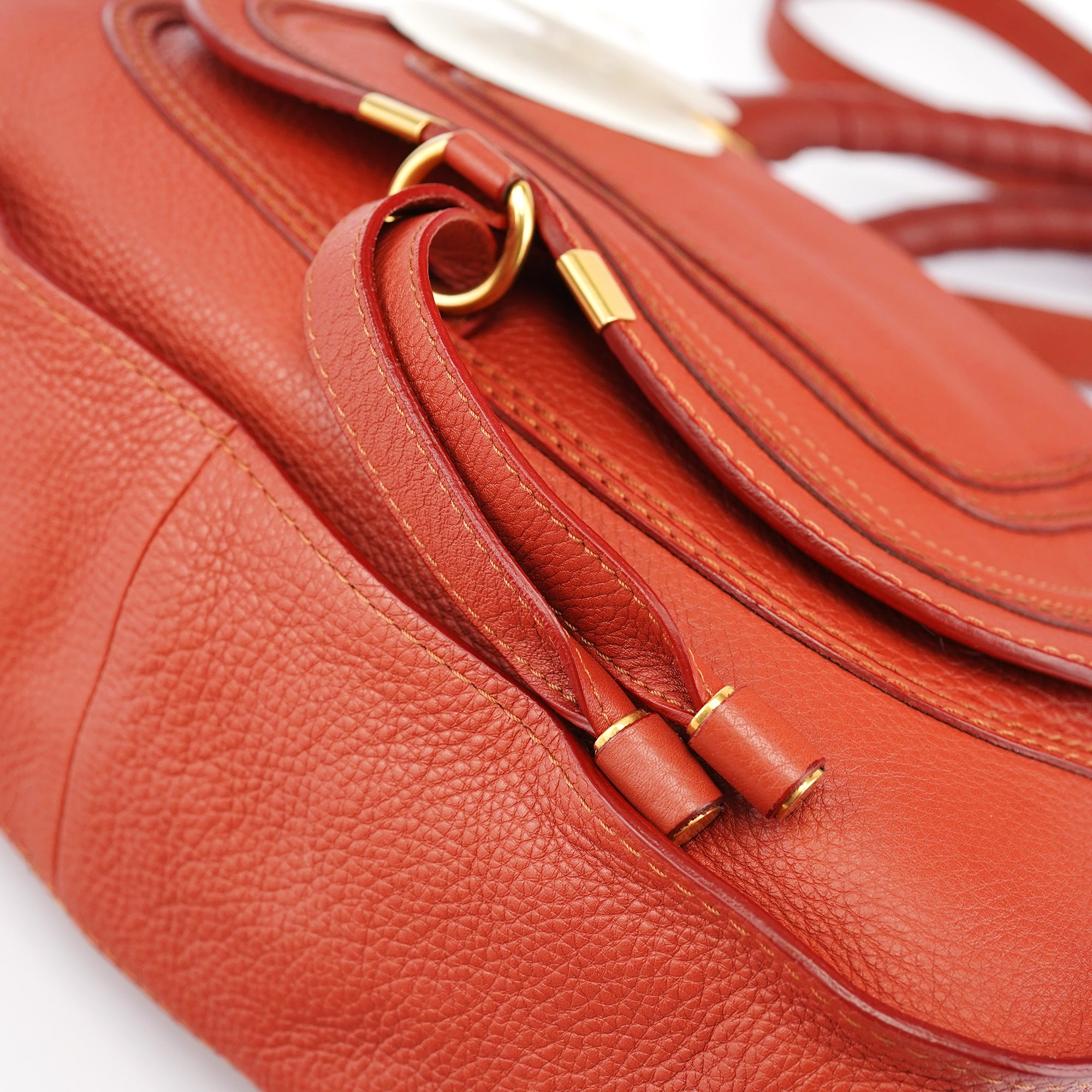 Designed in the 2010s, this Marcie 2-way bag is crafted in maple red leather with gold-tone hardware. It features the signature horseshoe-stitched front flap pocket, rolled leather top handles, and a detachable shoulder strap for versatile wear. The interior is lined in fabric with multiple compartments for daily essentials.