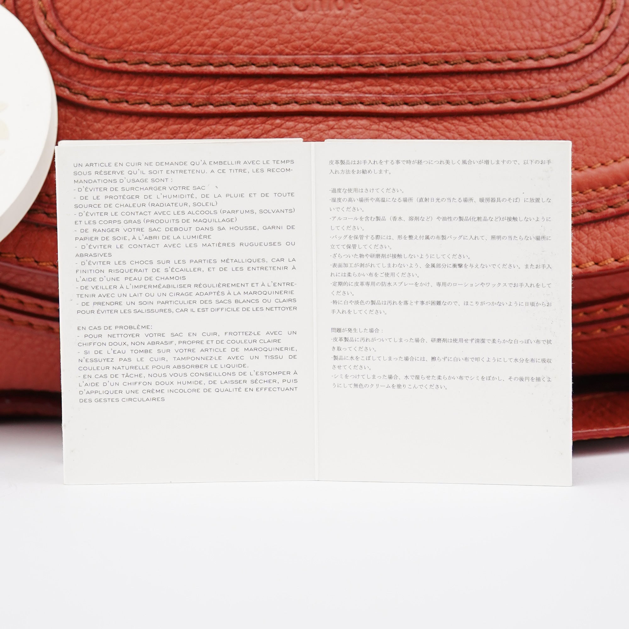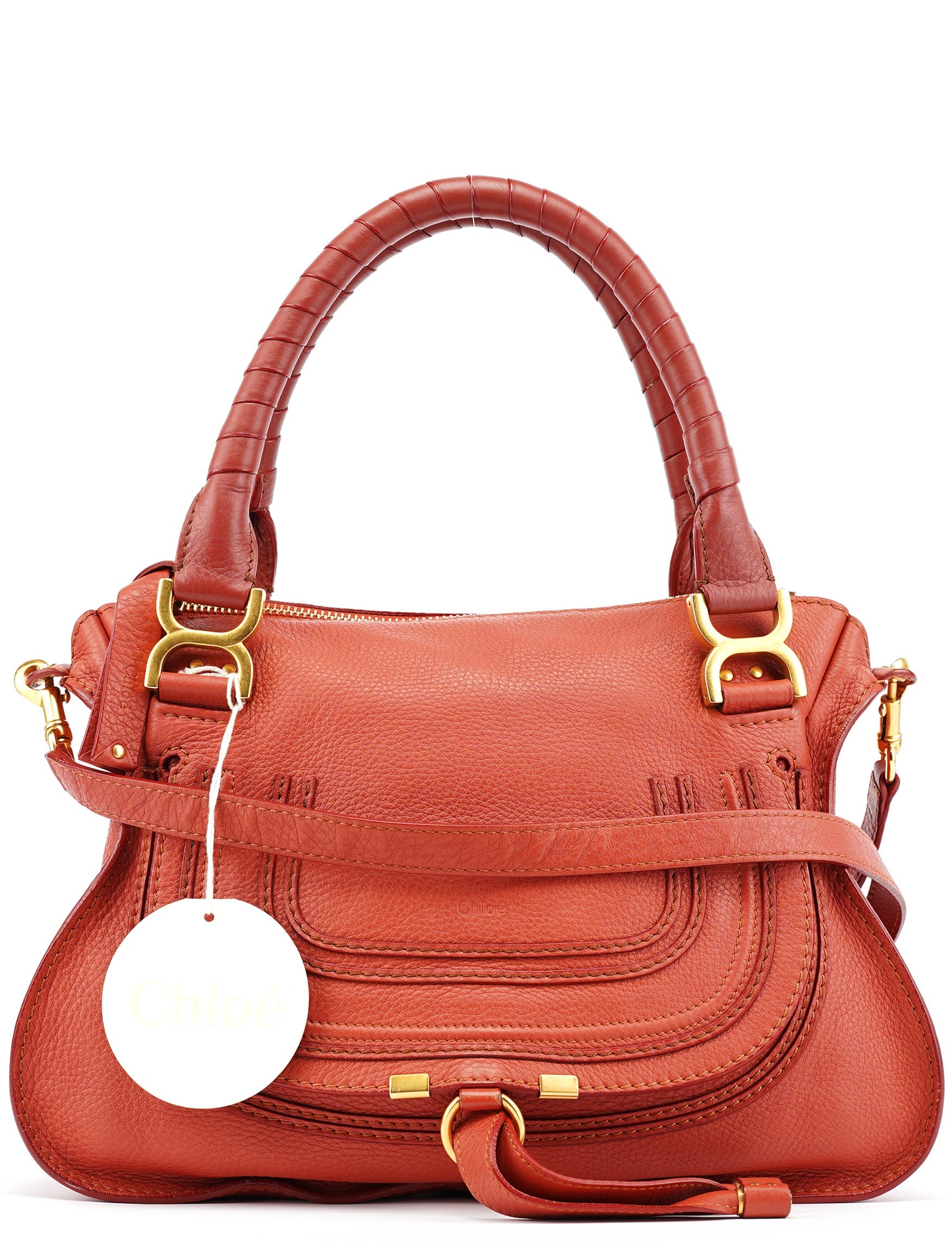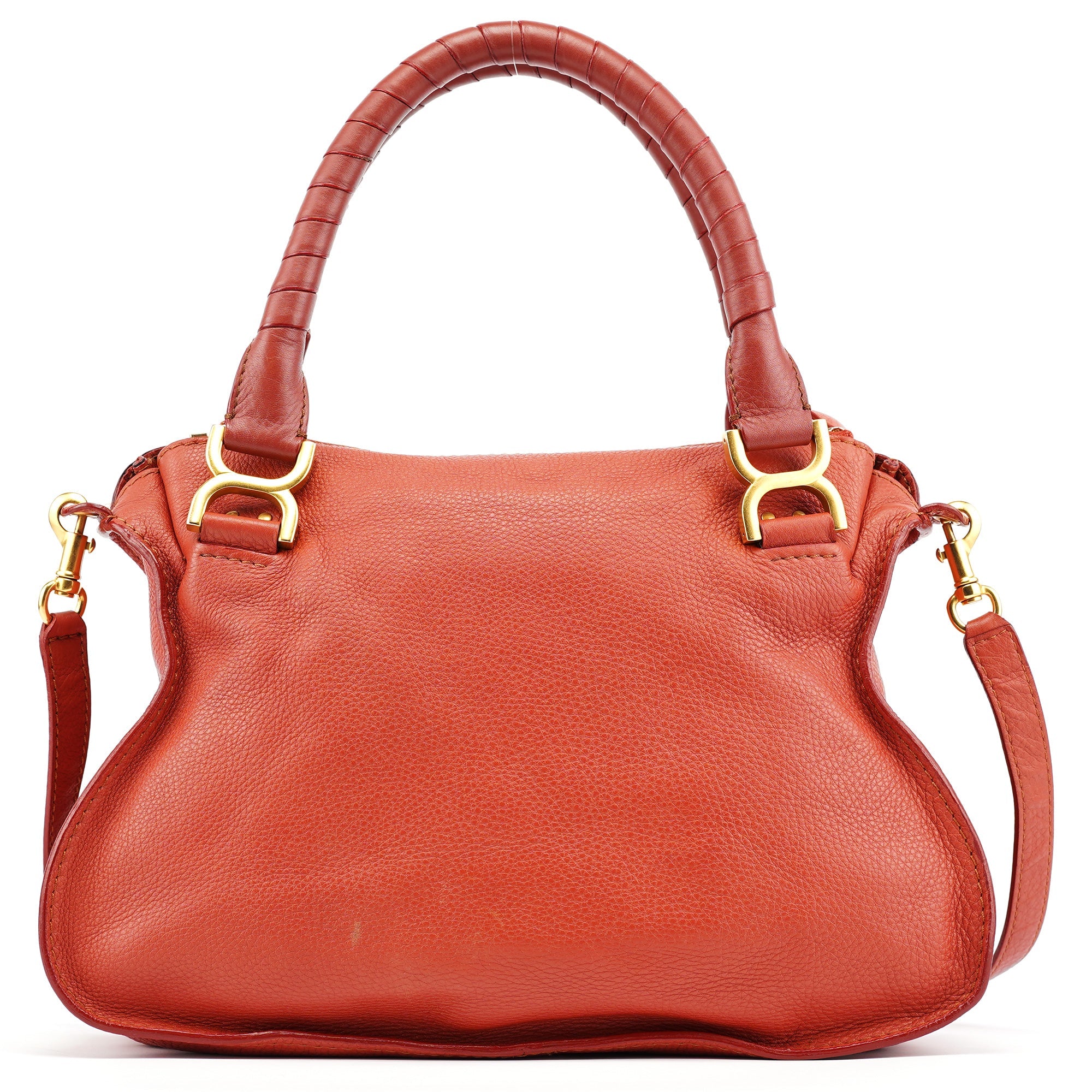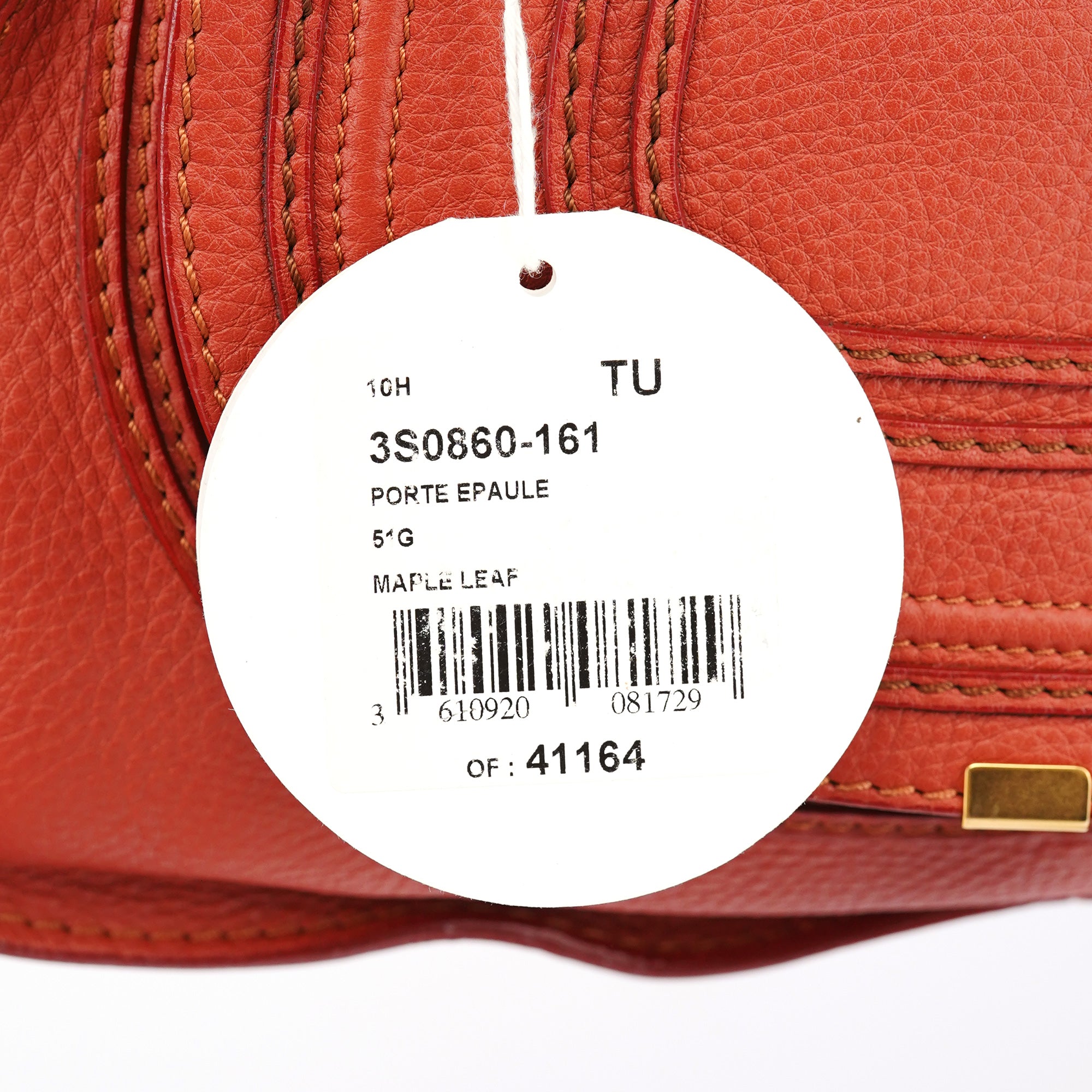 Designed in the 2010s, this Marcie 2-way bag is crafted in maple red leather with gold-tone hardware. It features the signature horseshoe-stitched front flap pocket, rolled leather top handles, and a detachable shoulder strap for versatile wear. The interior is lined in fabric with multiple compartments for daily essentials.