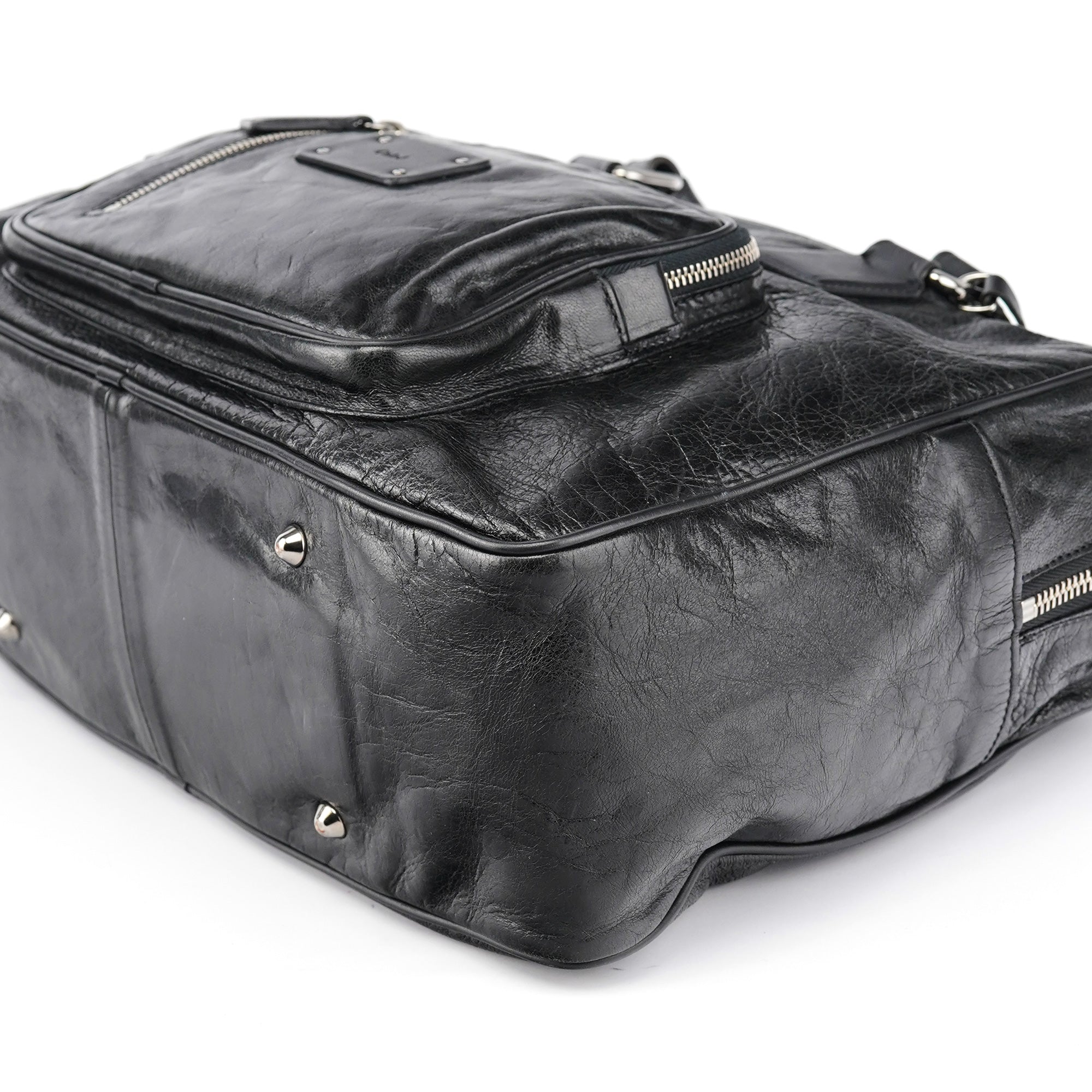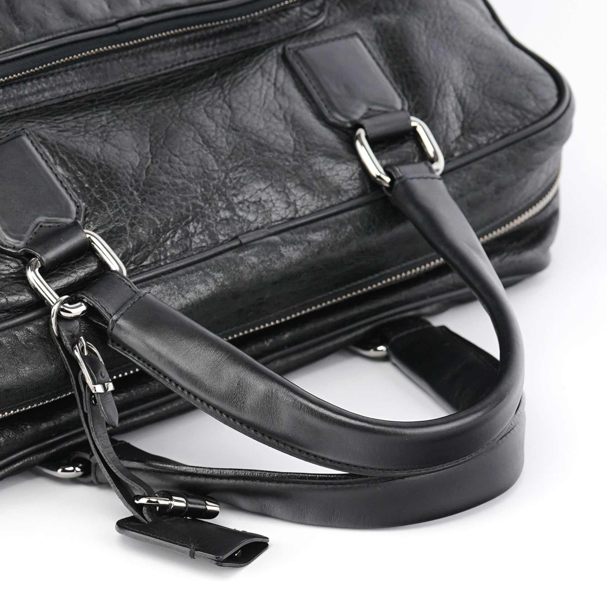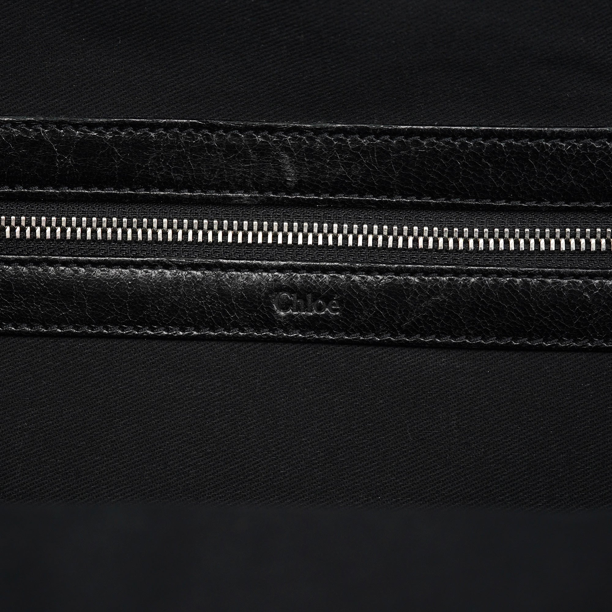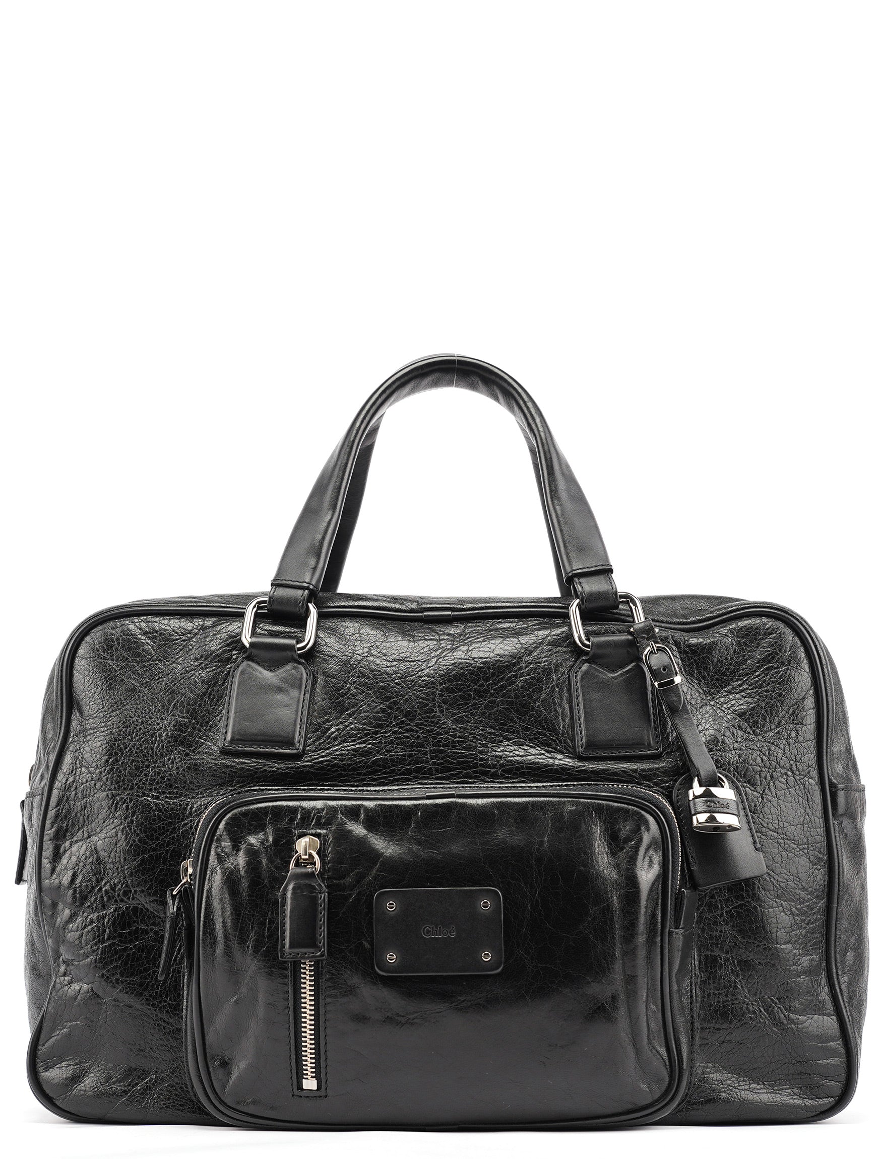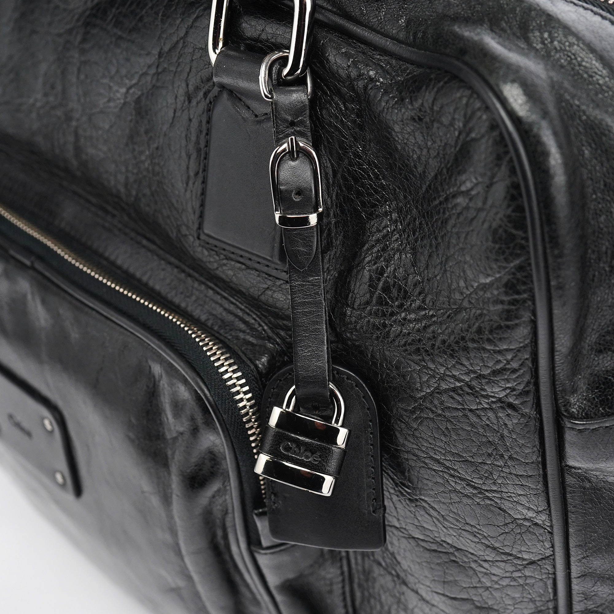 Designed in the early 2000s by Phoebe Philo, this vintage Chloé Mr. Paddington Boston bag features black glazed leather from the rare men's limited edition collection. The structured silhouette showcases silver-tone hardware including oversized zipper pull on the front pocket, dual top handles, classic Paddington hardware, and black fabric-lined interior with multiple compartments.