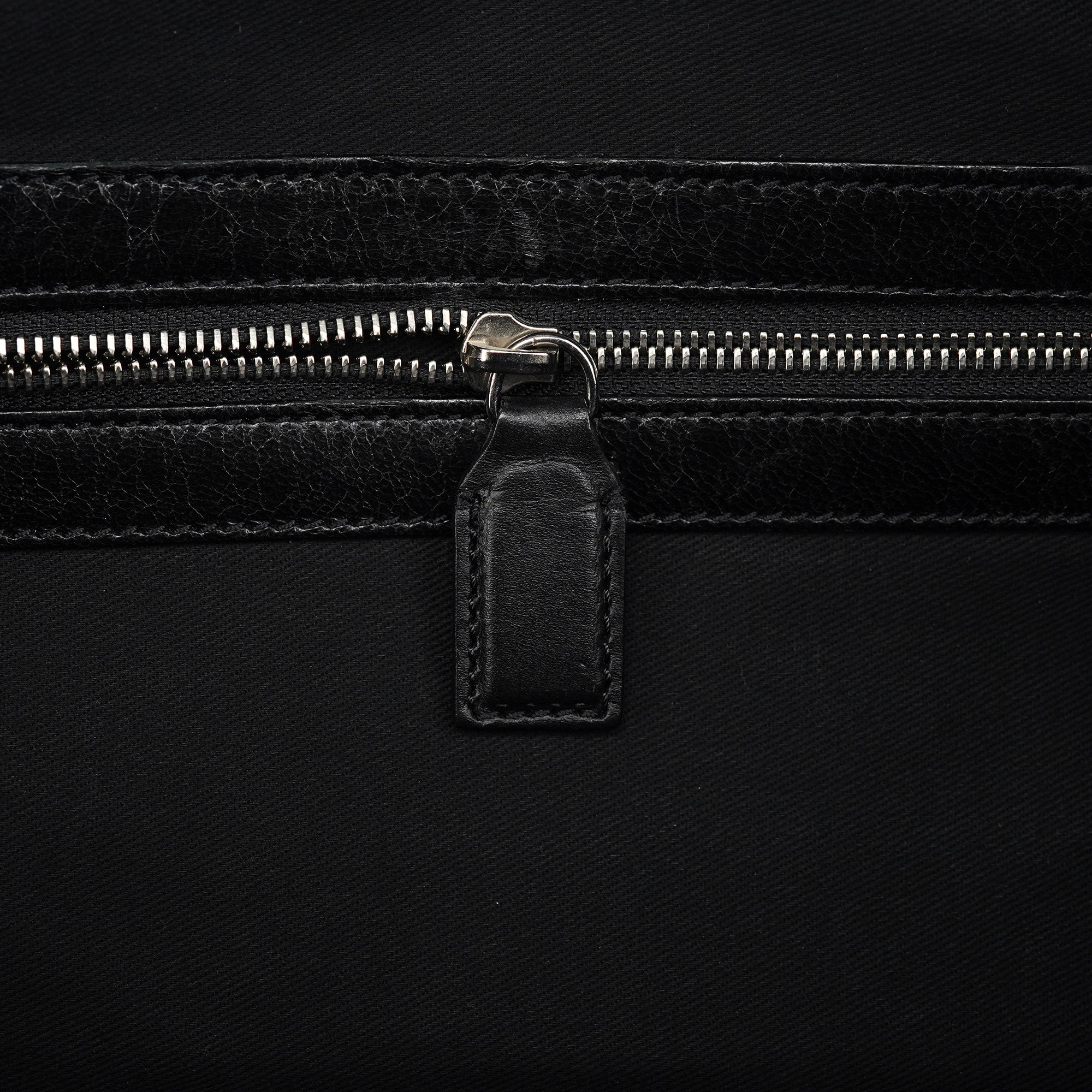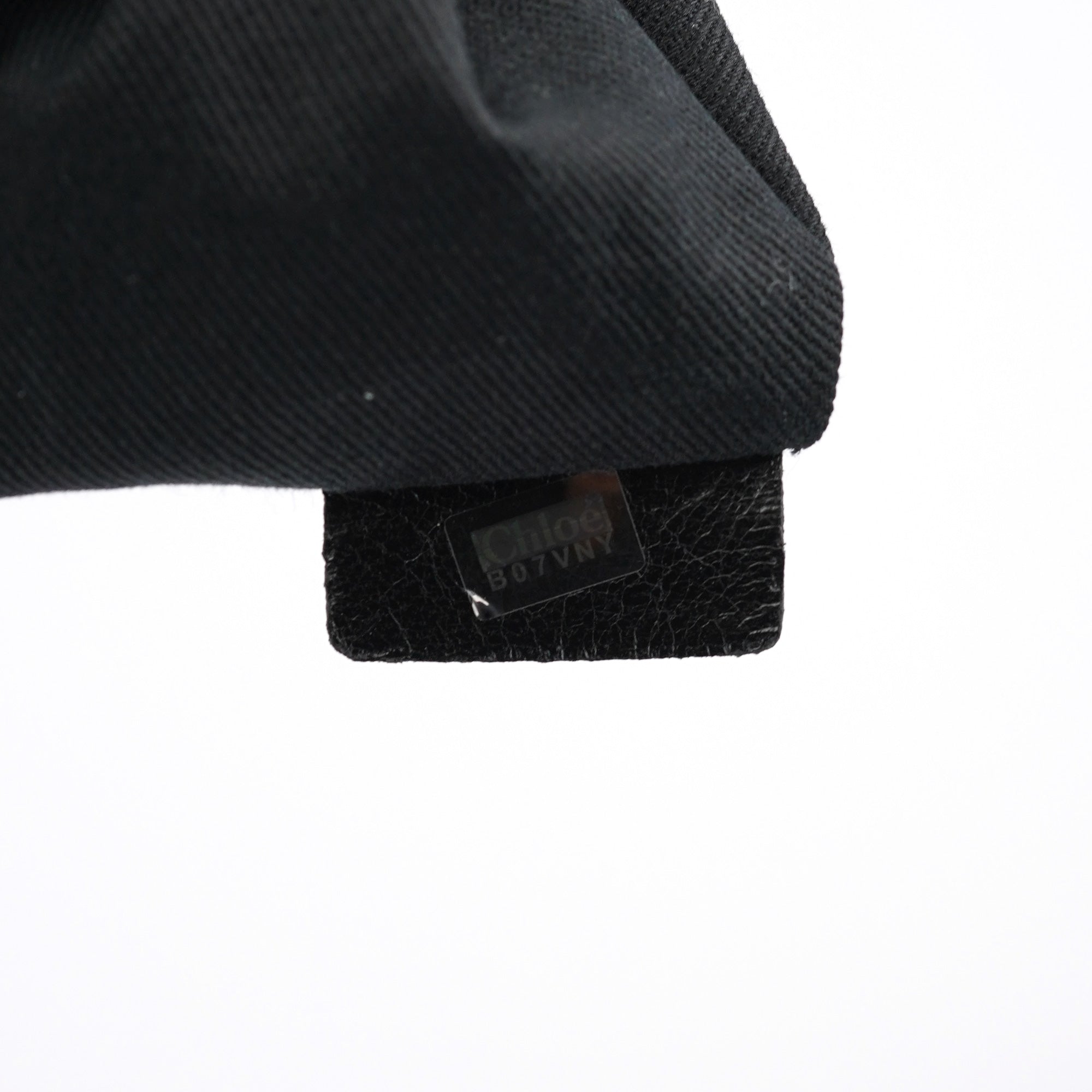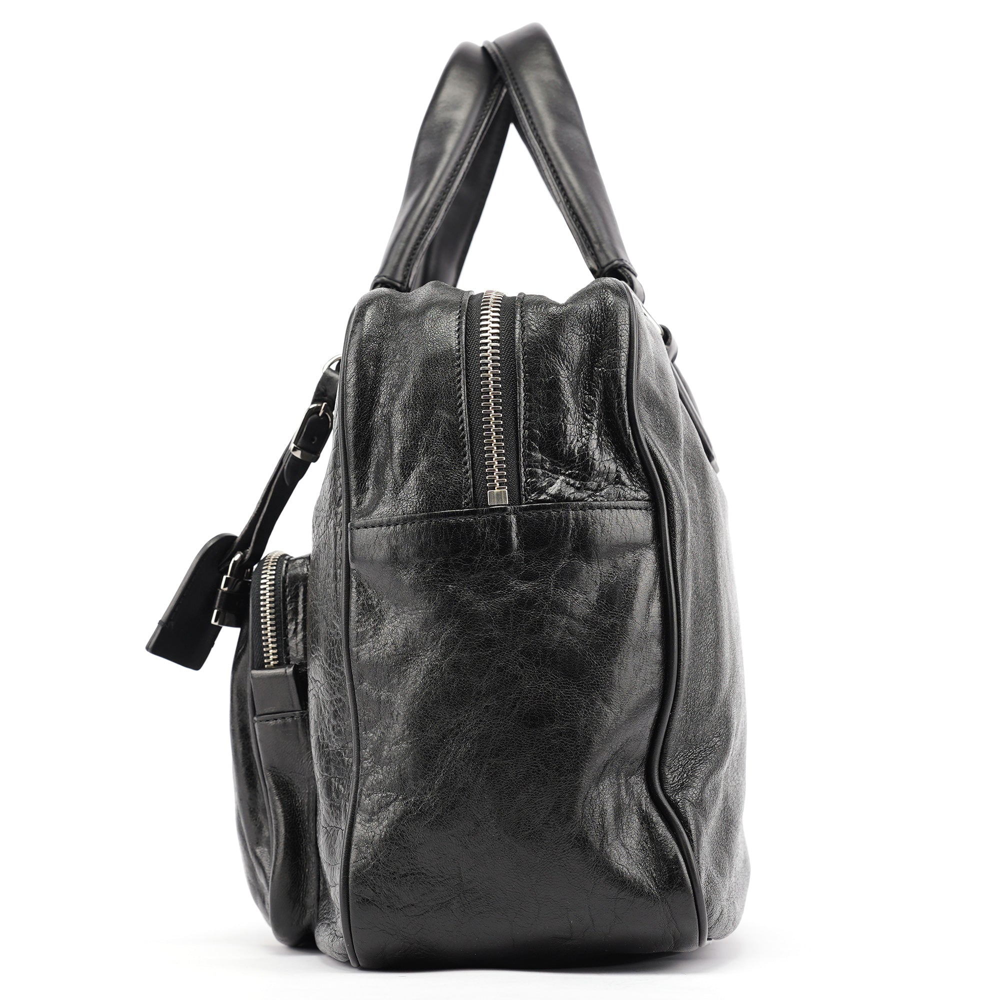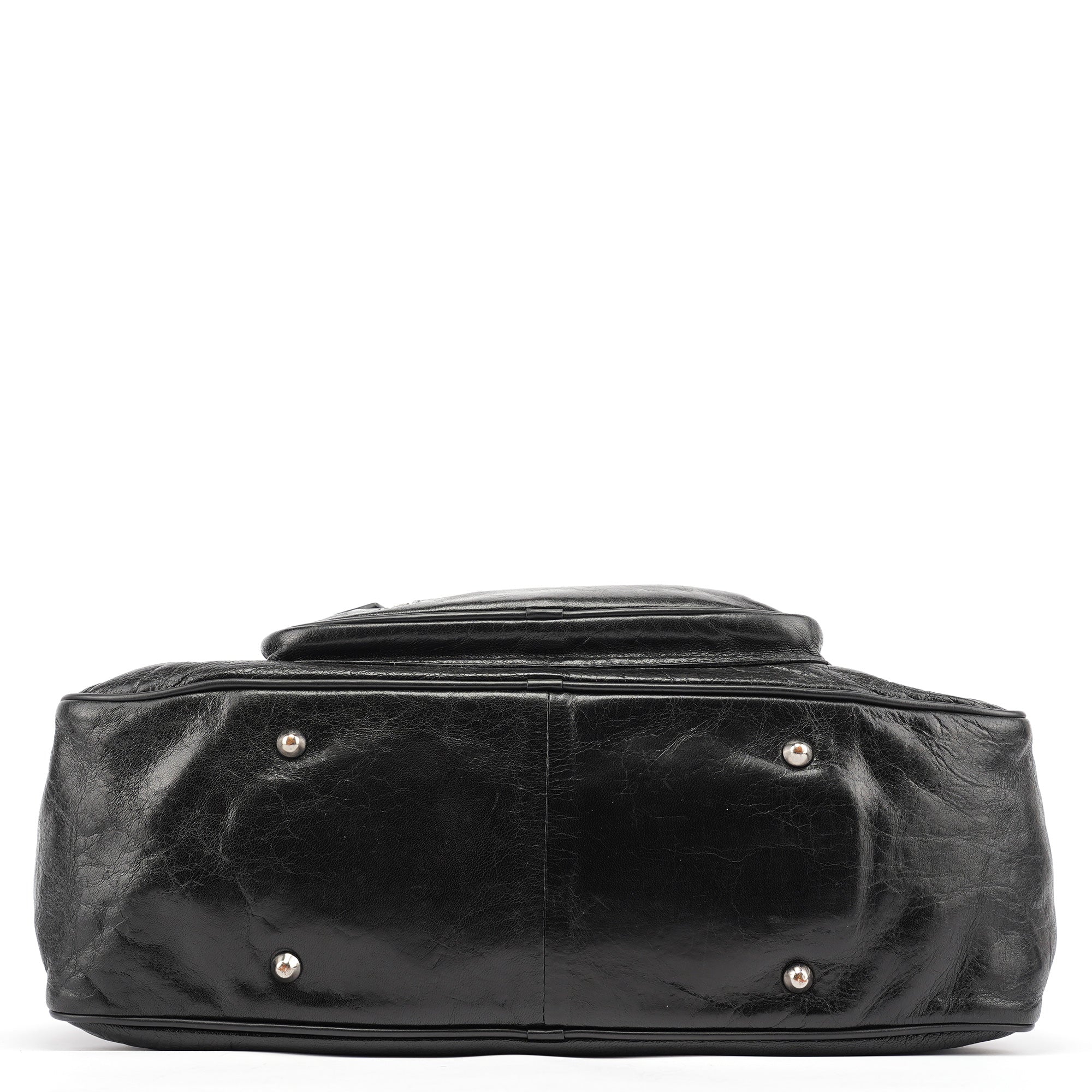 Designed in the early 2000s by Phoebe Philo, this vintage Chloé Mr. Paddington Boston bag features black glazed leather from the rare men's limited edition collection. The structured silhouette showcases silver-tone hardware including oversized zipper pull on the front pocket, dual top handles, classic Paddington hardware, and black fabric-lined interior with multiple compartments.
