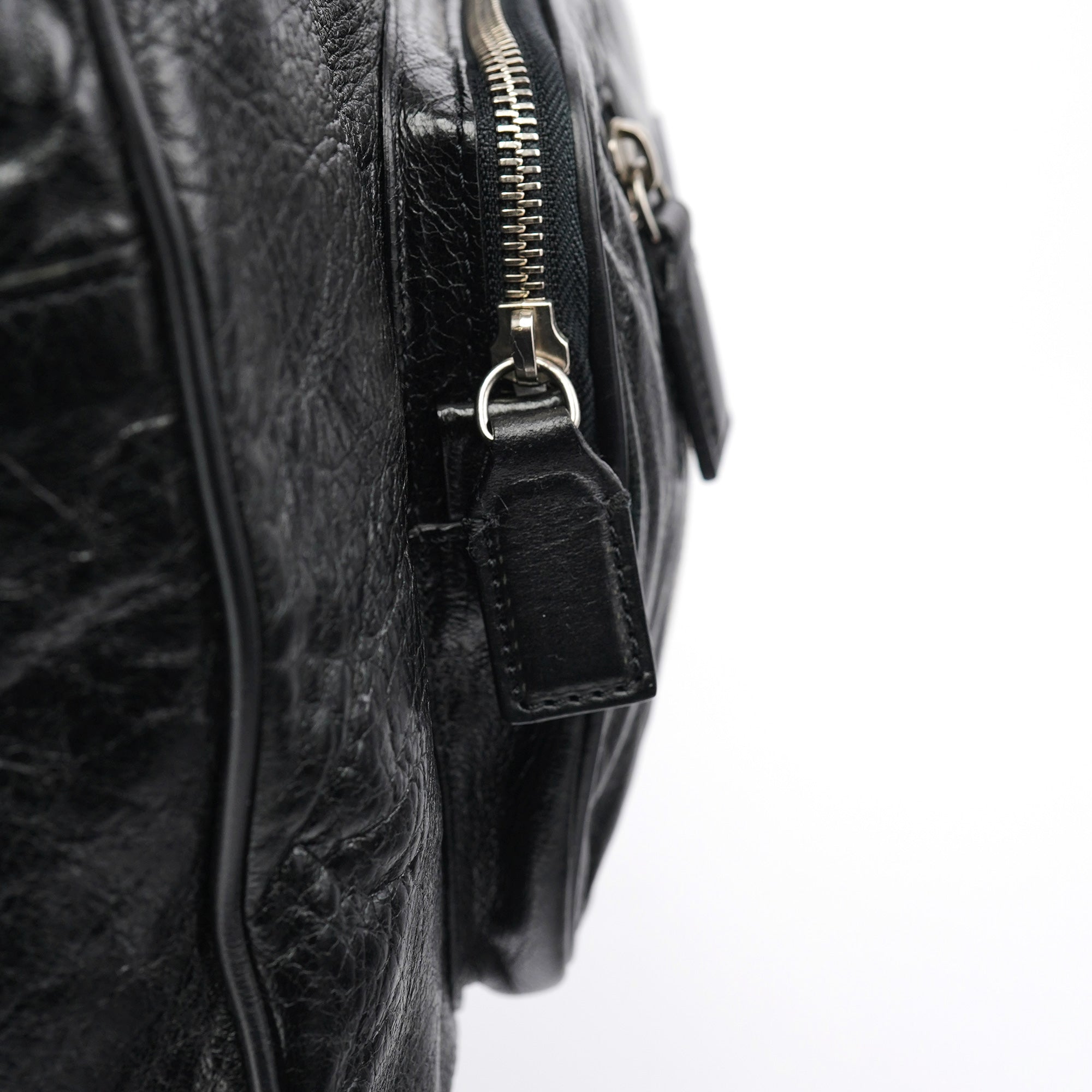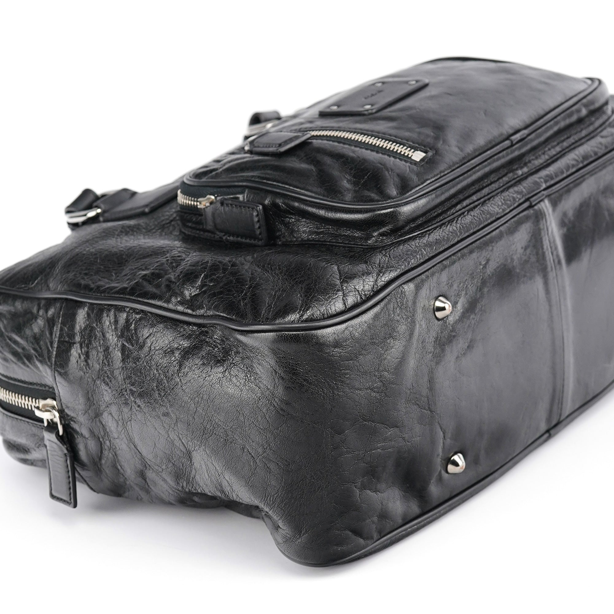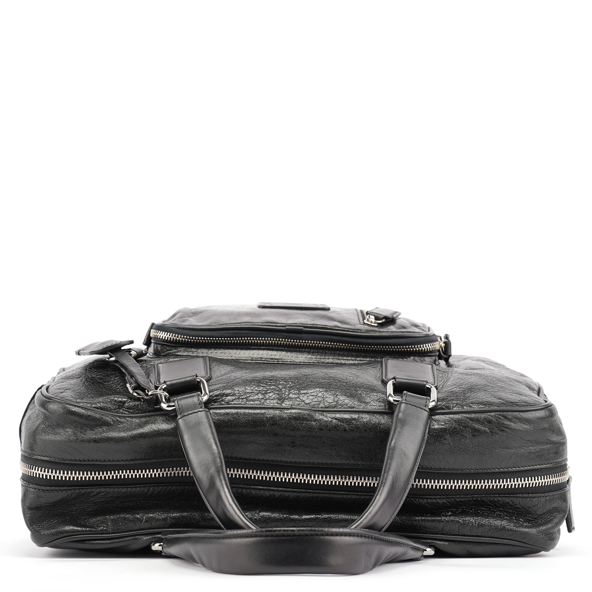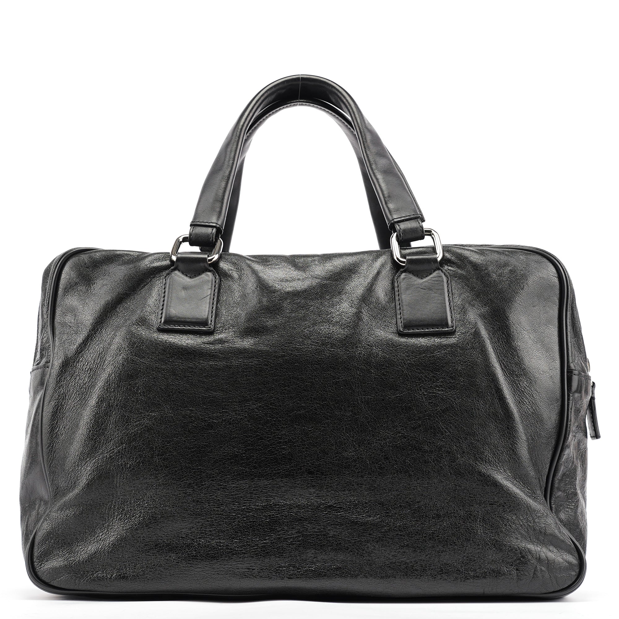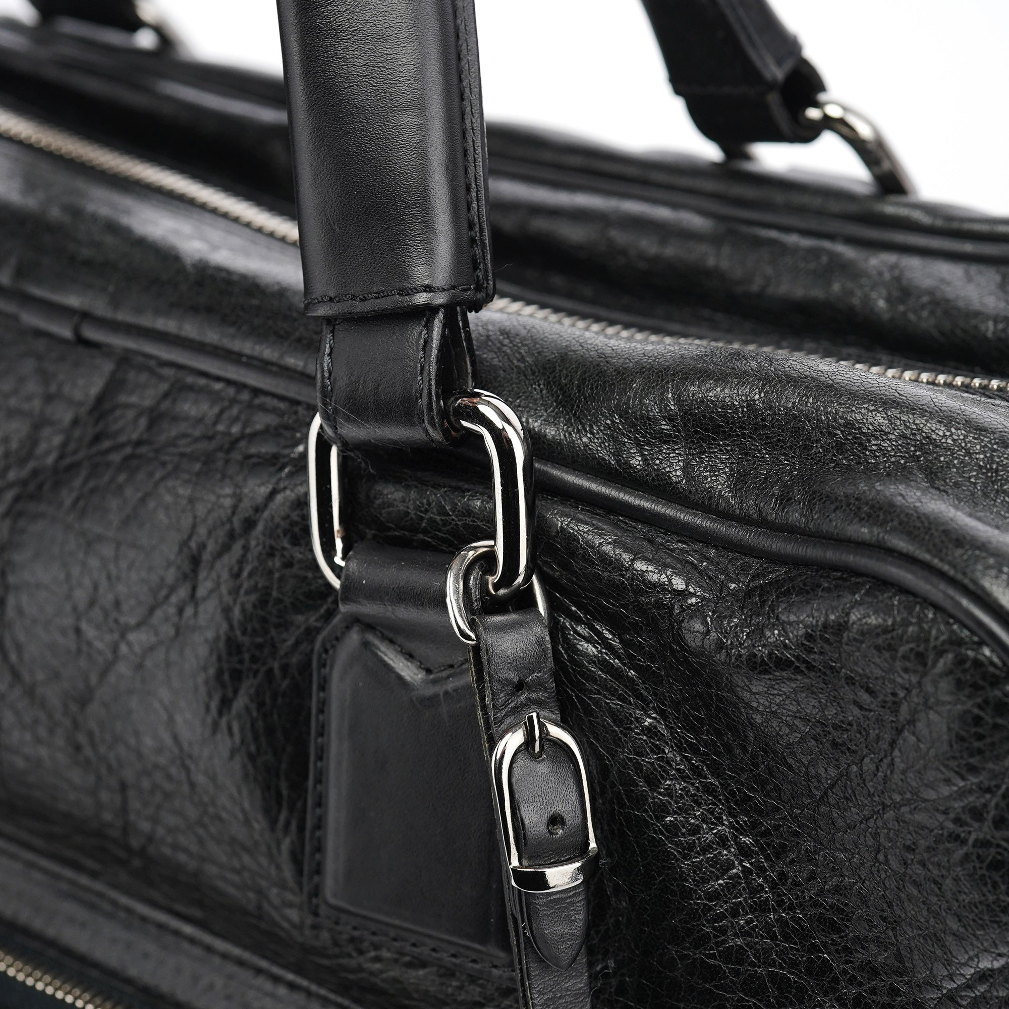 Designed in the early 2000s by Phoebe Philo, this vintage Chloé Mr. Paddington Boston bag features black glazed leather from the rare men's limited edition collection. The structured silhouette showcases silver-tone hardware including oversized zipper pull on the front pocket, dual top handles, classic Paddington hardware, and black fabric-lined interior with multiple compartments.