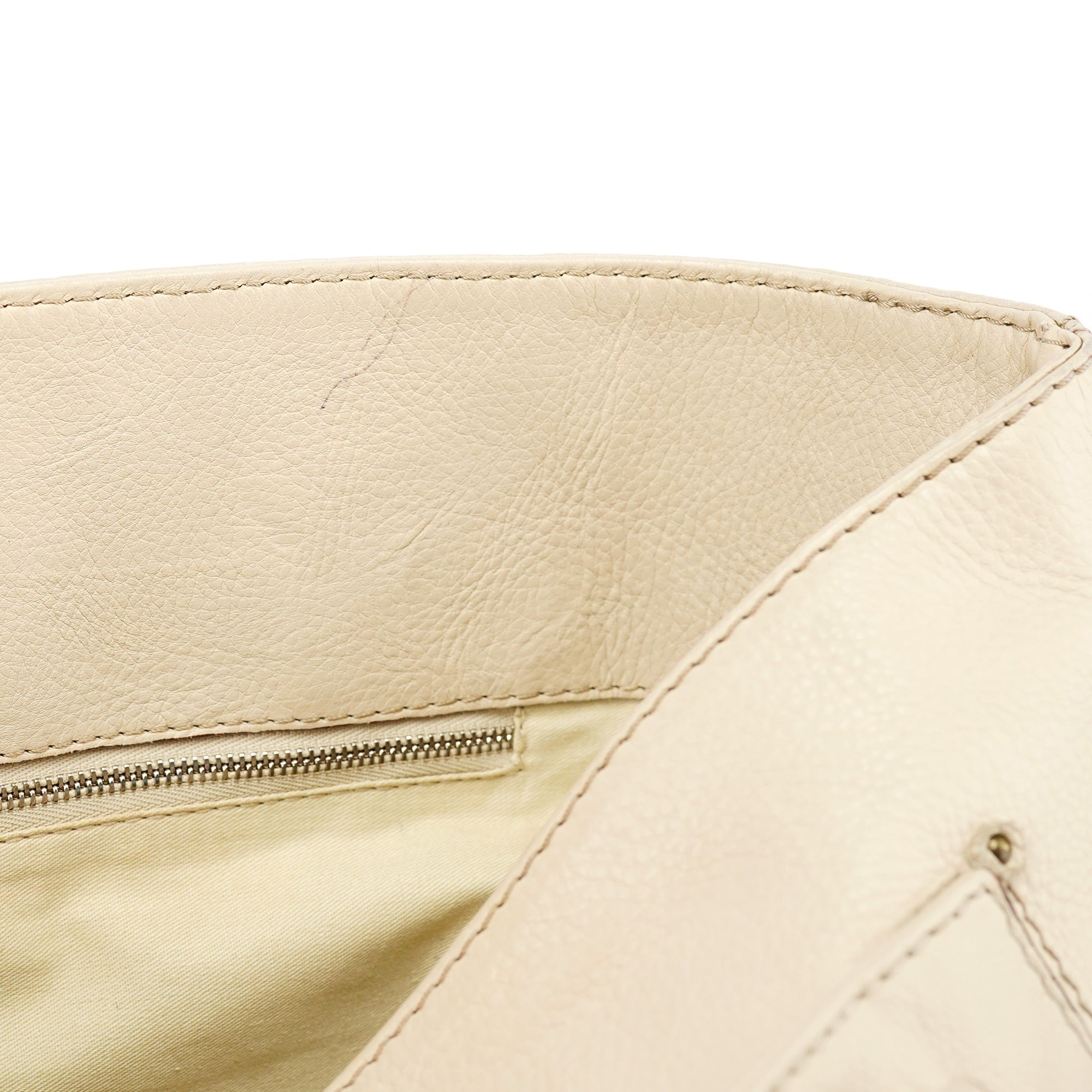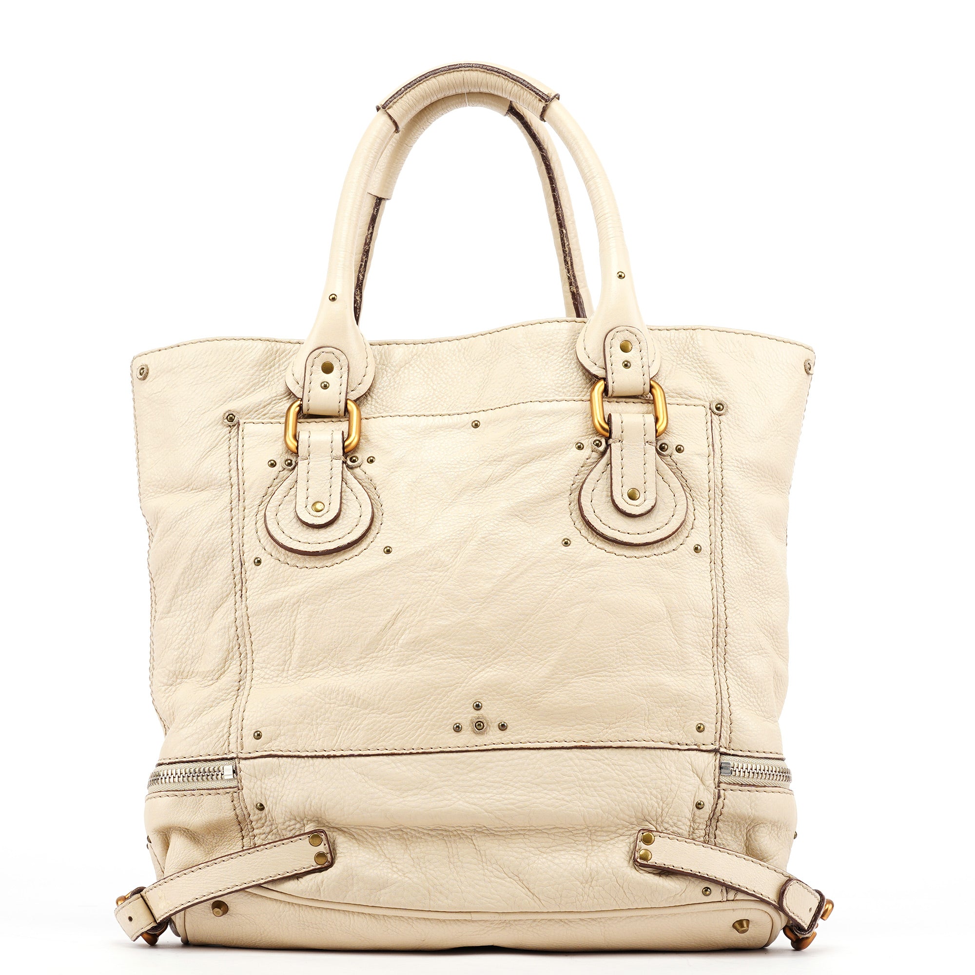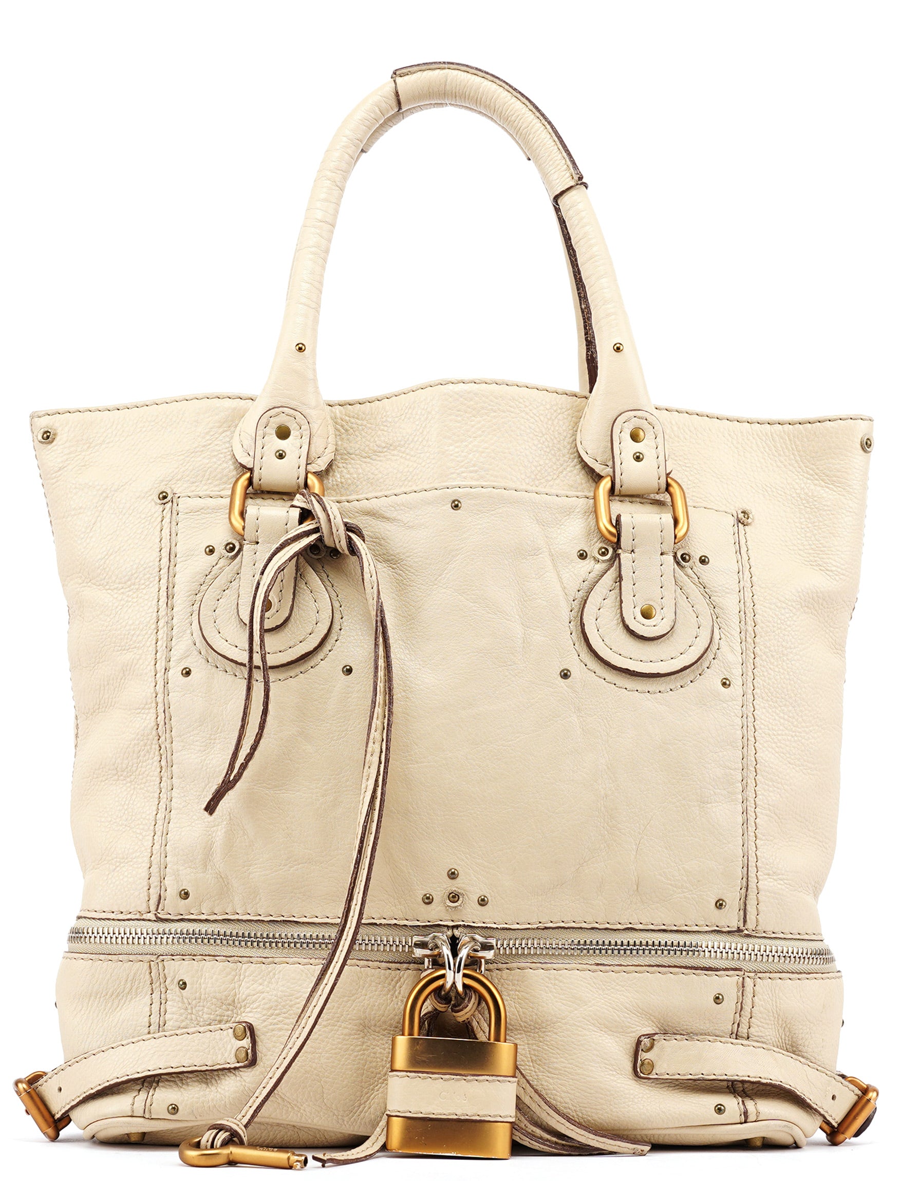Designed in the early 2000s by Phoebe Philo, this Chloé Paddington tote is crafted from white grained leather and finished with polished brass hardware, including the signature oversized padlock and leather-wrapped key. Its softly structured silhouette is detailed with stitched paneling, belted sides, and a full top zip. The spacious interior is lined in canvas and includes a zip pocket for essentials.