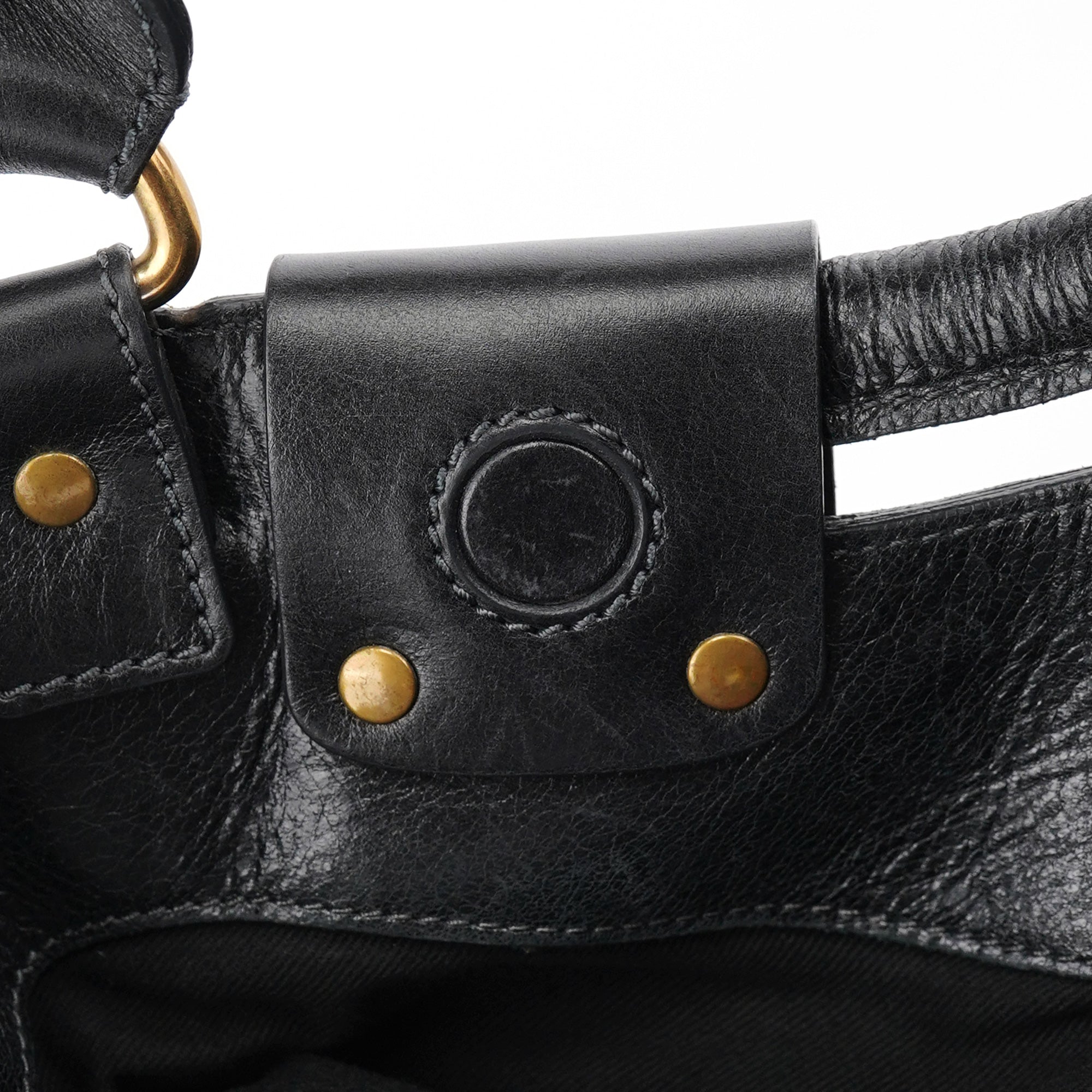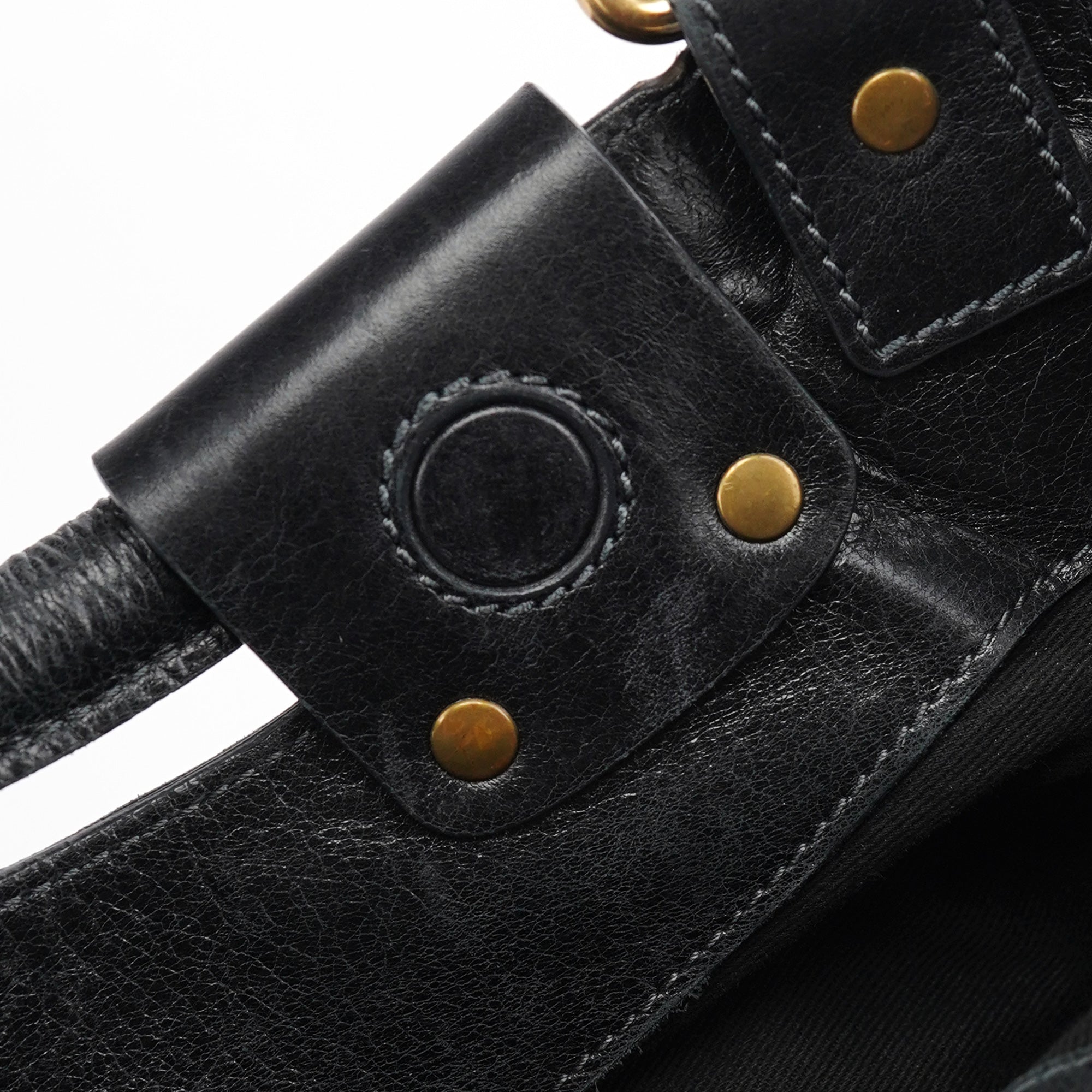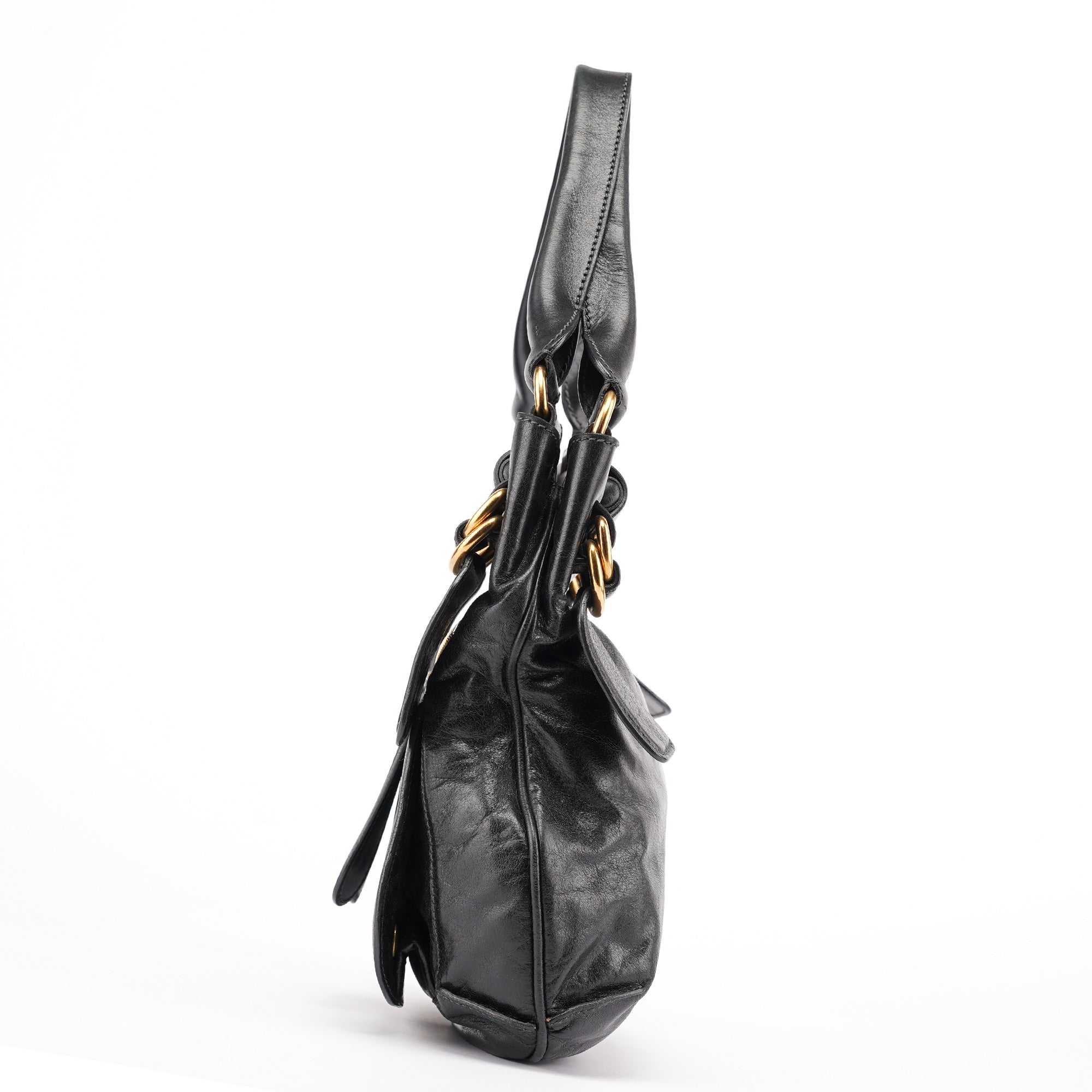Designed in the early 2000s, the Chloé Bay shoulder bag is crafted from supple black lambskin with contrast gold-tone hardware and a curved top silhouette. The front zip pocket, decorative straps, and dual rolled handles underscore its bohemian-meets-utility design. The spacious interior is lined in canvas and features a zip pocket for essentials.