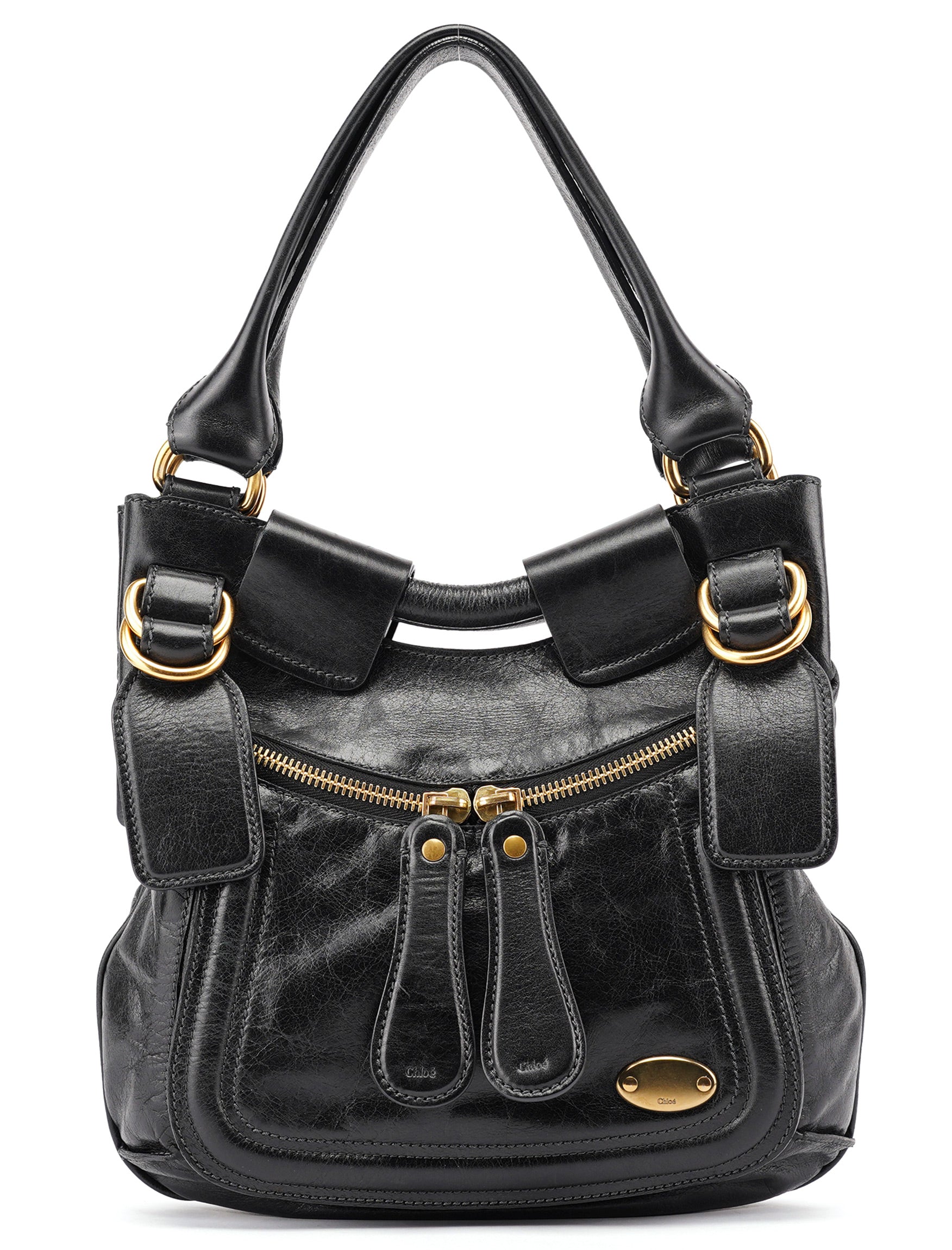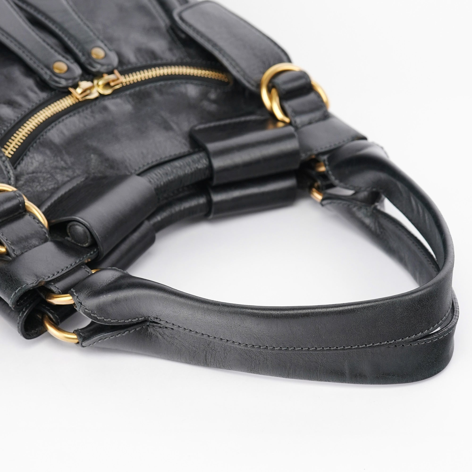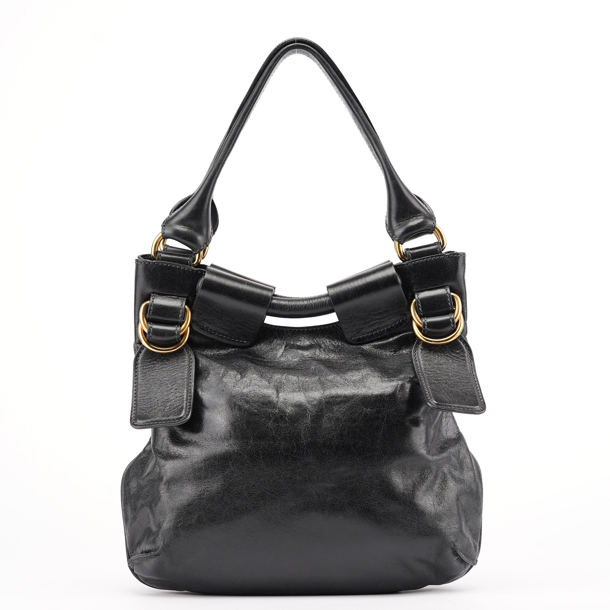 Designed in the early 2000s, the Chloé Bay shoulder bag is crafted from supple black lambskin with contrast gold-tone hardware and a curved top silhouette. The front zip pocket, decorative straps, and dual rolled handles underscore its bohemian-meets-utility design. The spacious interior is lined in canvas and features a zip pocket for essentials.