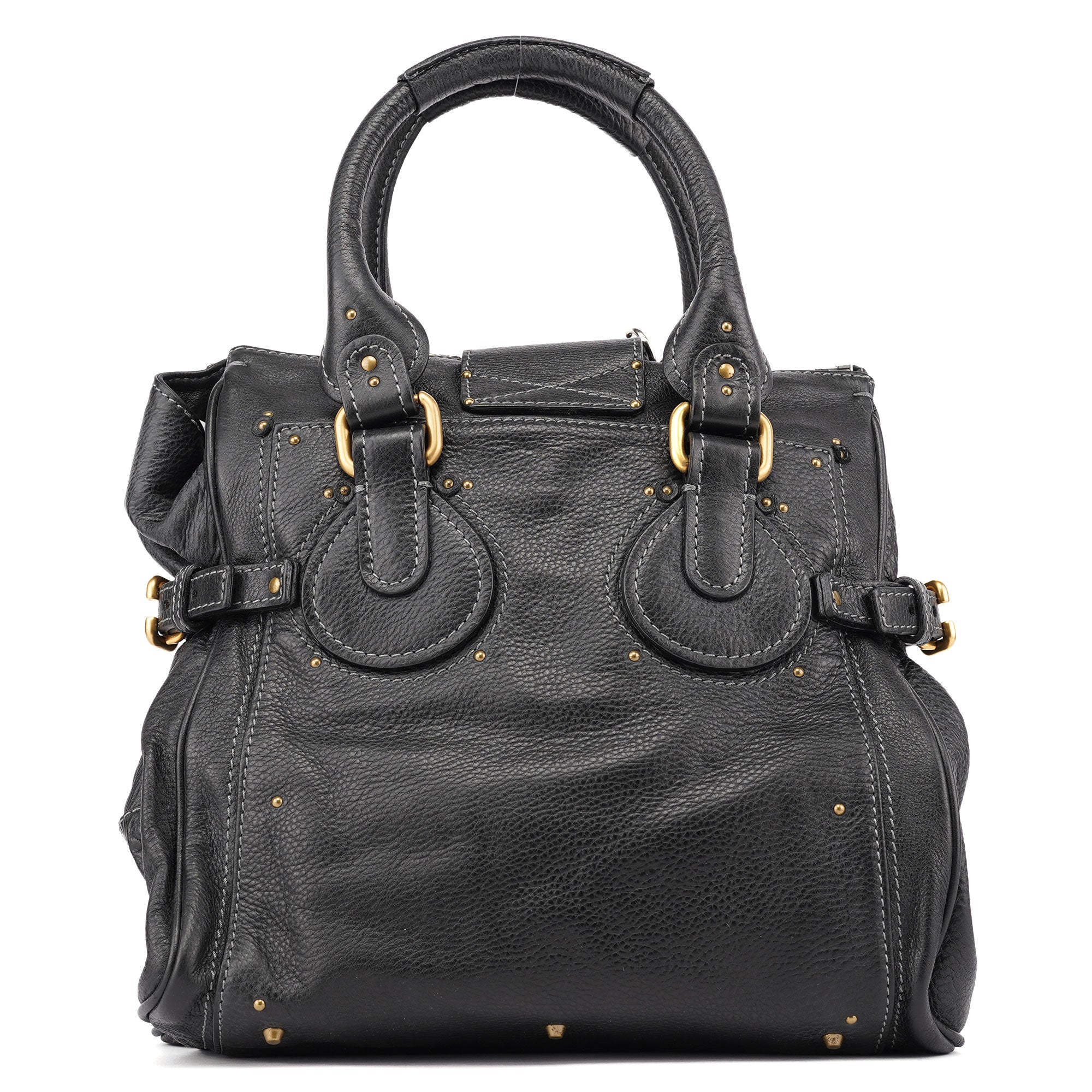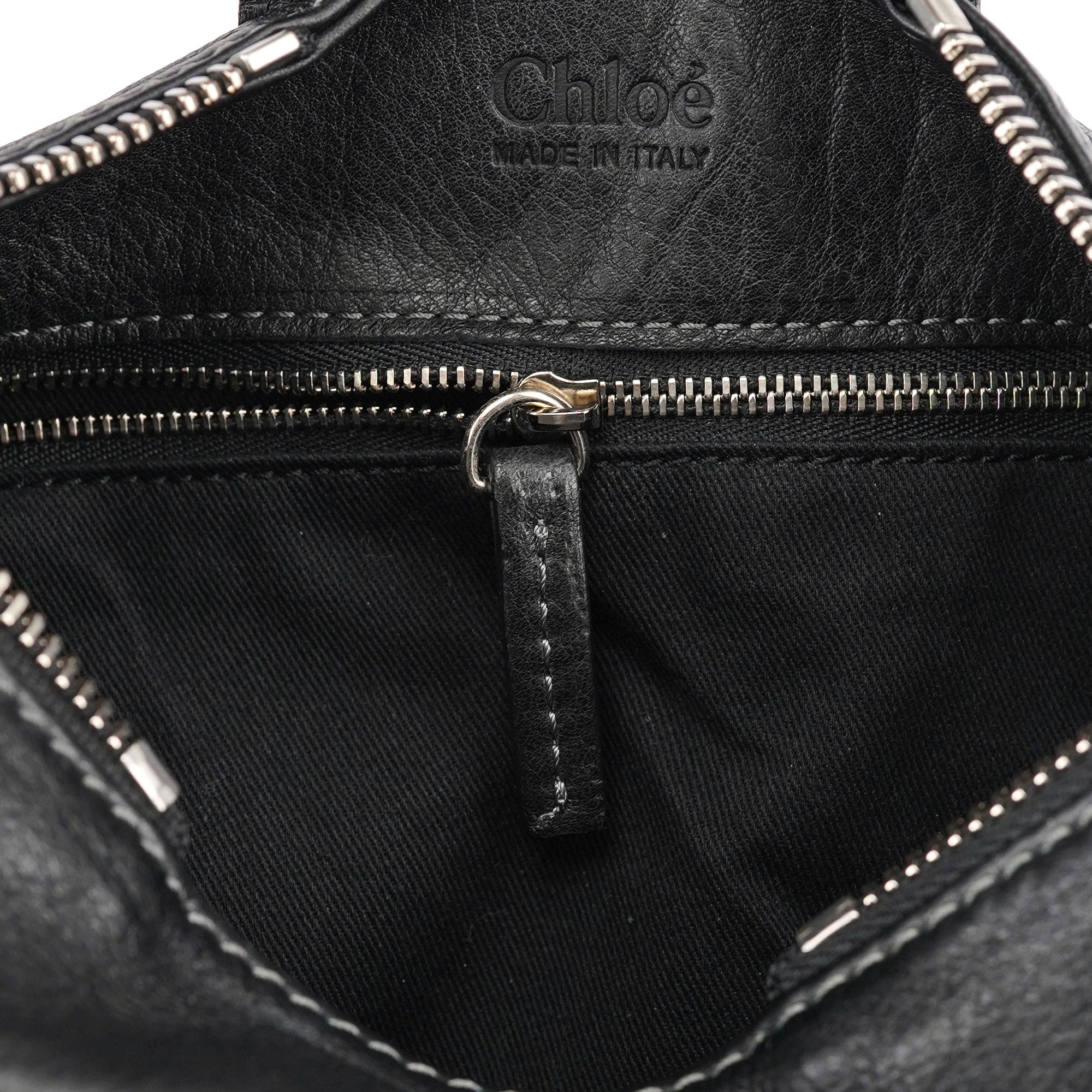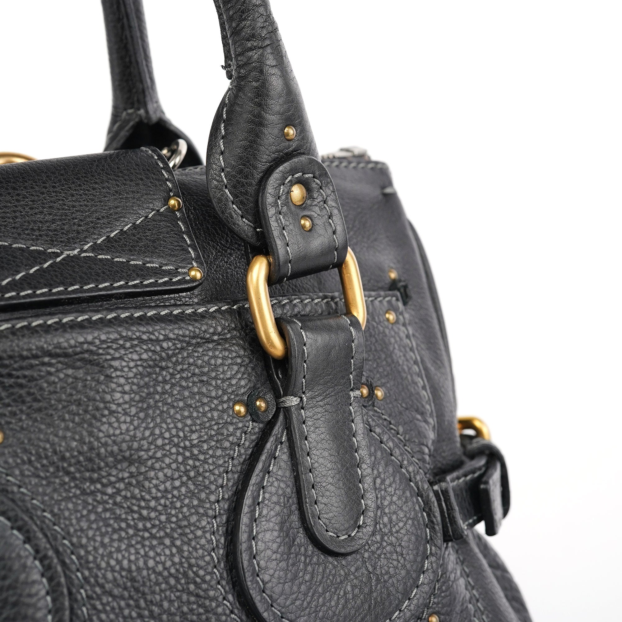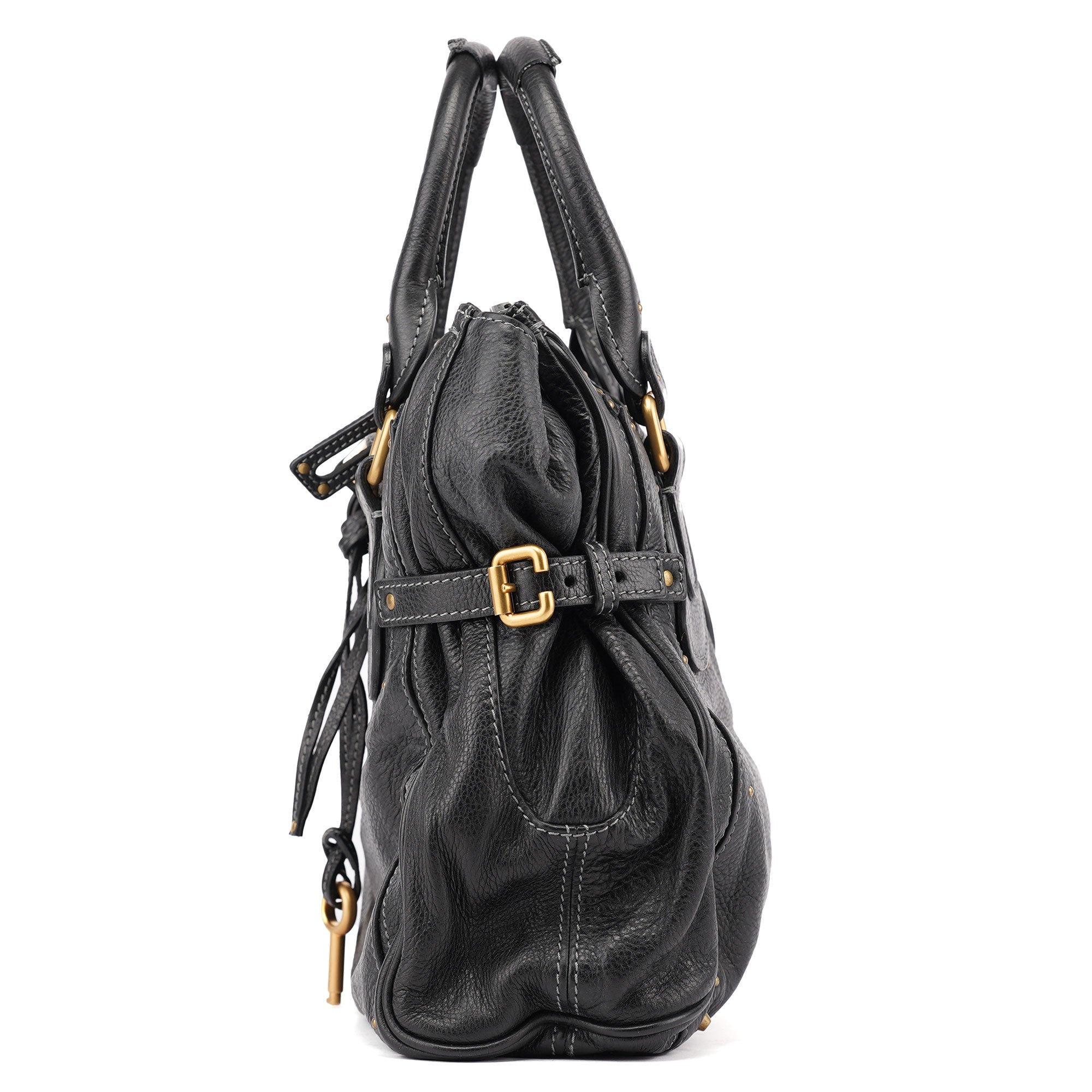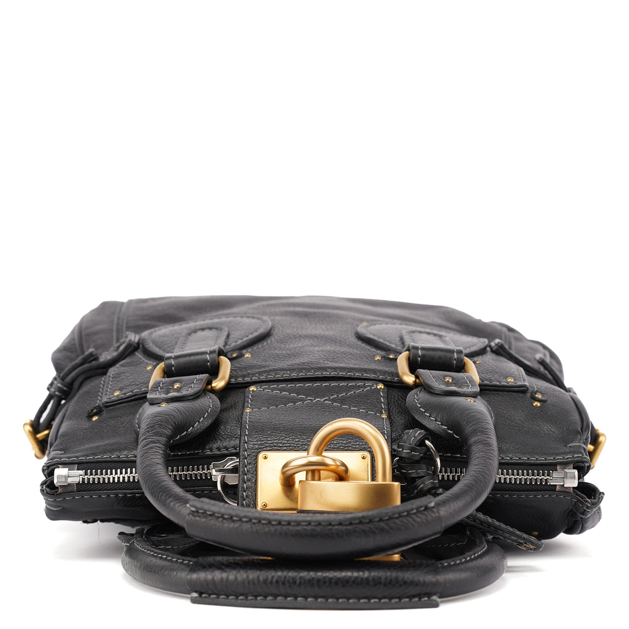 Designed by Phoebe Philo in the mid-2000s, this Chloé Paddington satchel is crafted from grained black leather with antique gold-tone hardware. The structured silhouette is accented with signature topstitching, rounded double handles, and a leather-wrapped padlock and key detail. A secure top zipper opens to a canvas-lined interior with a slip pocket for easy organization.