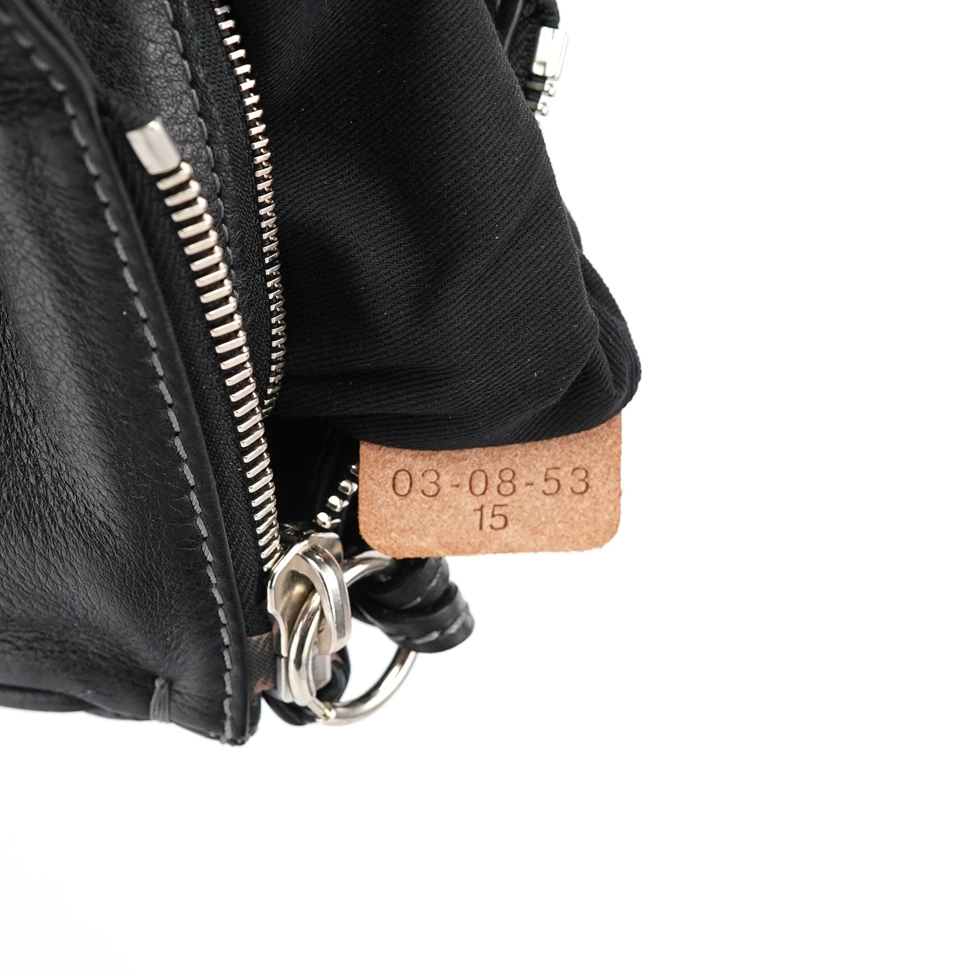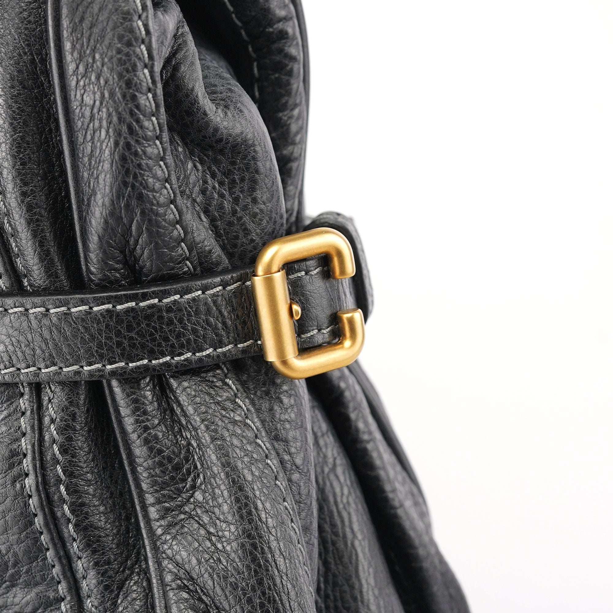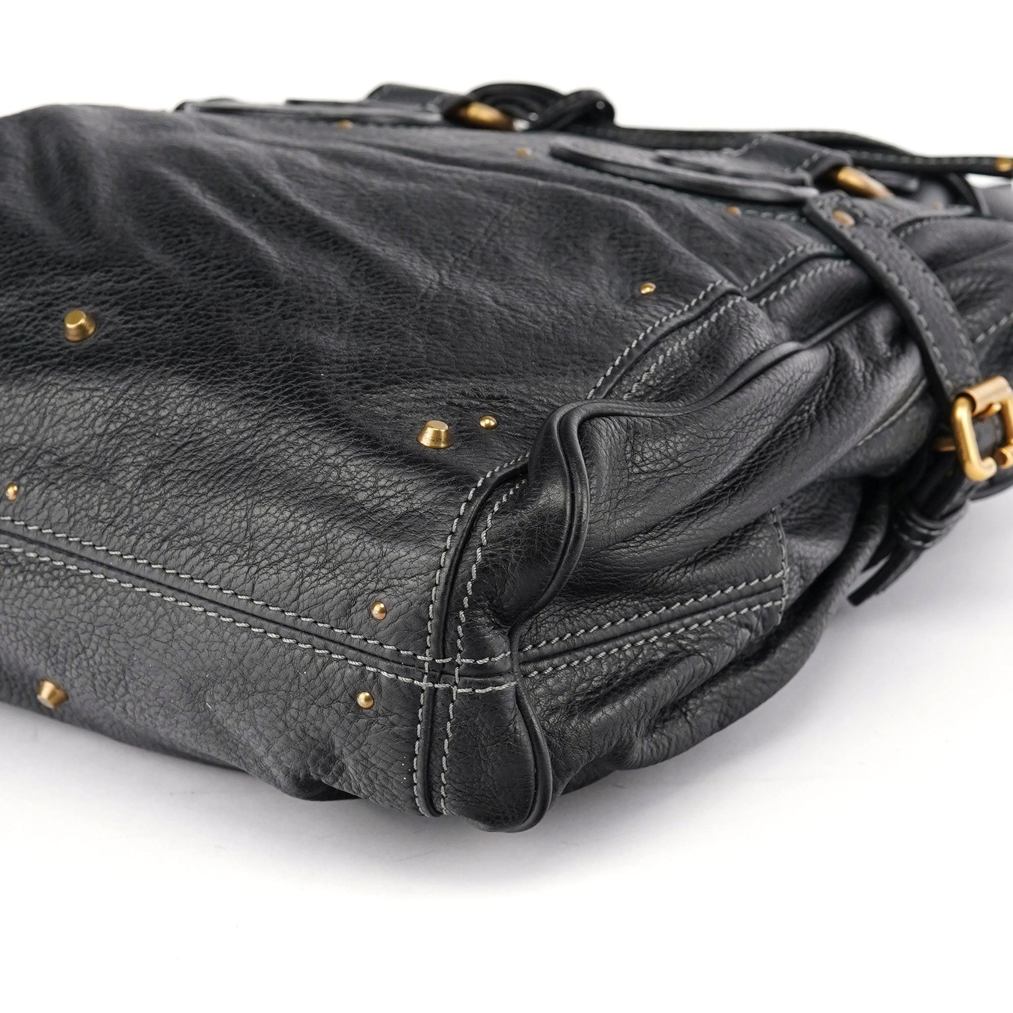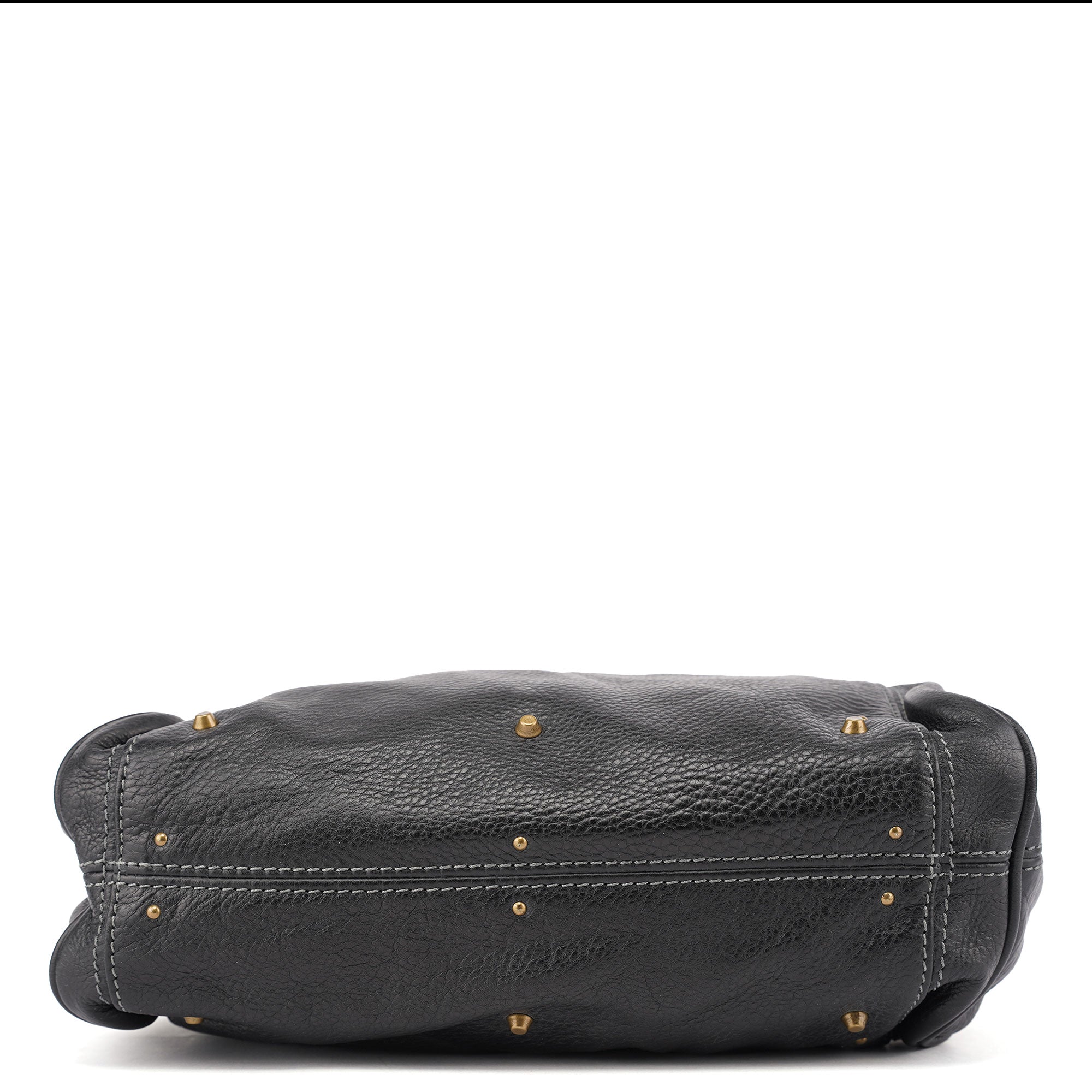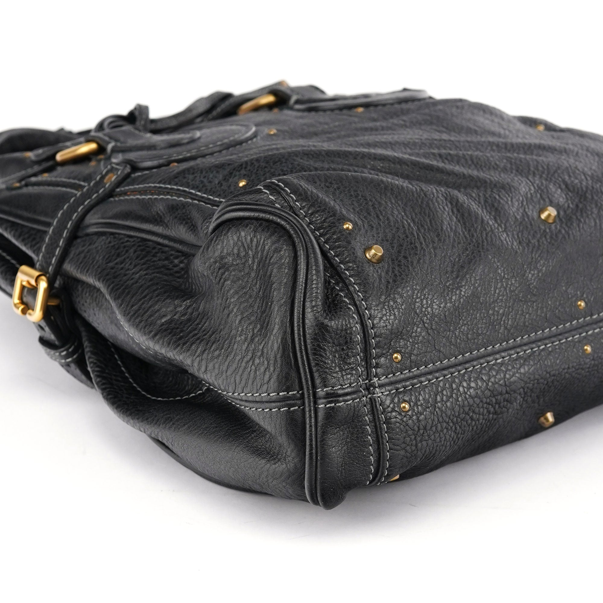 Designed by Phoebe Philo in the mid-2000s, this Chloé Paddington satchel is crafted from grained black leather with antique gold-tone hardware. The structured silhouette is accented with signature topstitching, rounded double handles, and a leather-wrapped padlock and key detail. A secure top zipper opens to a canvas-lined interior with a slip pocket for easy organization.