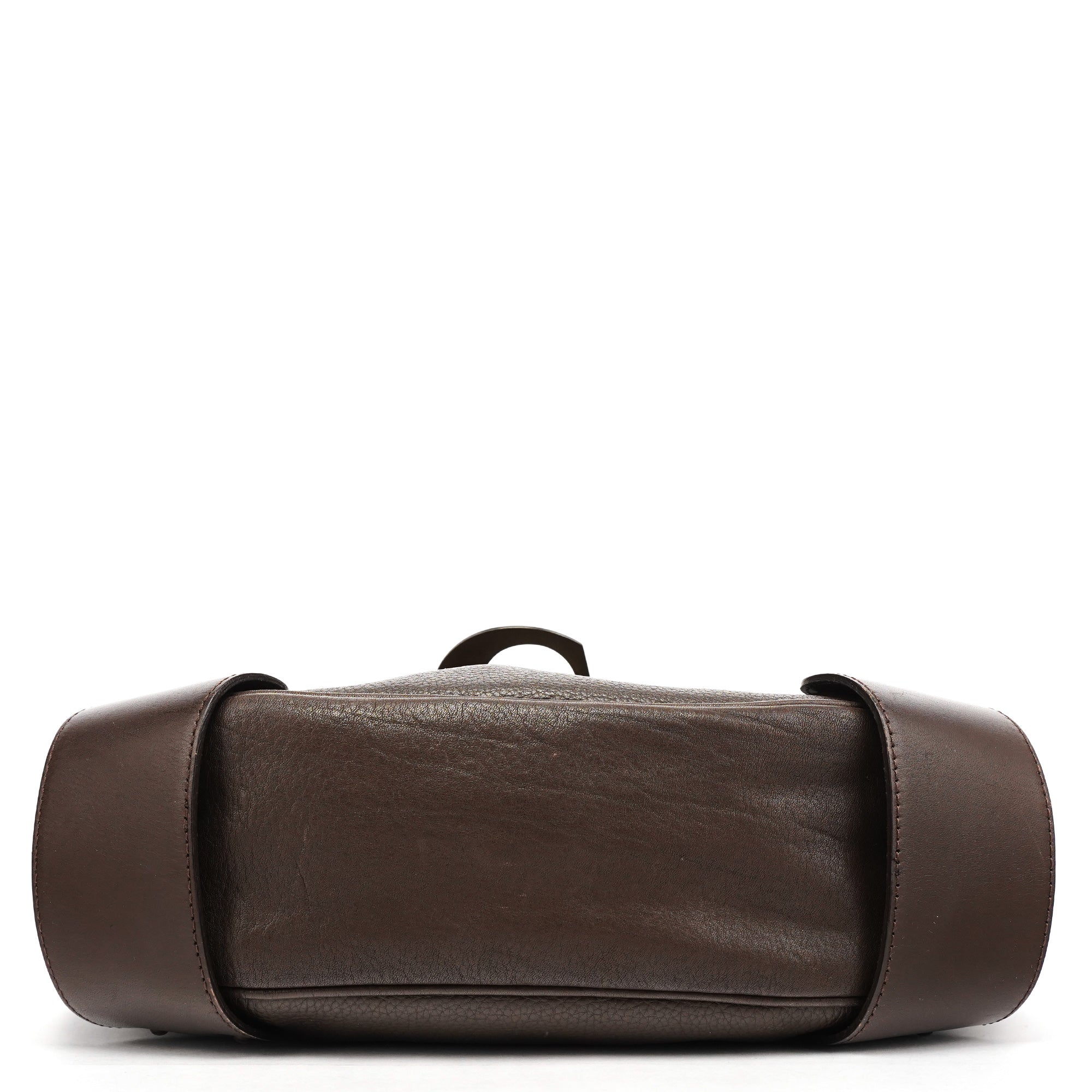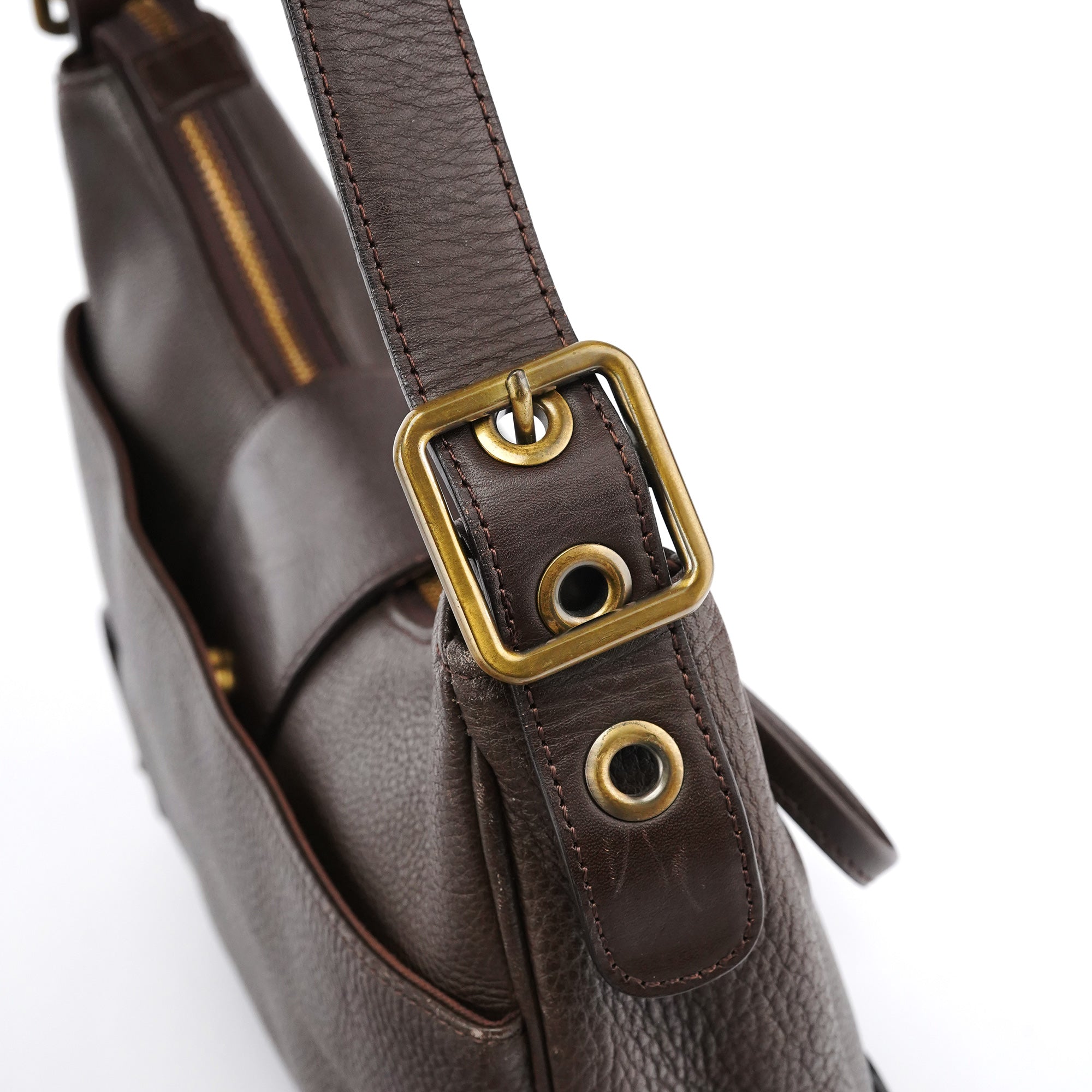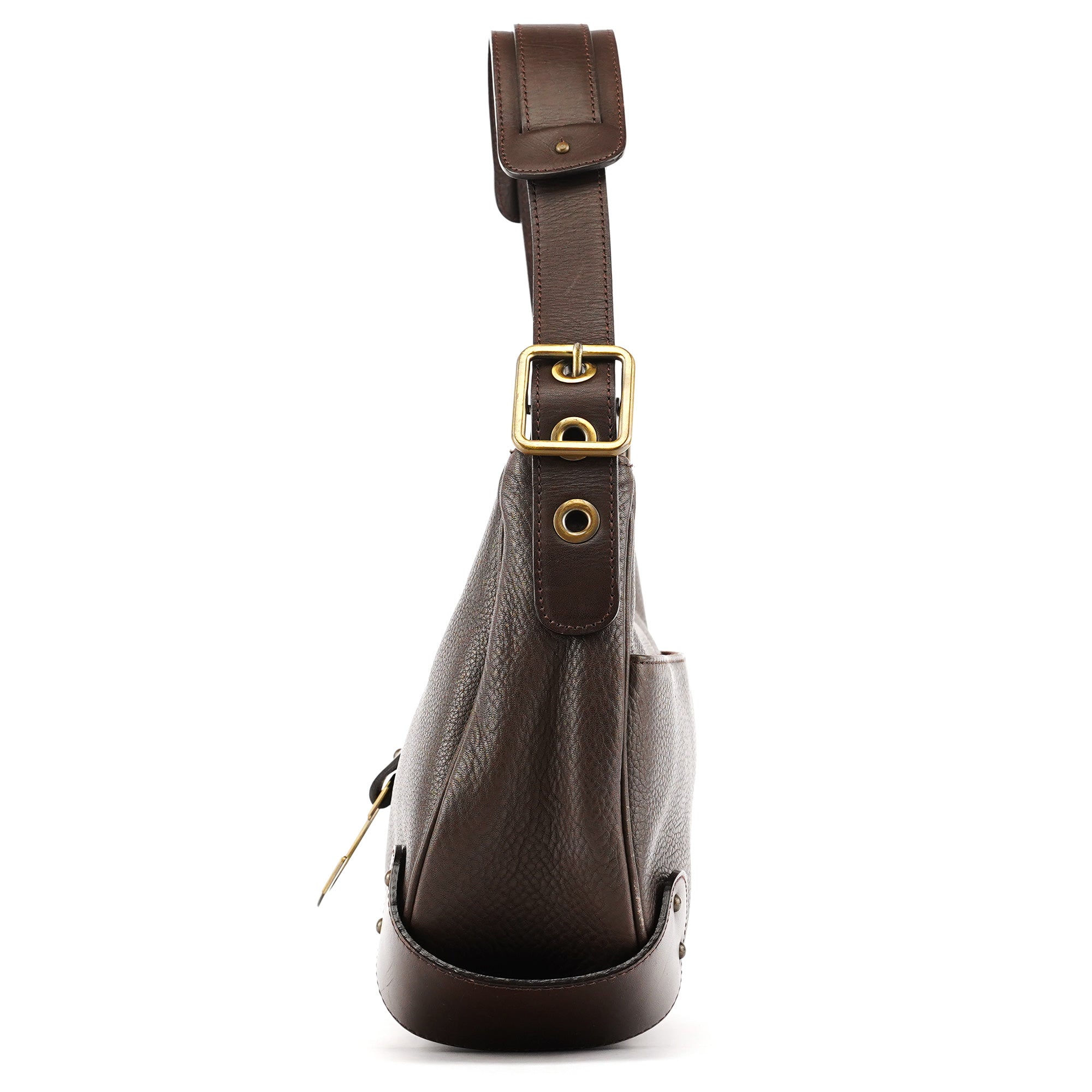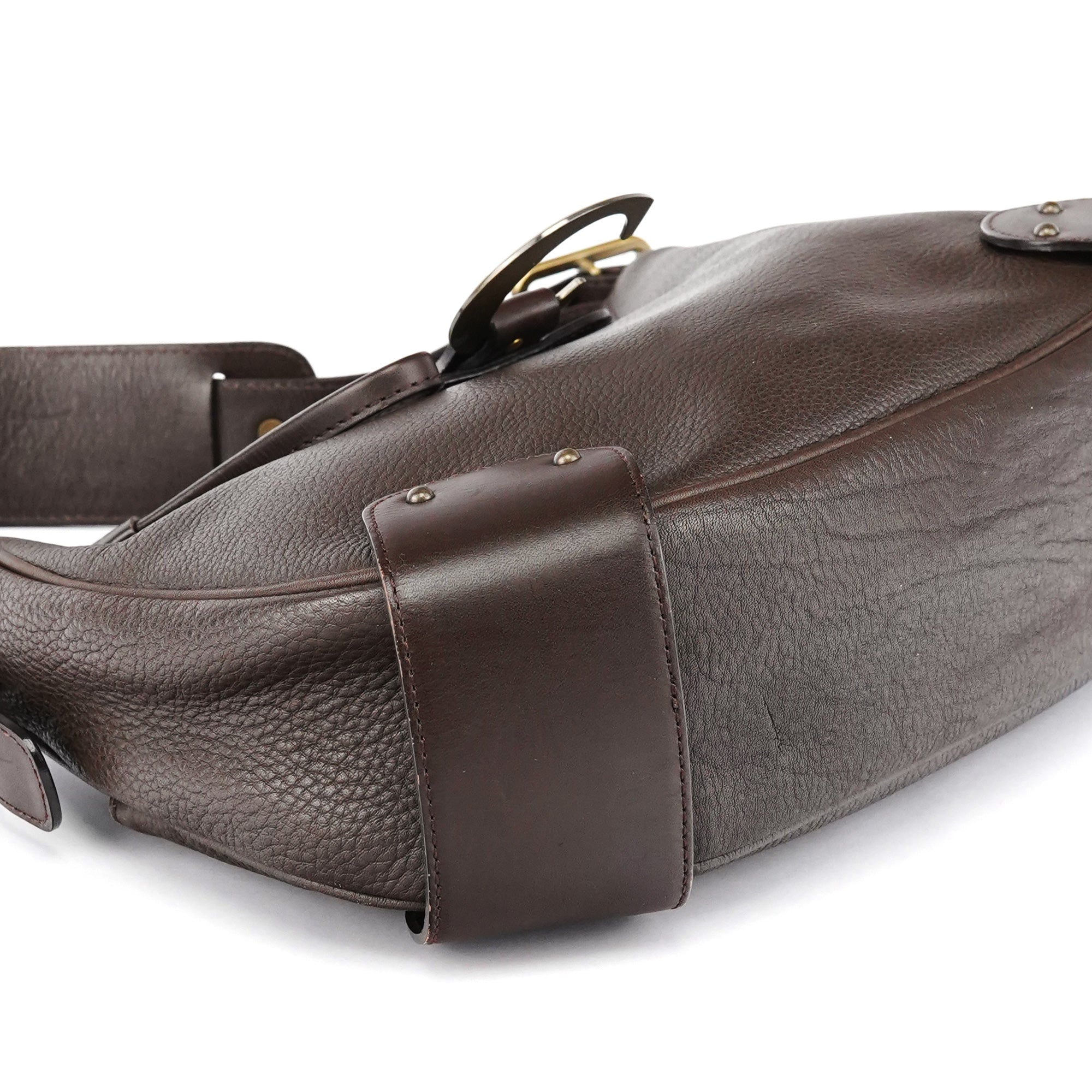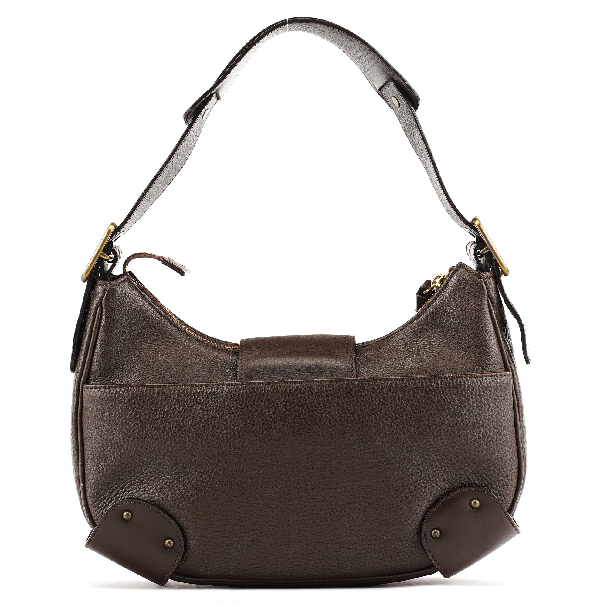 Designed in the early 2000s, this Chloé shoulder bag is constructed from rich brown grained leather in a curved hobo silhouette. It features a prominent gold-tone signature "C" clasp securing the front flap. The bag includes an adjustable strap with brass hardware and a spacious interior lined in brown canvas.