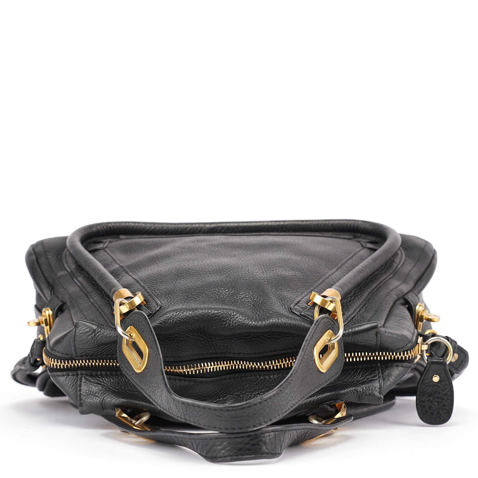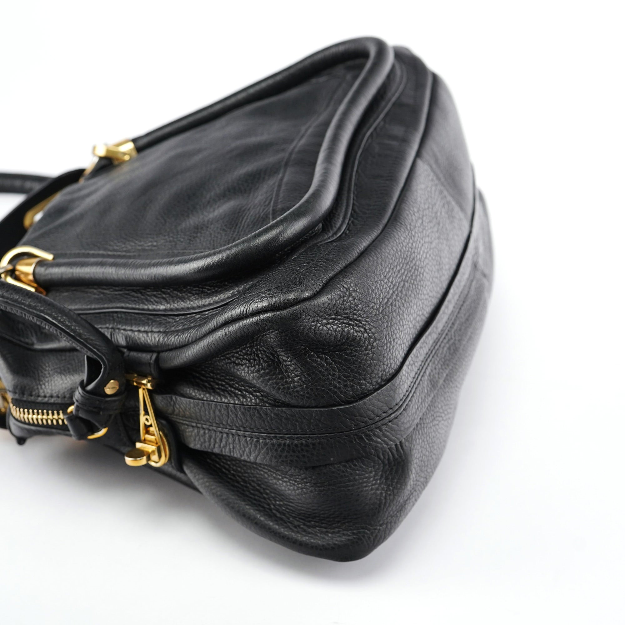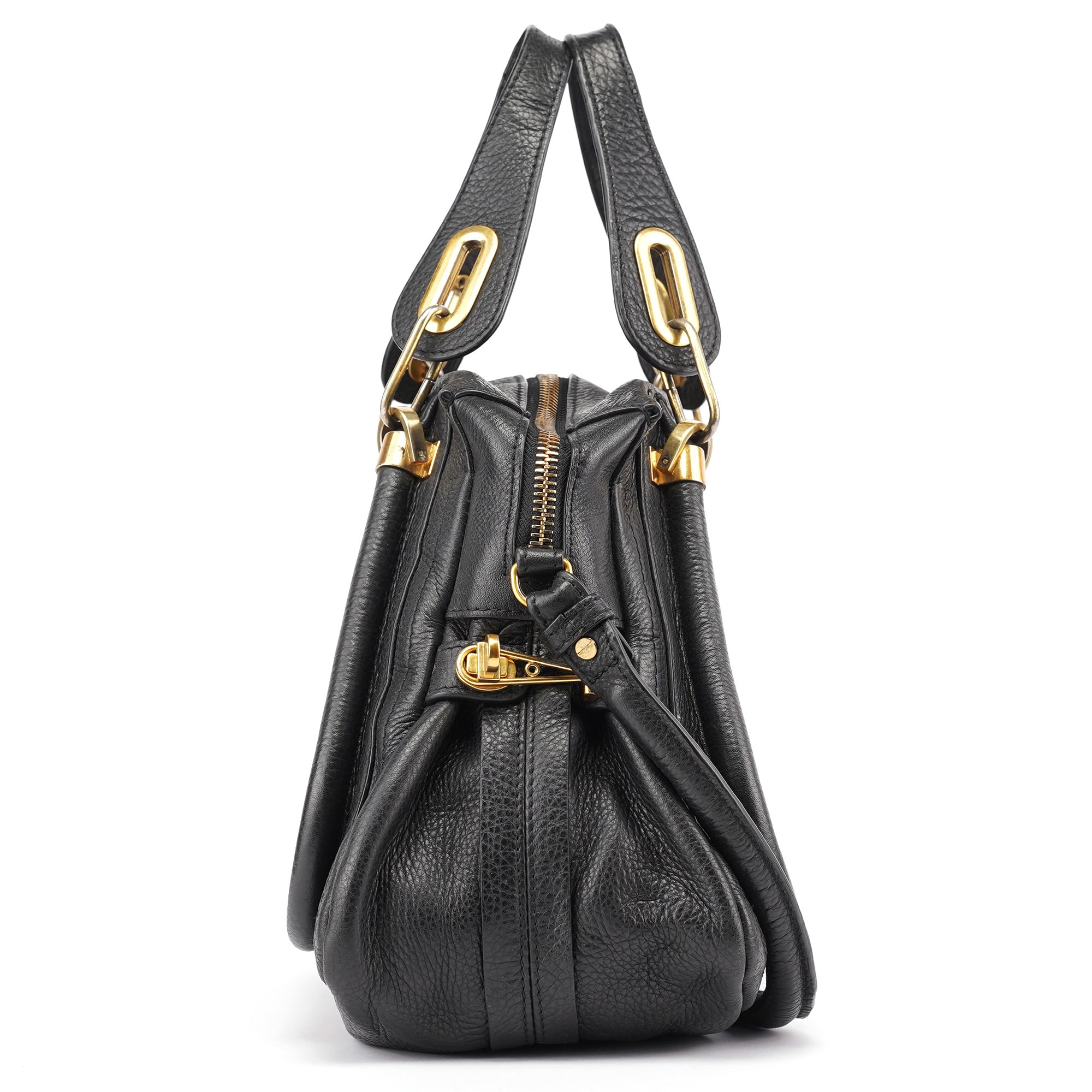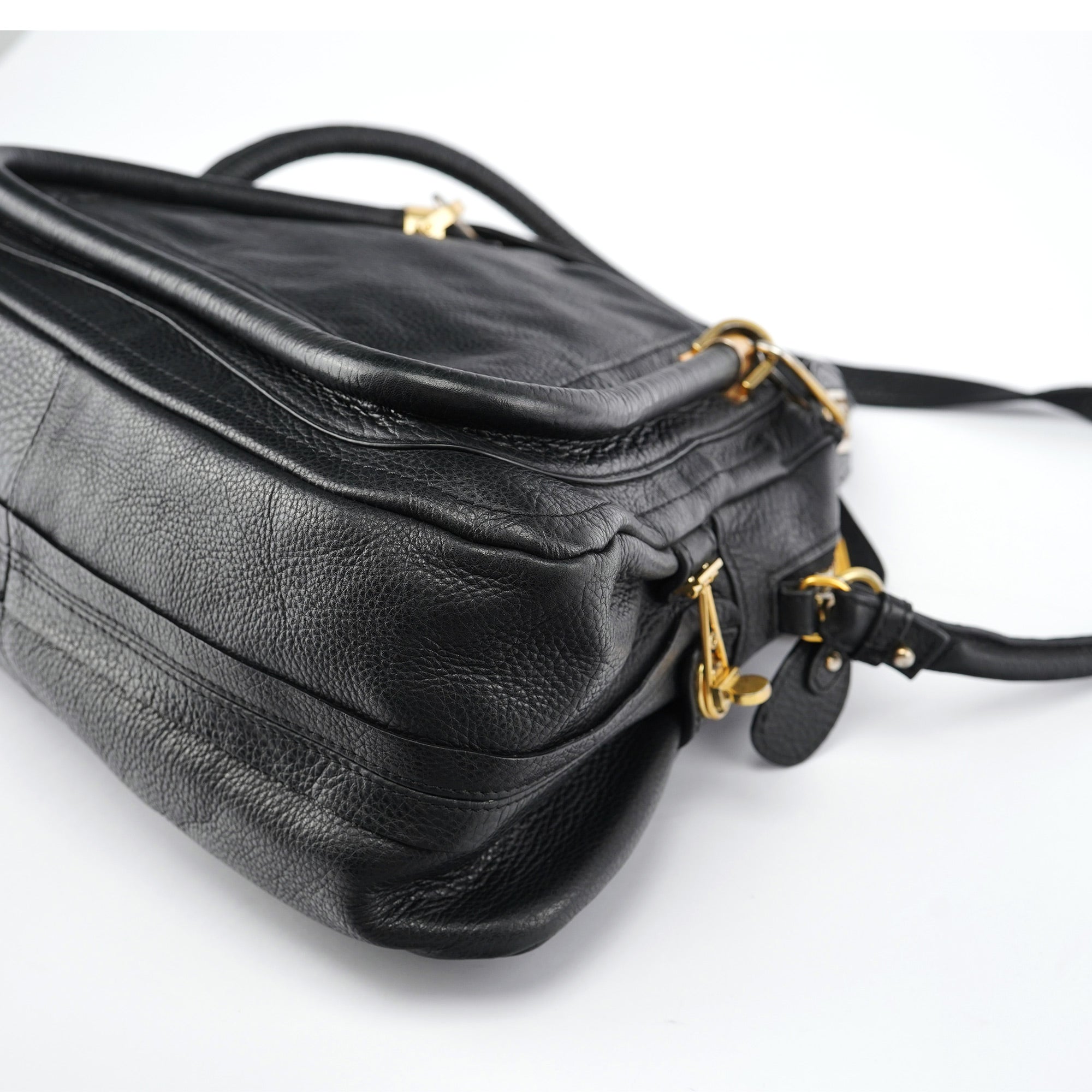 Designed in the mid-2000s by Hannah MacGibbon, this Chloé Paraty 2-way bag is crafted in supple black leather with sculptural side piping and antique gold-tone hardware. Its trapezoidal shape features dual top handles and a long removable strap for versatile styling. The top zip closure opens to a fabric-lined interior with a single zip pocket.