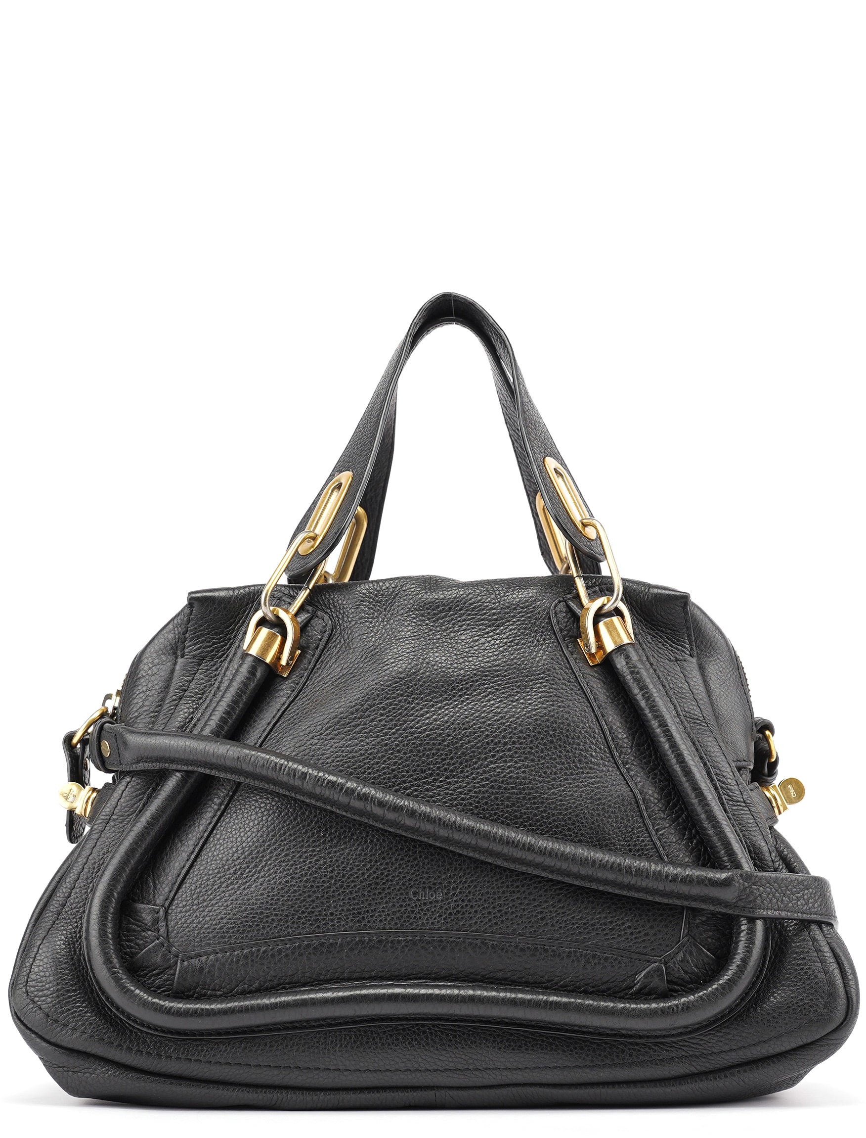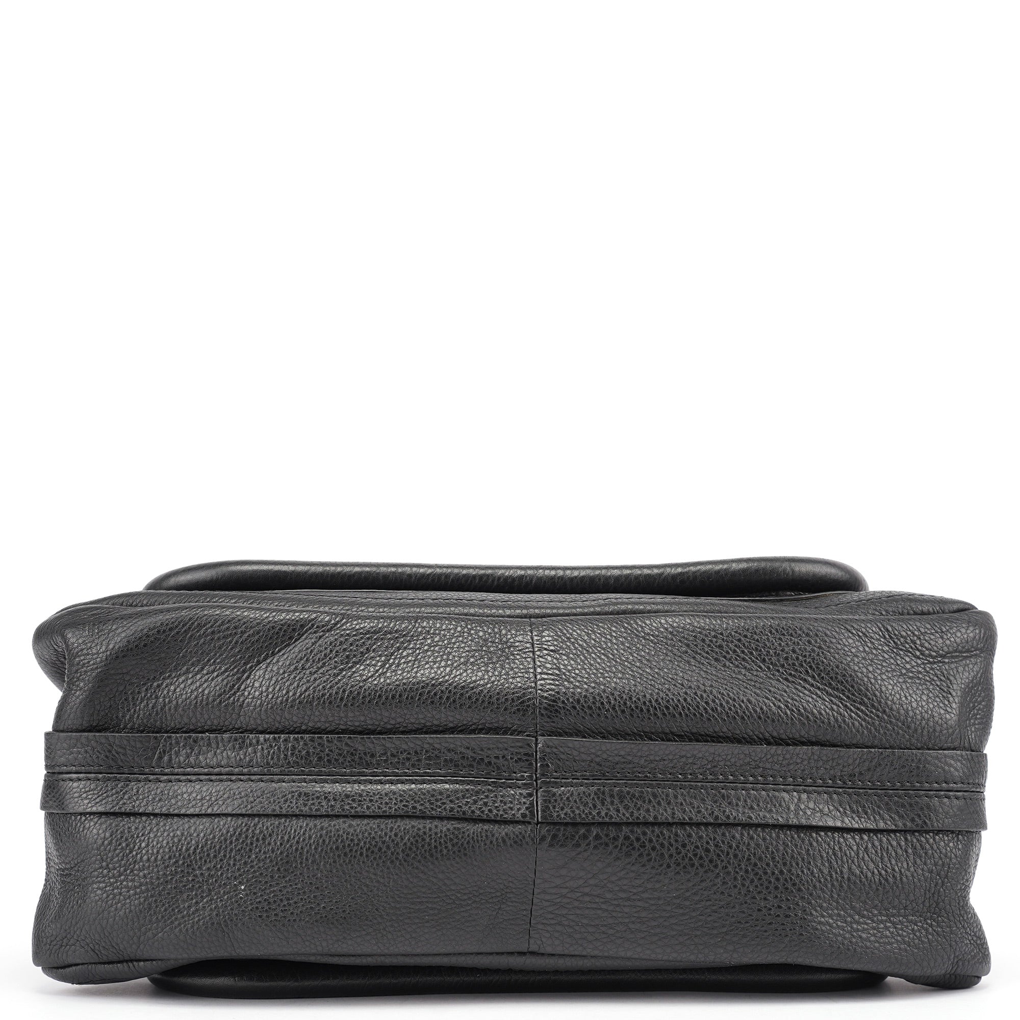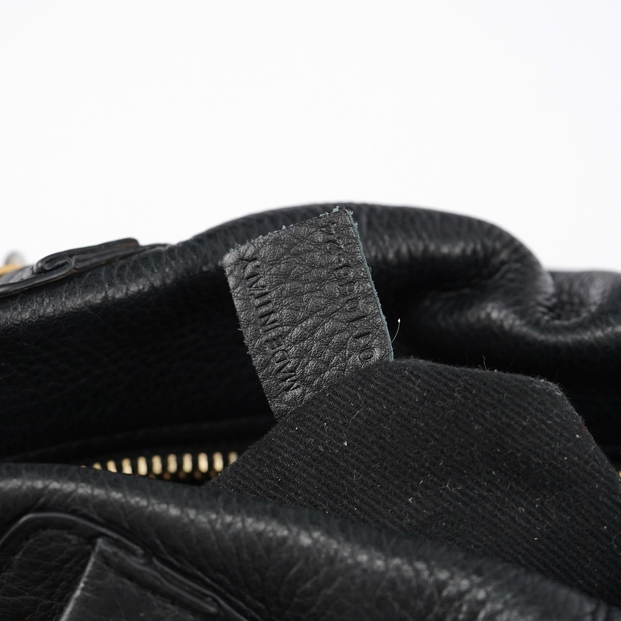 Designed in the mid-2000s by Hannah MacGibbon, this Chloé Paraty 2-way bag is crafted in supple black leather with sculptural side piping and antique gold-tone hardware. Its trapezoidal shape features dual top handles and a long removable strap for versatile styling. The top zip closure opens to a fabric-lined interior with a single zip pocket.