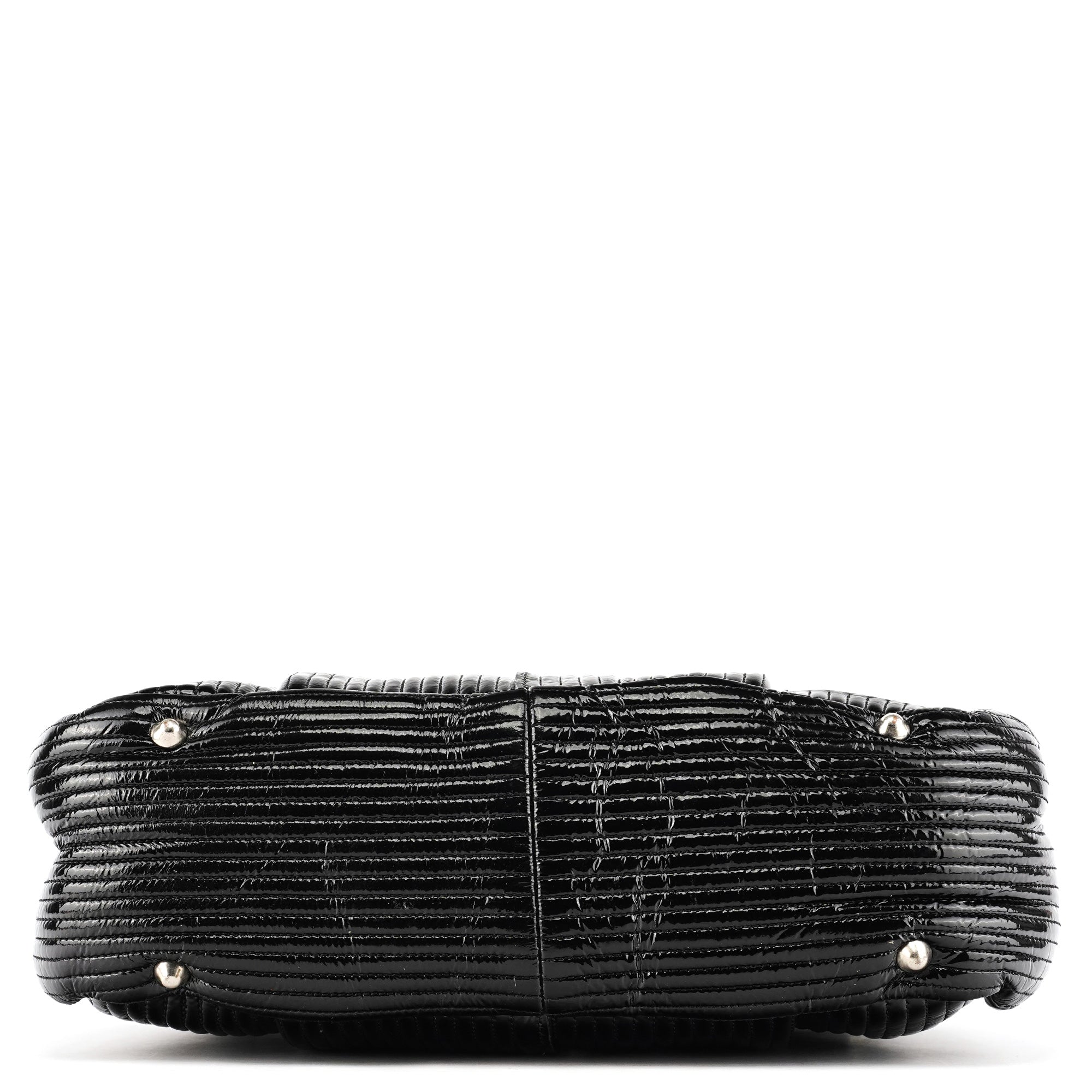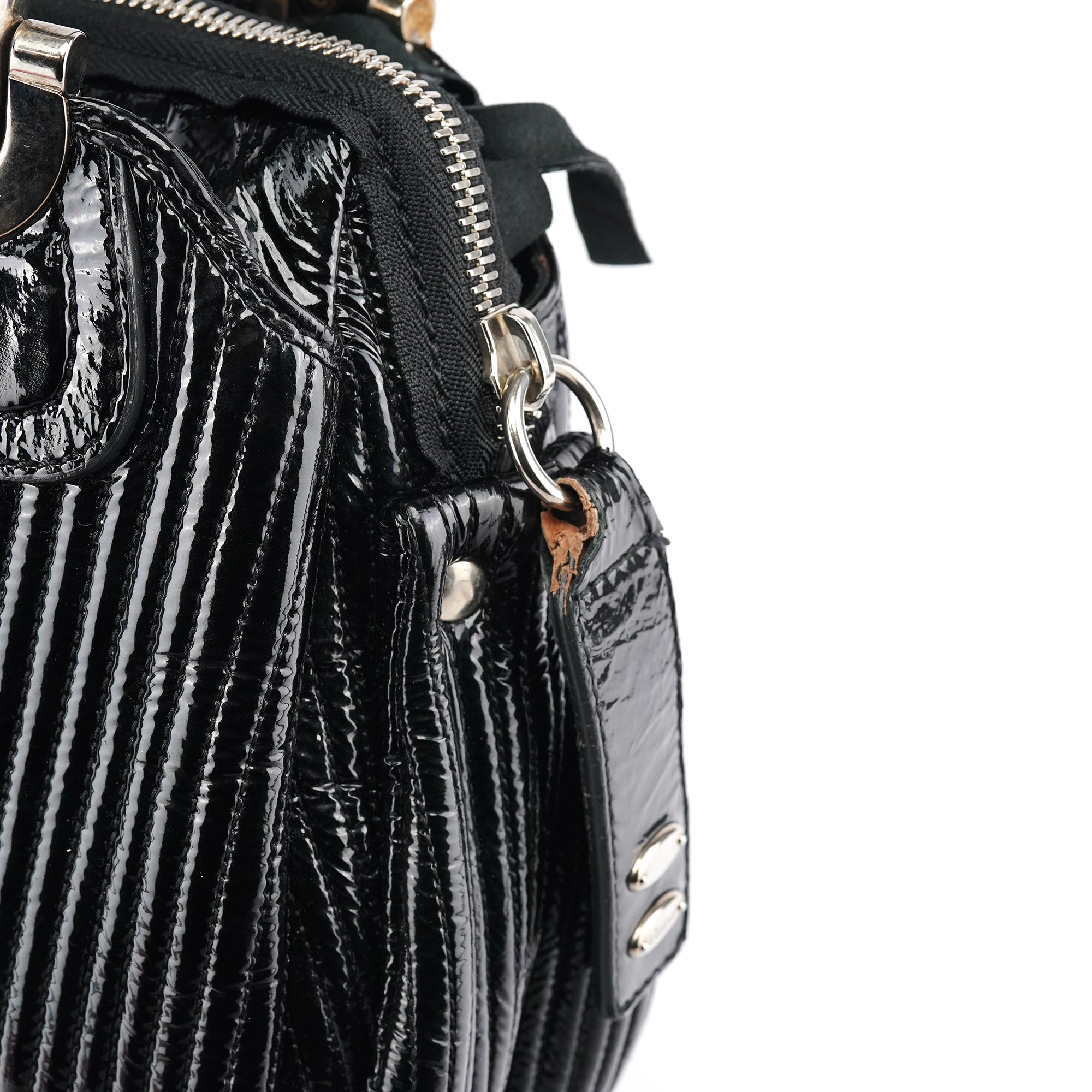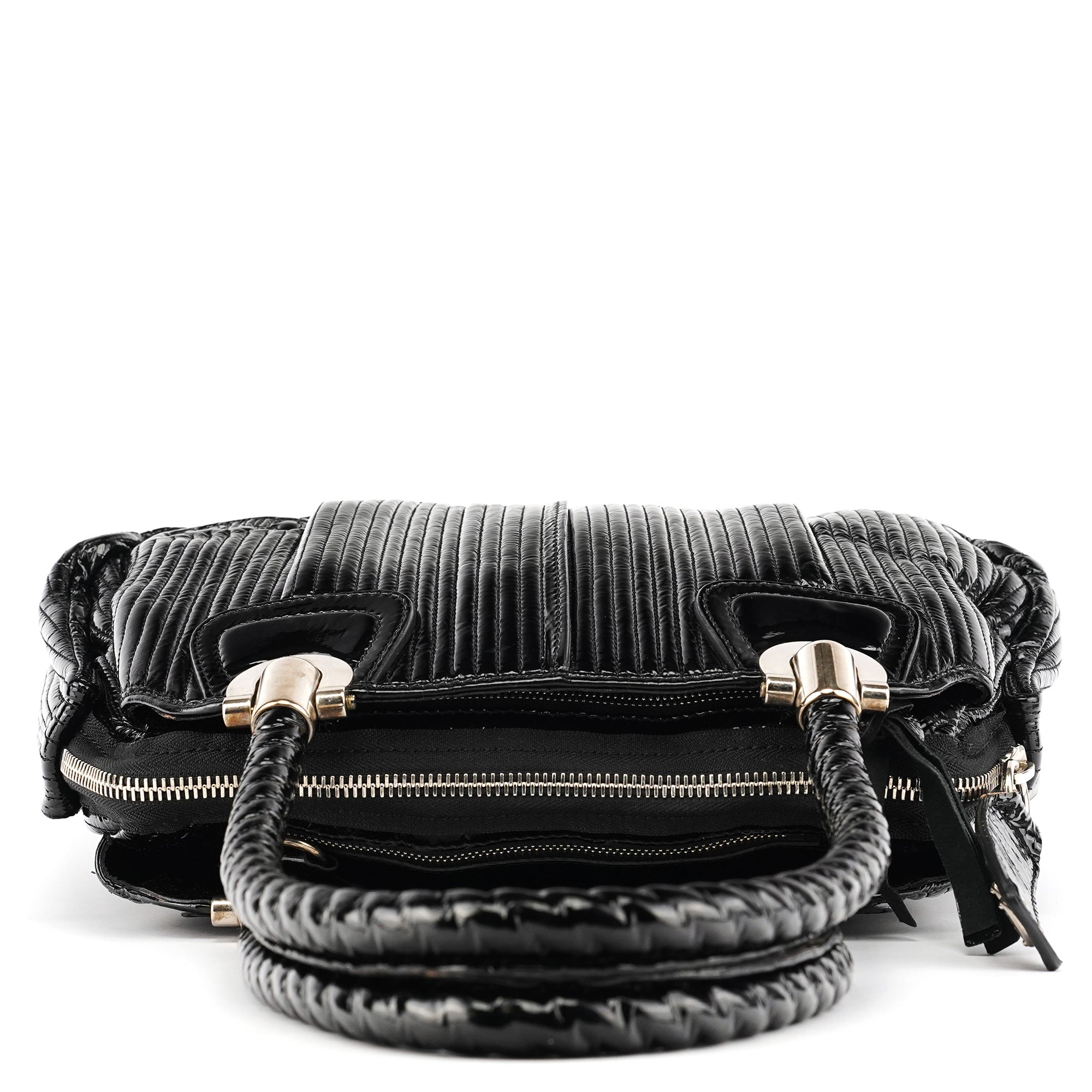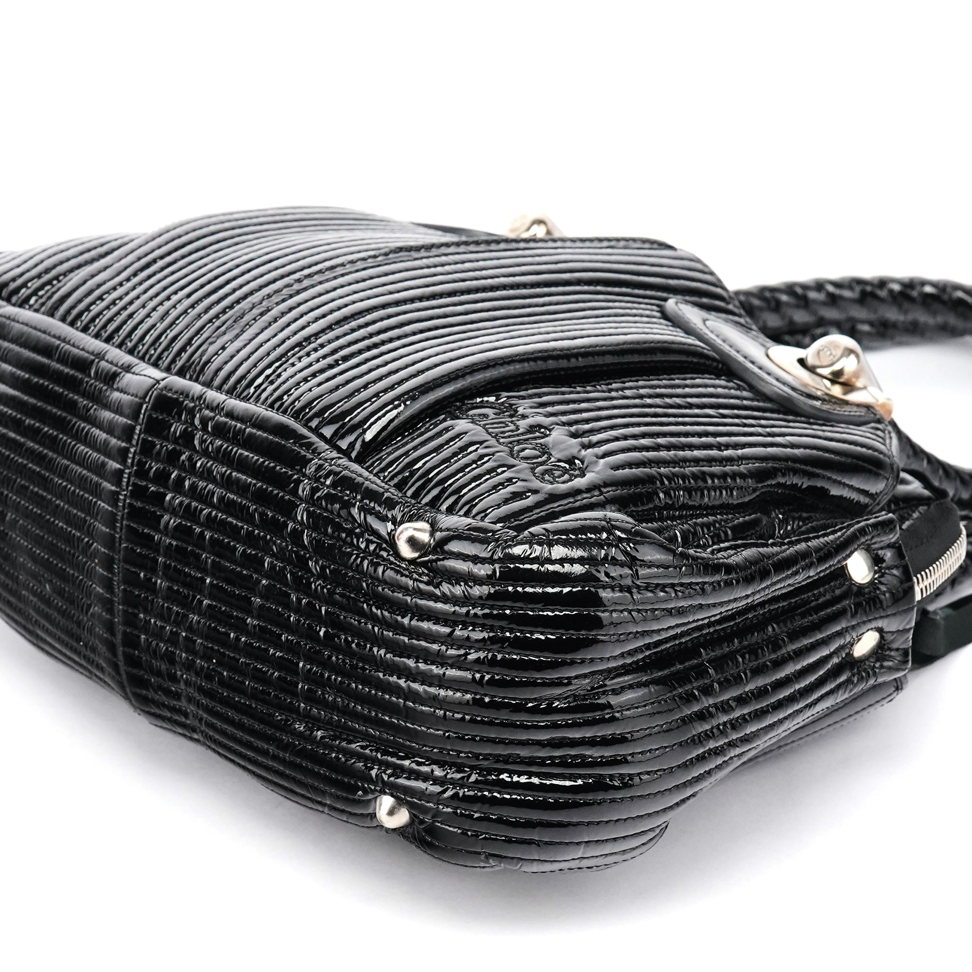 Designed in the early 2000s by Phoebe Philo, this Chloé Bay bag is crafted in black patent leather with a vertical quilted finish and braided top handles. It features silver hardware, zip-top closures and two main compartments with a central slip pocket. The interior is lined in black canvas with a zip pocket.