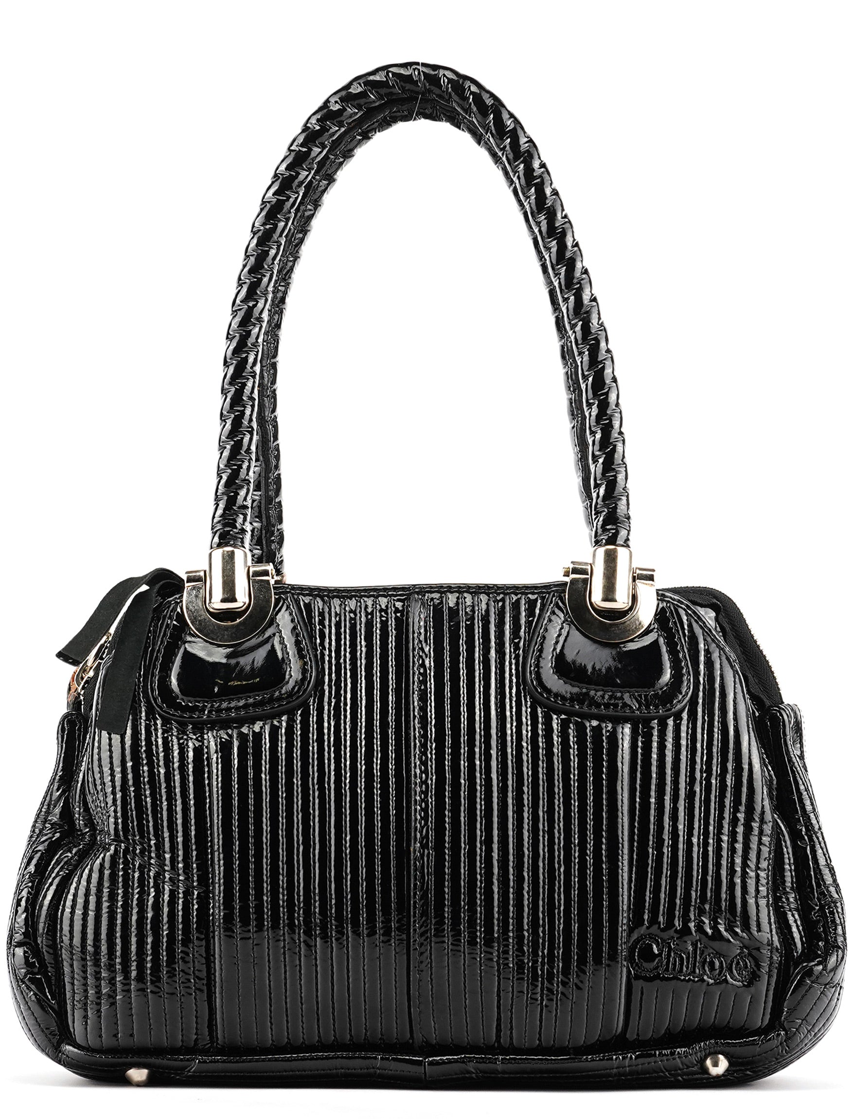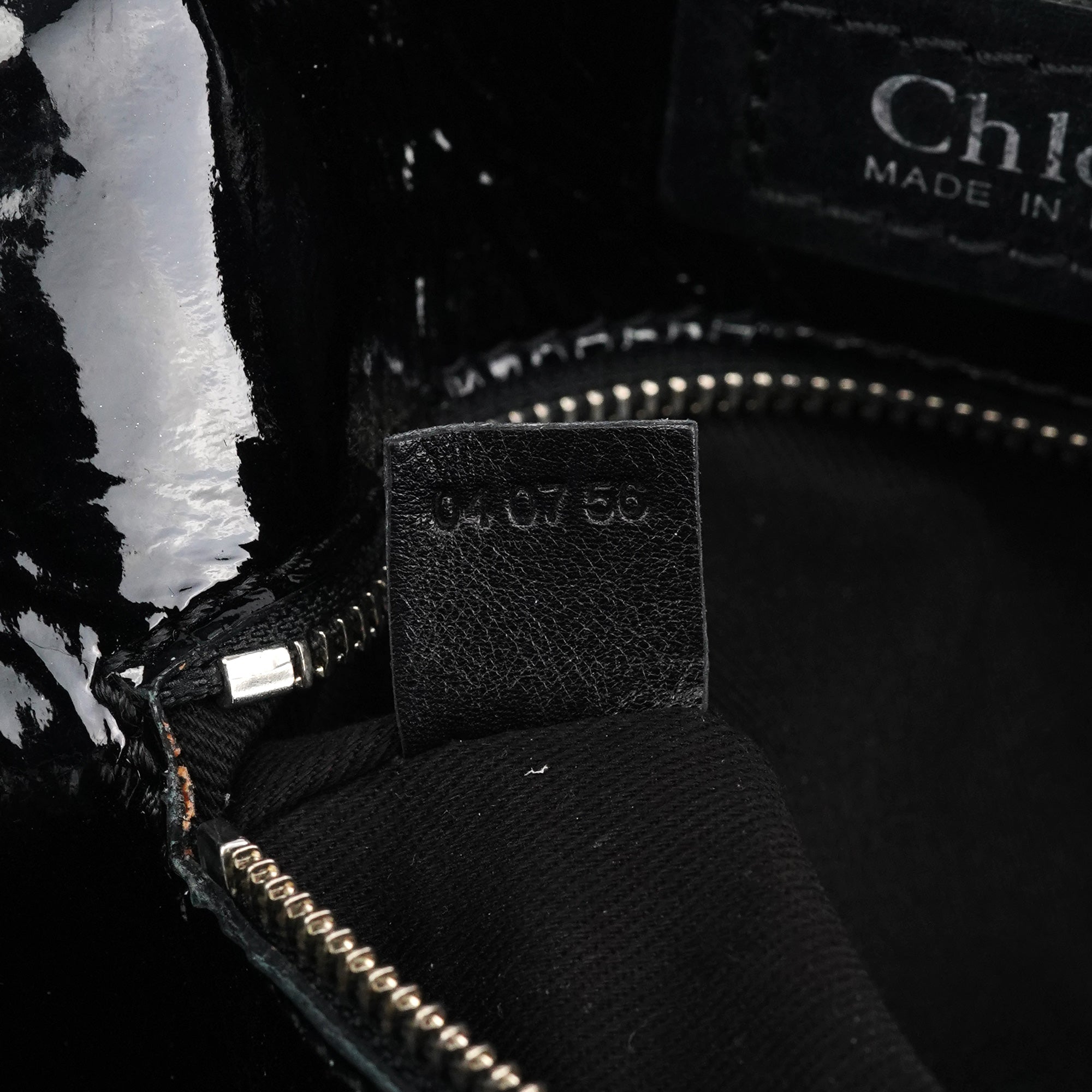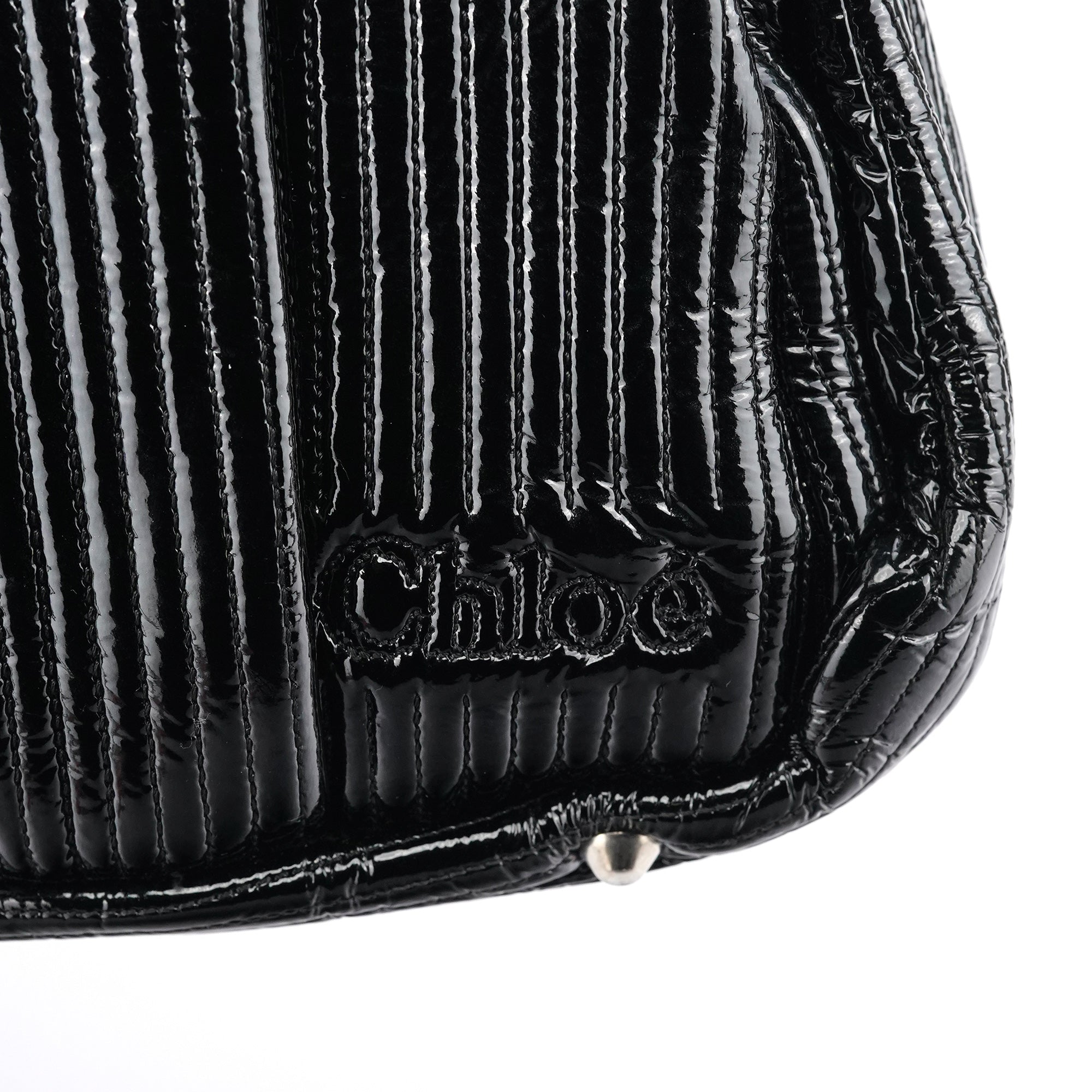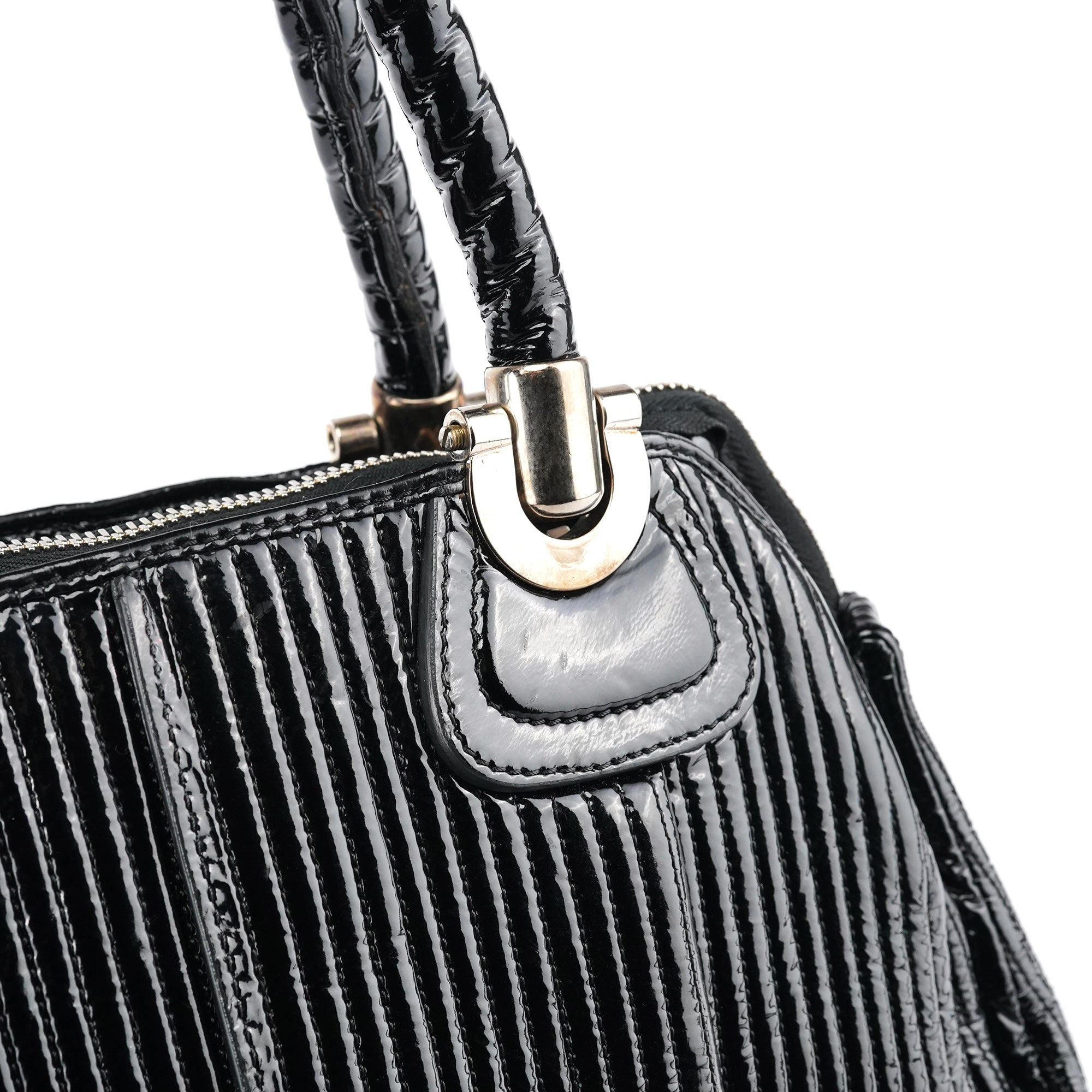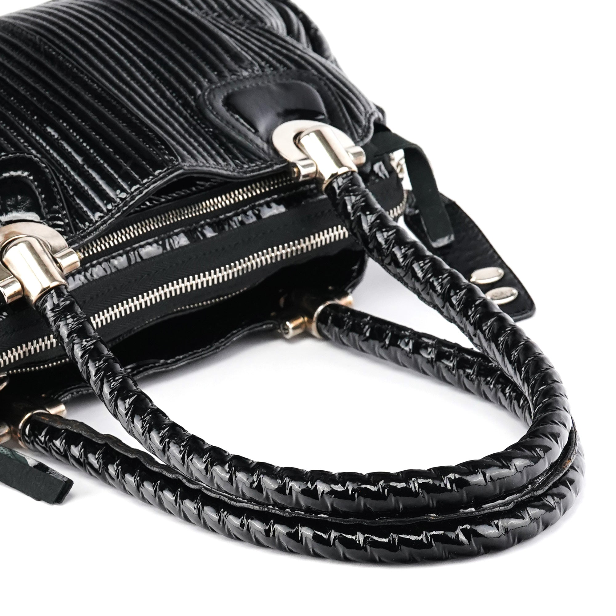 Designed in the early 2000s by Phoebe Philo, this Chloé Bay bag is crafted in black patent leather with a vertical quilted finish and braided top handles. It features silver hardware, zip-top closures and two main compartments with a central slip pocket. The interior is lined in black canvas with a zip pocket.