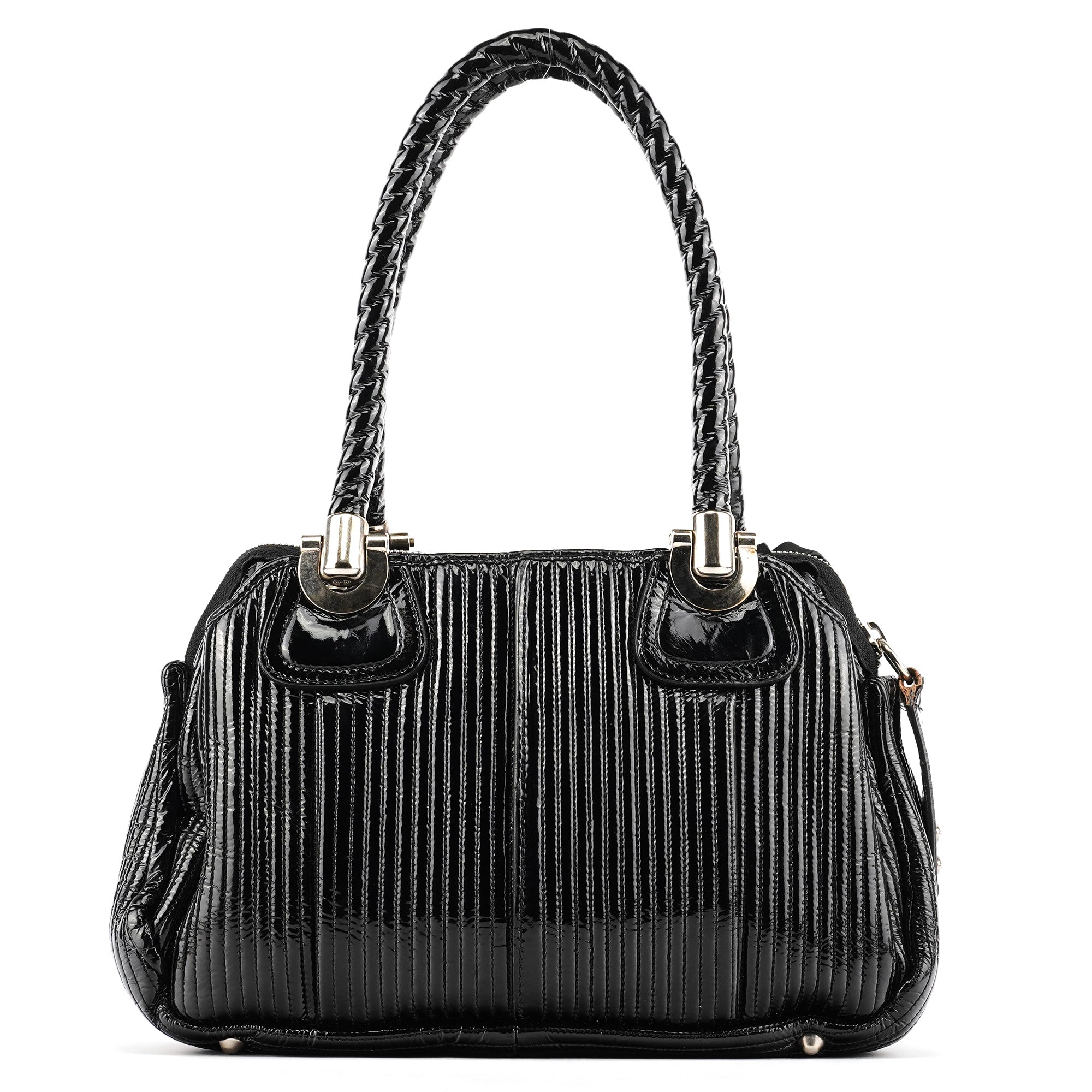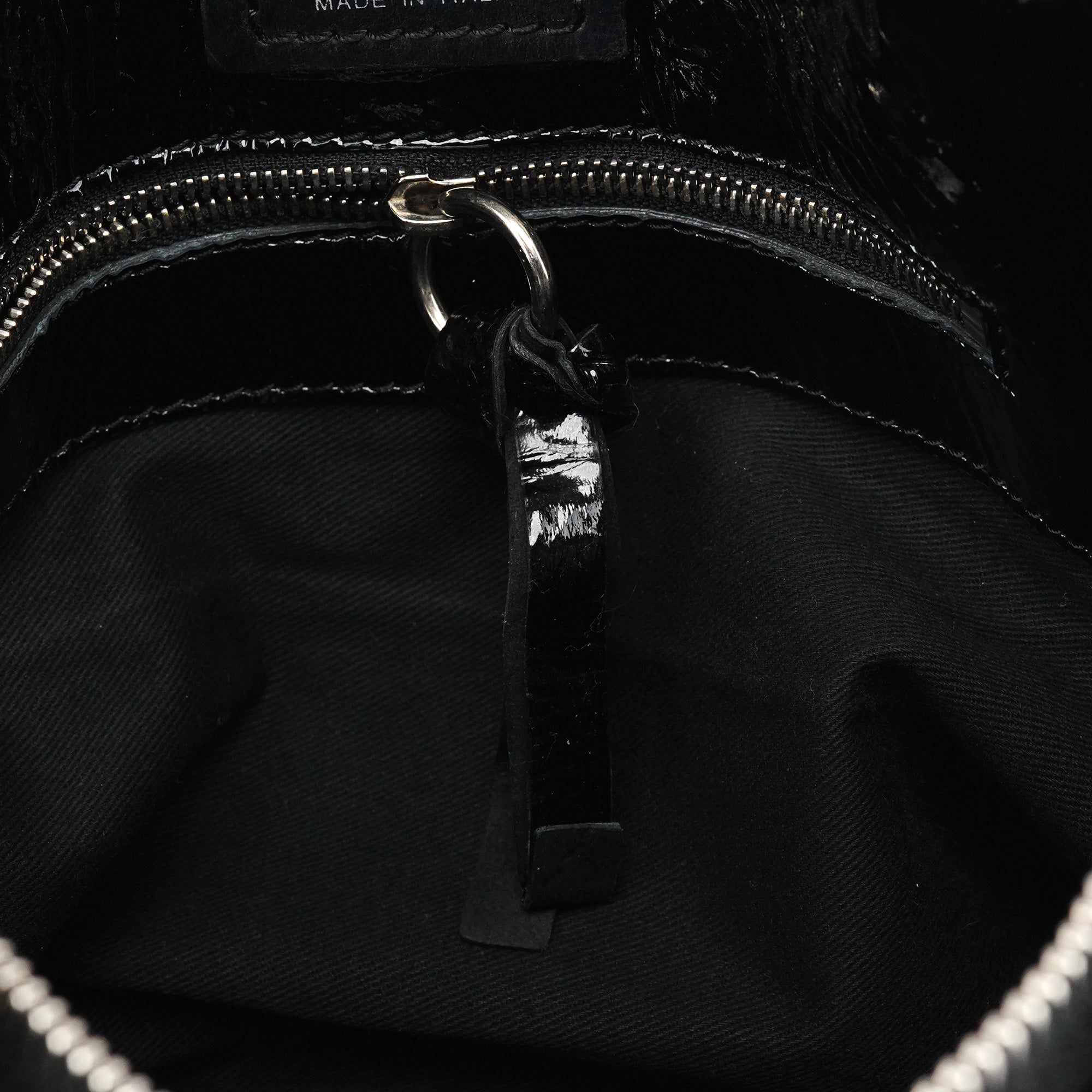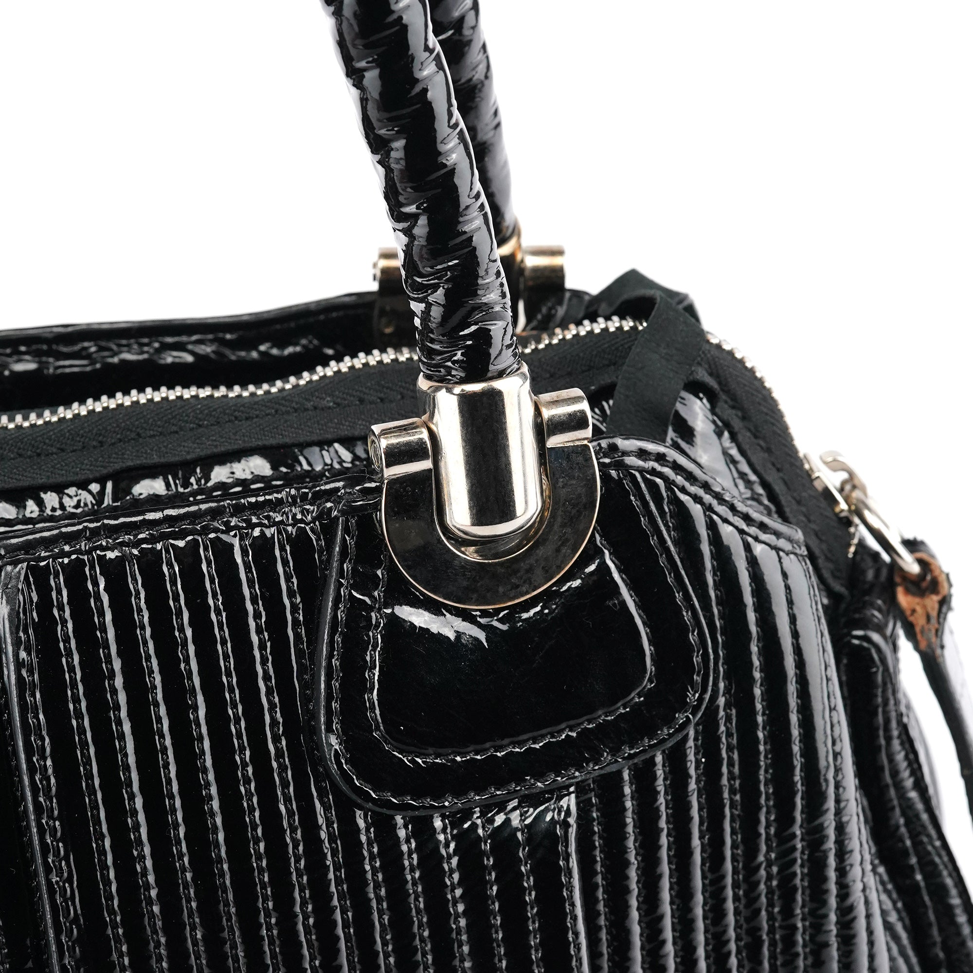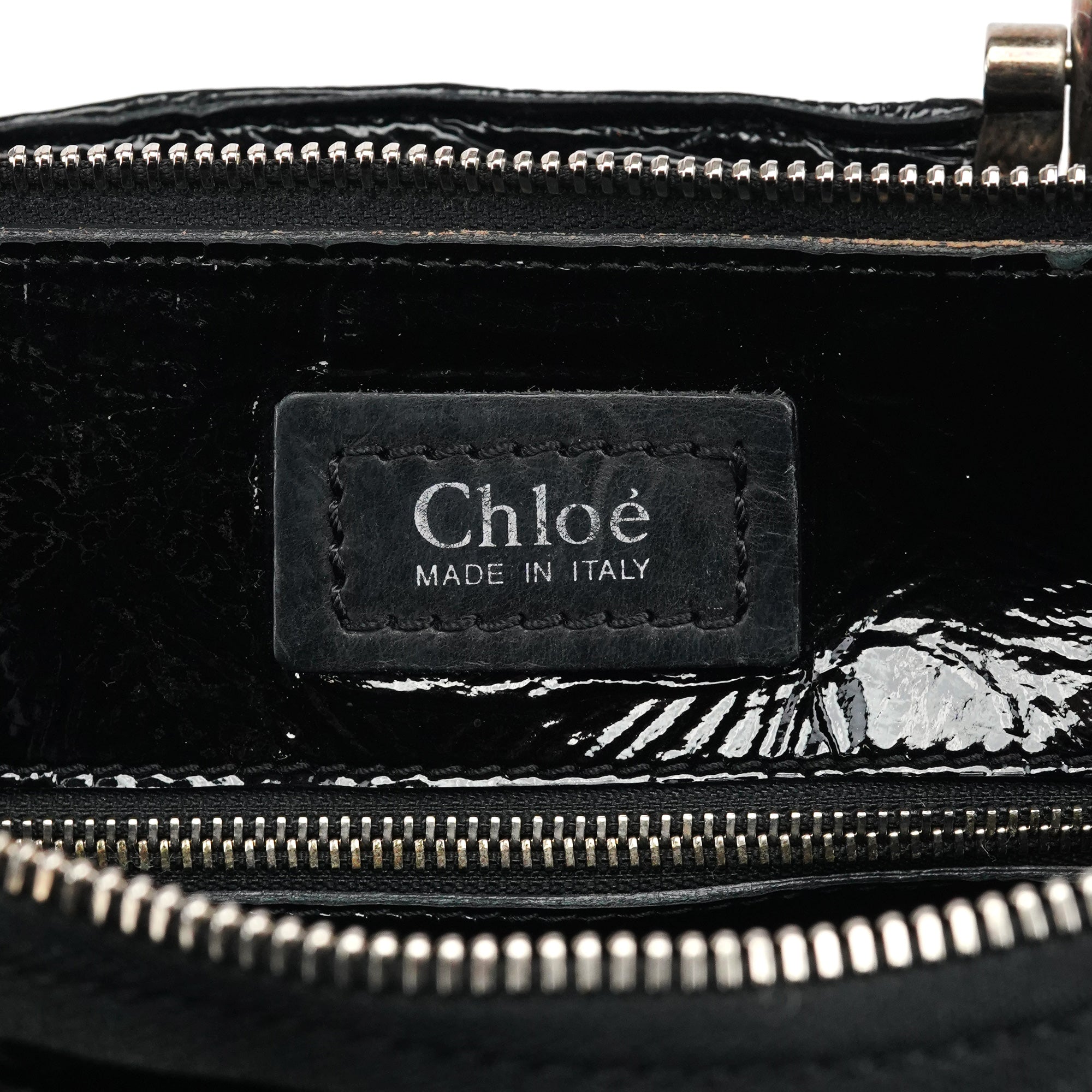 Designed in the early 2000s by Phoebe Philo, this Chloé Bay bag is crafted in black patent leather with a vertical quilted finish and braided top handles. It features silver hardware, zip-top closures and two main compartments with a central slip pocket. The interior is lined in black canvas with a zip pocket.