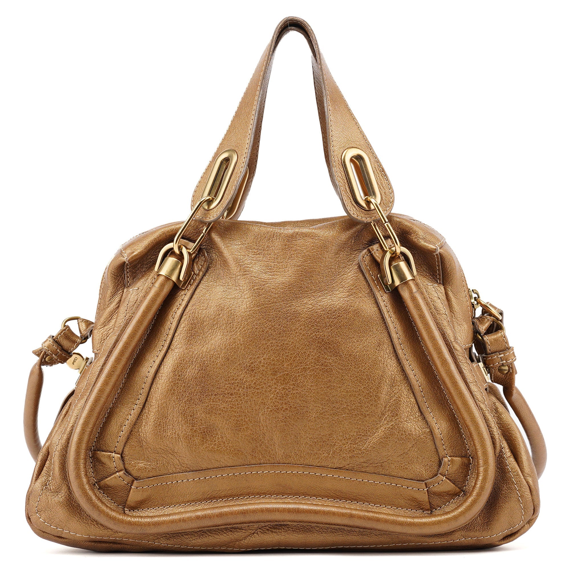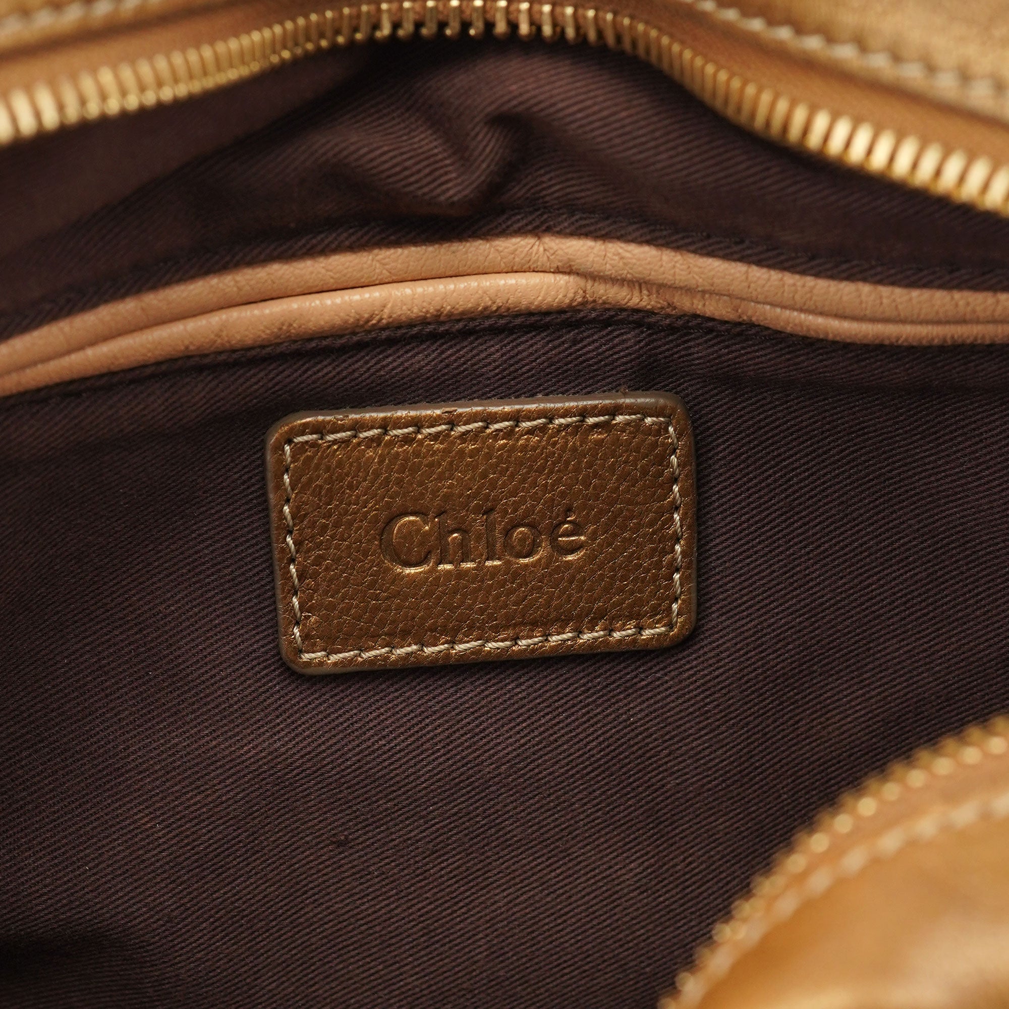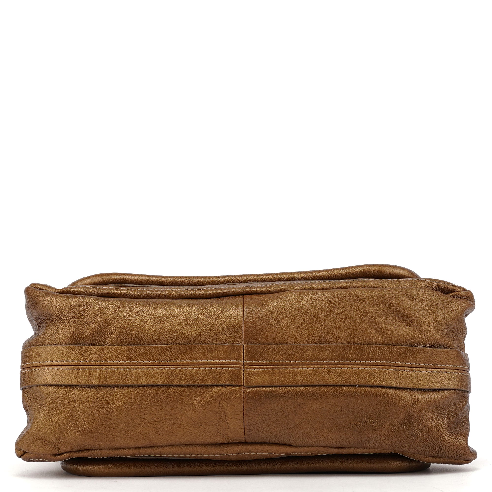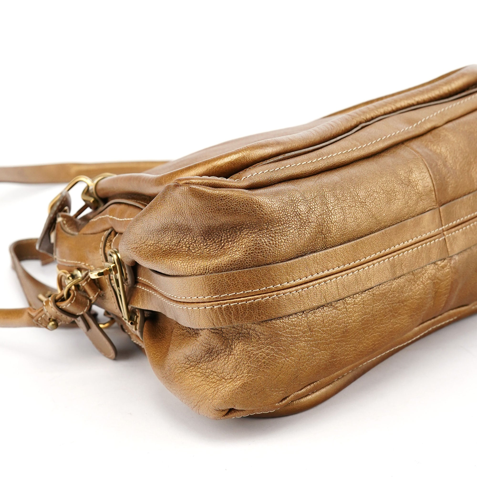Designed by Hannah MacGibbon in 2008, the Chloé Paraty bag became an instant classic with its structured silhouette in luxurious metallic bronze pebbled leather. Accented with gold-tone hardware, rolled leather handles, and a detachable shoulder strap, it seamlessly blends elegance with functionality. The spacious zippered interior ensures practicality while embodying Chloé’s signature bohemian-luxe aesthetic.