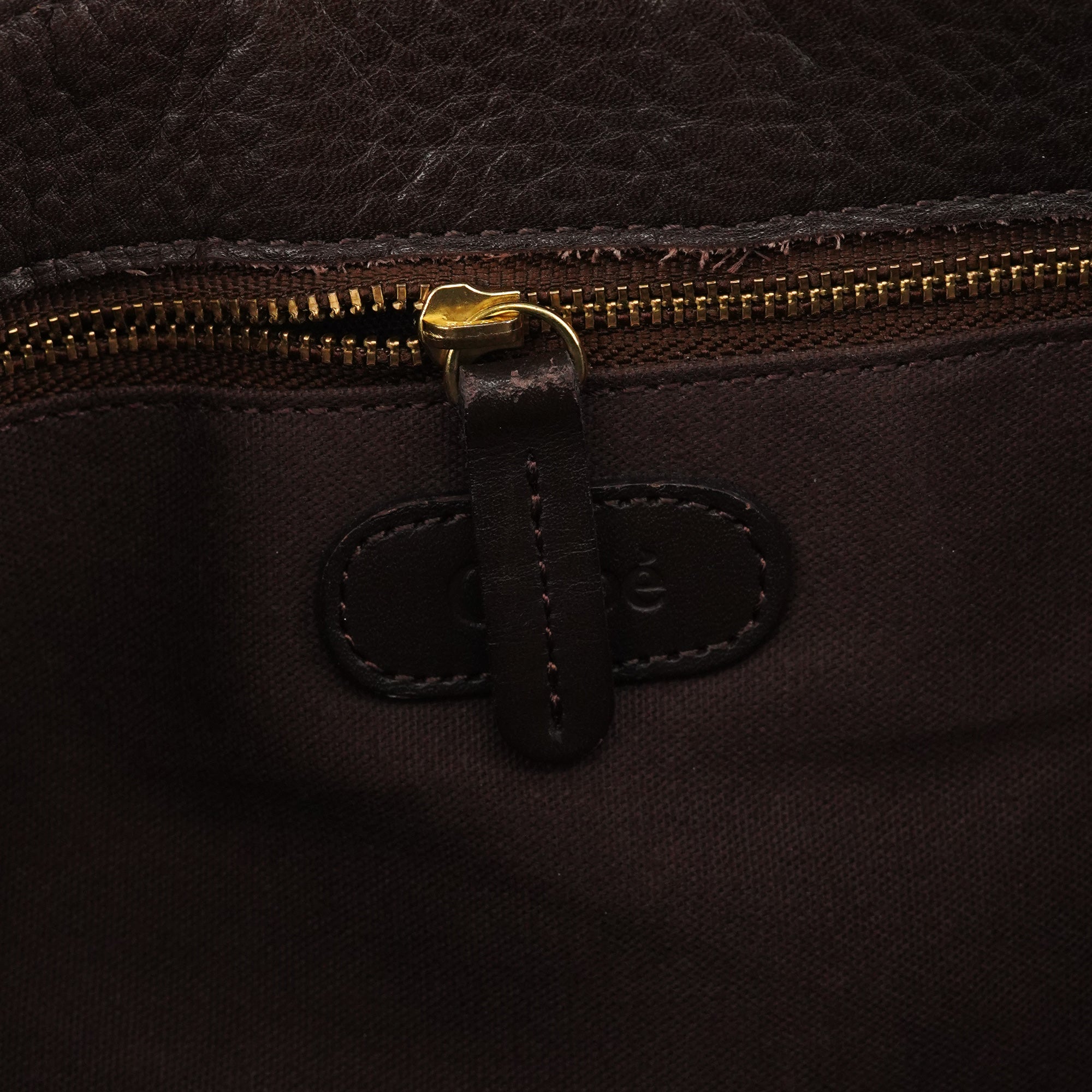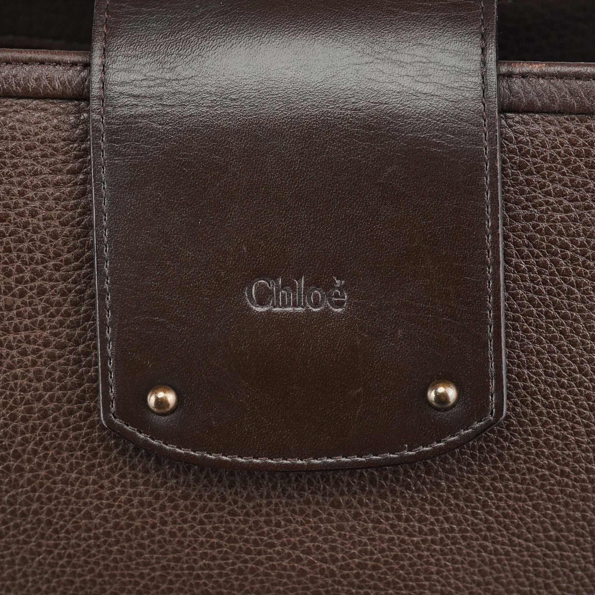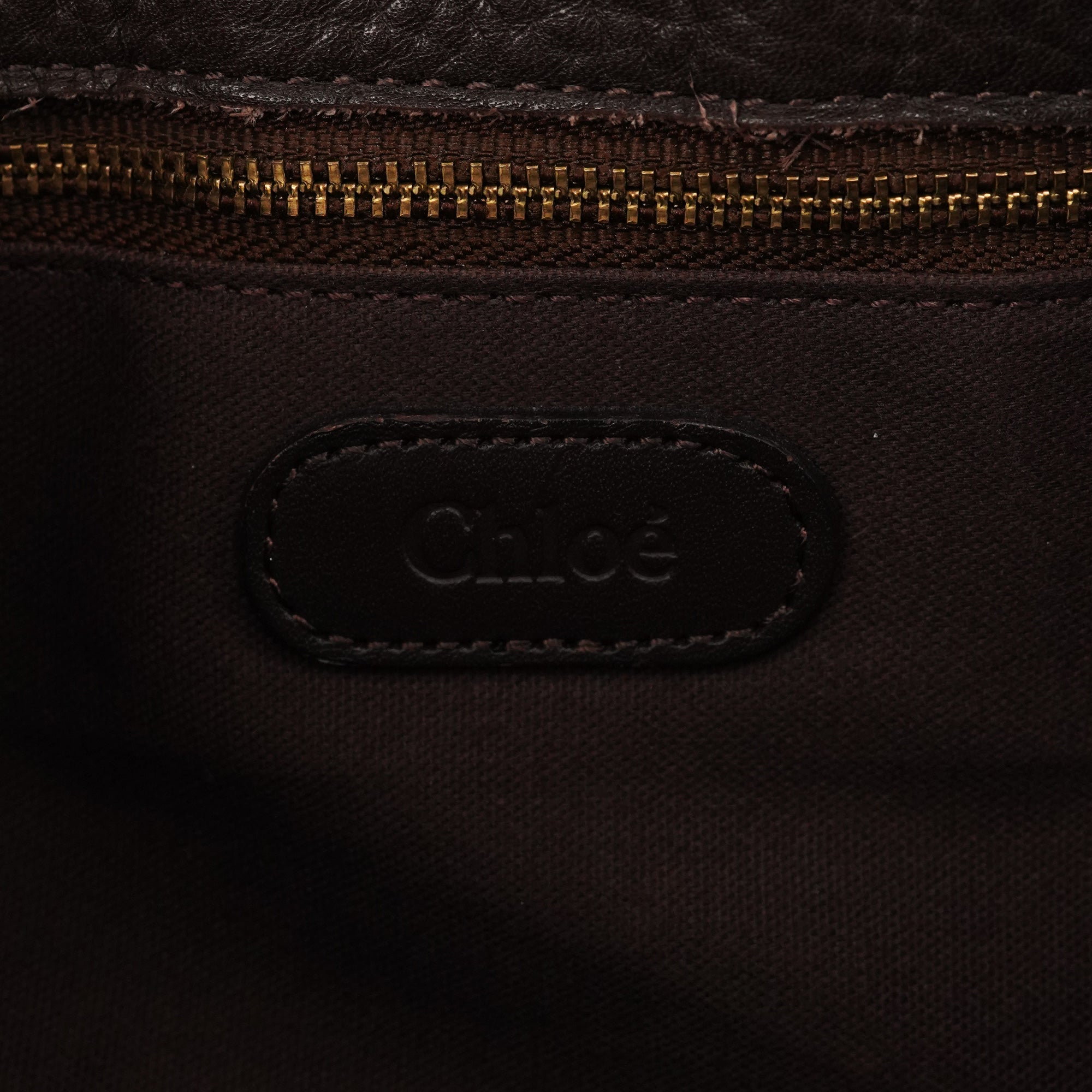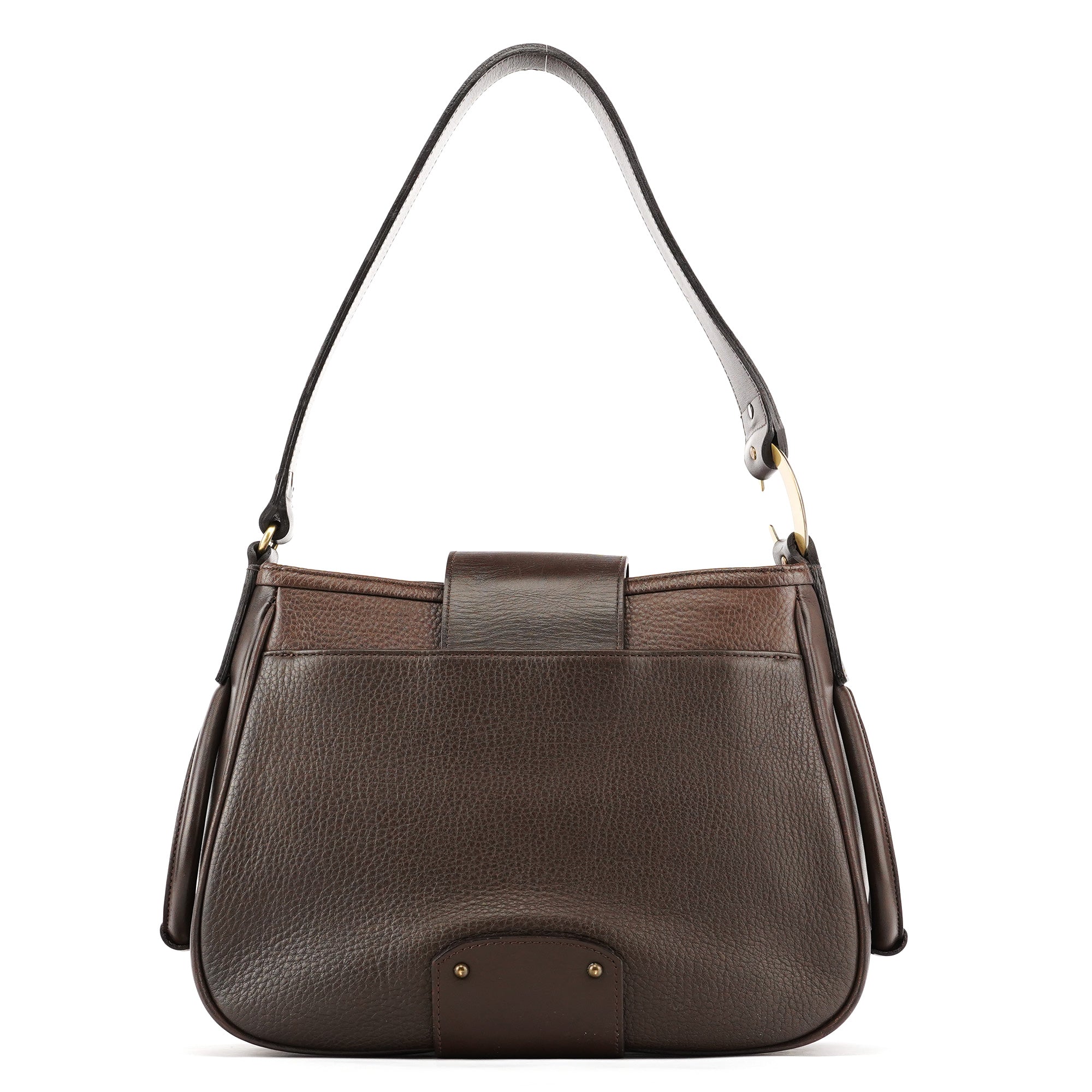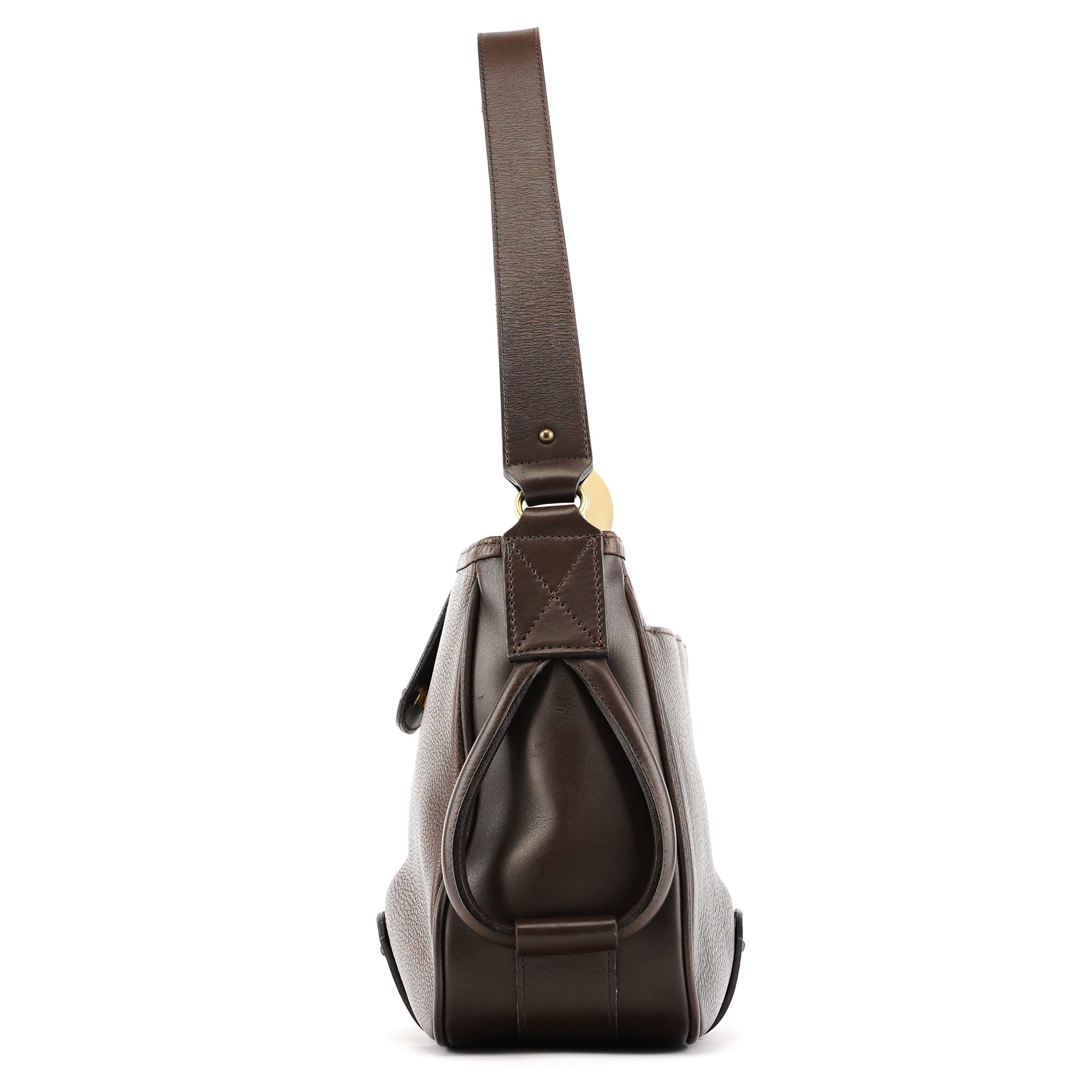 Designed in the late 1990s, this vintage Chloé C shoulder bag is crafted from brown pebbled leather with a softly structured silhouette. Features include a curved shoulder strap with signature C-shaped hardware, a flap closure, and a fabric-lined interior with a zip pocket.