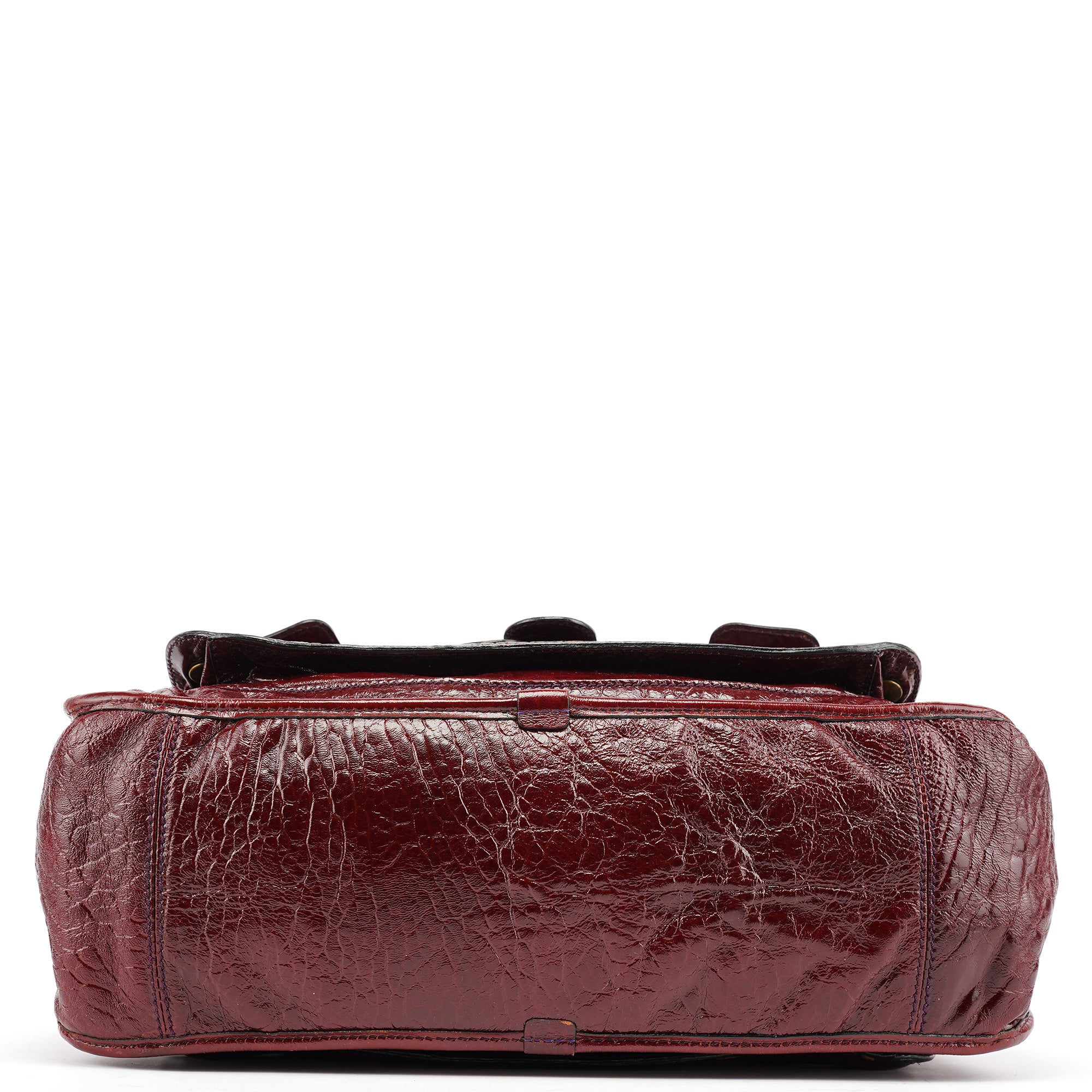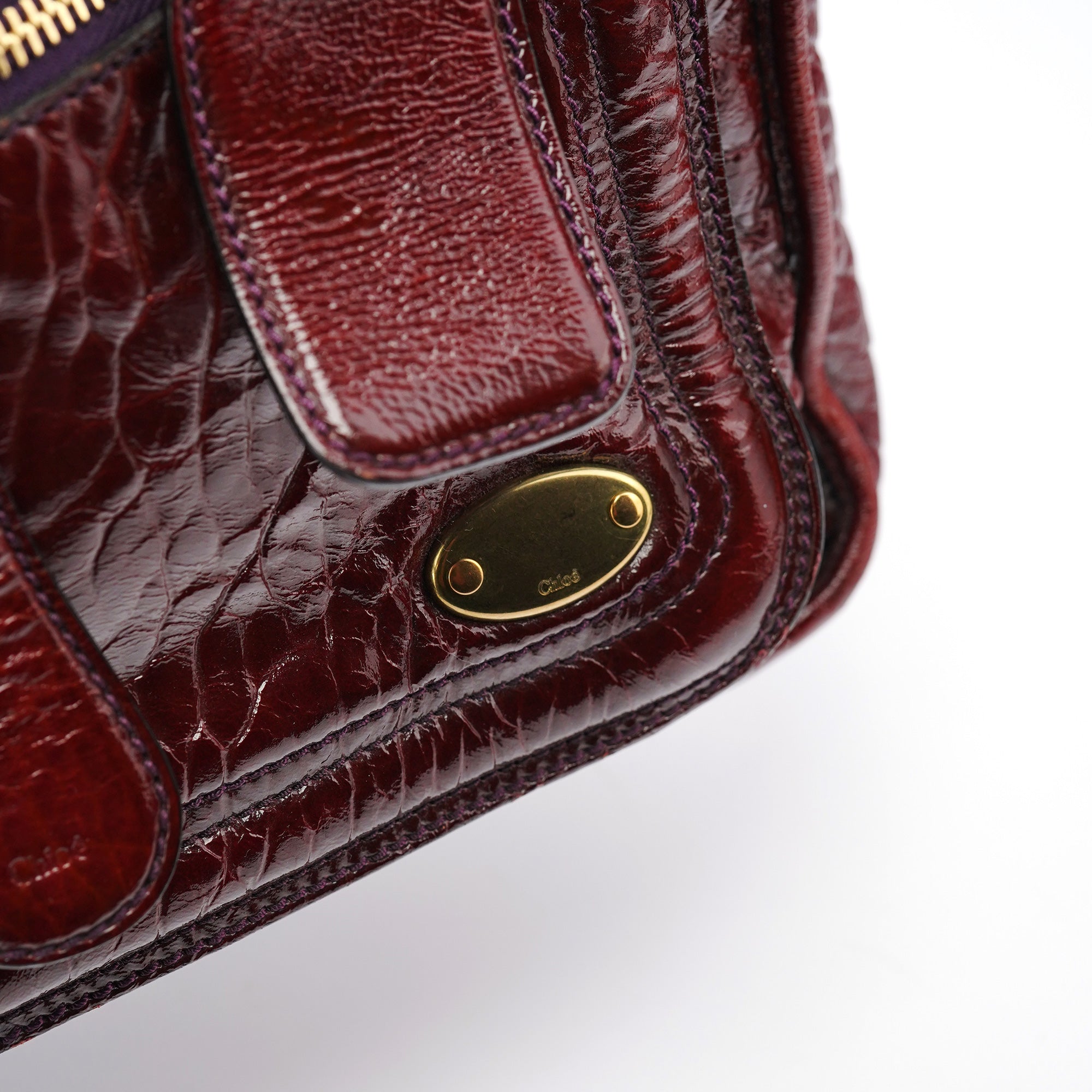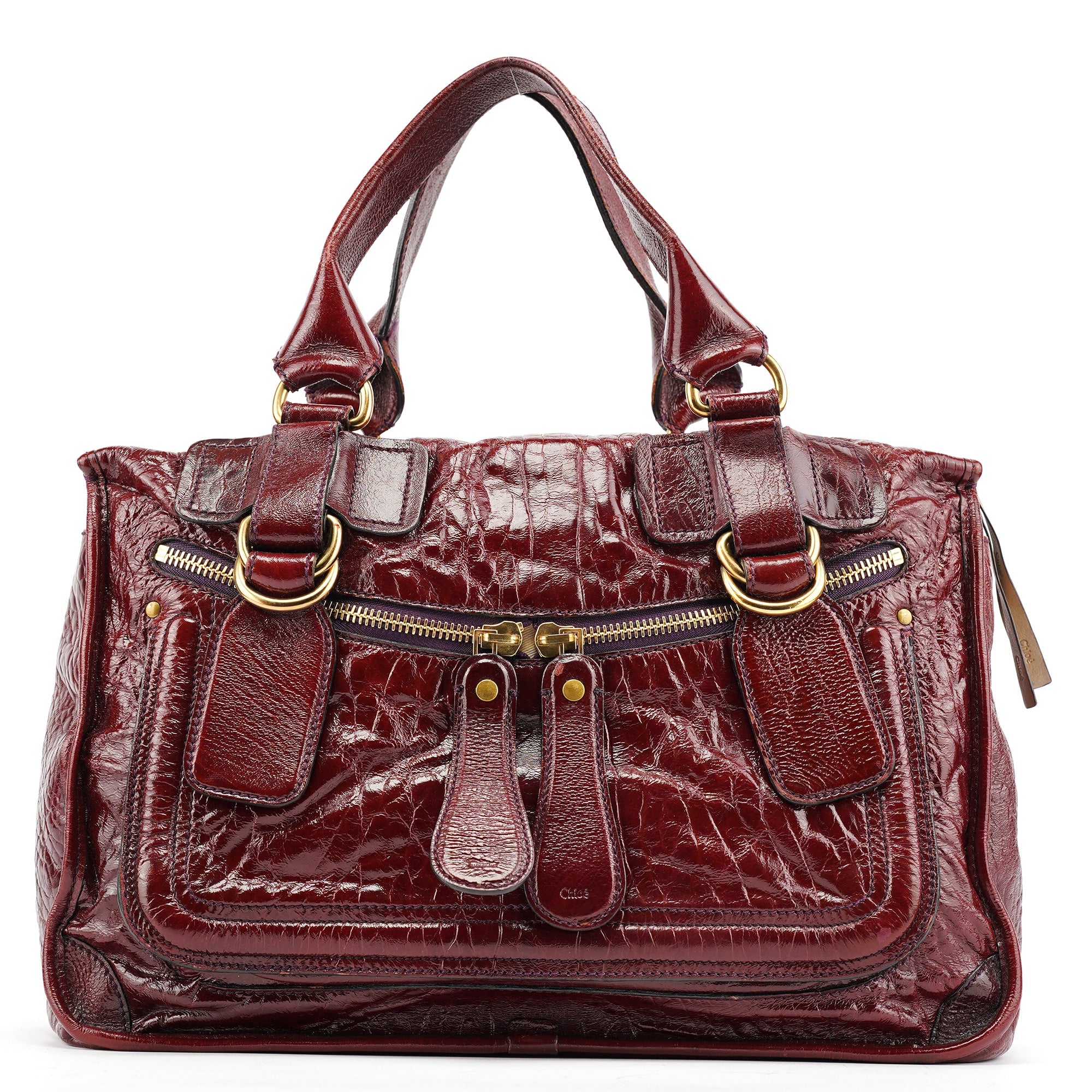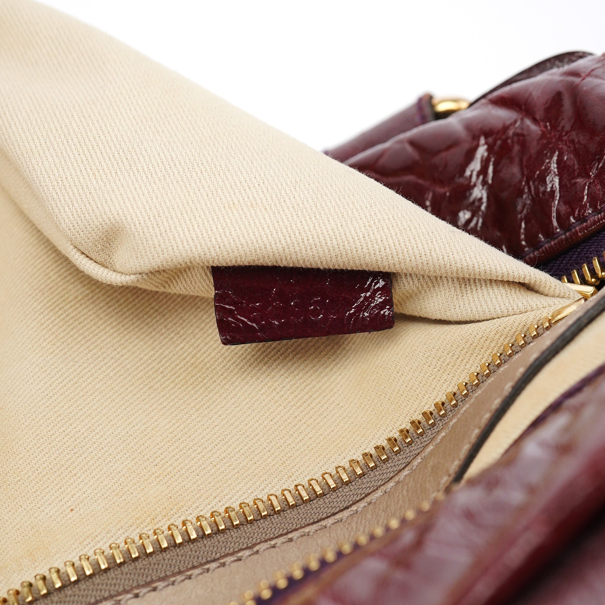 Designed in the early 2000s by Phoebe Philo, this vintage Chloé Bay showcases the model's distinctive architectural pocket detailing in luxurious burgundy patent leather with a high-gloss crackled finish. The bag features the Bay's signature multiple exterior pockets with gold-tone zipper closures, dual top handles, and the quilted construction that made it instantly recognizable. The rich burgundy patent leather adds glamour to the Bay's utilitarian-inspired design.