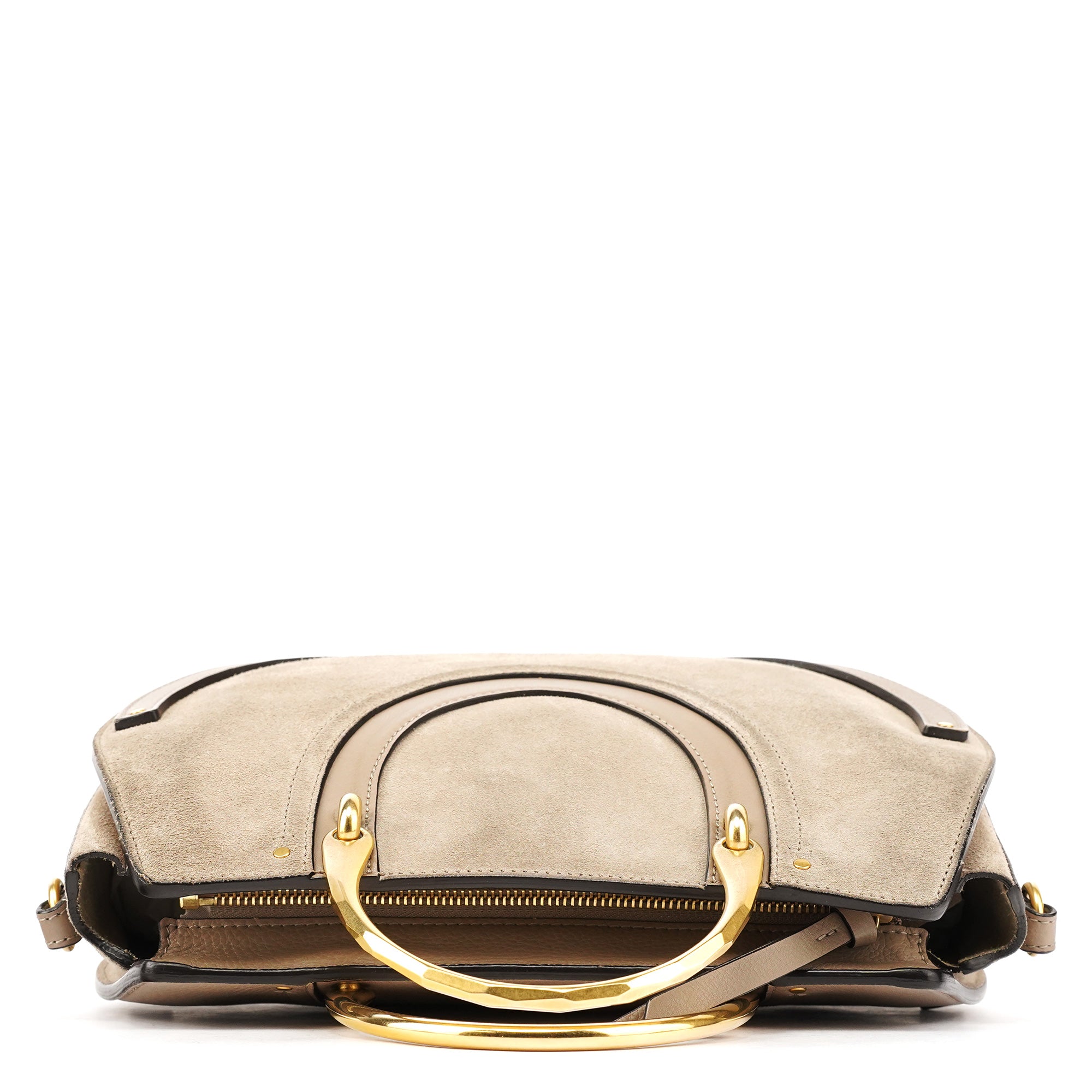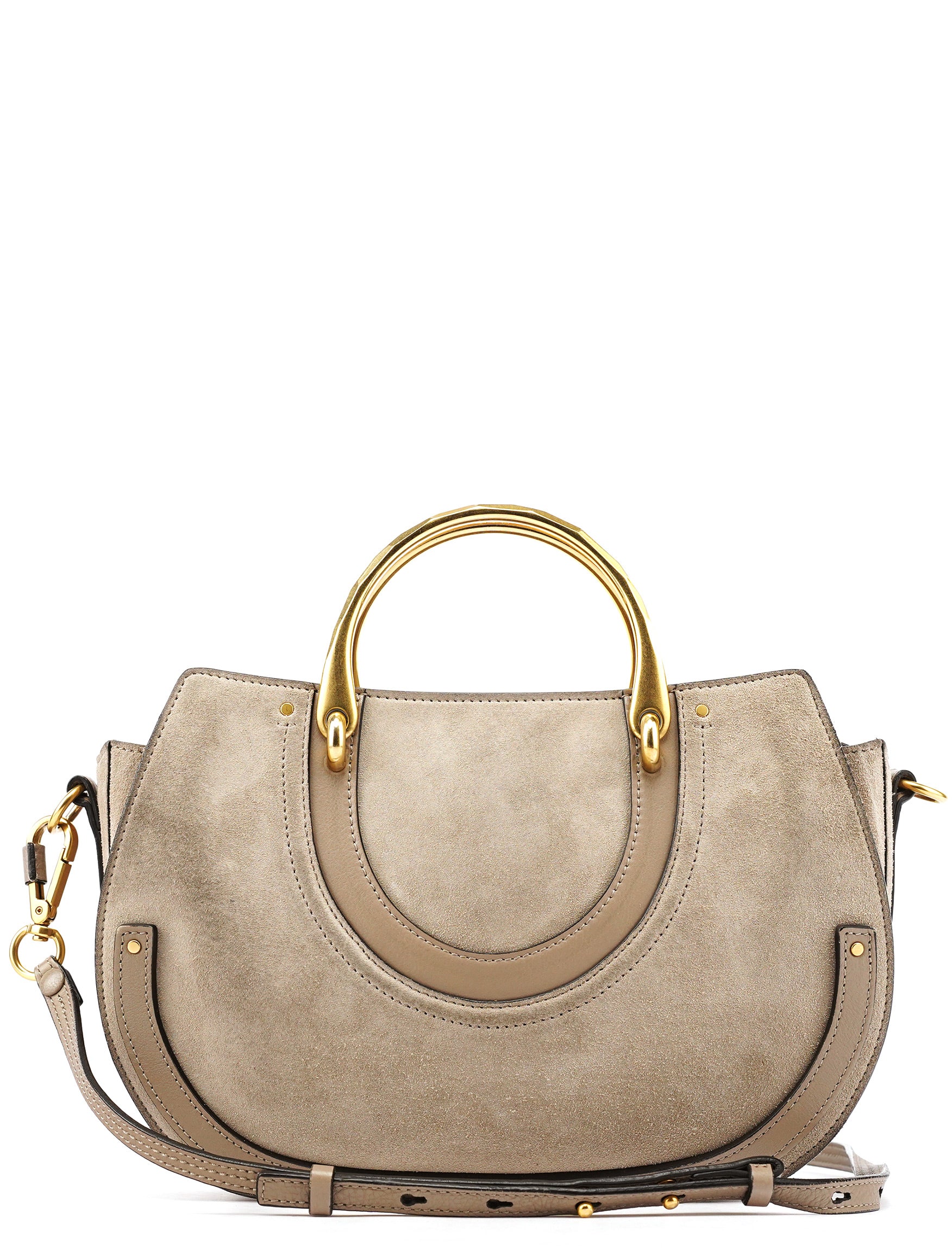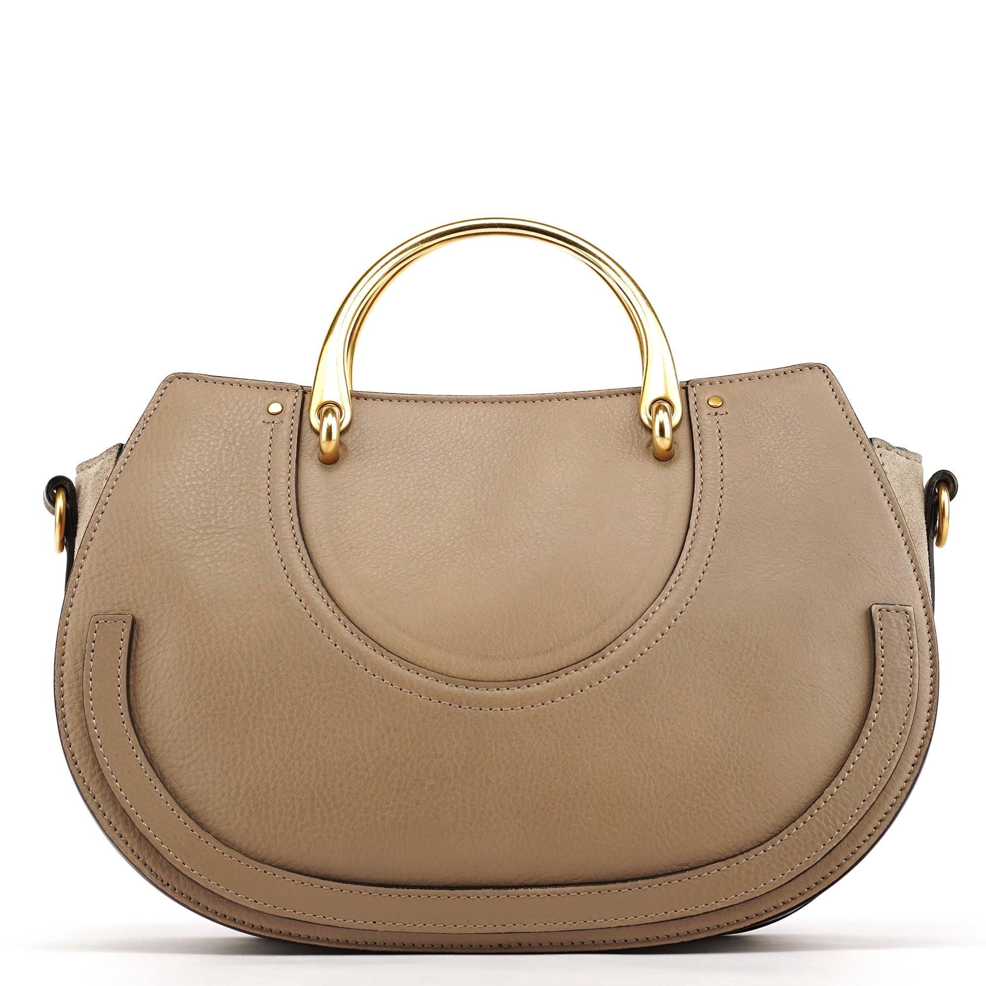 Designed by Clare Waight Keller for Chloé in the late 2010s, the Pixie bag is crafted from taupe grained leather with a half-moon silhouette, gold-tone hardware, and signature metal ring handle. It features a removable shoulder strap, zip closure, and a suede-lined interior with zip pocket.