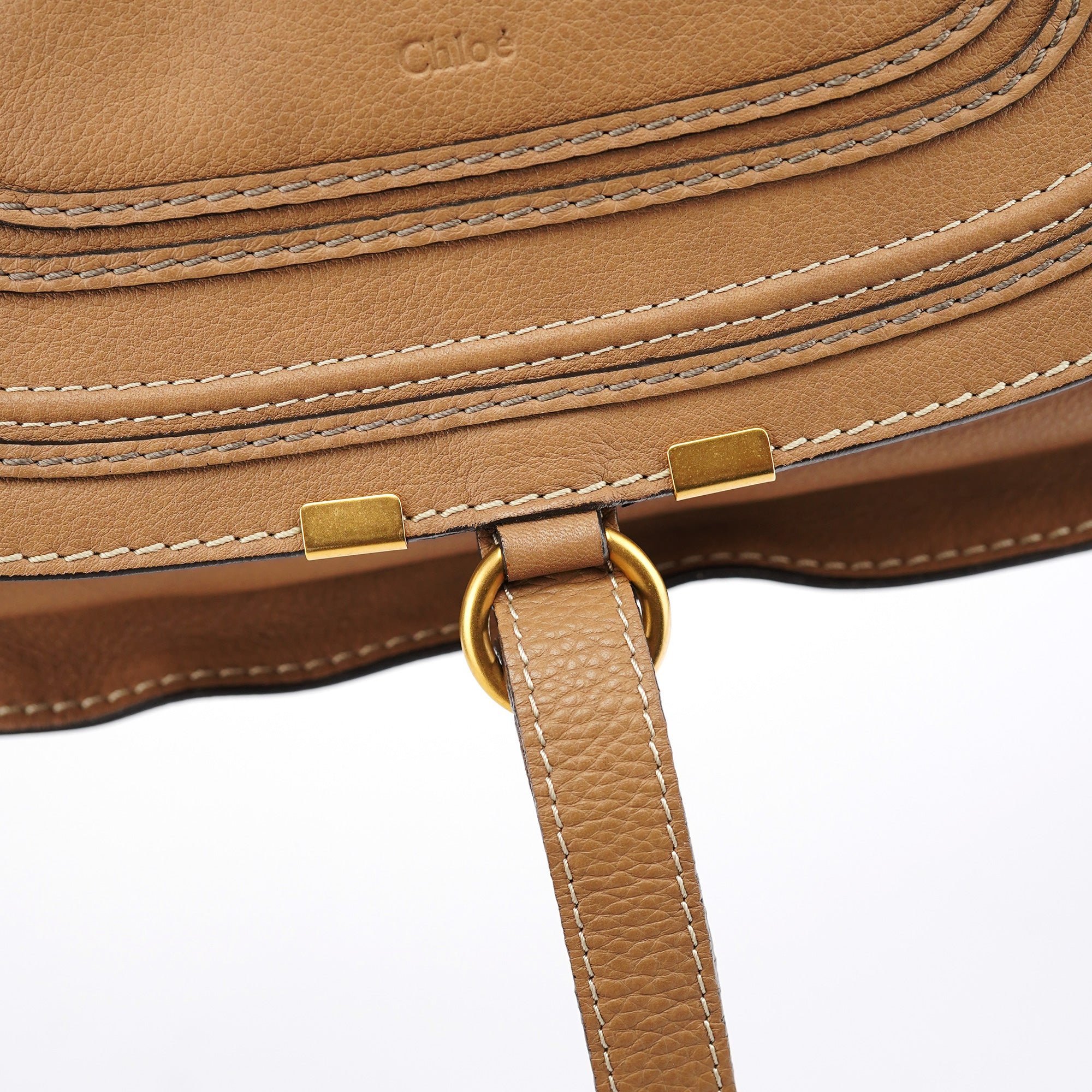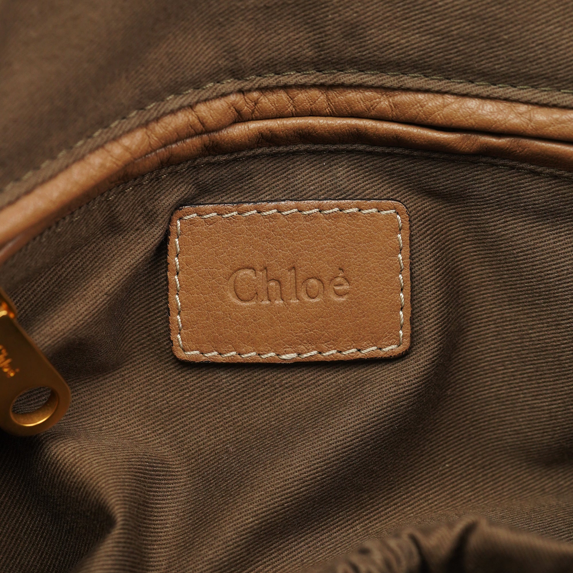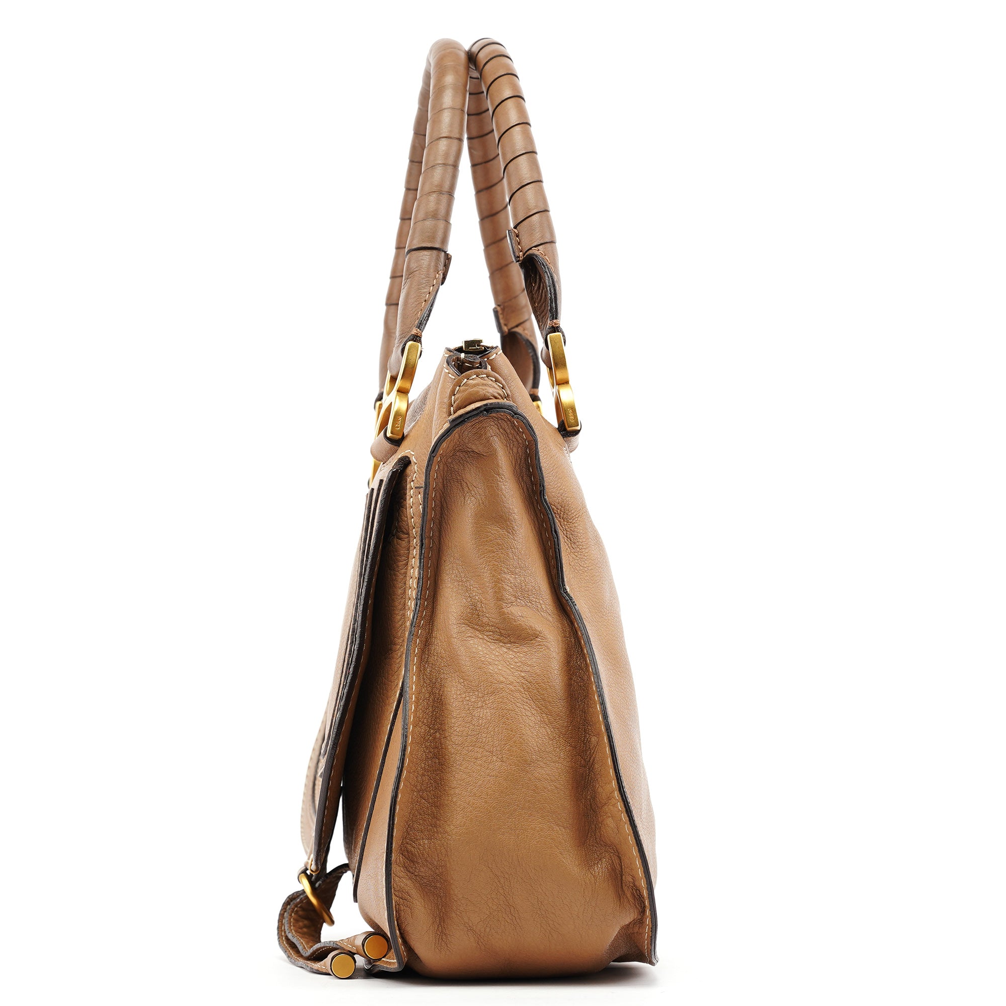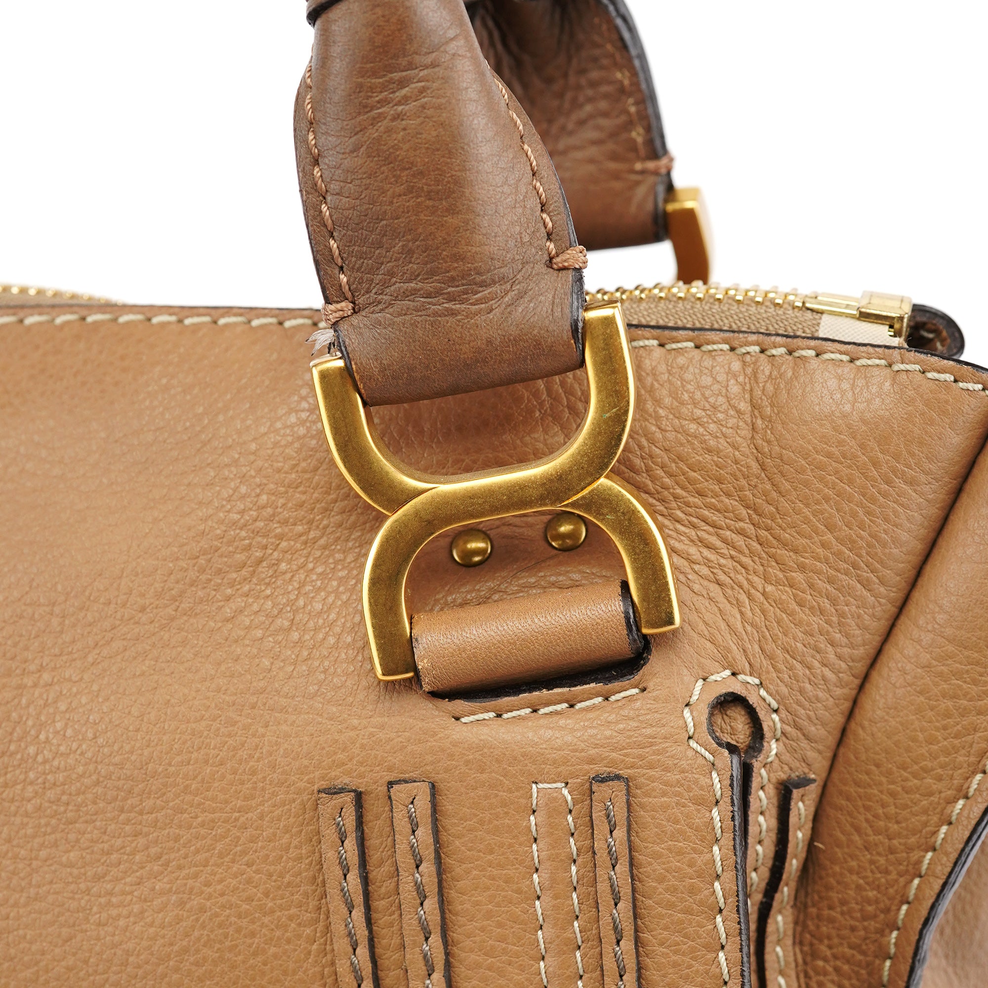 Designed in 2010 by Hannah MacGibbon, this vintage Chloé Marcie handbag features smooth brown leather with the model's distinctive saddle-stitch detailing and signature horseshoe-shaped front pocket. The wrapped leather top handles, gold-tone hardware, and detachable shoulder strap offer versatile carrying options, while the zip-top closure secures the fabric-lined interior, embodying the relaxed sophistication that defined MacGibbon's tenure at Chloé.
