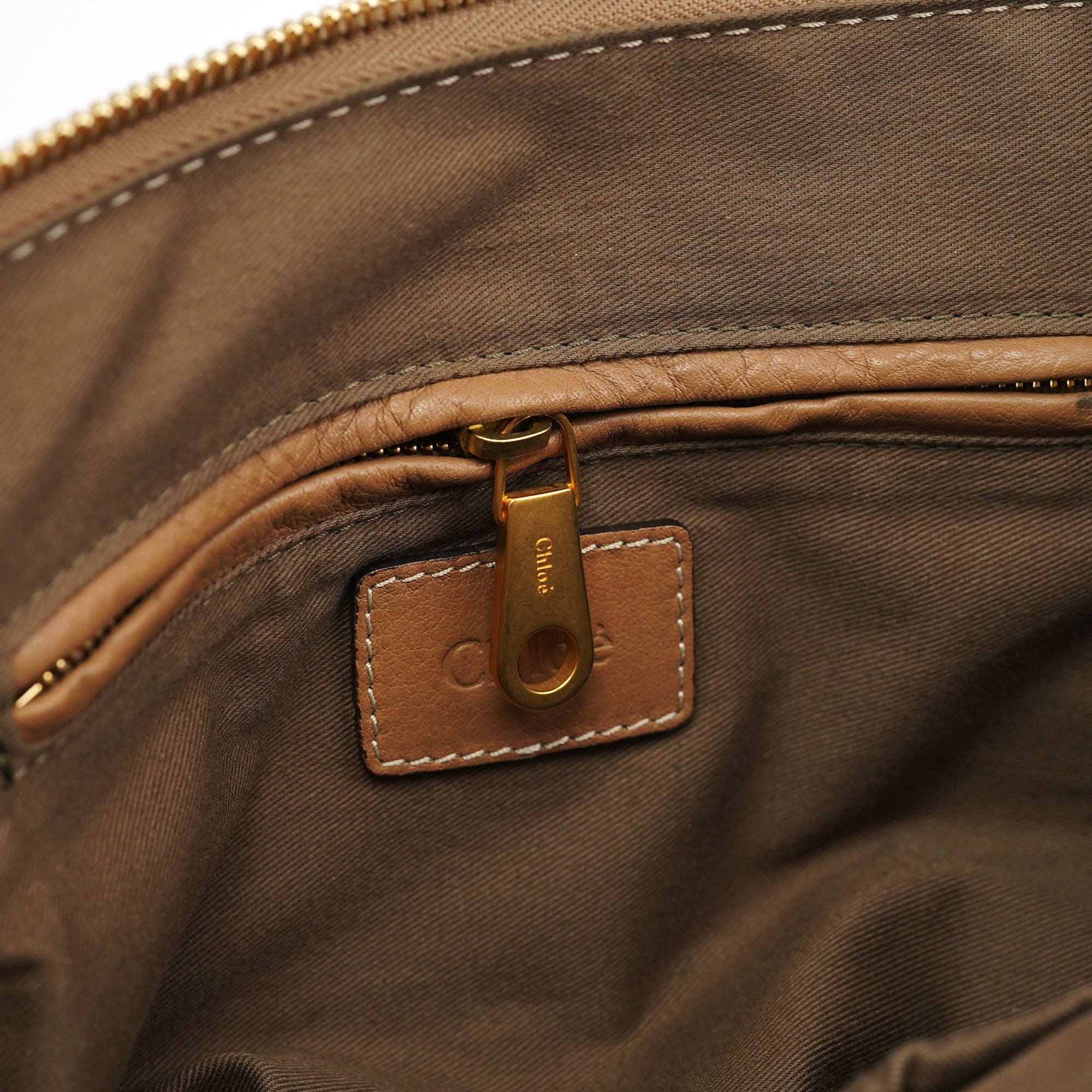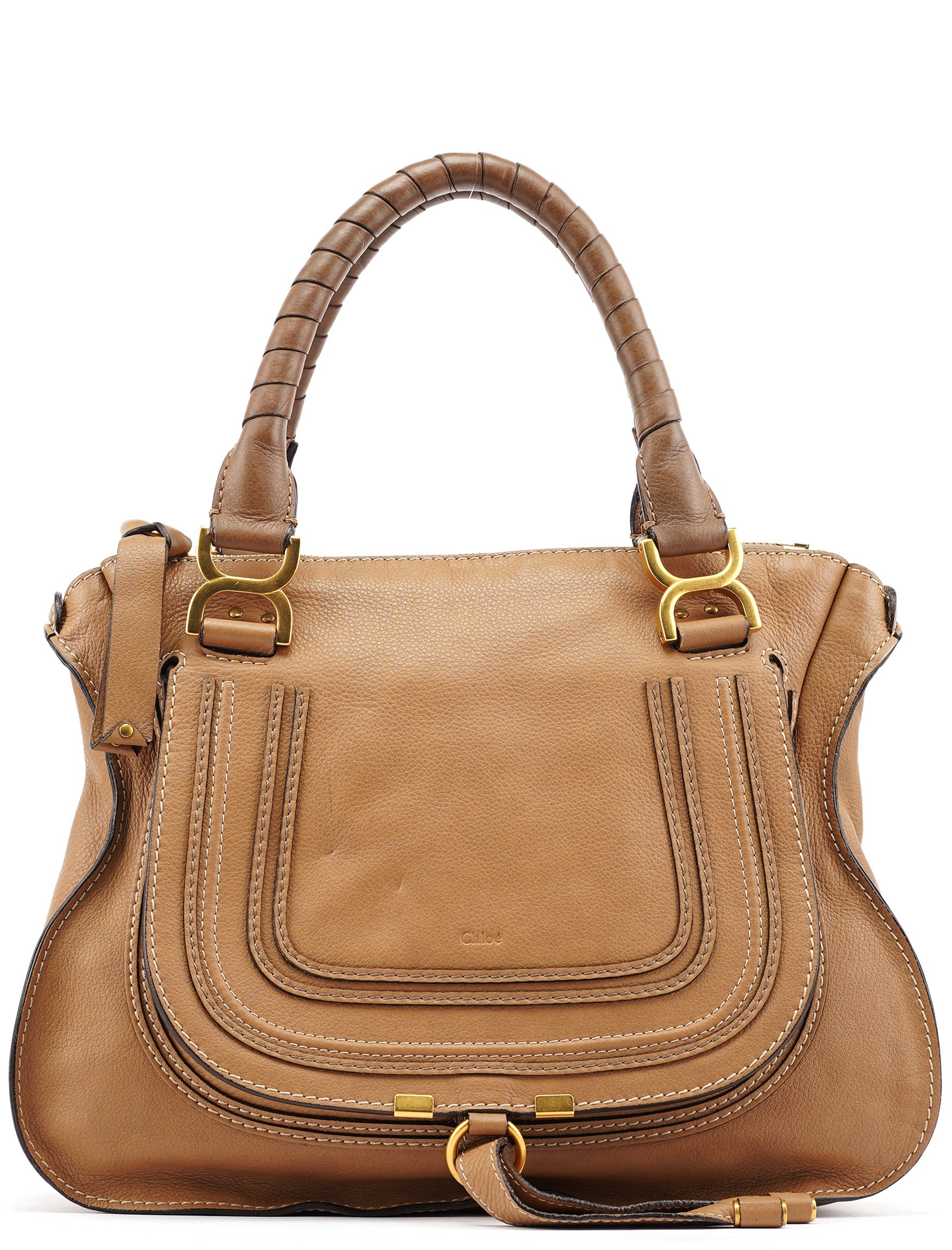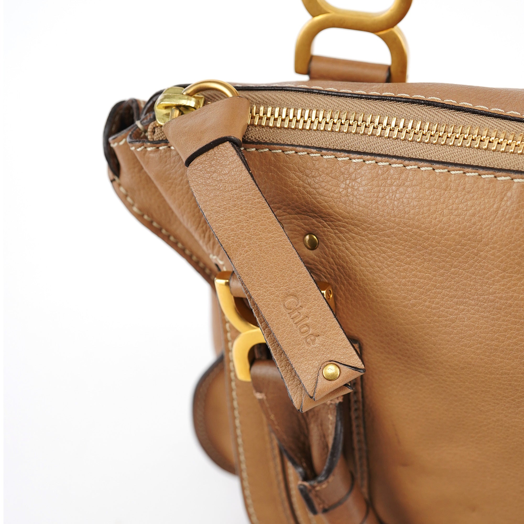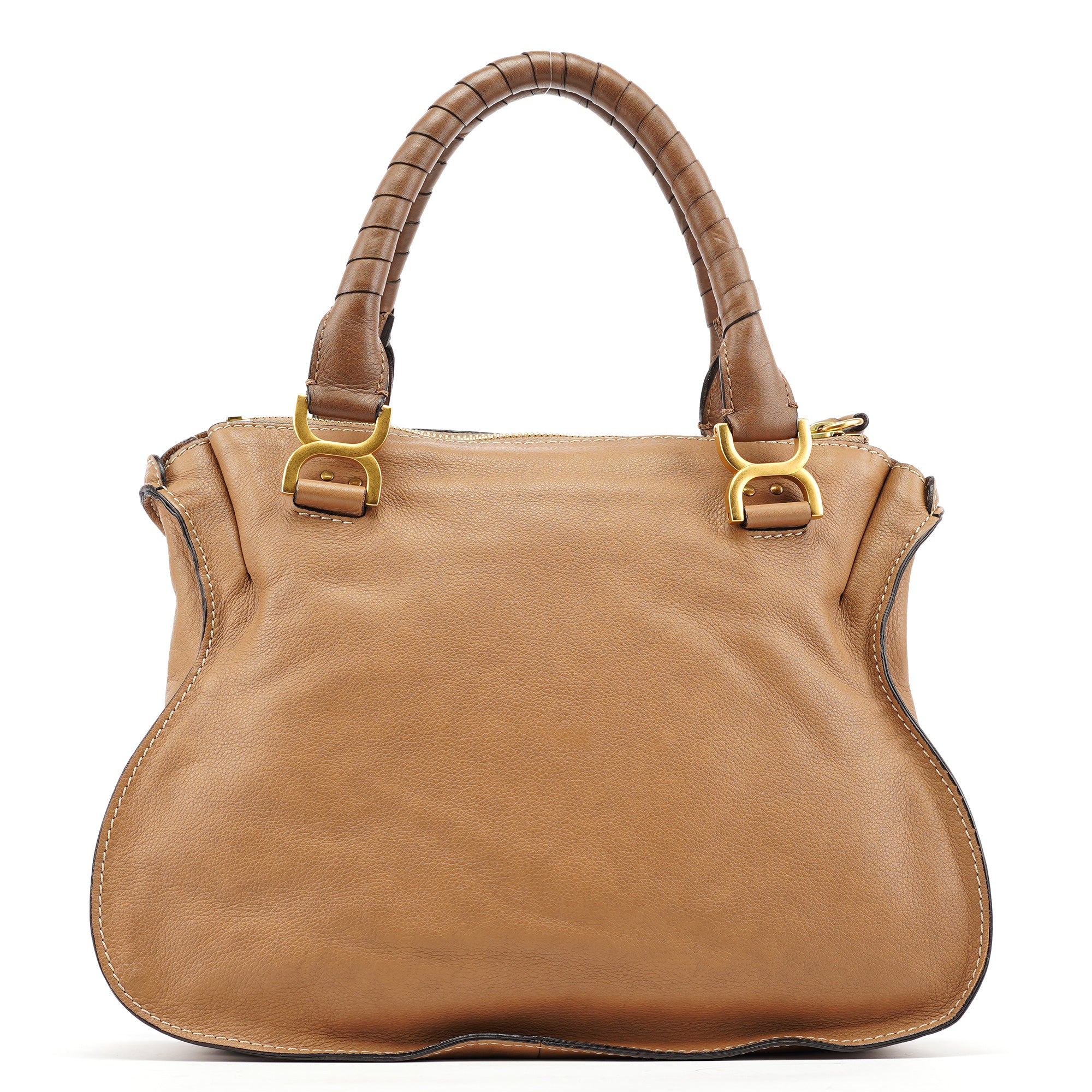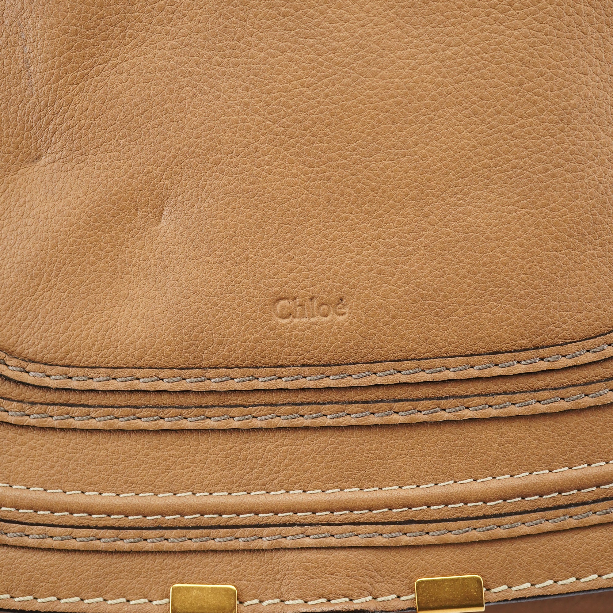 Designed in 2010 by Hannah MacGibbon, this vintage Chloé Marcie handbag features smooth brown leather with the model's distinctive saddle-stitch detailing and signature horseshoe-shaped front pocket. The wrapped leather top handles, gold-tone hardware, and detachable shoulder strap offer versatile carrying options, while the zip-top closure secures the fabric-lined interior, embodying the relaxed sophistication that defined MacGibbon's tenure at Chloé.