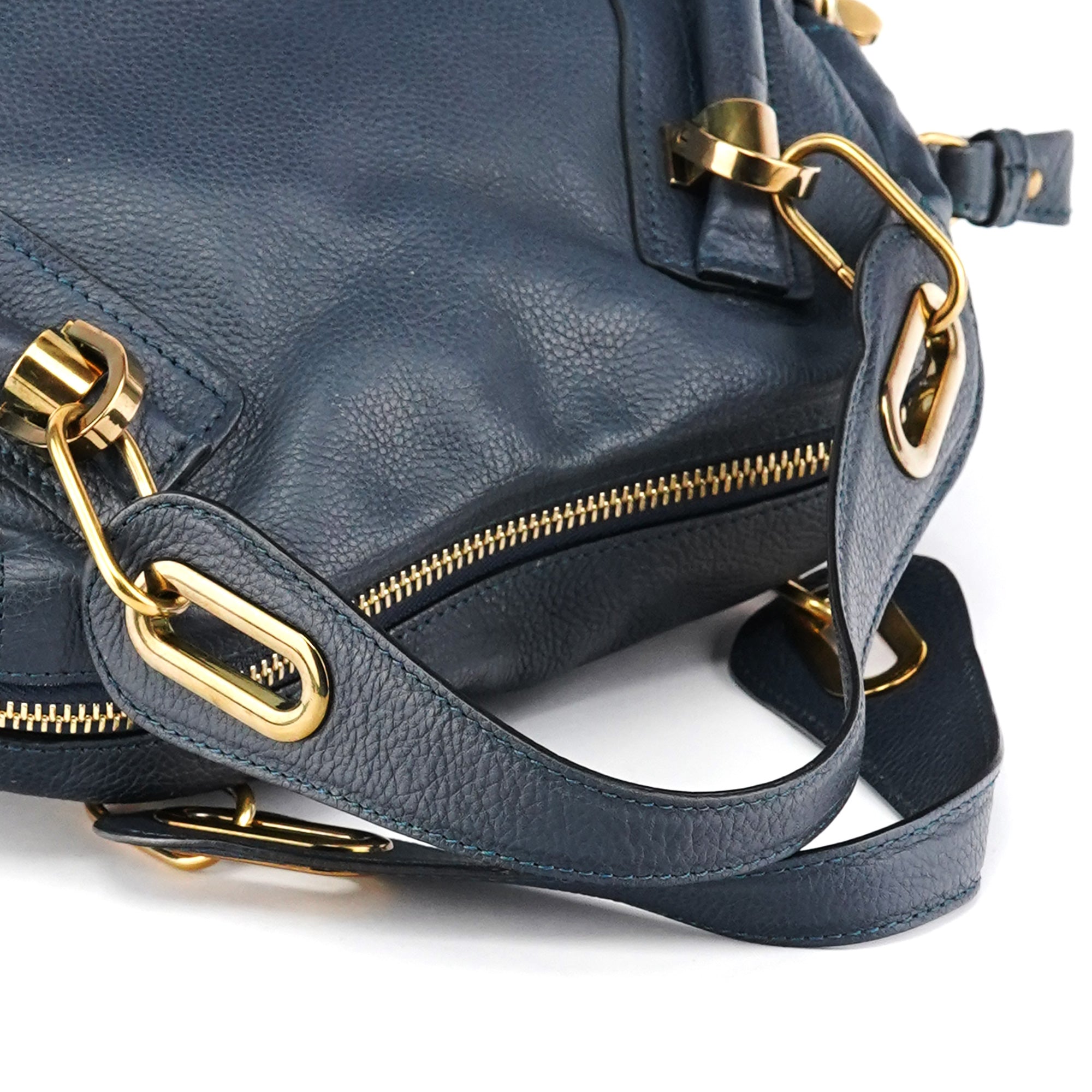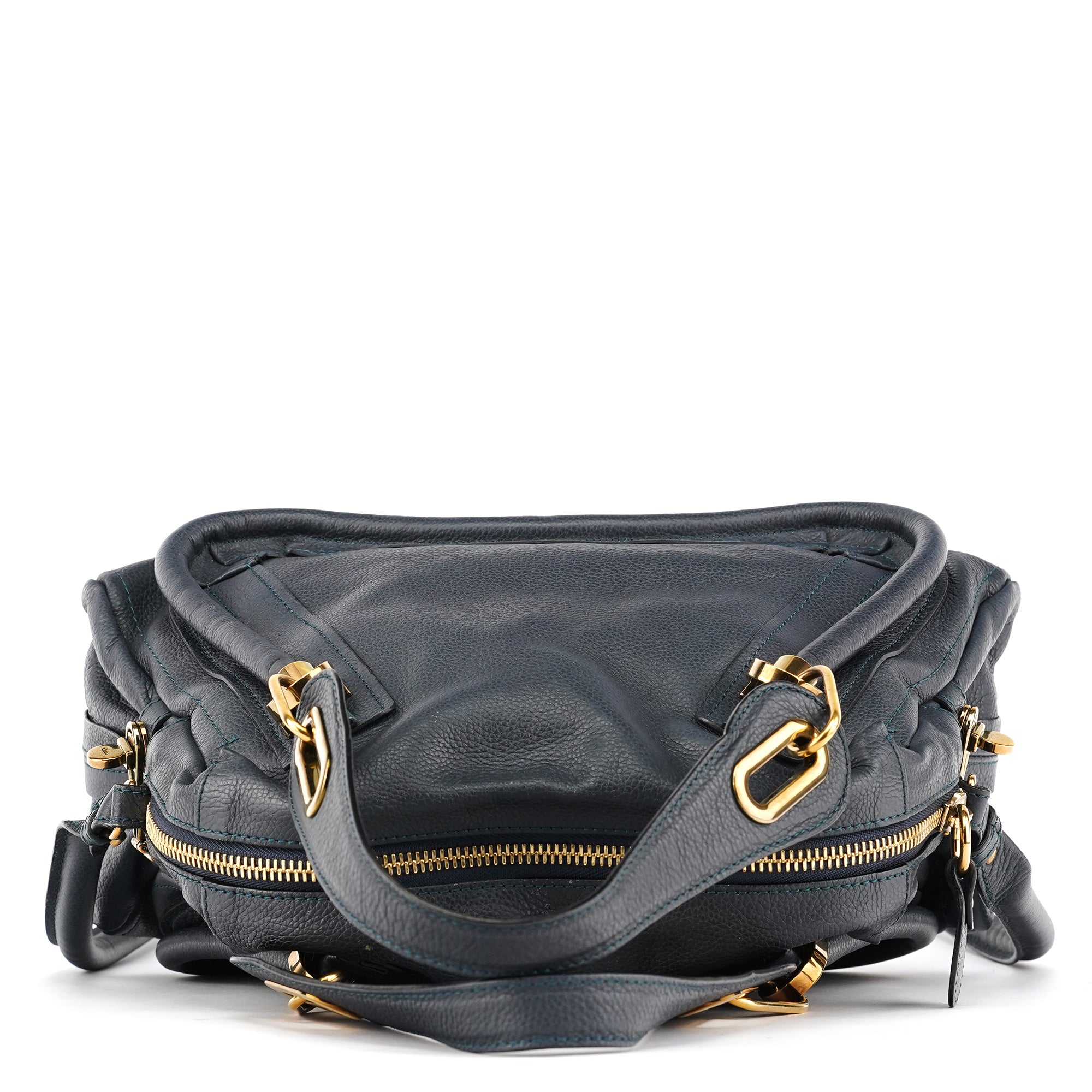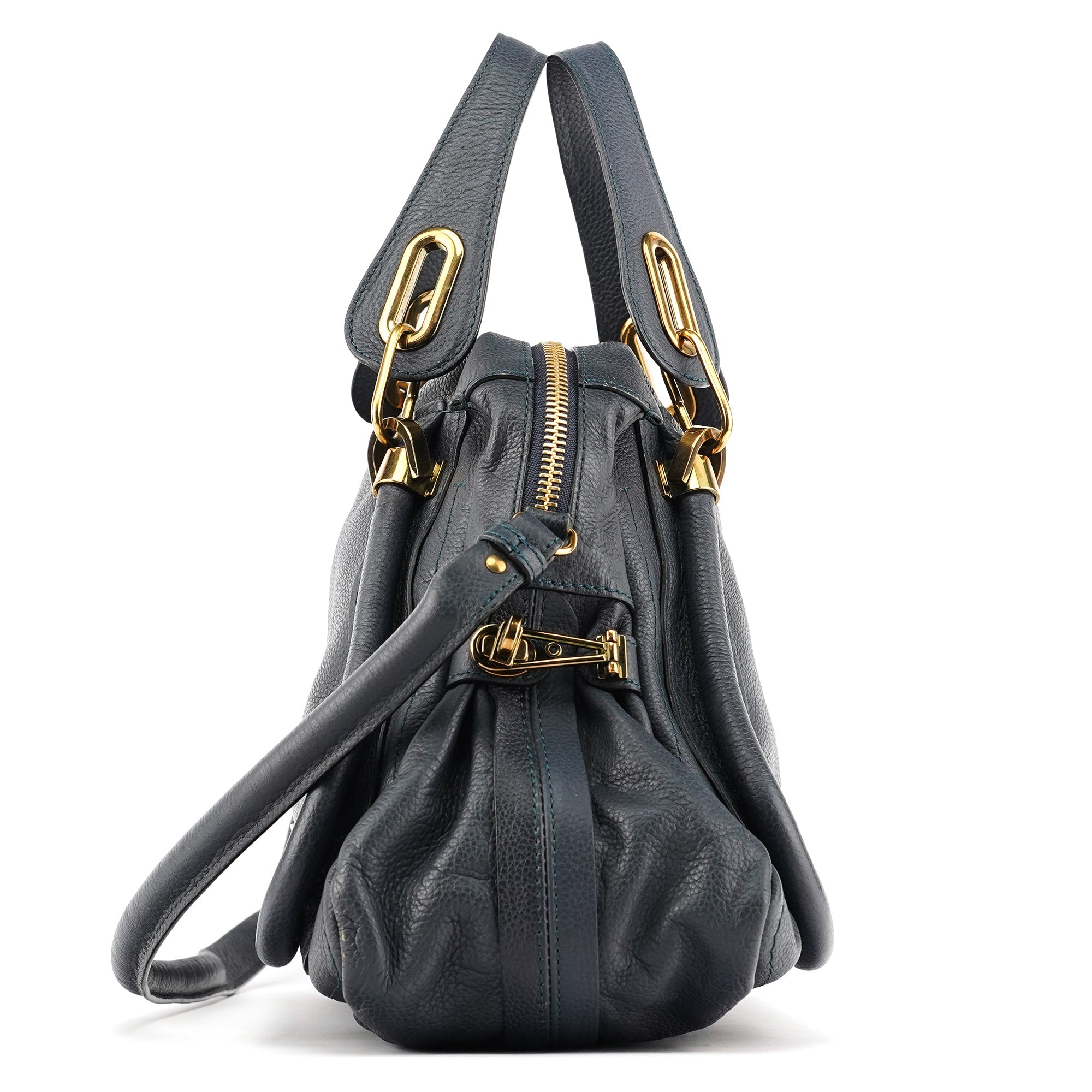 Designed in 2008 by Hannah MacGibbon, this medium Chloé Paraty is crafted from navy grained leather with sculptural gold-tone hardware and tubular side trim. It features double rolled handles, a detachable shoulder strap, a zip-top closure, and a black canvas interior with a zip and slip pocket.