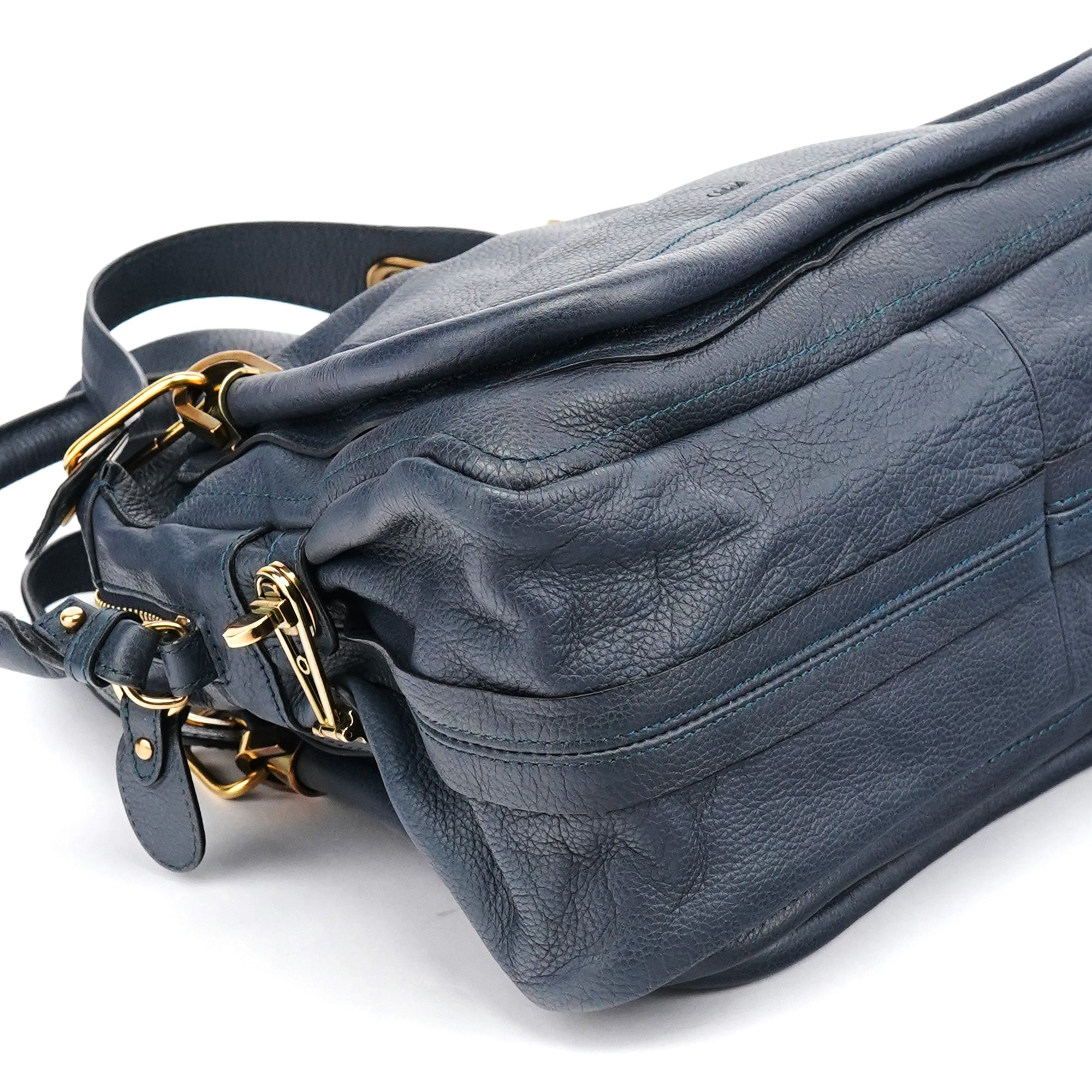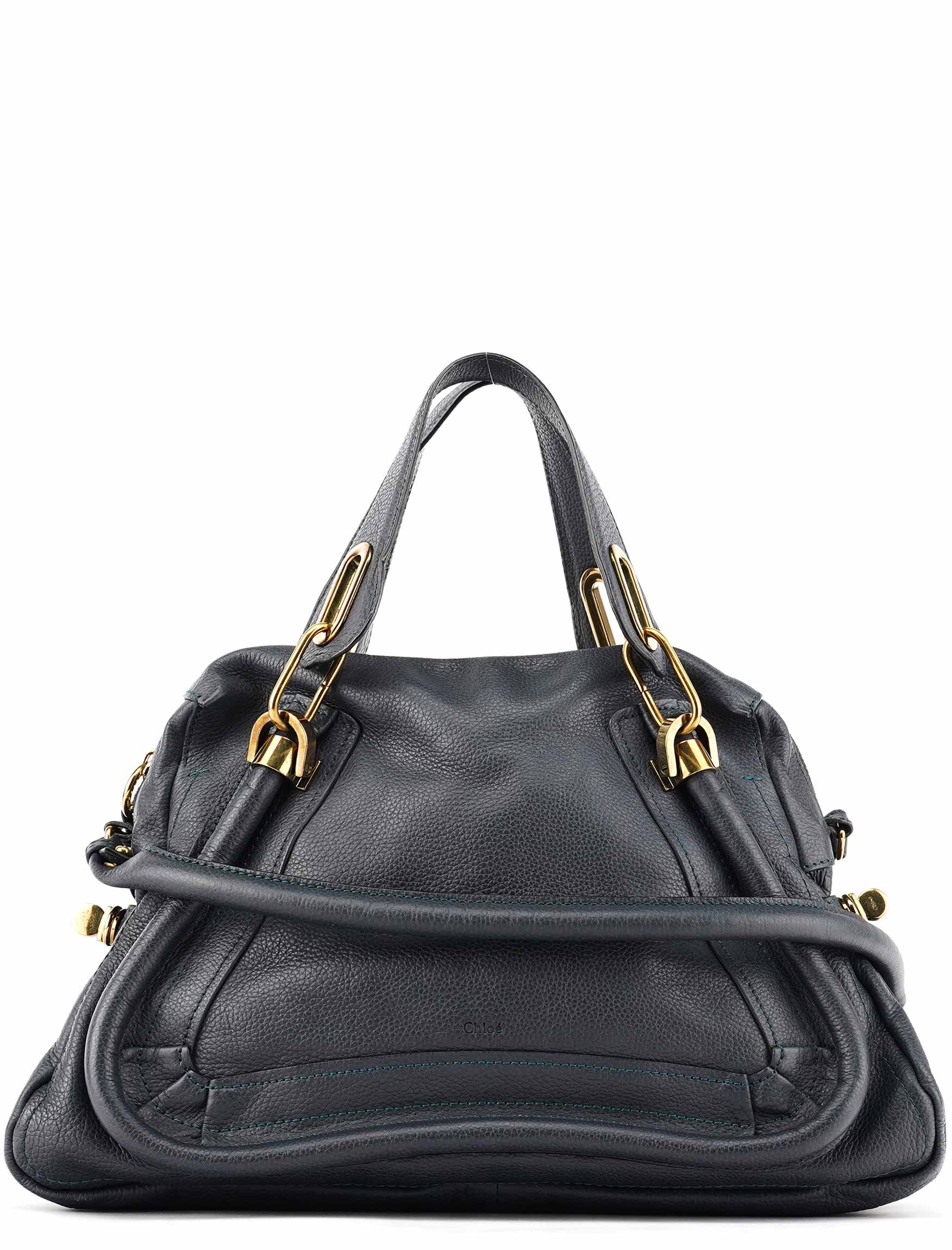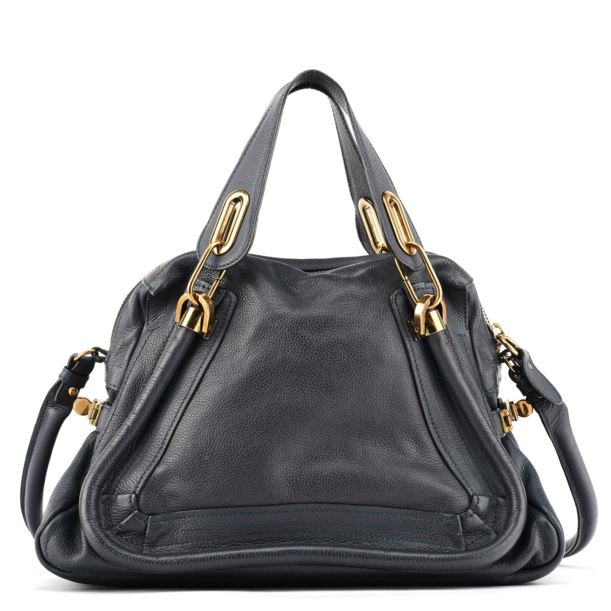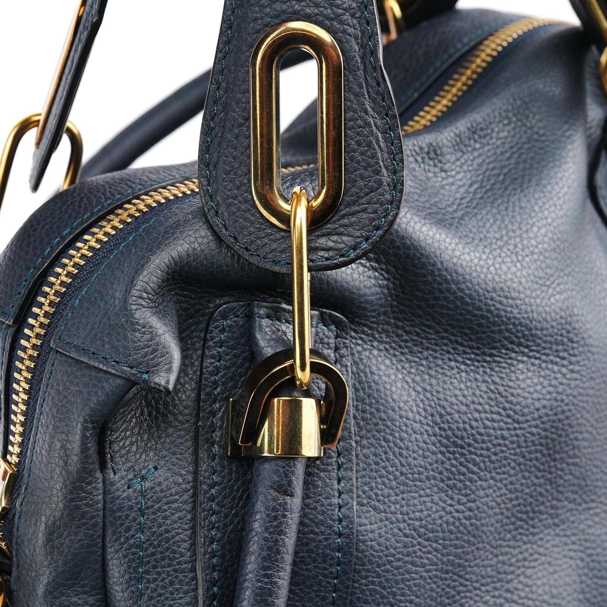 Designed in 2008 by Hannah MacGibbon, this medium Chloé Paraty is crafted from navy grained leather with sculptural gold-tone hardware and tubular side trim. It features double rolled handles, a detachable shoulder strap, a zip-top closure, and a black canvas interior with a zip and slip pocket.