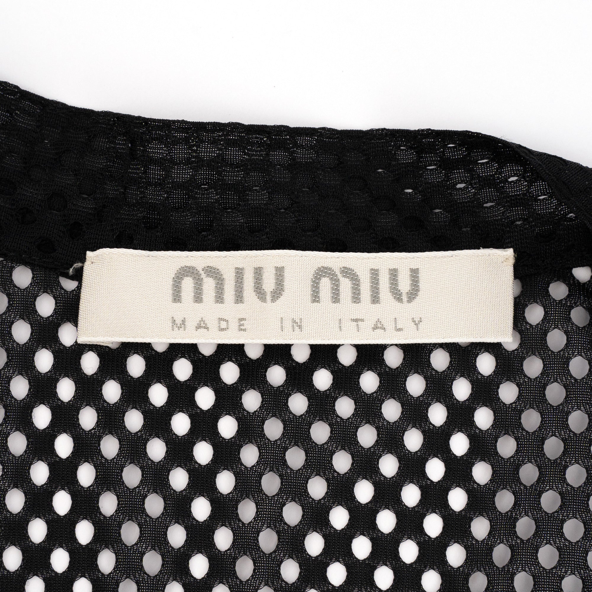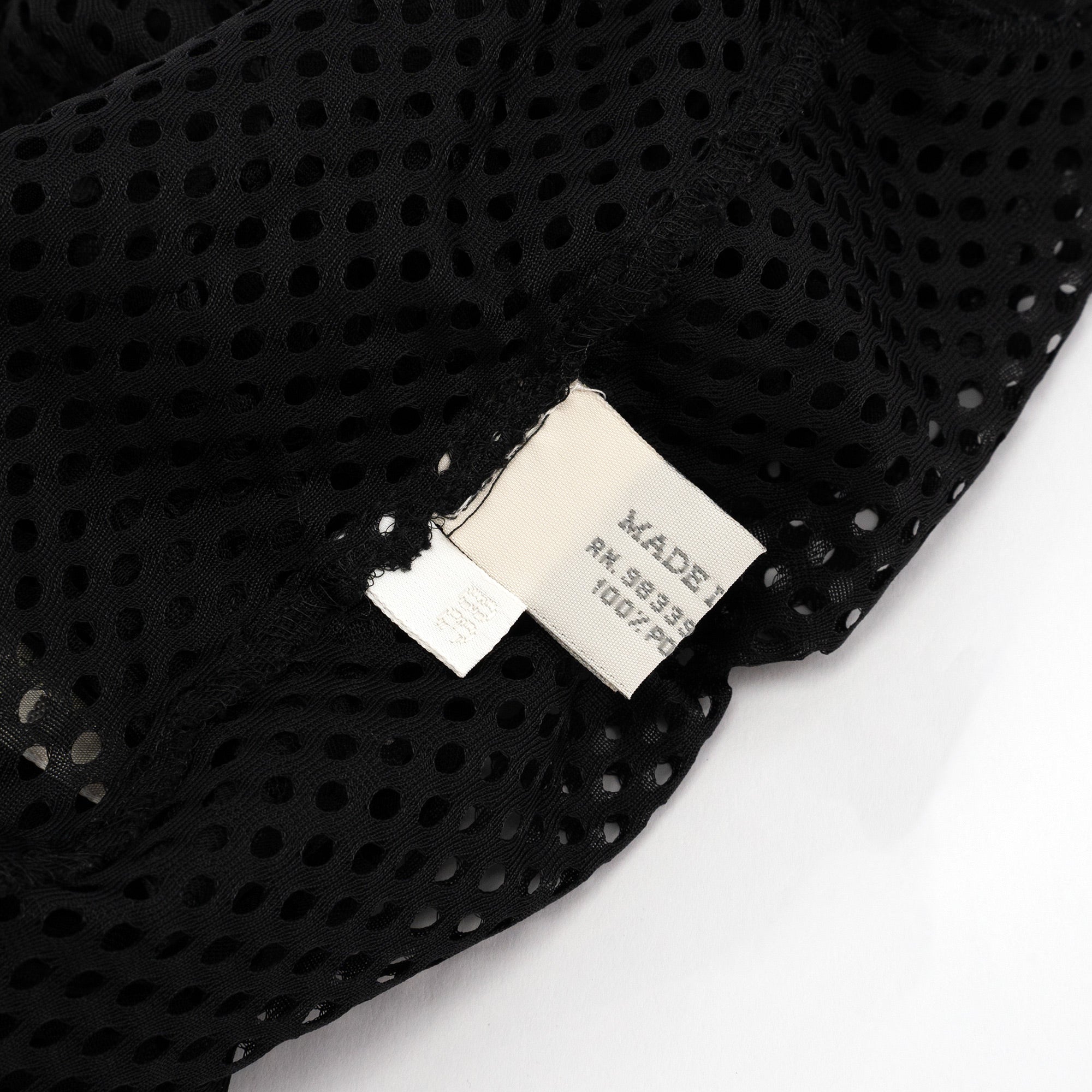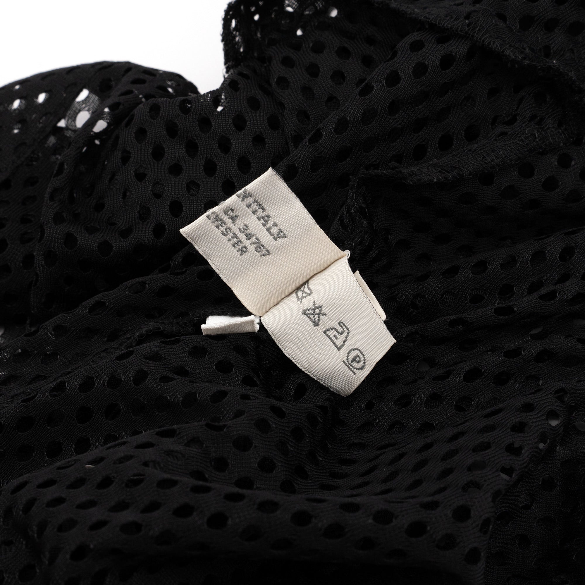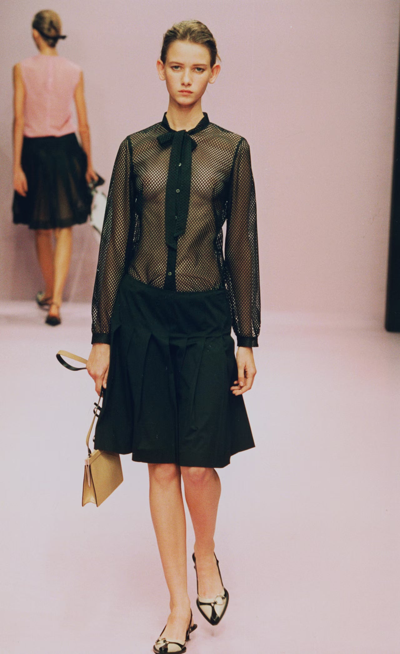 Designed for the Spring 2000 collection by Miuccia Prada, this Miu Miu blouse is crafted from sheer black mesh with a geometric perforated pattern. It features a pussybow neckline, tonal front button closure, and soft gathers at the cuffs and shoulders. A bold yet refined layering piece from one of the label’s most directional early 2000s collections. Worn during the Spring 2000 runway show.
