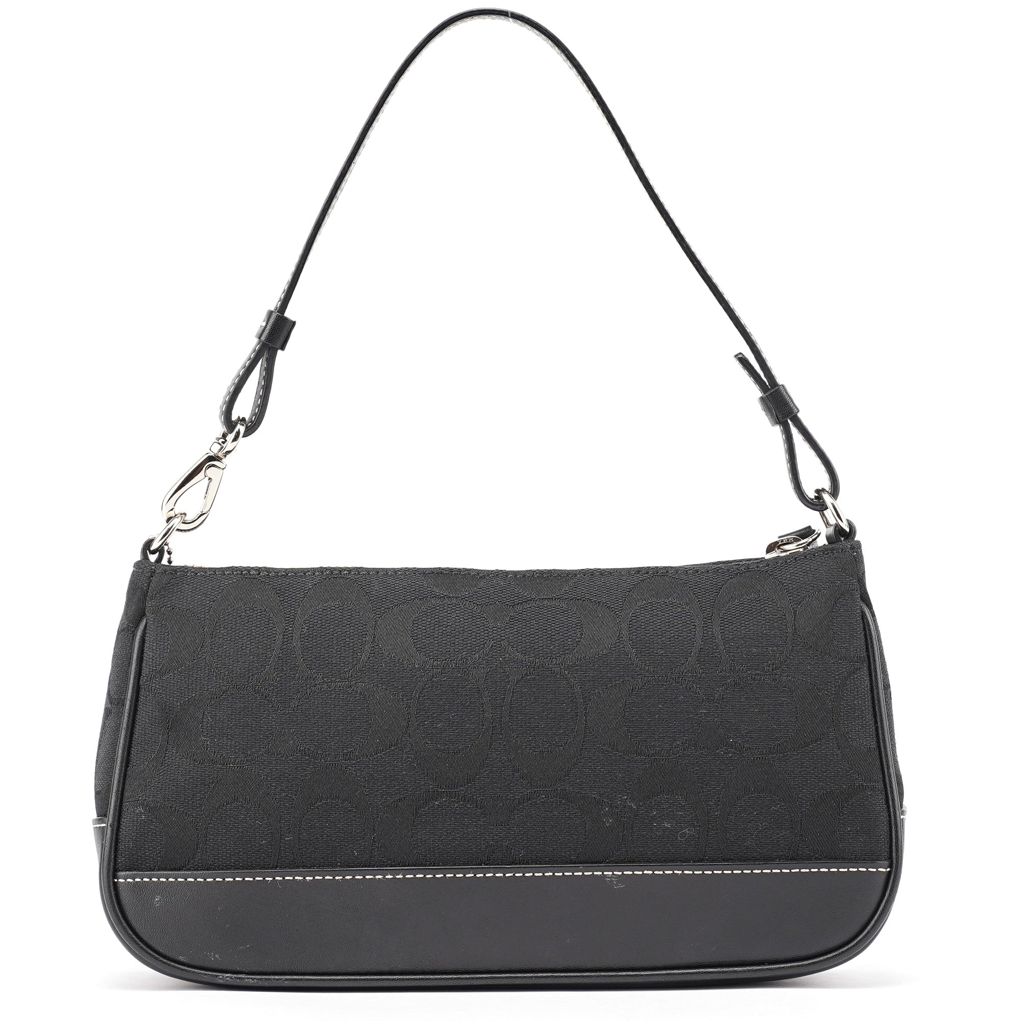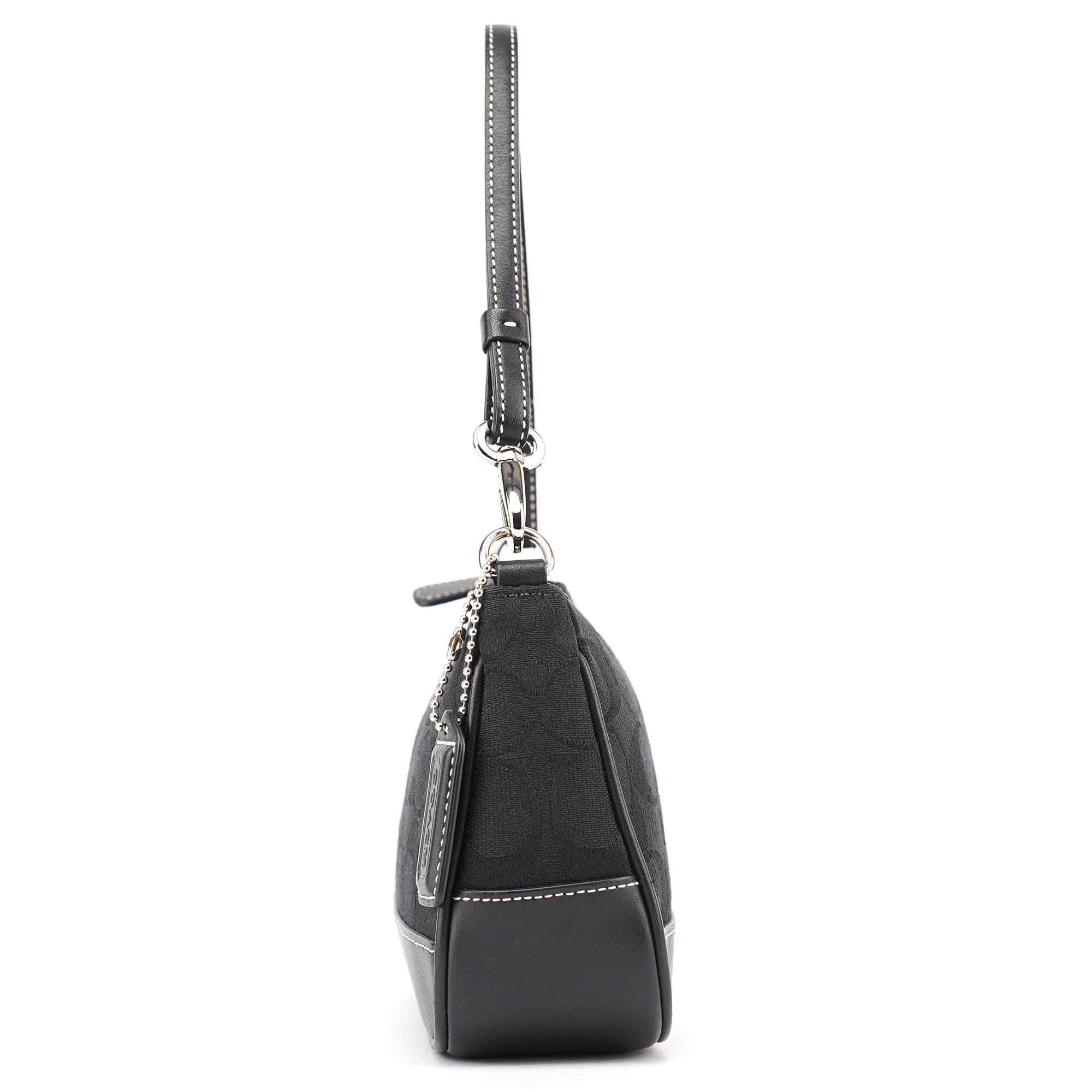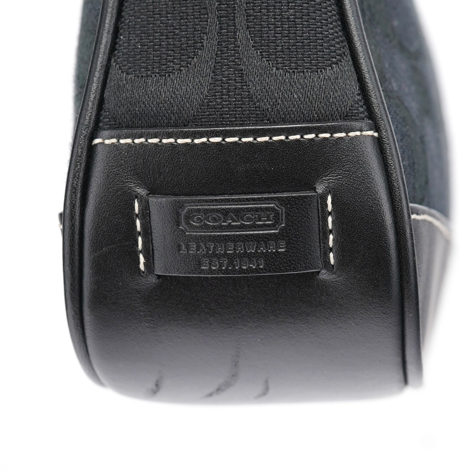 Designed in the early 2000s by Coach, this Demi shoulder bag is crafted in black jacquard canvas with tonal leather trim and silver-tone hardware. Its minimalist silhouette is accented by the signature C pattern, a top zip closure, and a slim leather shoulder strap. The interior is lined in black fabric and includes a single slip pocket for essentials.