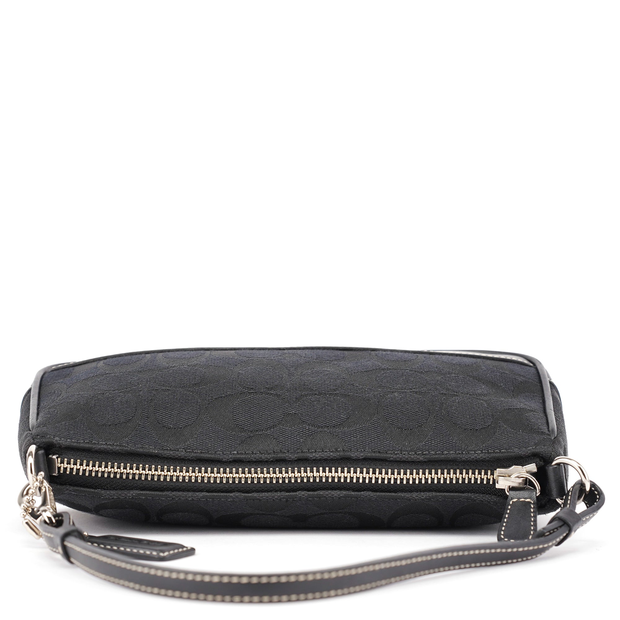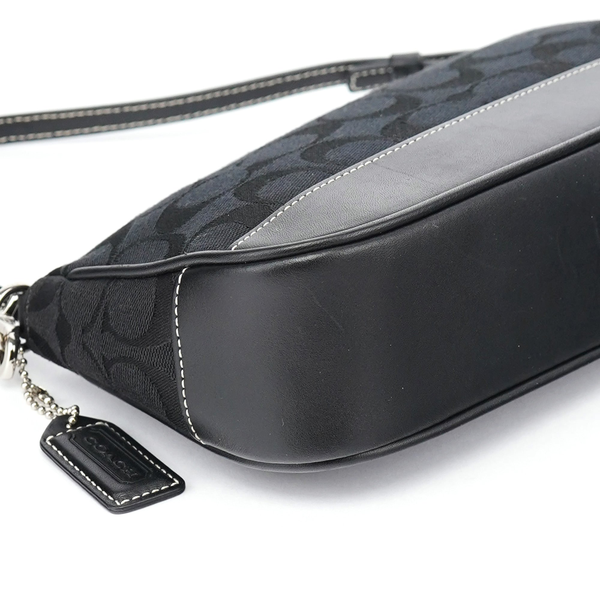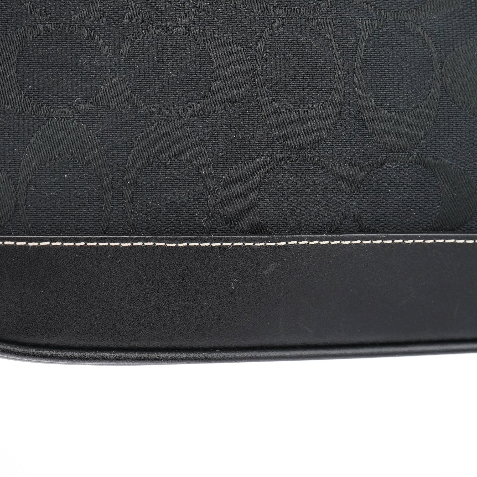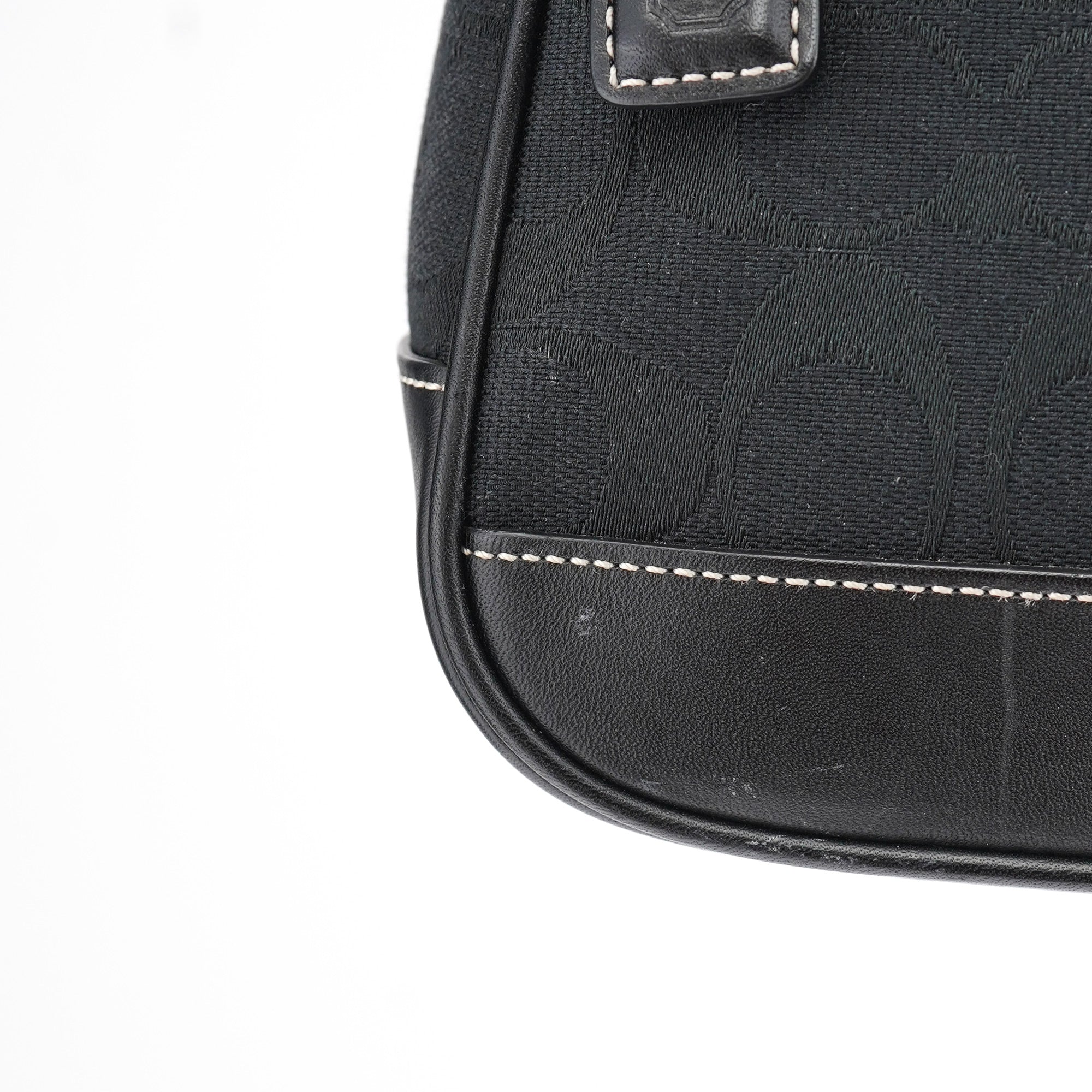 Designed in the early 2000s by Coach, this Demi shoulder bag is crafted in black jacquard canvas with tonal leather trim and silver-tone hardware. Its minimalist silhouette is accented by the signature C pattern, a top zip closure, and a slim leather shoulder strap. The interior is lined in black fabric and includes a single slip pocket for essentials.