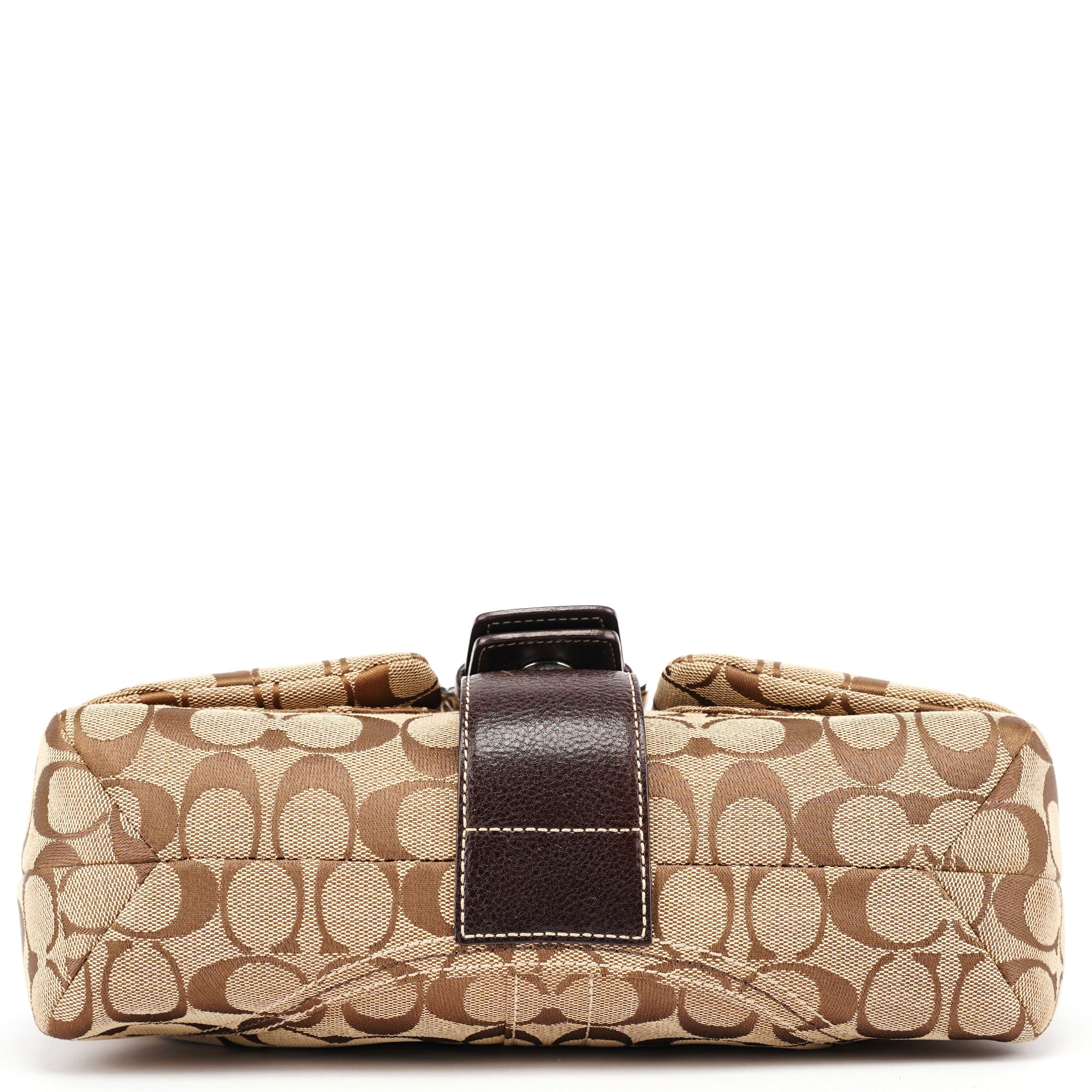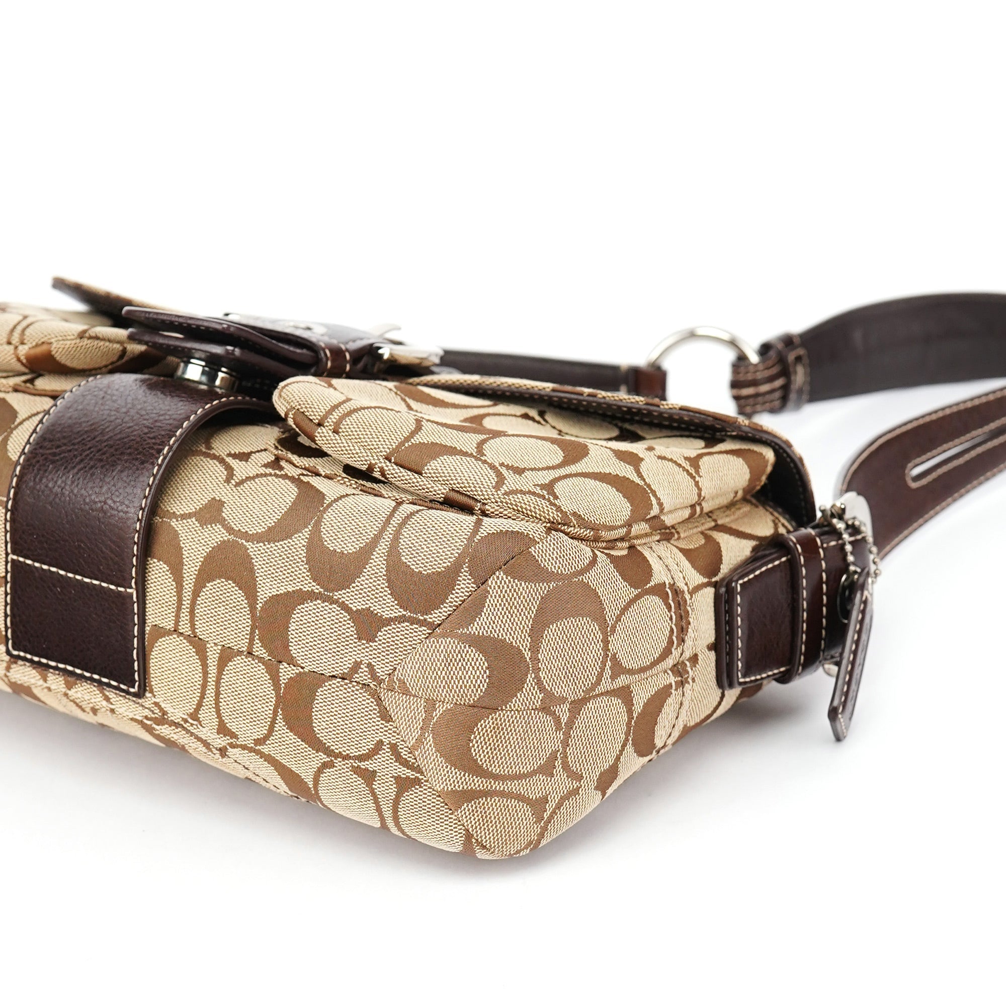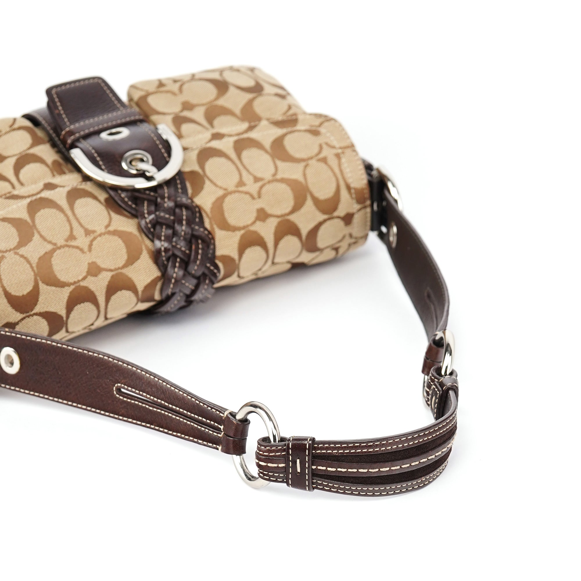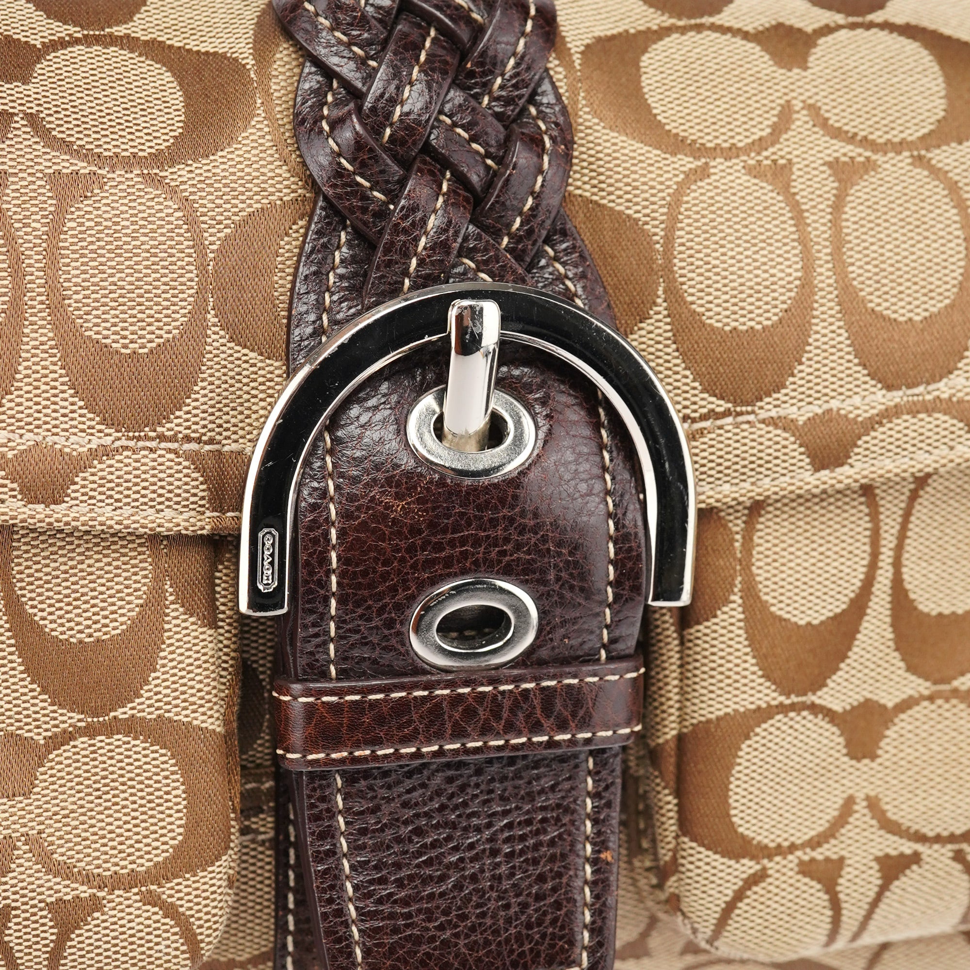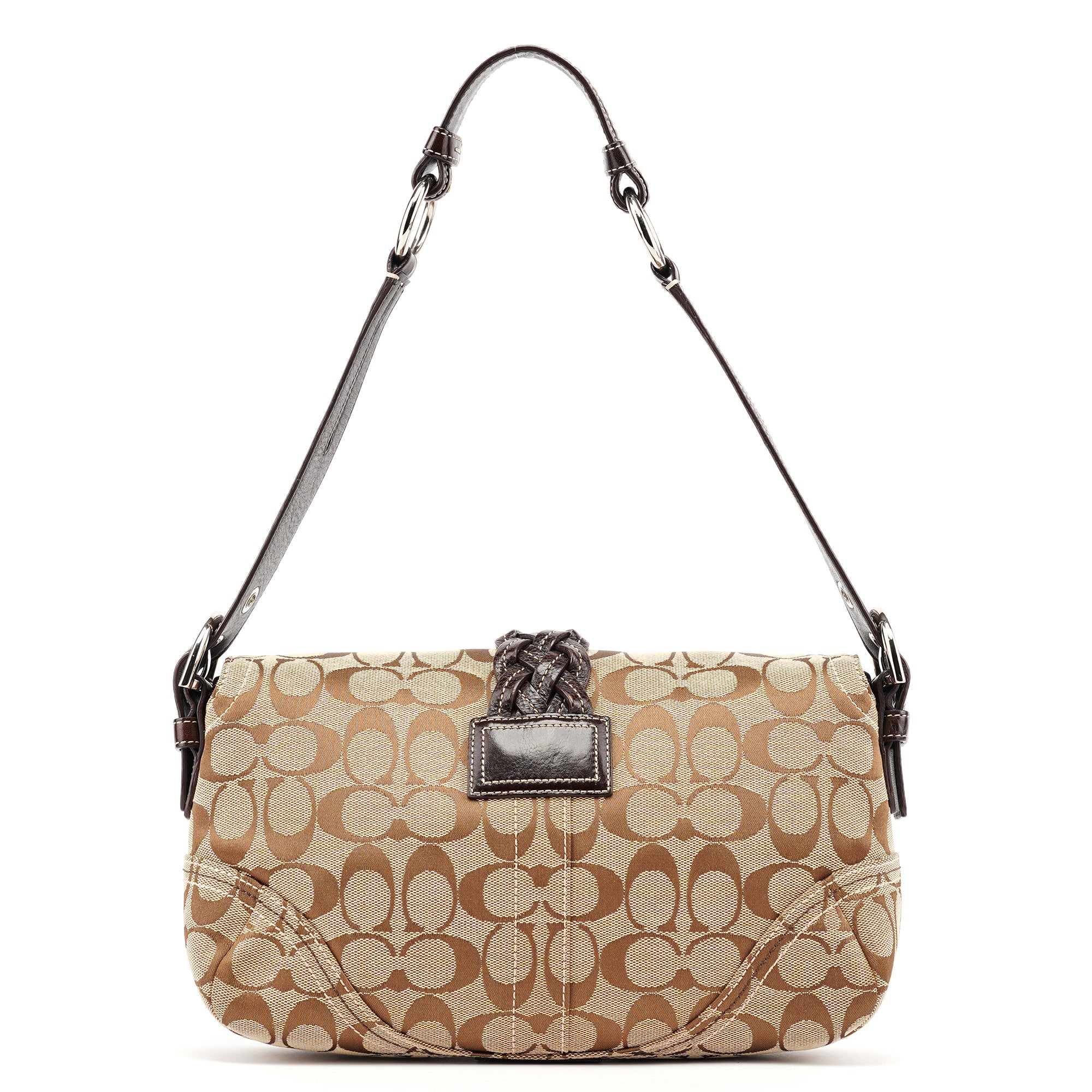 Designed in the early 2000s, this Coach Soho shoulder bag is crafted in signature beige jacquard canvas with chocolate brown leather trim and a braided belt accent. The structured silhouette features a flap closure with buckle detail, silver-tone hardware, and an adjustable shoulder strap. The interior is lined in brown fabric and includes a zip pocket and multifunction slip compartments.