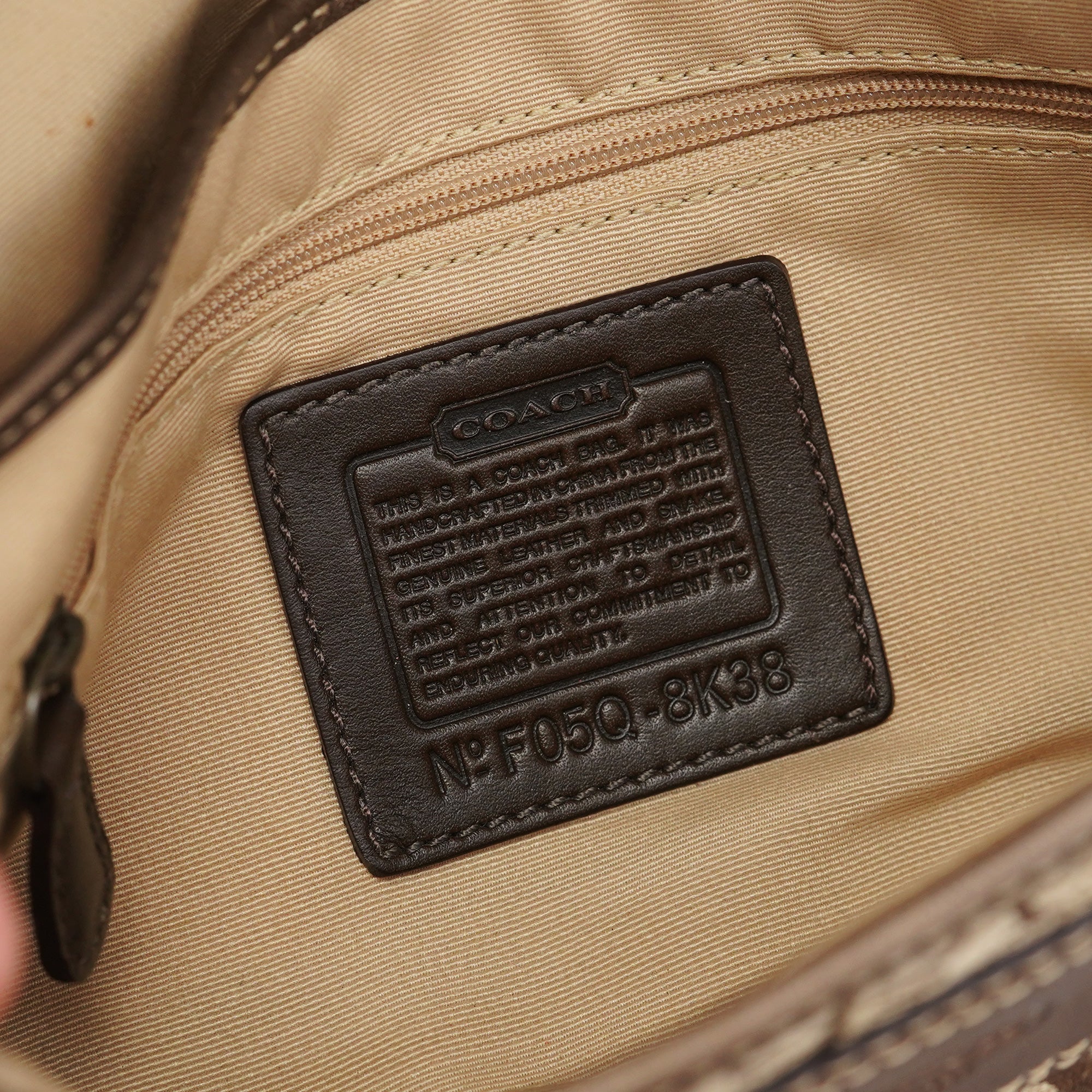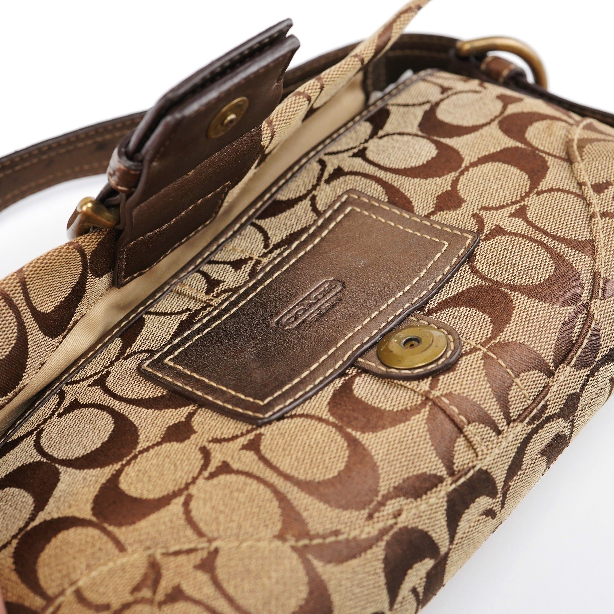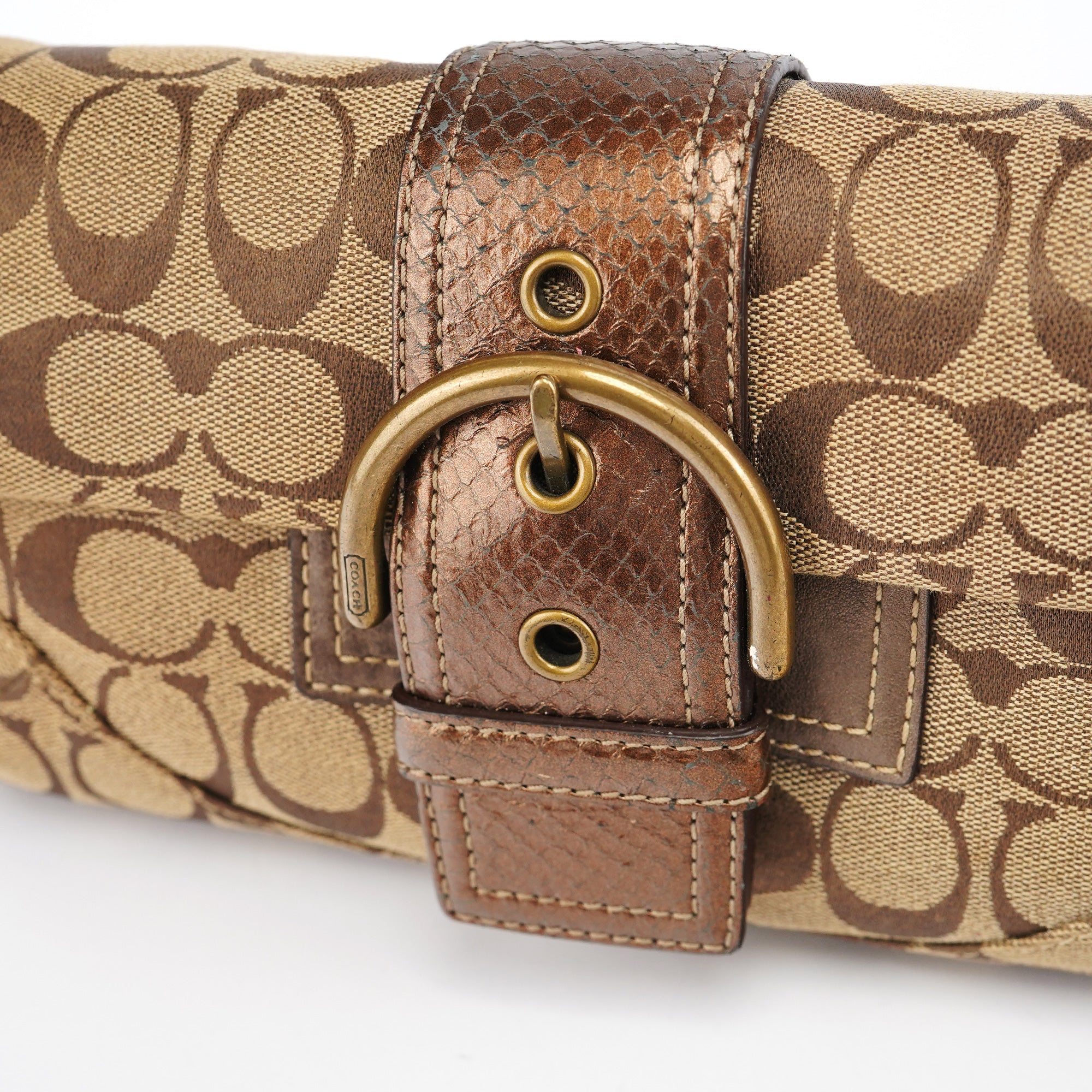Designed in the early 2000s, this Coach Soho shoulder bag is crafted in beige signature canvas with metallic brown python-embossed leather trim. It features a structured flap design with a signature buckle closure, bronze hardware, and an adjustable shoulder strap. The interior is lined in fabric with one zip pocket and one slip pocket.