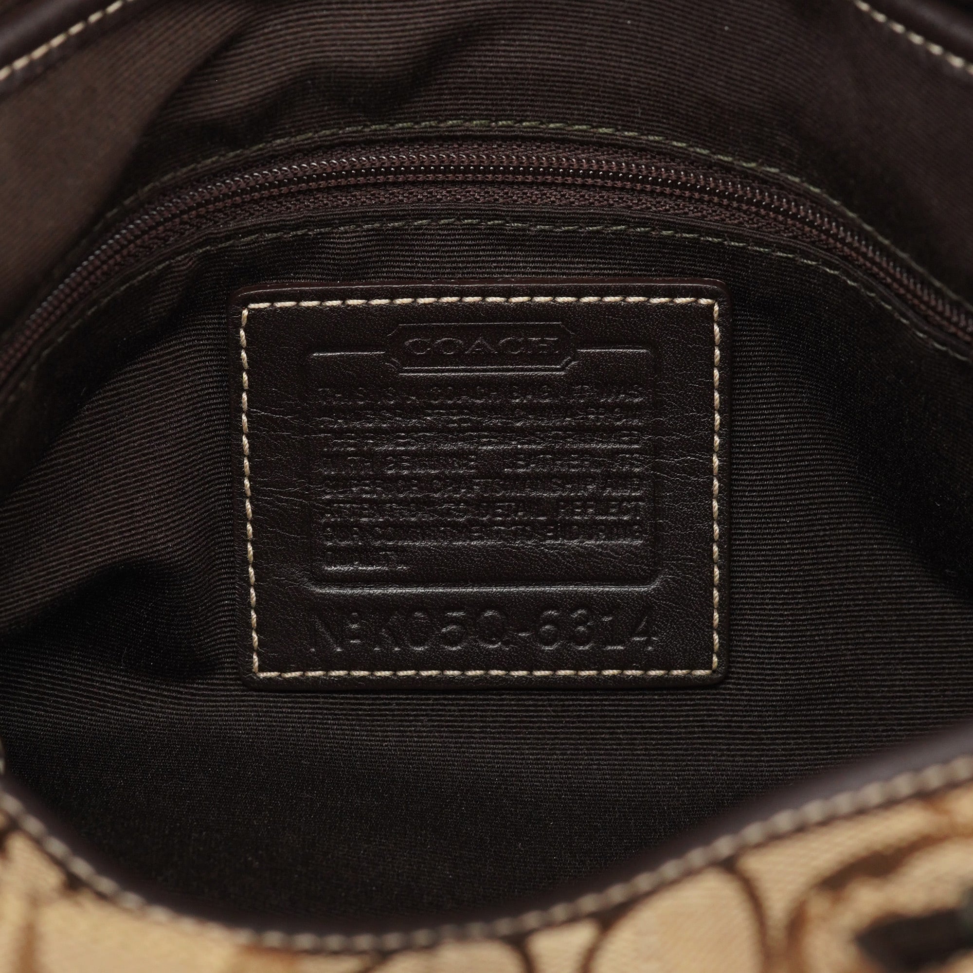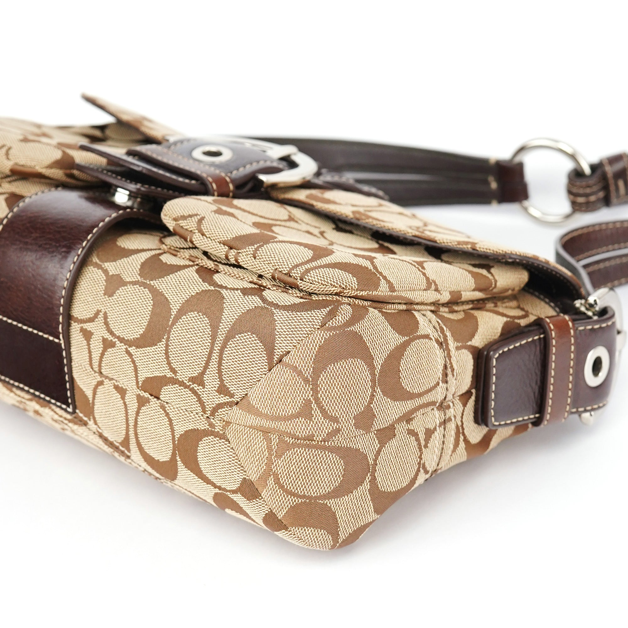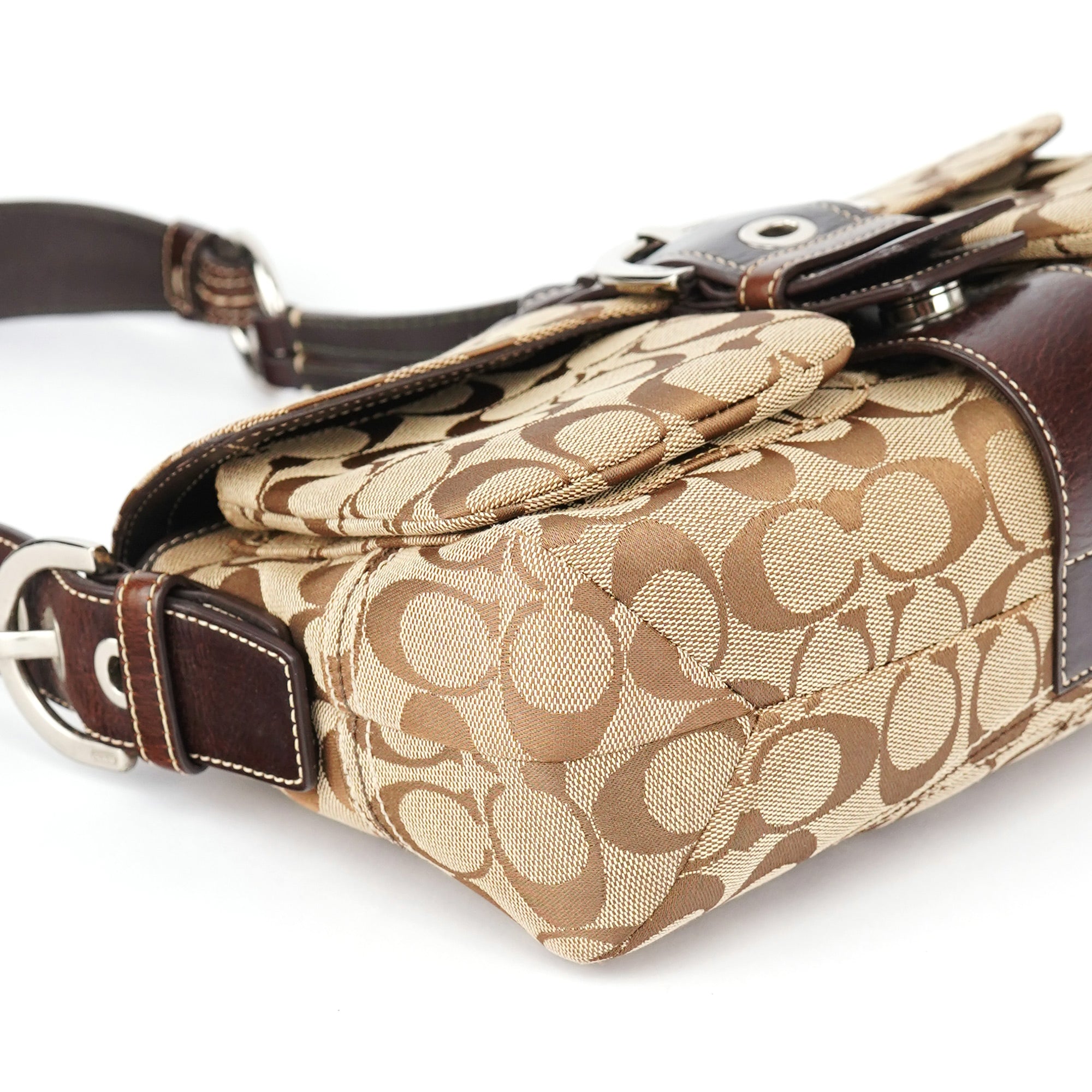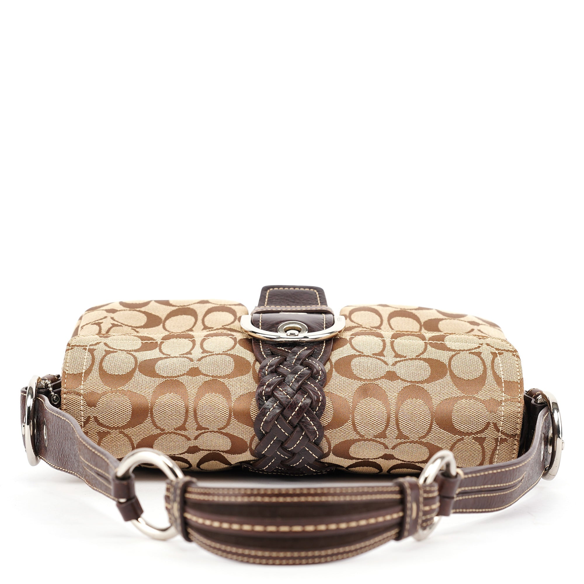 Designed in the early 2000s, the Coach Soho shoulder bag is crafted from the brand’s signature beige jacquard canvas with dark brown leather trim and braided belt detail. The flap closure features a magnetic snap, while the spacious interior includes a zip pocket and logo creed patch. Finished with a wide leather shoulder strap and classic hangtag charm.