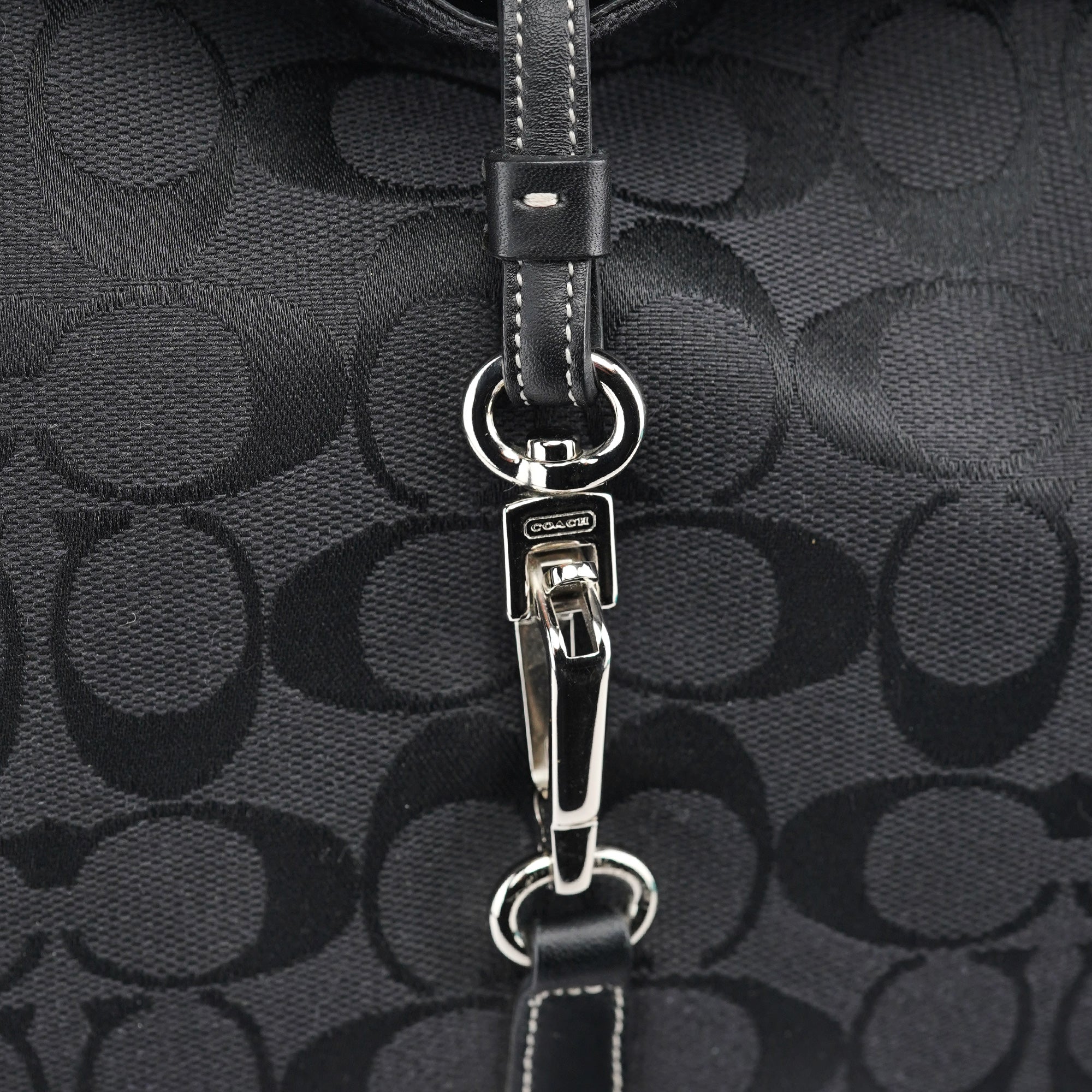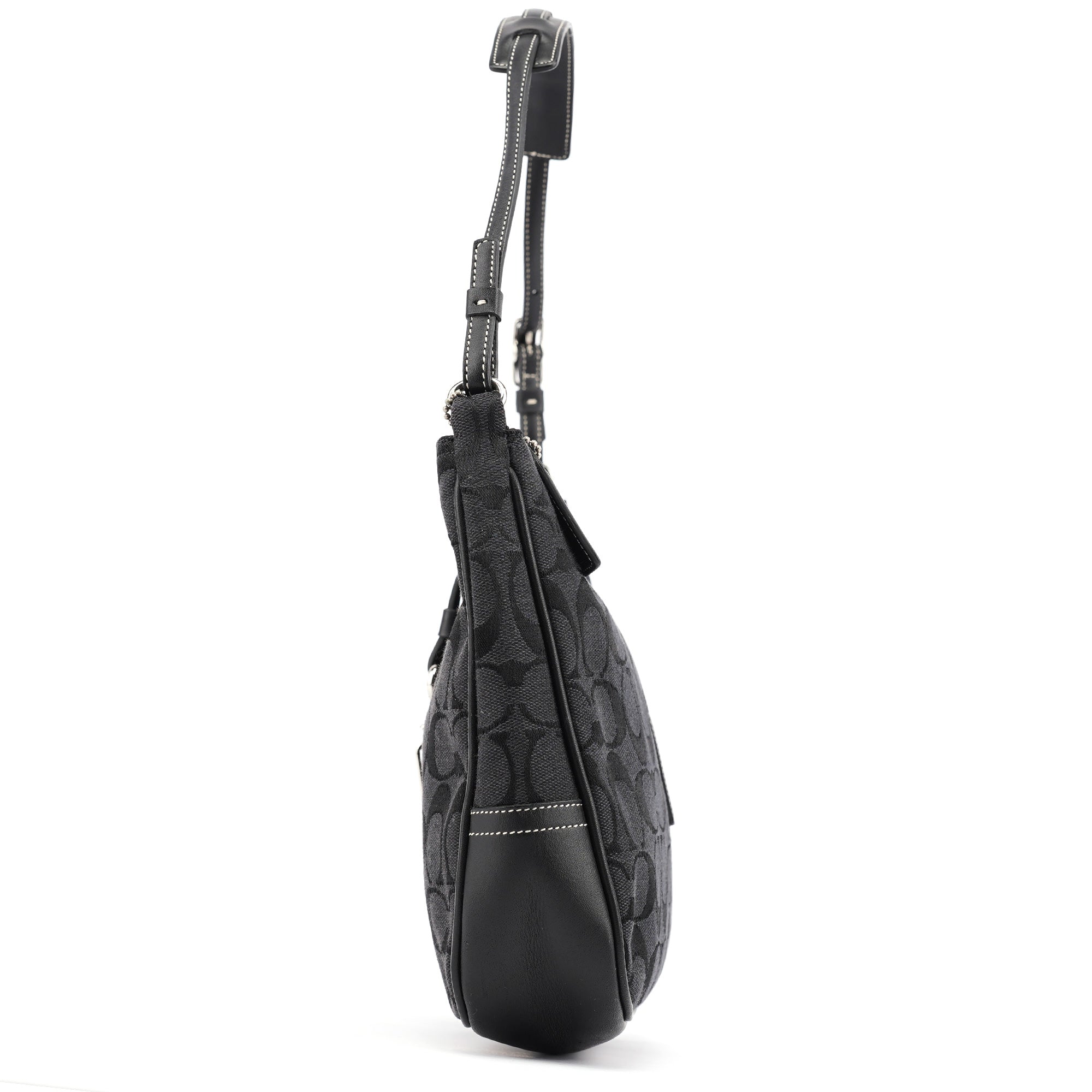 Designed in the early 2000s, this Coach Soho shoulder bag features tonal black Signature C jacquard canvas with leather trim. The curved silhouette is secured with a silver-tone dog leash clip closure and includes contrast white topstitching, a leather Coach tag, and a buckled adjustable shoulder strap. The fabric-lined interior includes a zip pocket for organization.