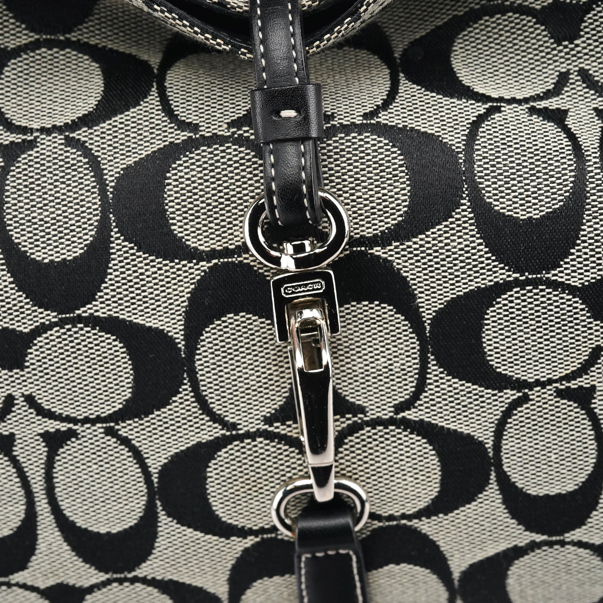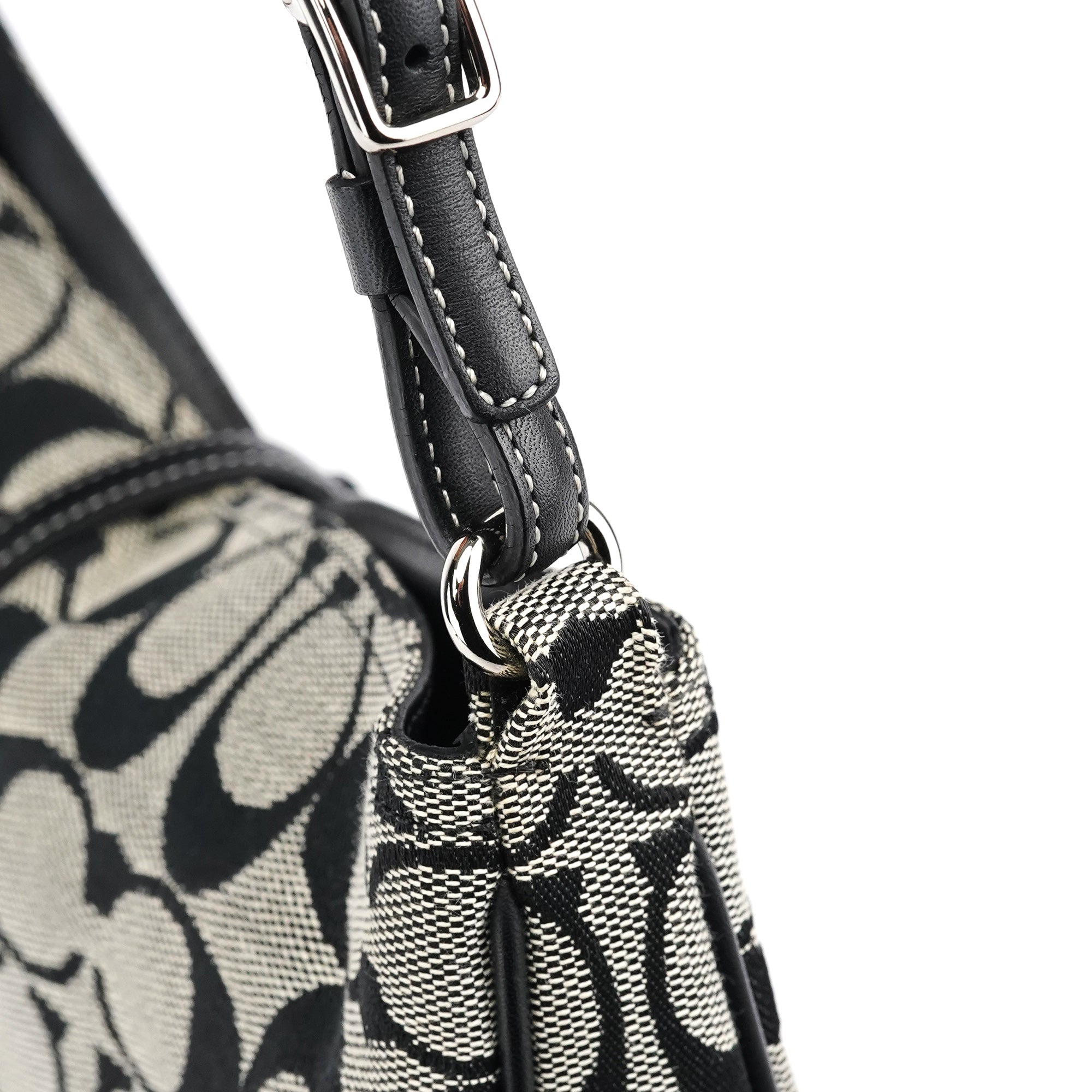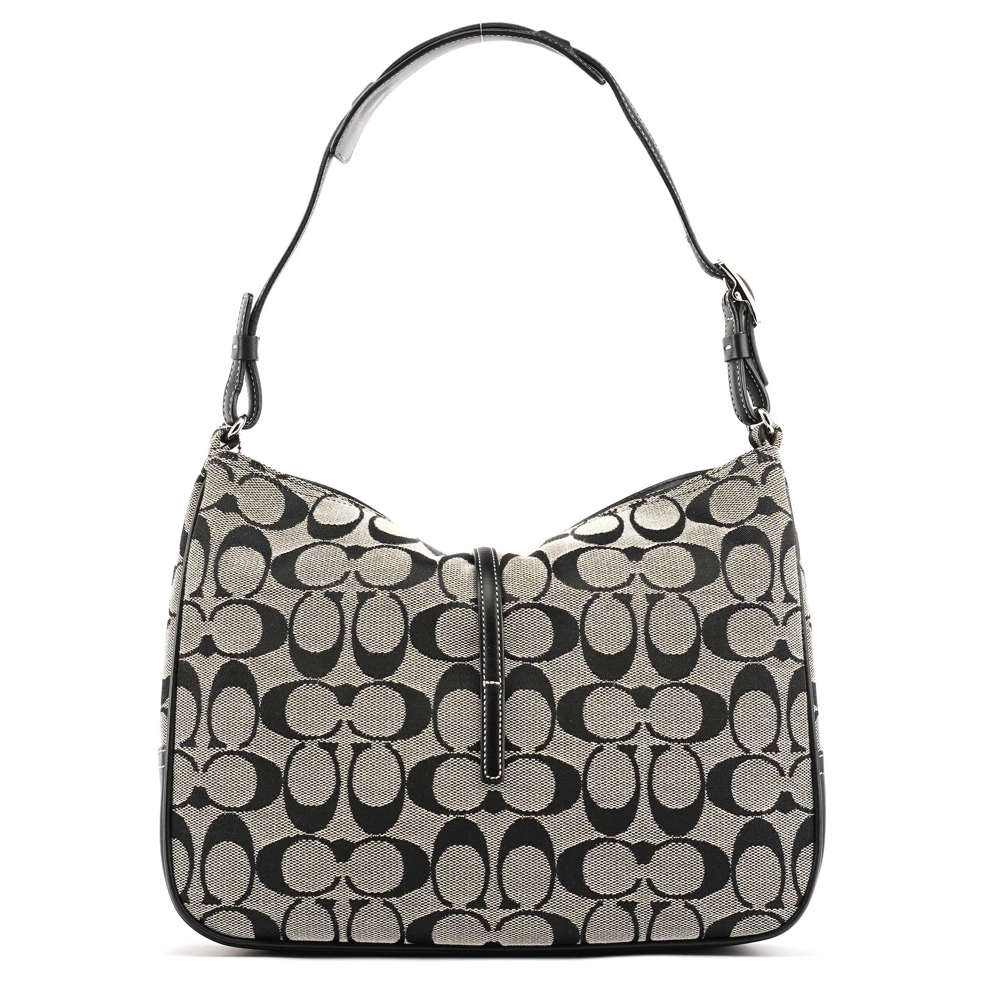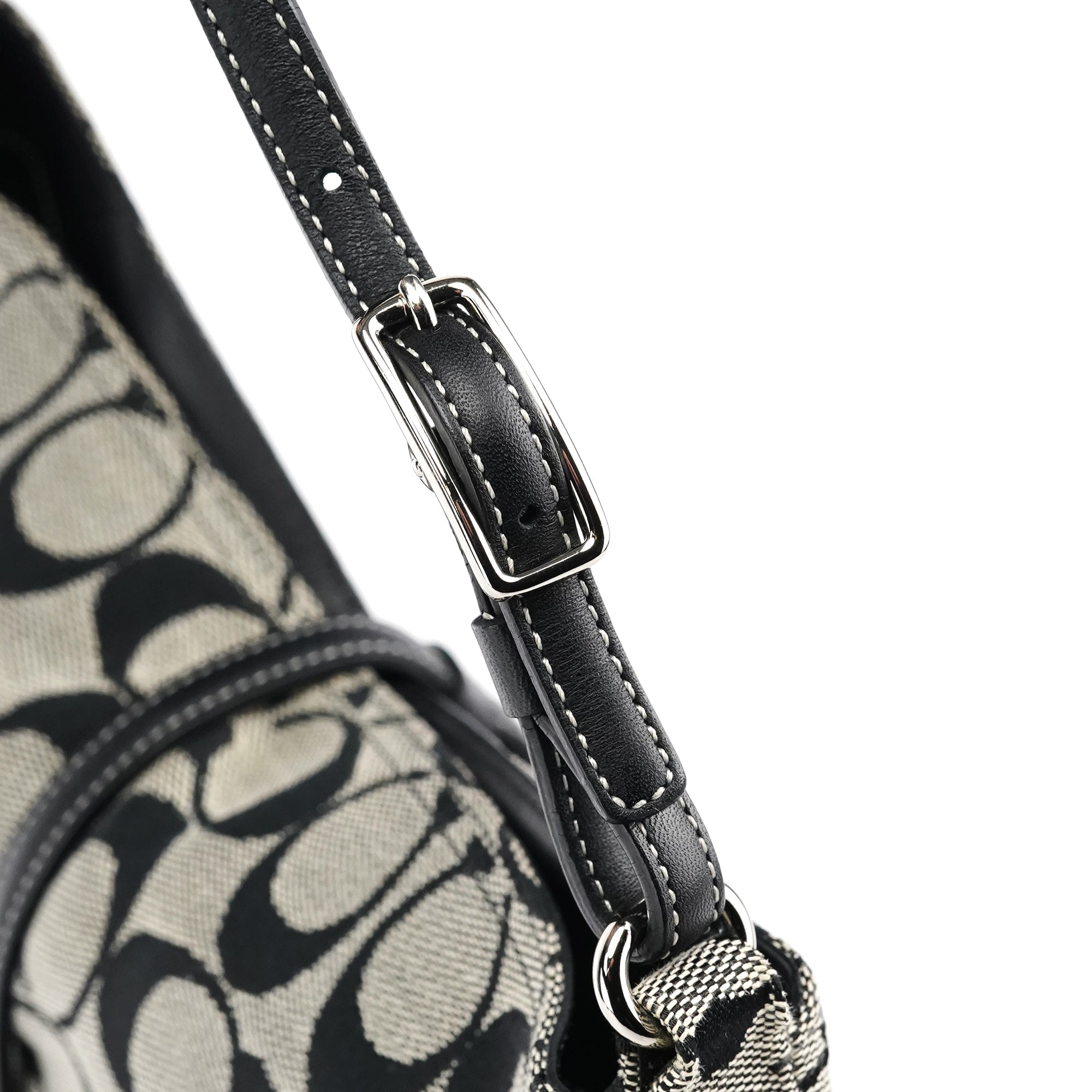 Designed in the early 2000s, this Coach Signature C hobo bag is crafted from jacquard canvas with black leather trim and contrast stitching. It features silver hardware, a belted front detail, and a single adjustable handle. The interior is lined in black fabric with a zip pocket.