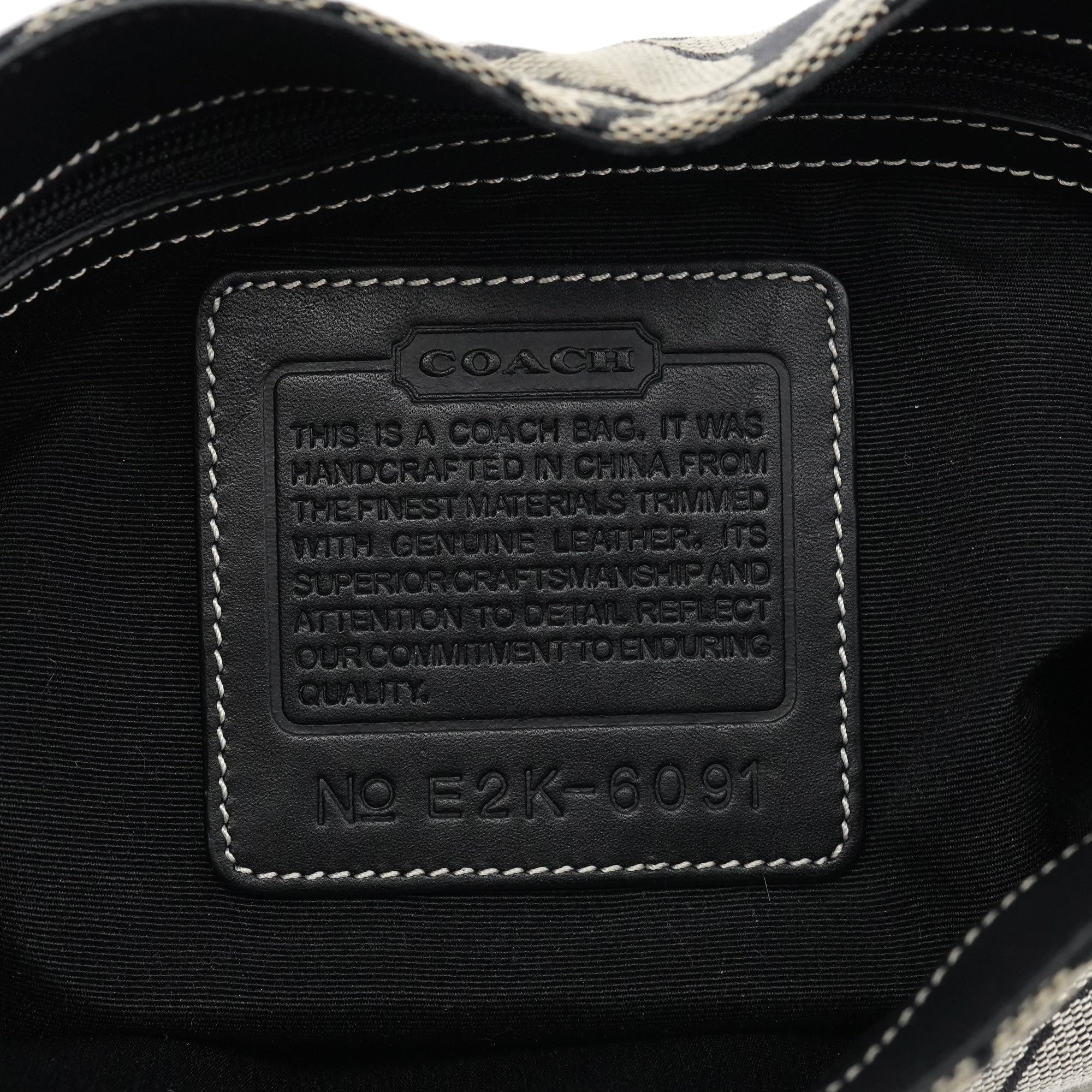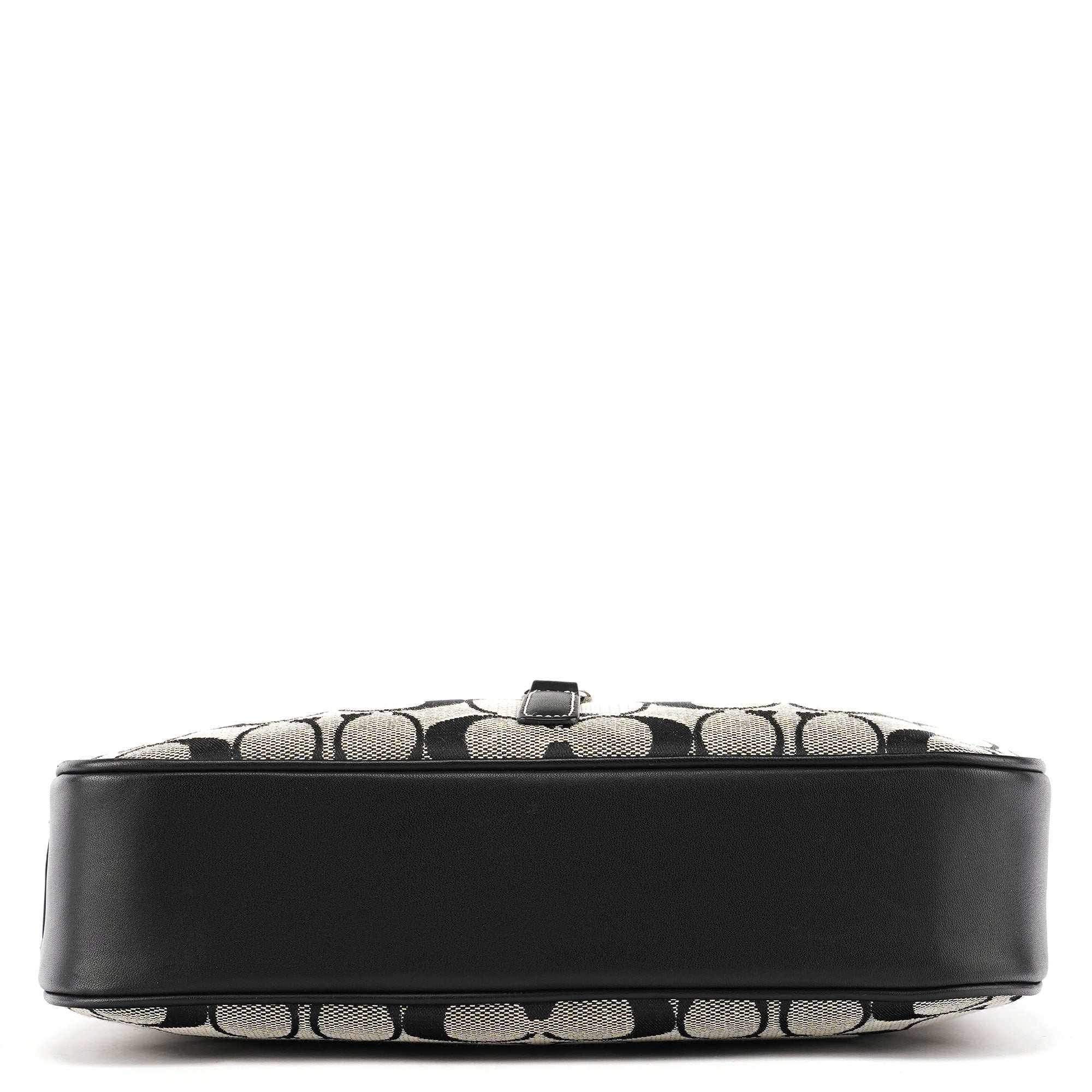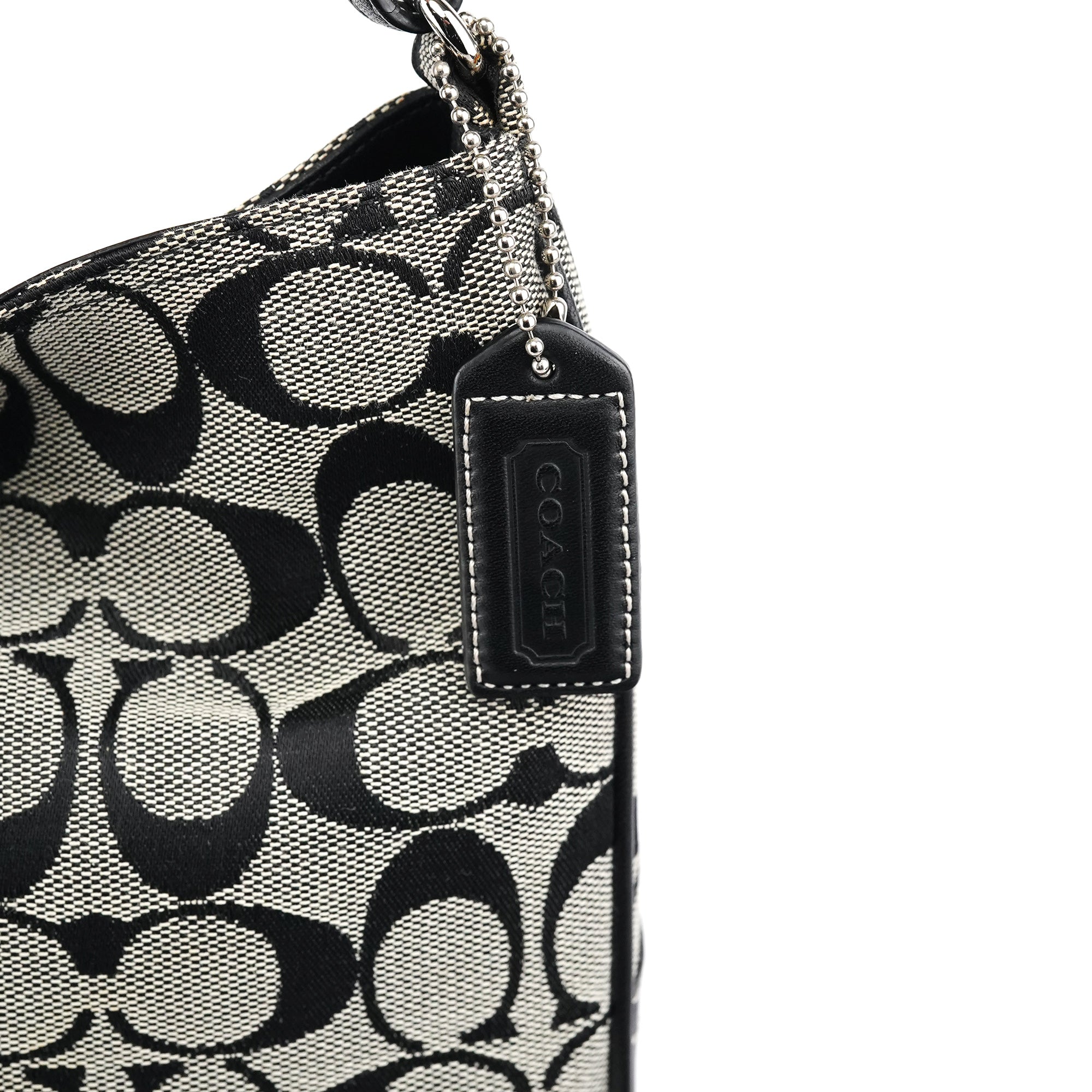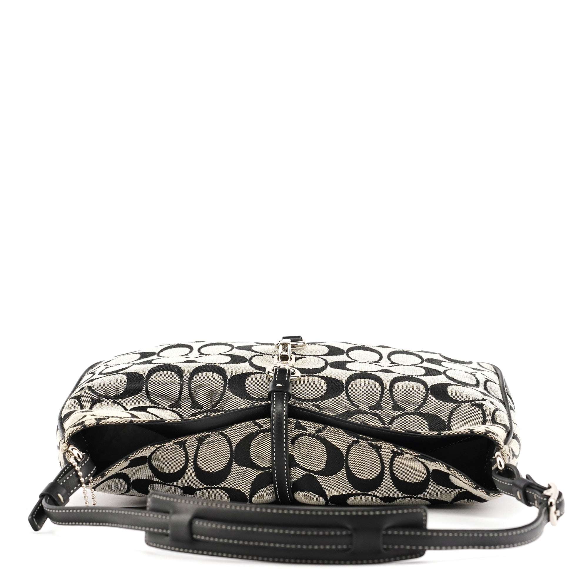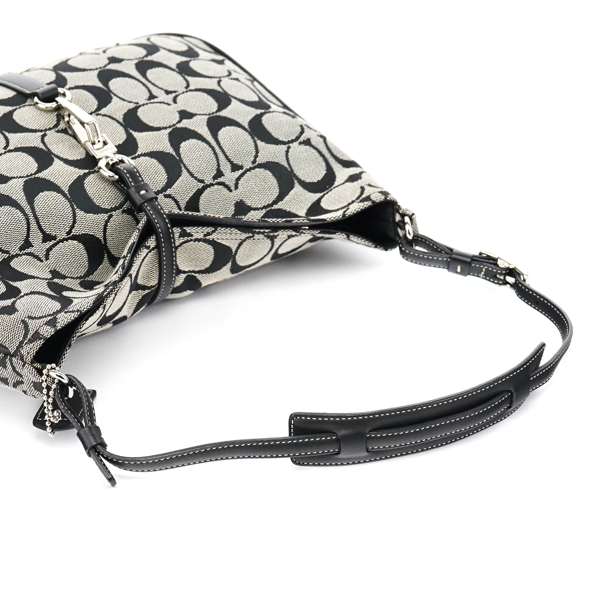 Designed in the early 2000s, this Coach Signature C hobo bag is crafted from jacquard canvas with black leather trim and contrast stitching. It features silver hardware, a belted front detail, and a single adjustable handle. The interior is lined in black fabric with a zip pocket.