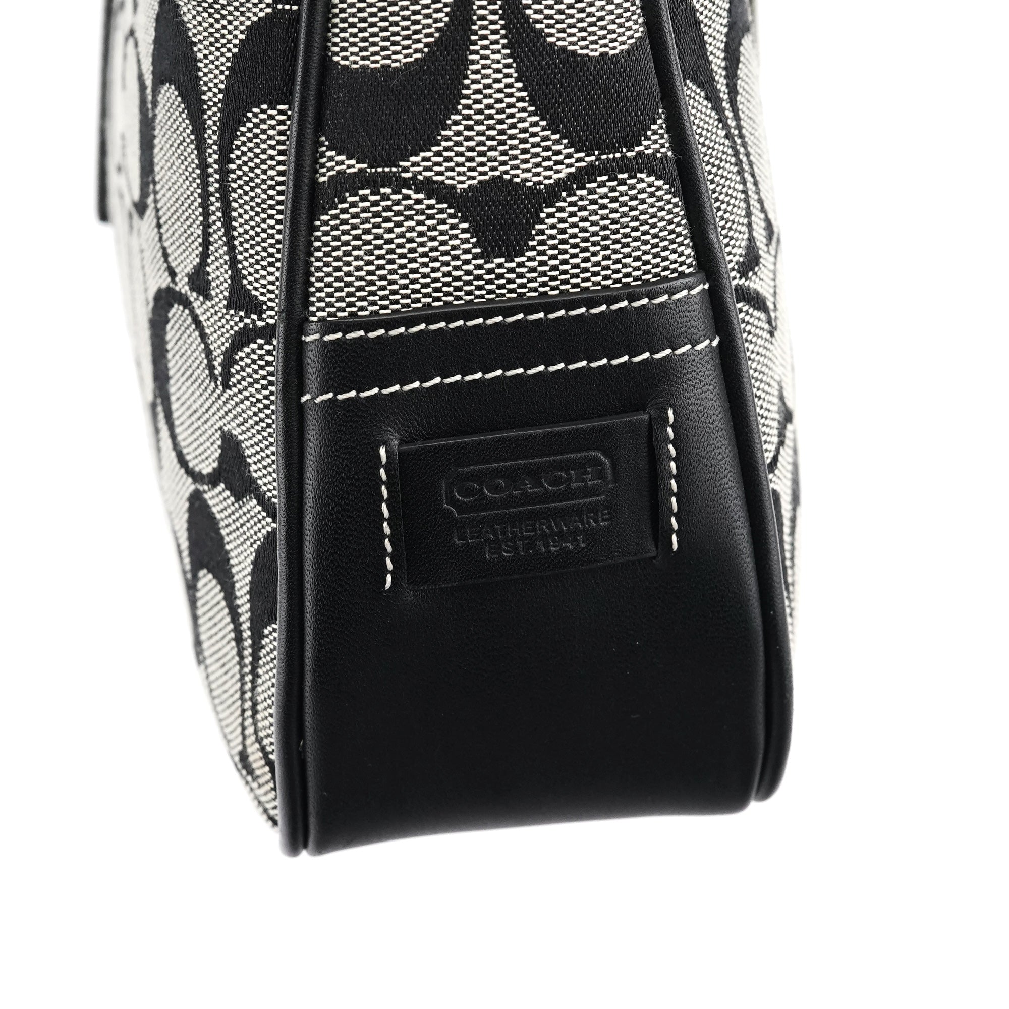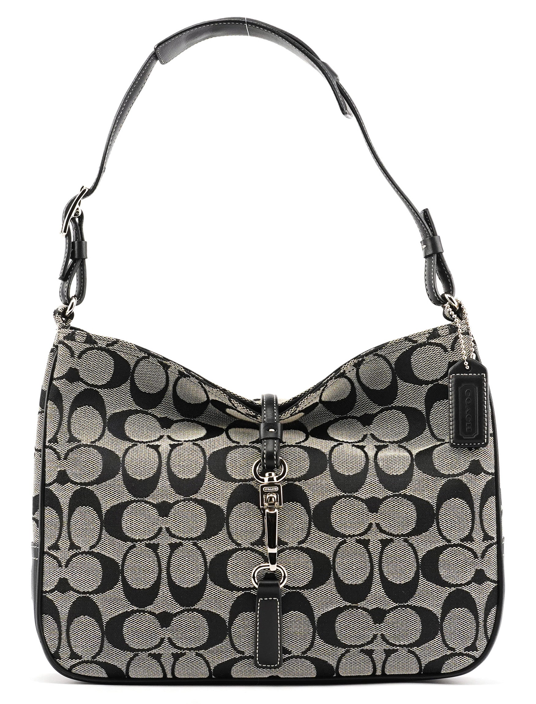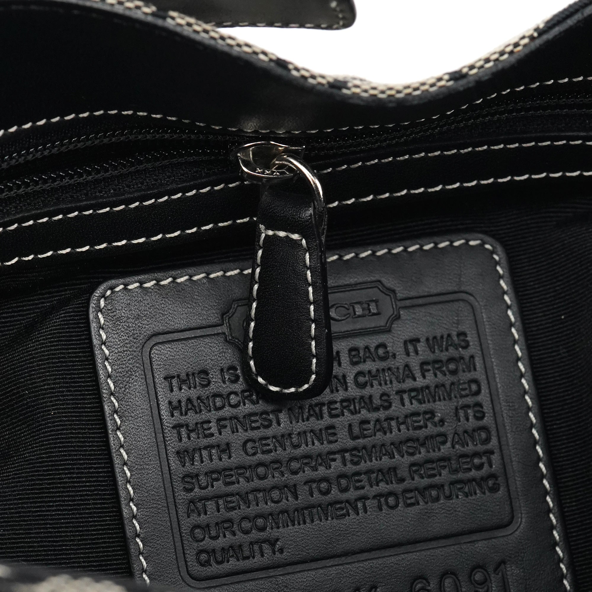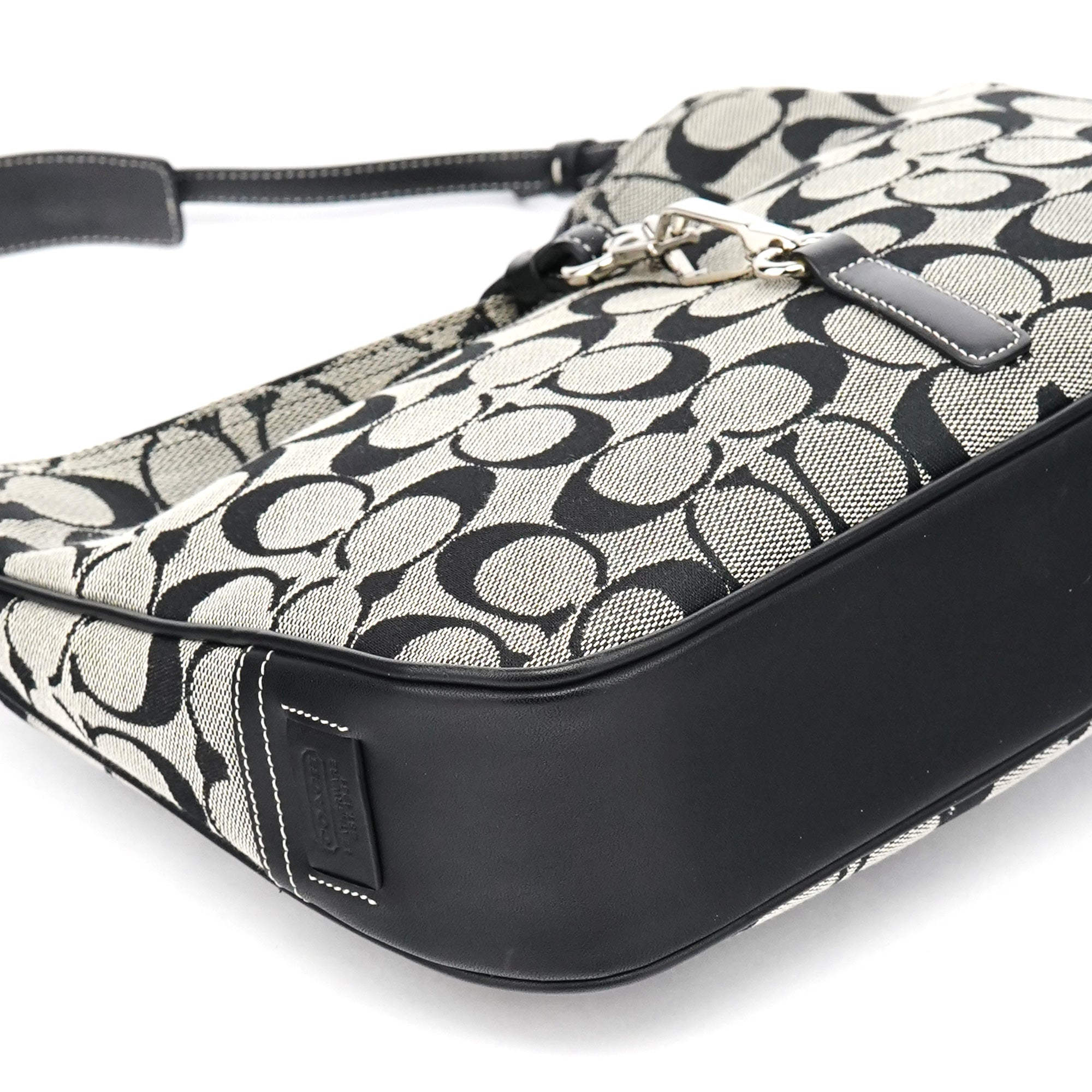Designed in the early 2000s, this Coach Signature C hobo bag is crafted from jacquard canvas with black leather trim and contrast stitching. It features silver hardware, a belted front detail, and a single adjustable handle. The interior is lined in black fabric with a zip pocket.