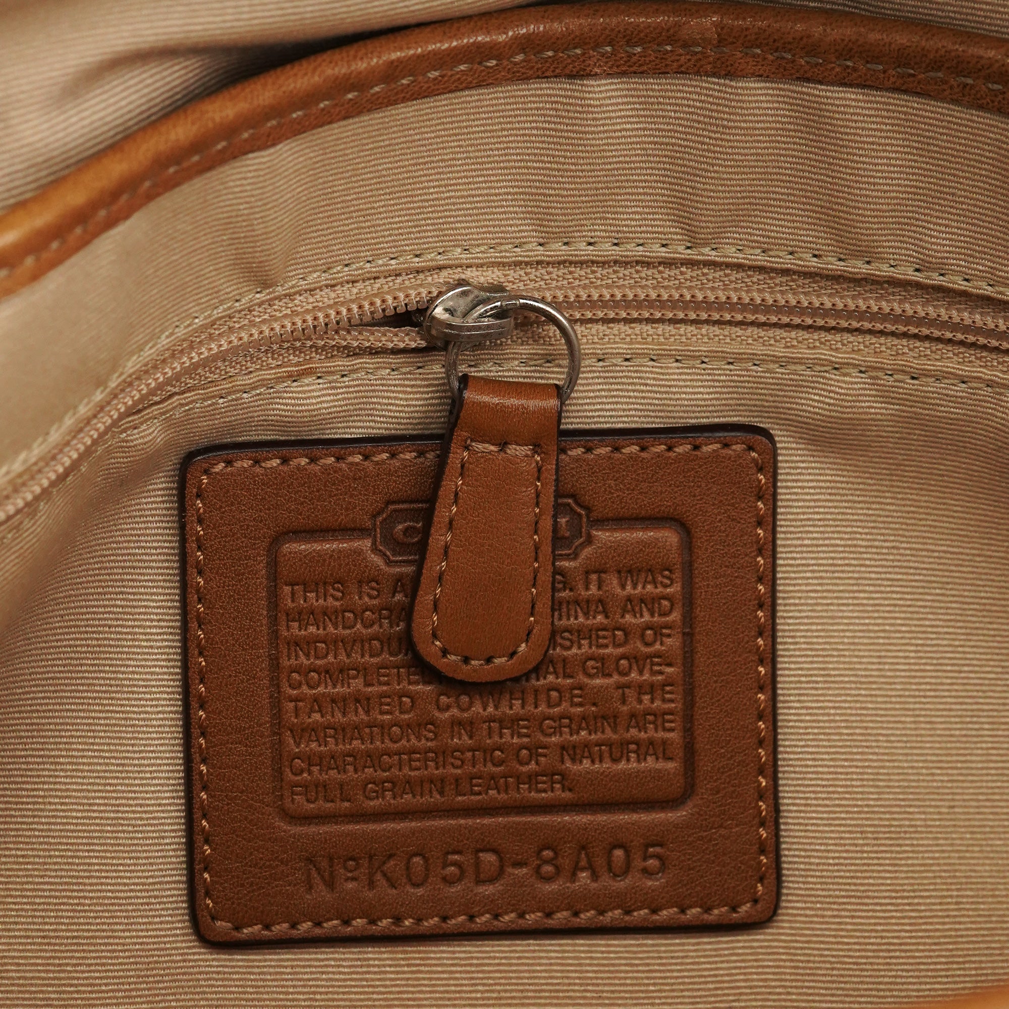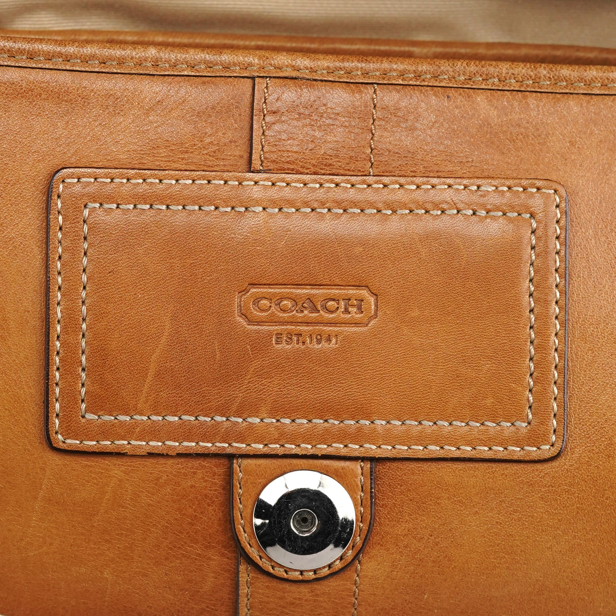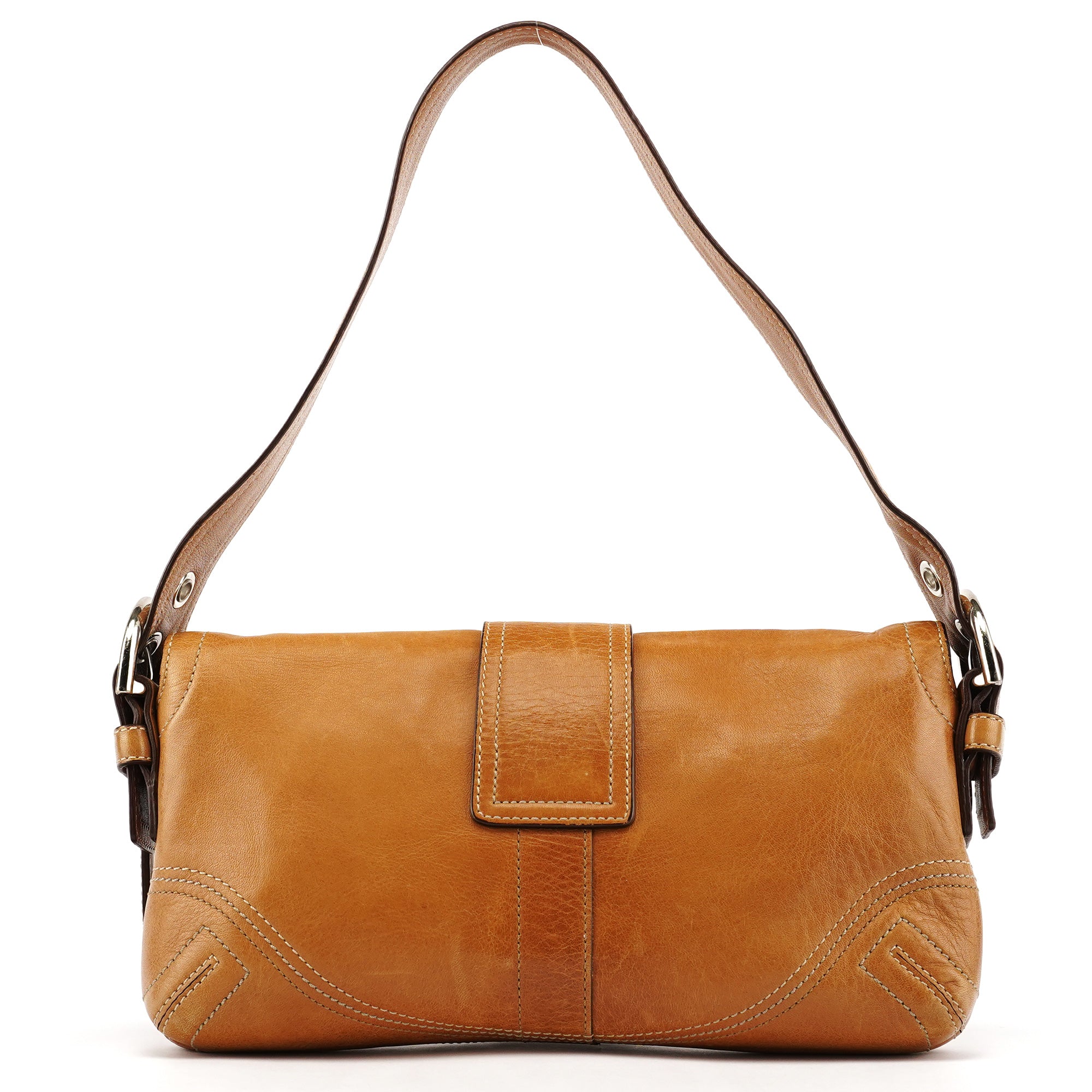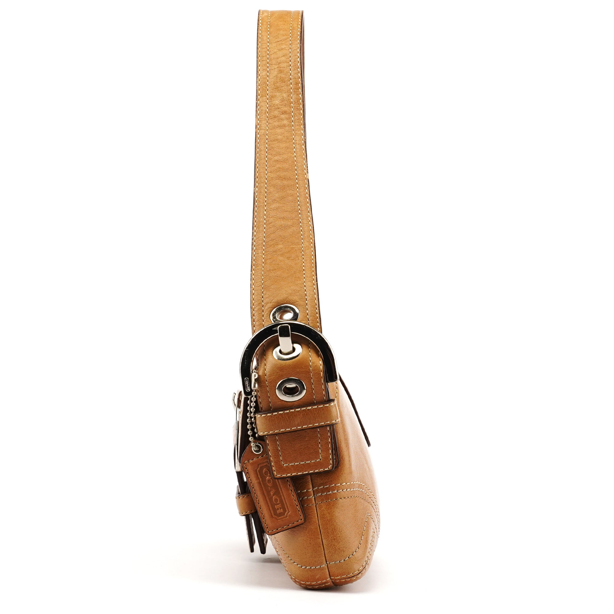 Designed in the early 2000s, the Coach Soho shoulder bag is crafted from tan full-grain glove-tanned leather with contrast stitching and silver-tone hardware. It features a fold-over flap with the line’s signature horseshoe buckle, an adjustable strap, and a beige fabric-lined interior with a zip pocket. A timeless everyday piece reflecting Coach’s craftsmanship and understated vintage style.