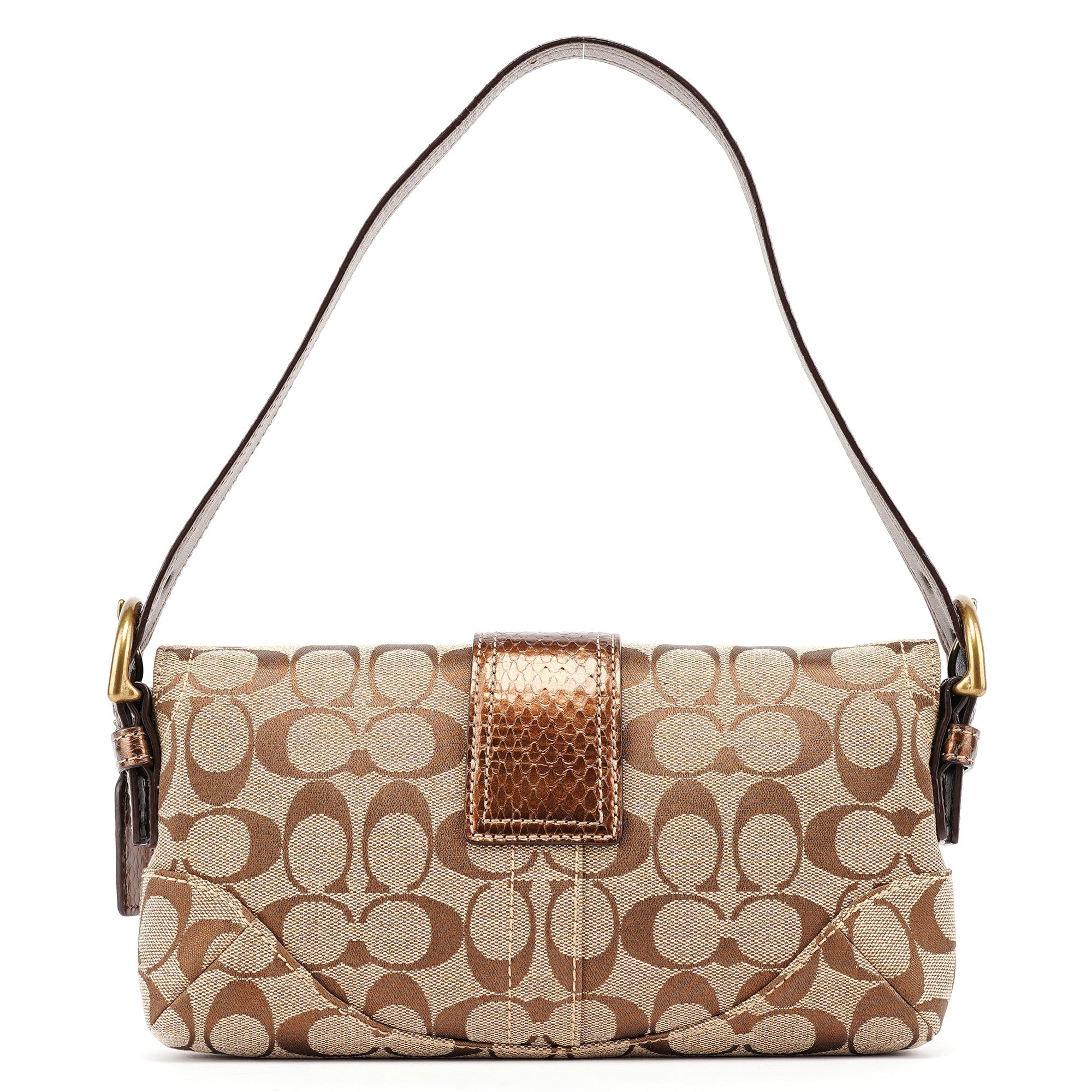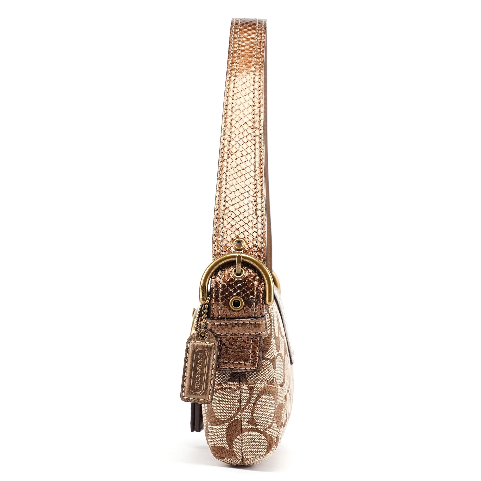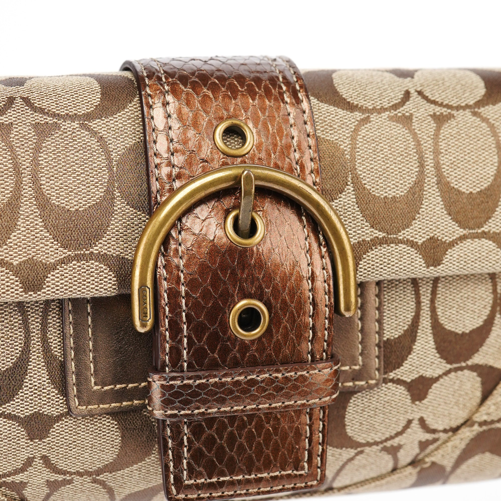 Designed in the early 2000s, this Coach Soho shoulder bag features the brand’s signature jacquard canvas in beige tones with rich brown leather trim and a python-embossed belt detail. The antiqued brass buckle secures the front flap, opening to a fabric-lined interior with a zip pocket. Finished with a dark brown adjustable strap for shoulder or short crossbody wear.