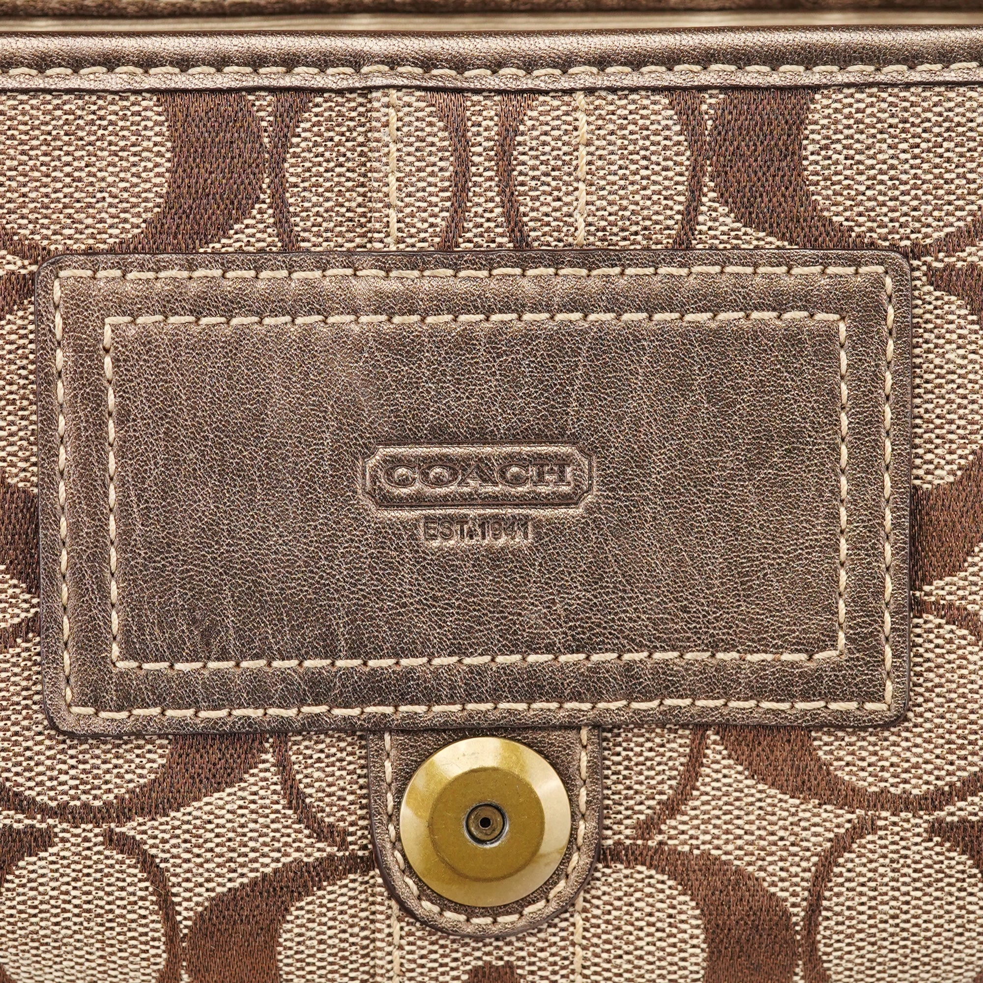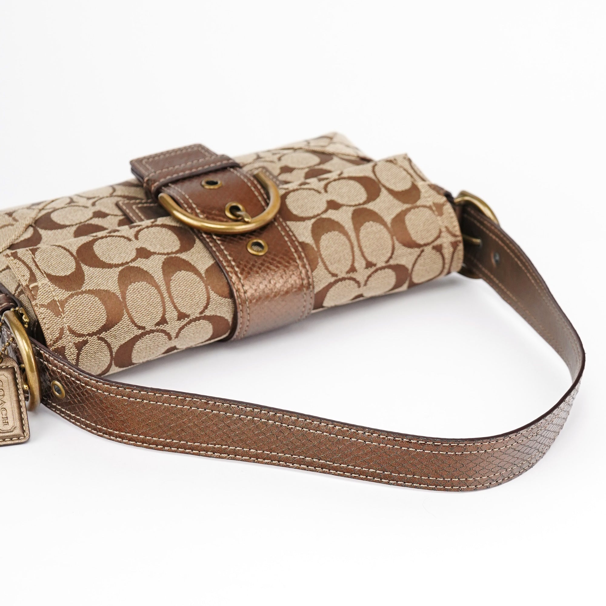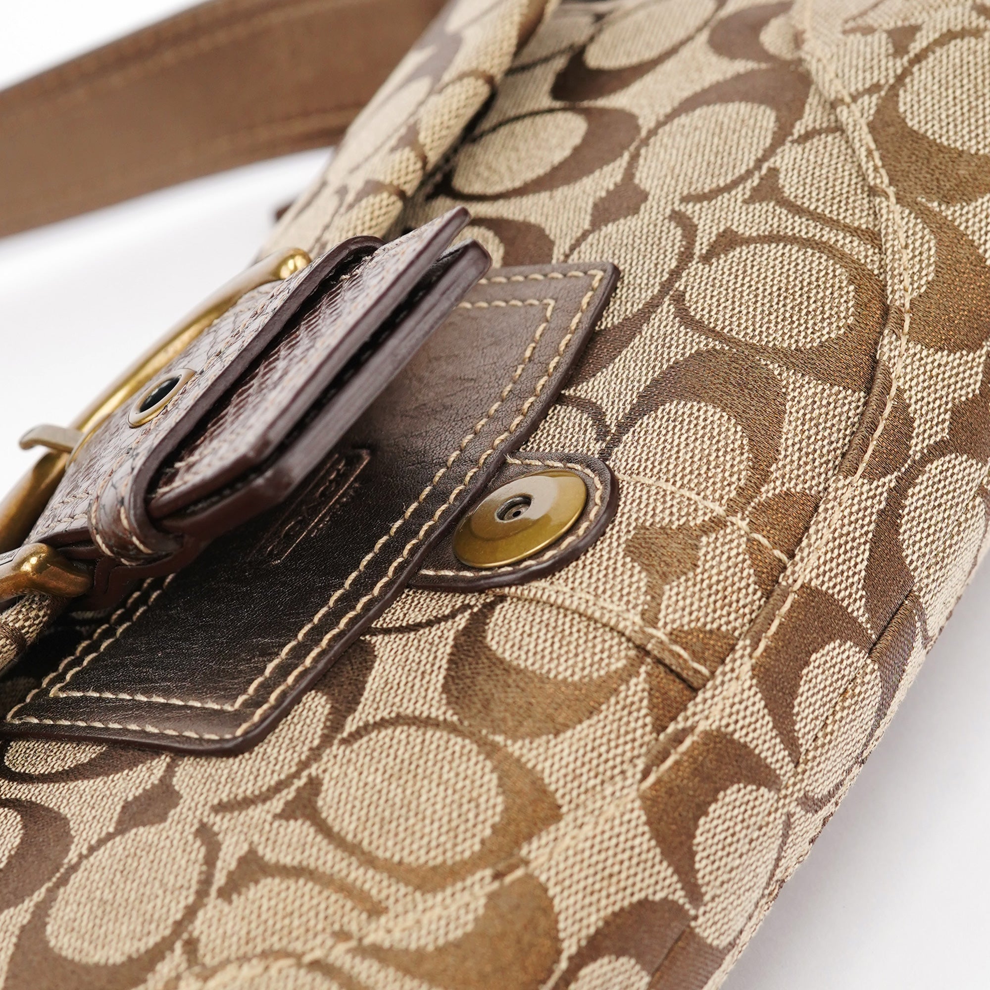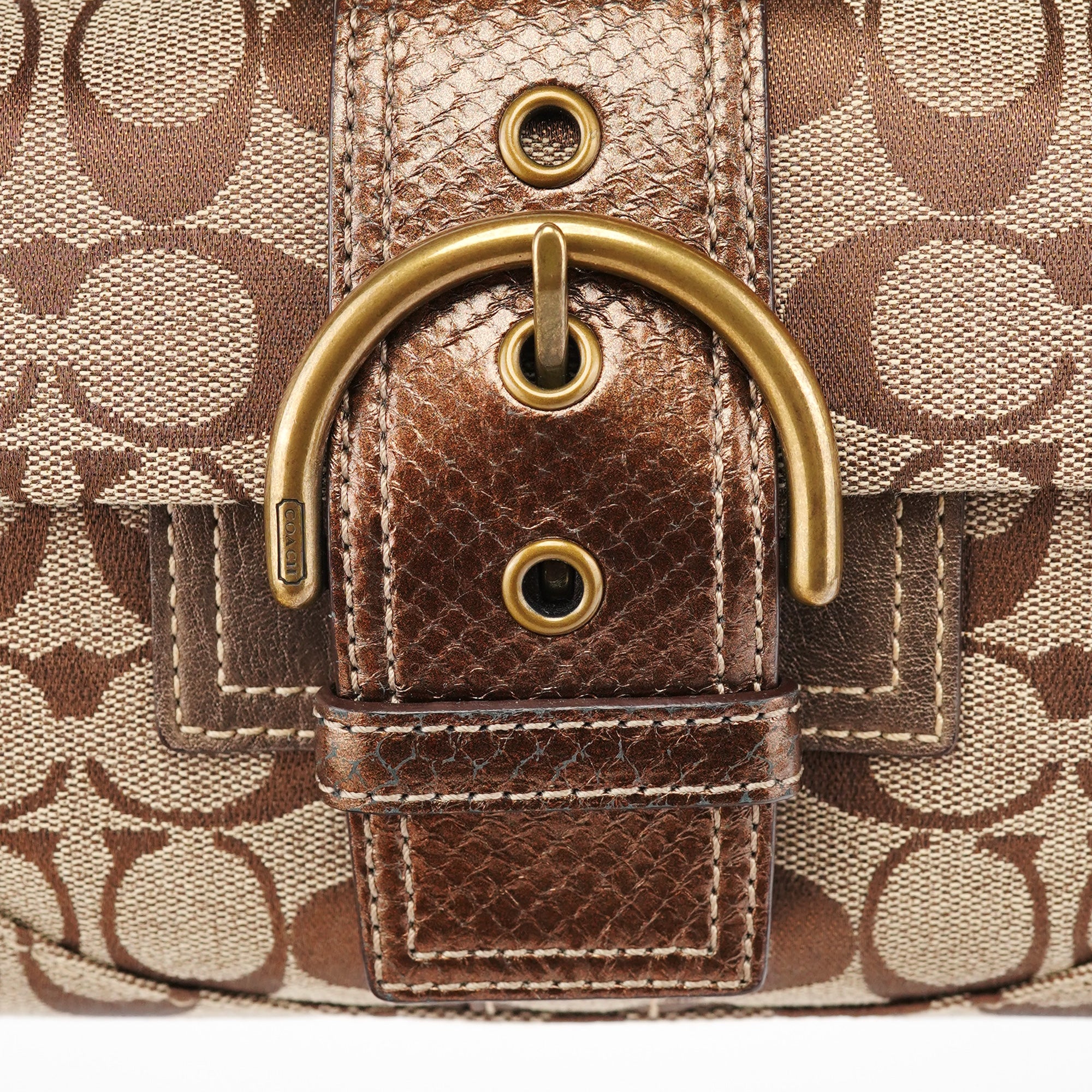 Designed in the early 2000s, this Coach Soho bag is crafted in signature beige jacquard canvas with tonal snakeskin-embossed leather trim and brass-tone hardware. The compact silhouette features a flap front with D-ring detail and a magnetic snap closure. The interior is lined in canvas and includes a single slip pocket beneath the flap.